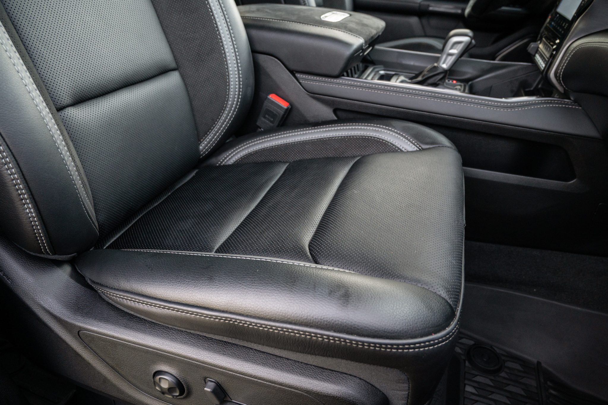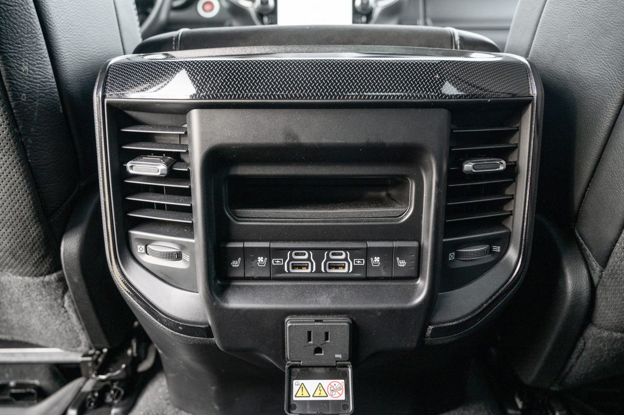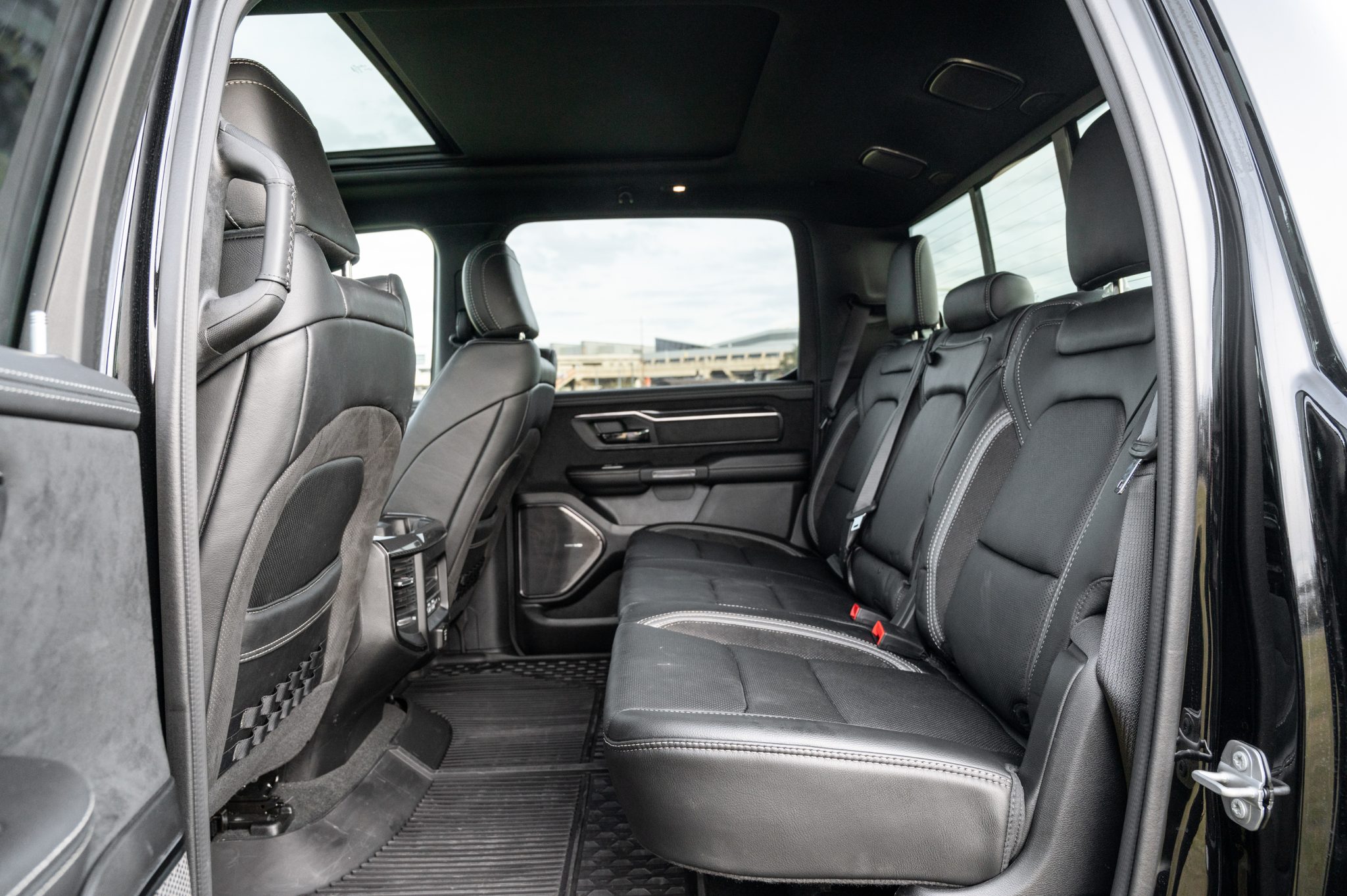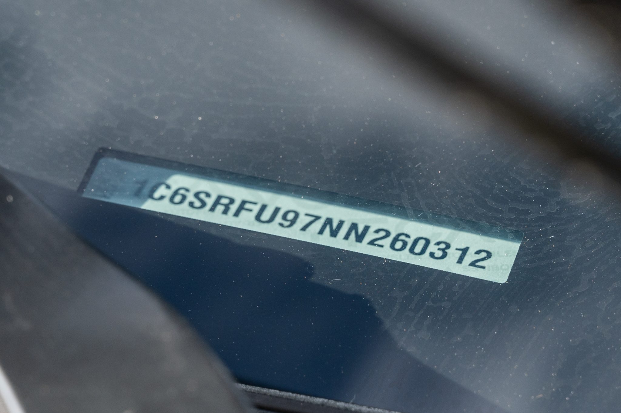 This 2022 Ram 1500 TRX Crew Cab  is powered by a supercharged 6.2-liter Hemi V8 that sends a factory-rated 702 horsepower to all four wheels via an eight-speed automatic transmission, a two-speed transfer case, and an electronically locking rear differential. Finished in Diamond Black Crystal Pearl-Coat over black leather upholstery, the truck is further equipped with the Trailer Tow and TRX Level 2 Equipment groups in addition to a dual-pane panoramic sunroof, a tri-fold tonneau cover, power-folding towing mirrors, Mopar off-road-style running boards, 18″ wheels, dual-valve Bilstein shocks, and an engine block heater. This TRX has 4,900 miles