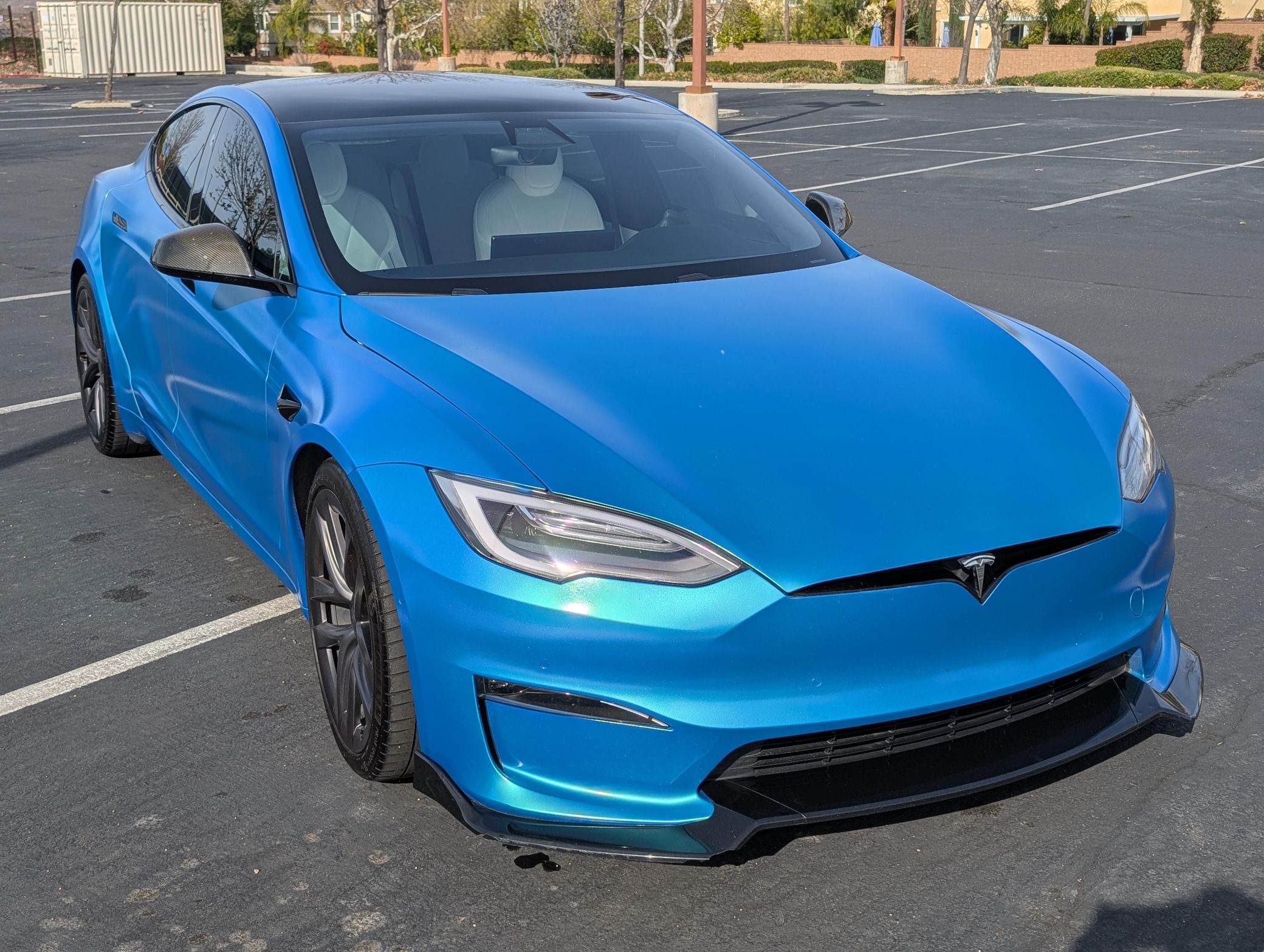 These are truly exceptional cars, with over 1,000 horsepower and four-door practicality – and, in this case, the famed yoke steering wheel. This particular Model S Plaid also features a head-turning Bora Bora Blue Plasti Dip exterior, an aftermarket front splitter, and some great factory equipment like 21-inch Arachnid wheels, adaptive air suspension, and heated and ventilated front seats.