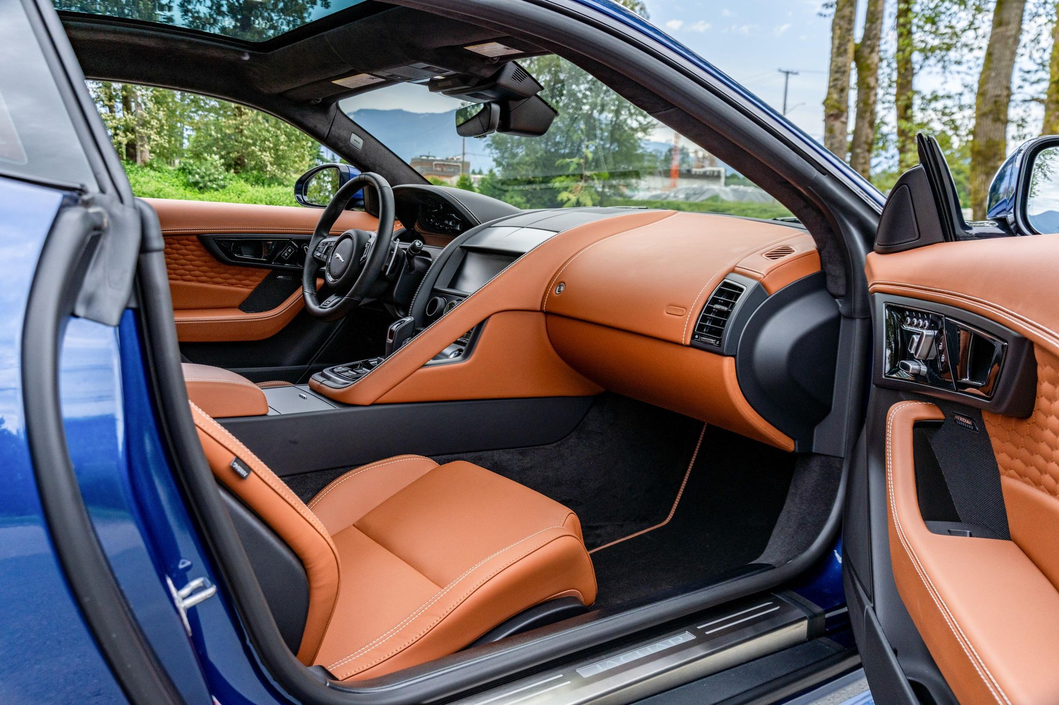 F-Type R is particularly thrilling, thanks to the glorious noise from its 575-horsepower supercharged V8 combined with all-wheel drive. This particular example touts relatively low mileage and a beautiful Bluefire Blue Metallic over tan color combination. It also features some great factory equipment, including the Exterior Black Design Pack, full extended leather upholstery, and a Meridian sound system – along with no modifications. Power comes from a 5.0-liter supercharged V8, rated at 575 horsepower and 516 lb-ft of torque. Output is sent to all four wheels via an 8-speed automatic transmission.