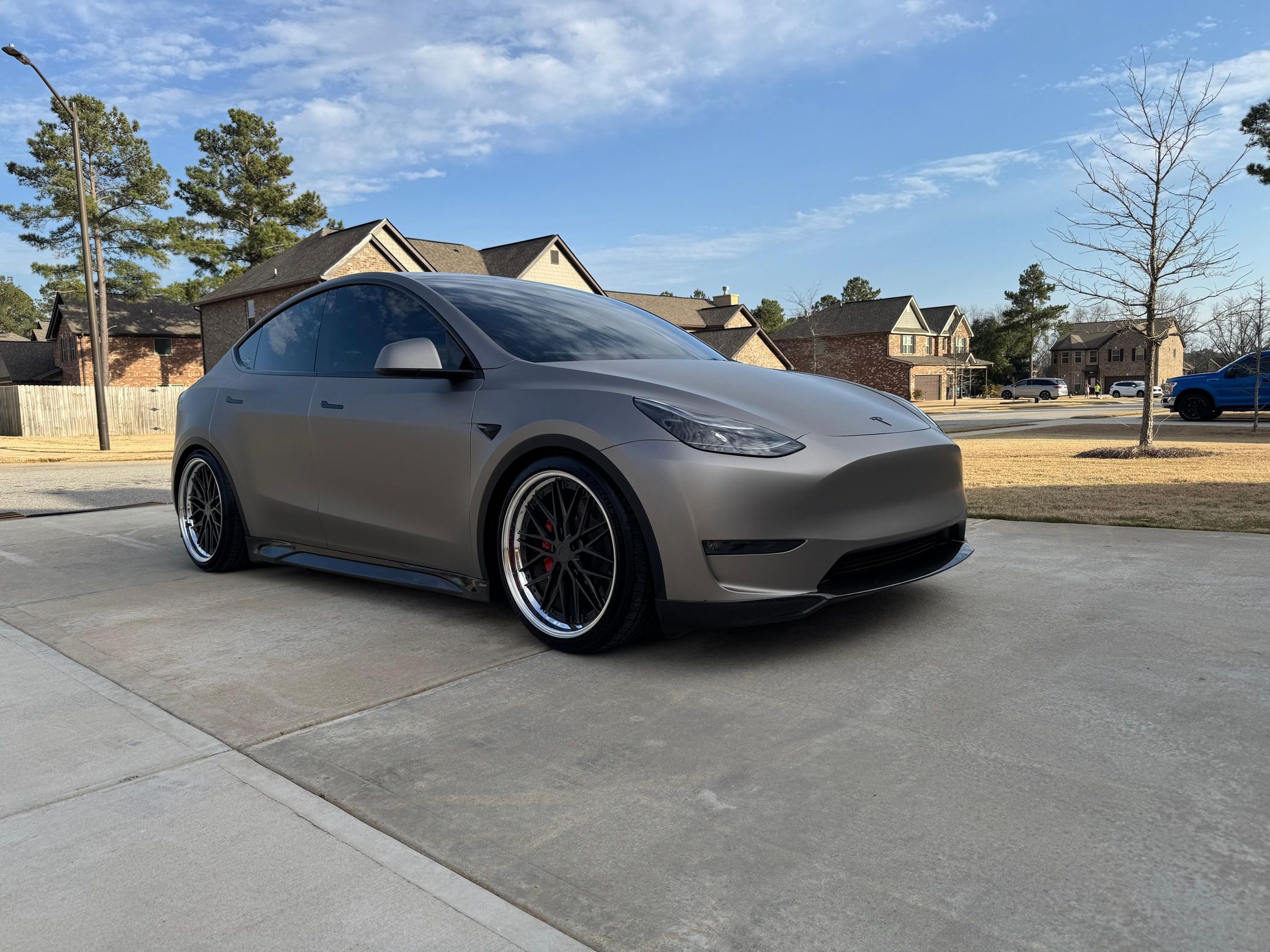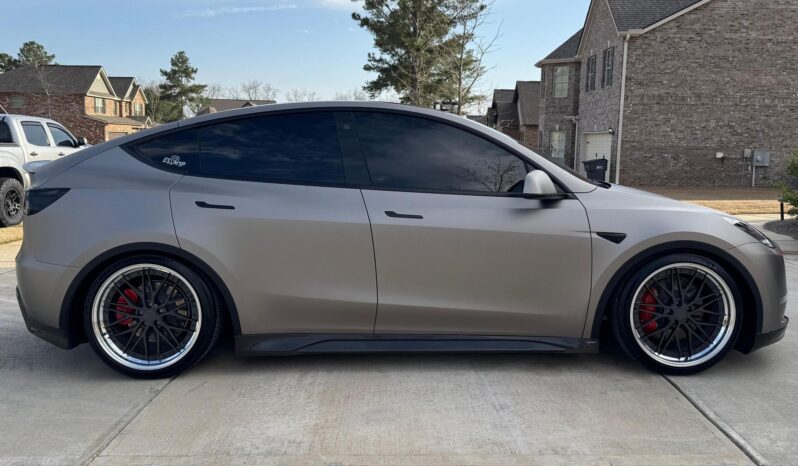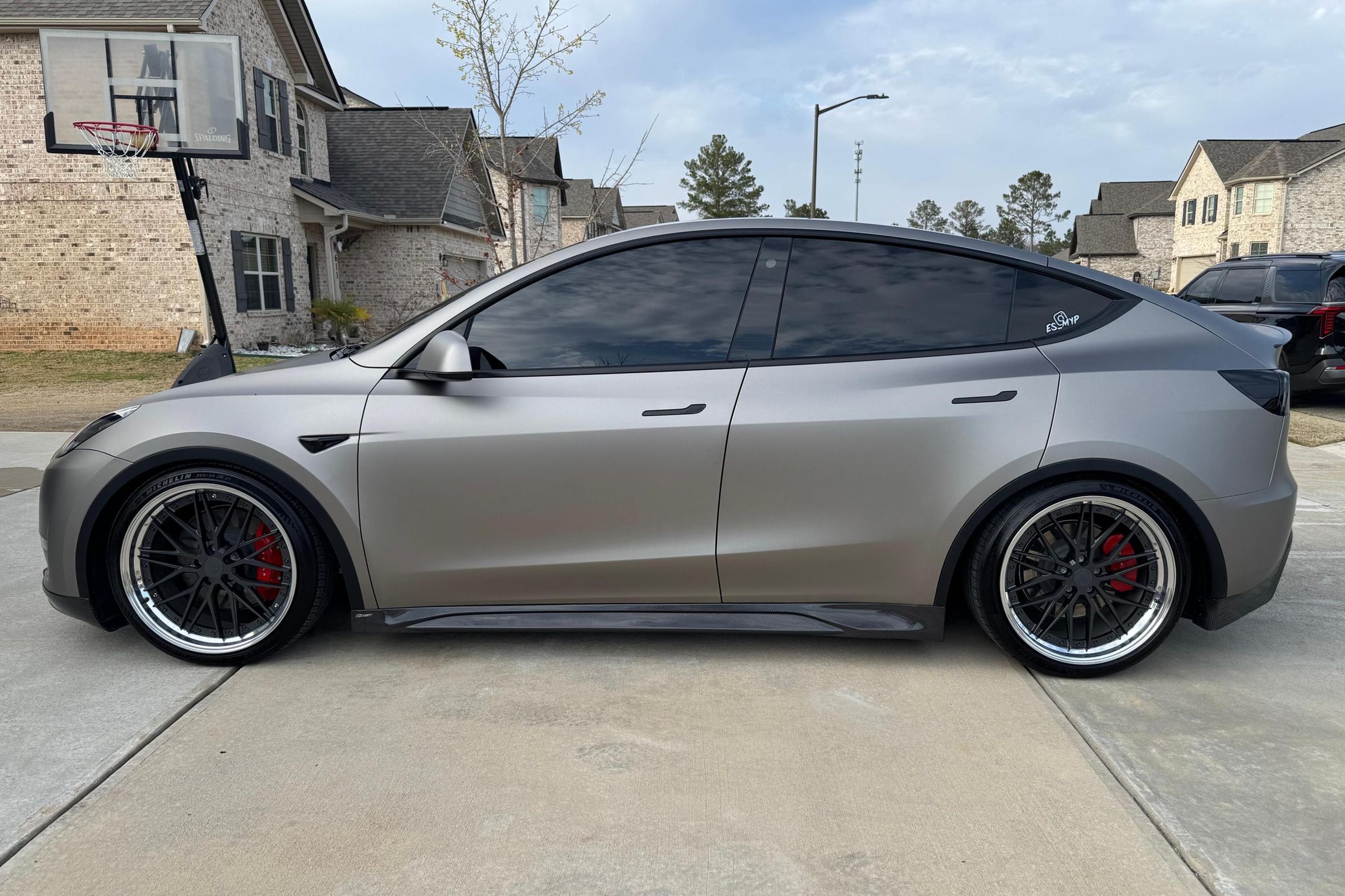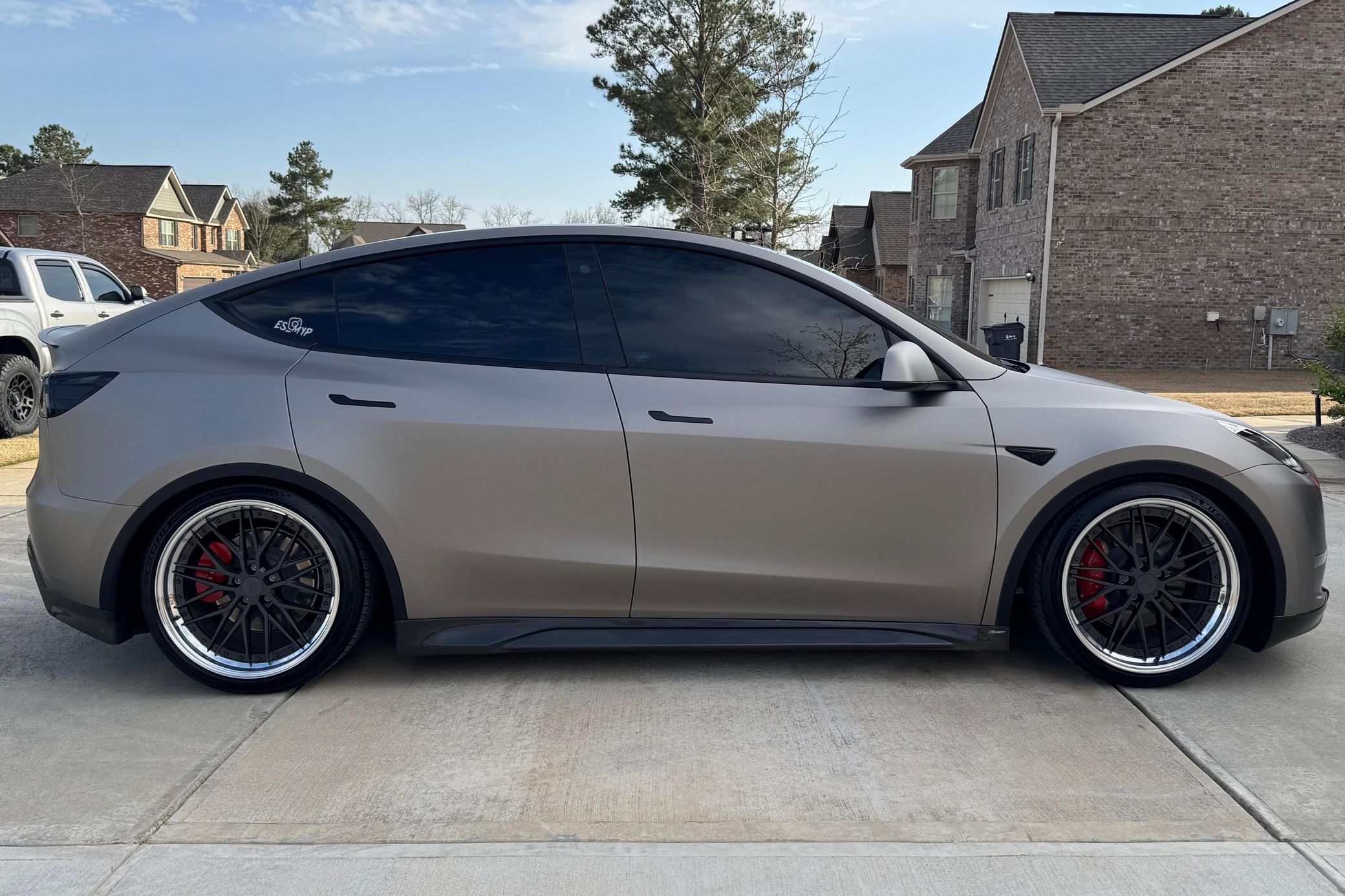 This particular Model Y Performance features some cool upgrades intended to enhance its style, including an Air Lift Performance air suspension system, a 3M Matte Grey Aluminum exterior wrap, 21-inch VTForged wheels, a carbon fiber front lip, side skirts, and rear diffuser, and T Sportline perforated leather seats. Power comes from a pair of electric motors, which draw electricity from a 75-kilowatt-hour lithium-ion battery pack to zap the four wheels with about 455 horsepower and 480 lb-ft of torque. The EPA gave the Model Y Performance a 303-mile maximum driving range rating in 2023.