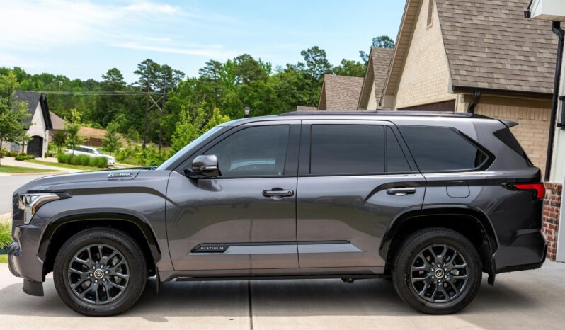 Sequoia Platinum boasts a potent twin-turbocharged hybrid V6 powertrain and some great factory equipment – including a rear air suspension system, power-extending running boards, power-folding third-row seats, and the Toyota Safety Sense 2.5 suite. Power comes from an i-FORCE MAX gasoline-electric hybrid powertrain, which consists of a 3.4-liter twin-turbocharged V6 engine and an electric motor/generator. The system is rated at a combined 437 horsepower and 583 lb-ft of torque. Output is sent to the rear or all four wheels via a 10-speed automatic transmission and a 2-speed transfer case.