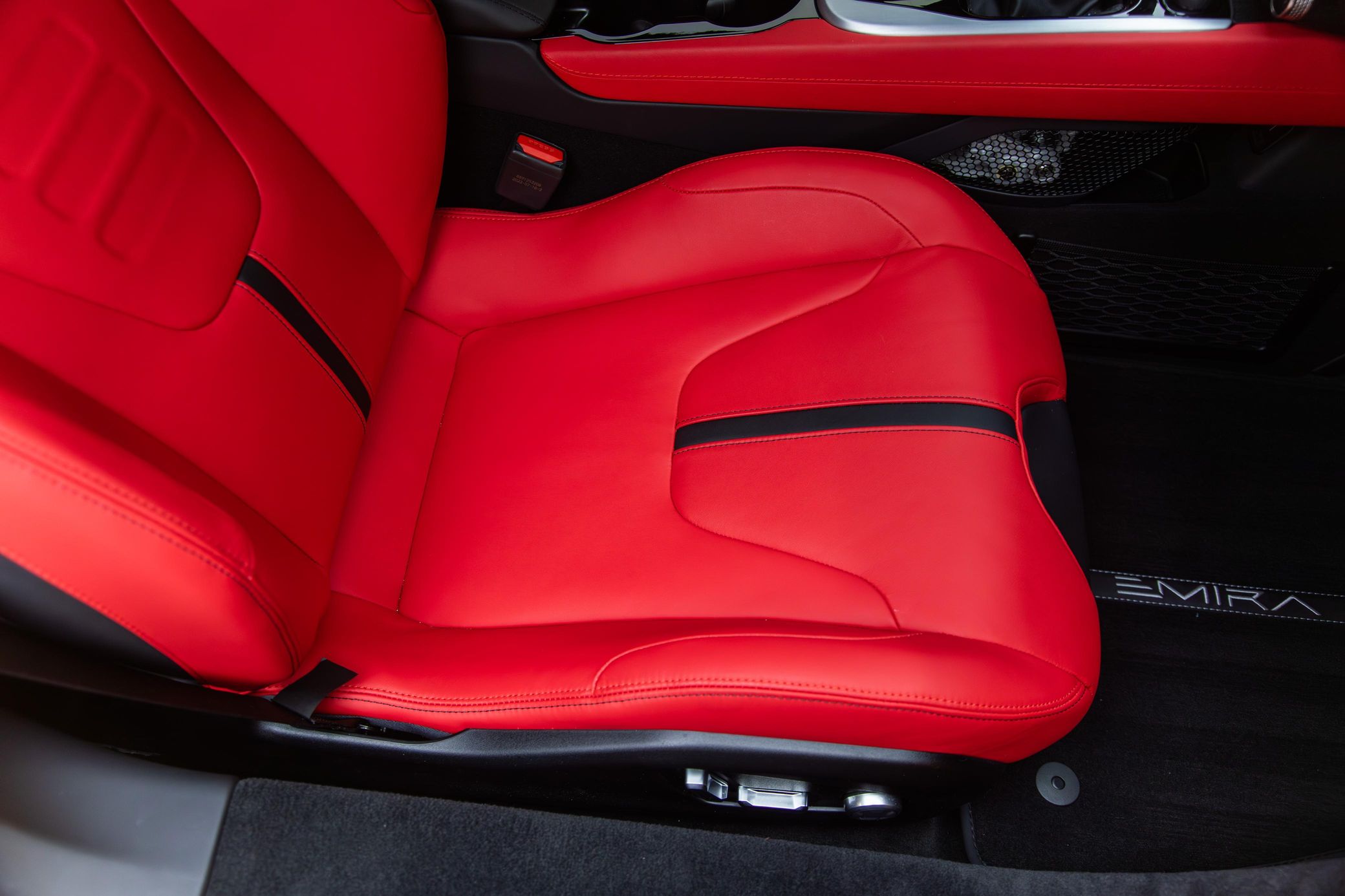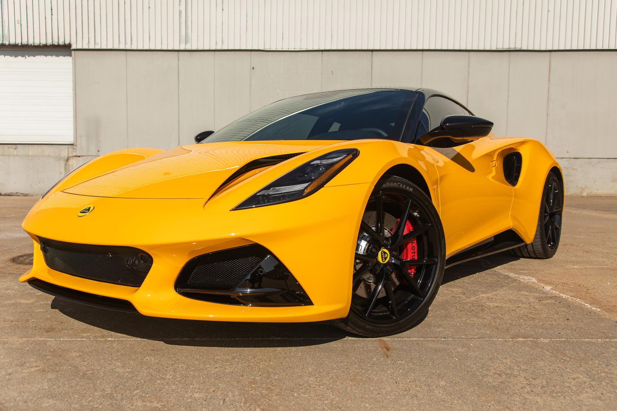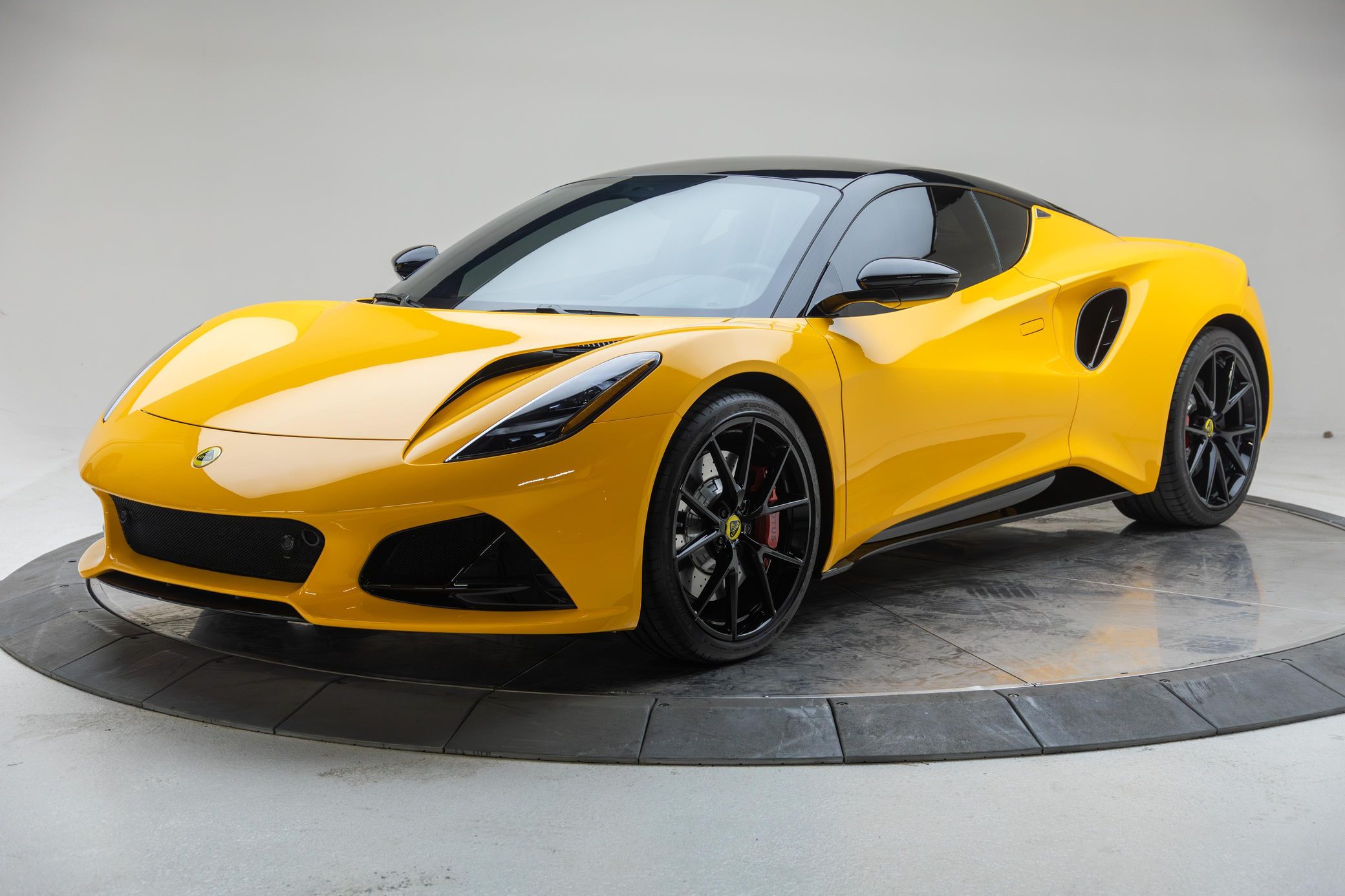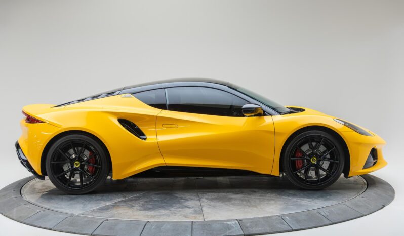 its nimble handling, and its potent 400-horsepower supercharged V6. This particular Emira is a First Edition model that's equipped with the desirable 6-speed manual transmission. It's also finished in a head-turning Hethel Yellow over red color combination, and it's well-equipped with the Full Black Pack, the Touring suspension system, heated sport seats, and a KEF Uni-Q Premium Audio sound system. To top it off, this Emira touts low mileage