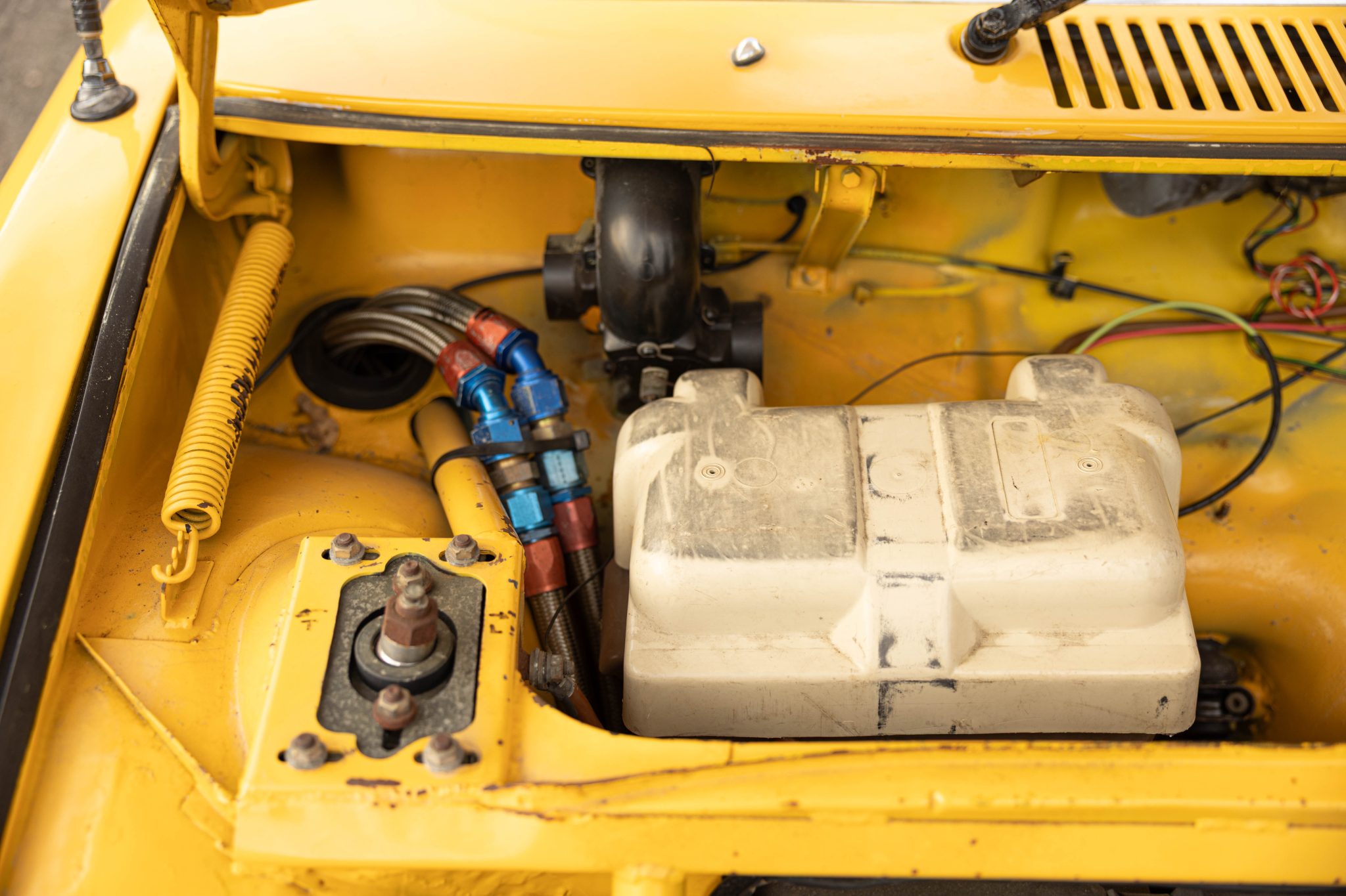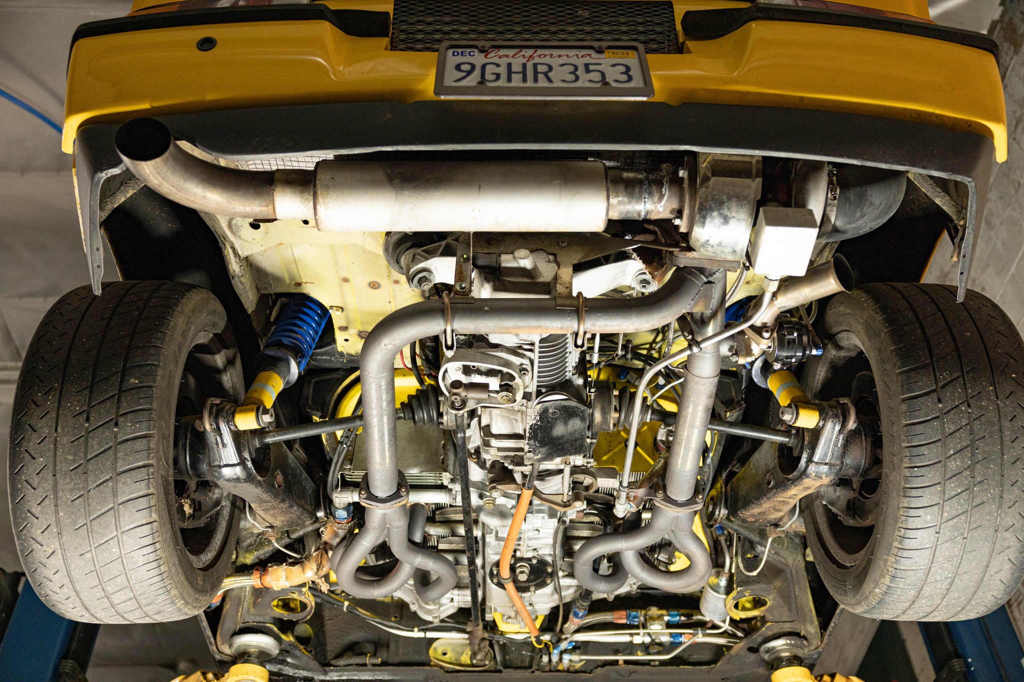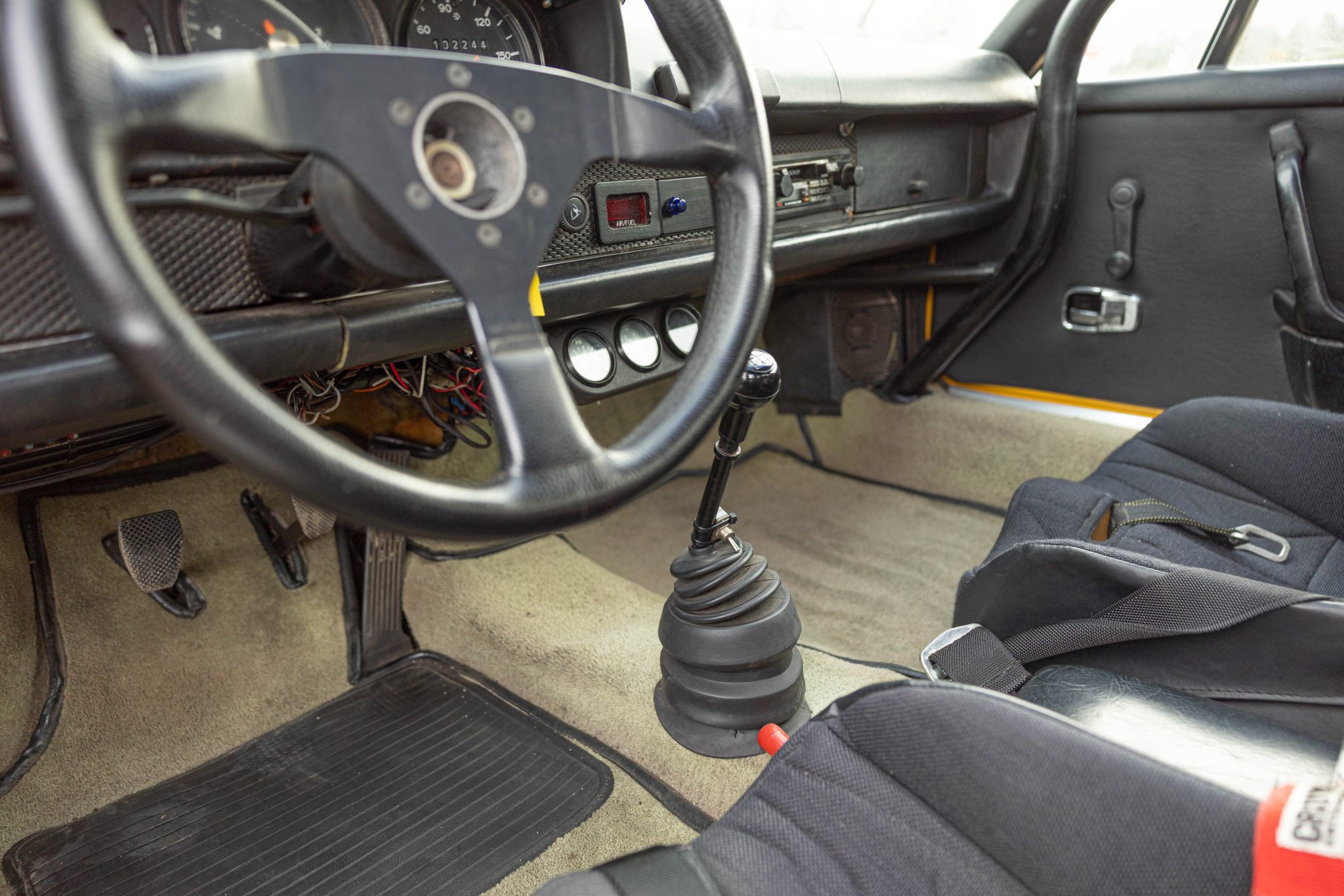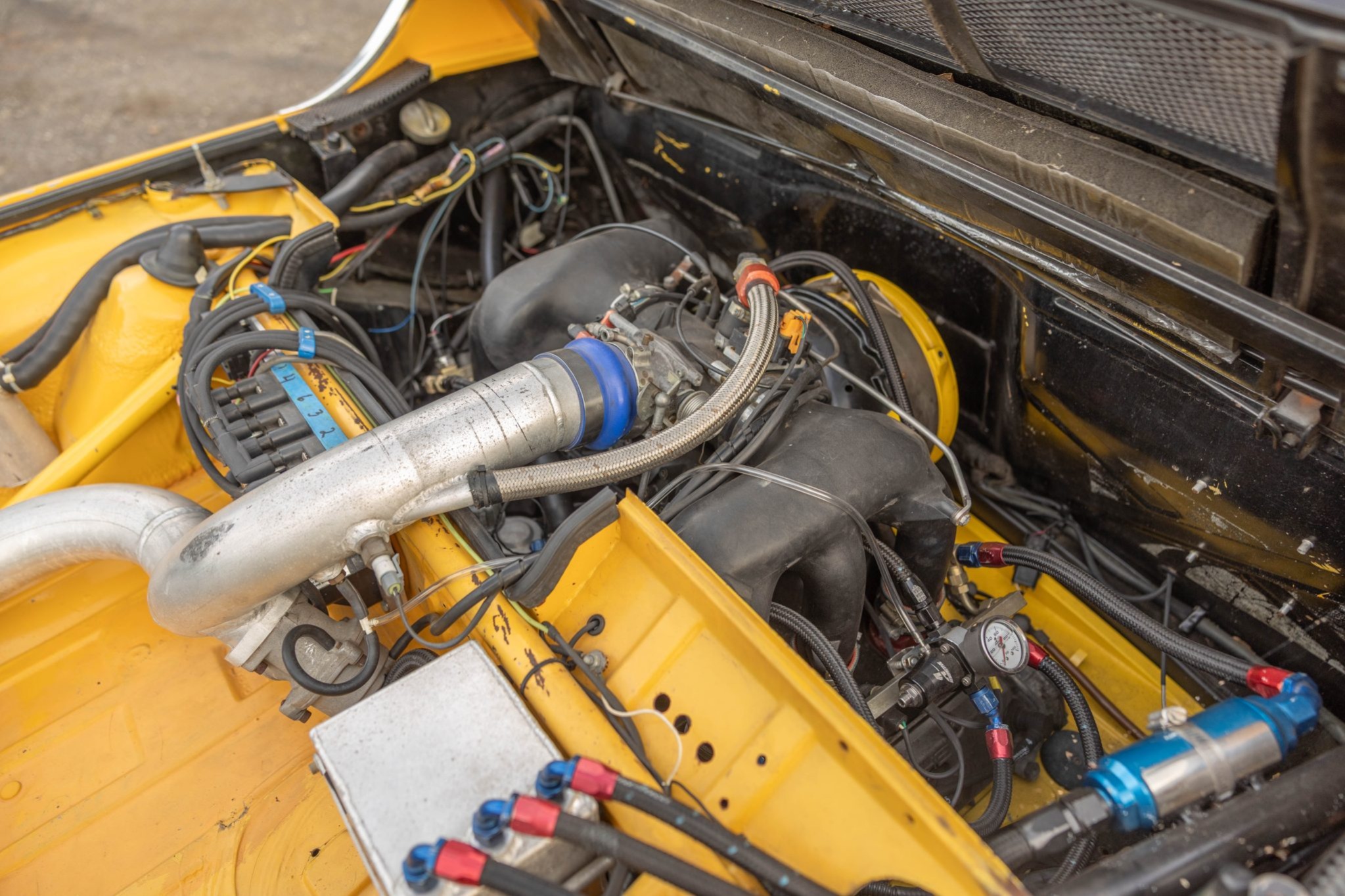 This 1971 Porsche 914 began as a four-cylinder model, and it was built by Richard Clewett of Clewett Engineering with a turbocharged flat-six using 3.3 pistons and a 3.0 case. The car rides on 16″ Fuchs-style wheels and has adjustable rear Bilstein coilovers as well as uprated suspension and braking components, and inside is a roll cage, race seats, harnesses, extra gauges, and a MOMO steering wheel. The car also has front and rear spoilers, an intercooler, headers and a custom exhaust system, a fuel cell, an oil cooler, and more as described below.