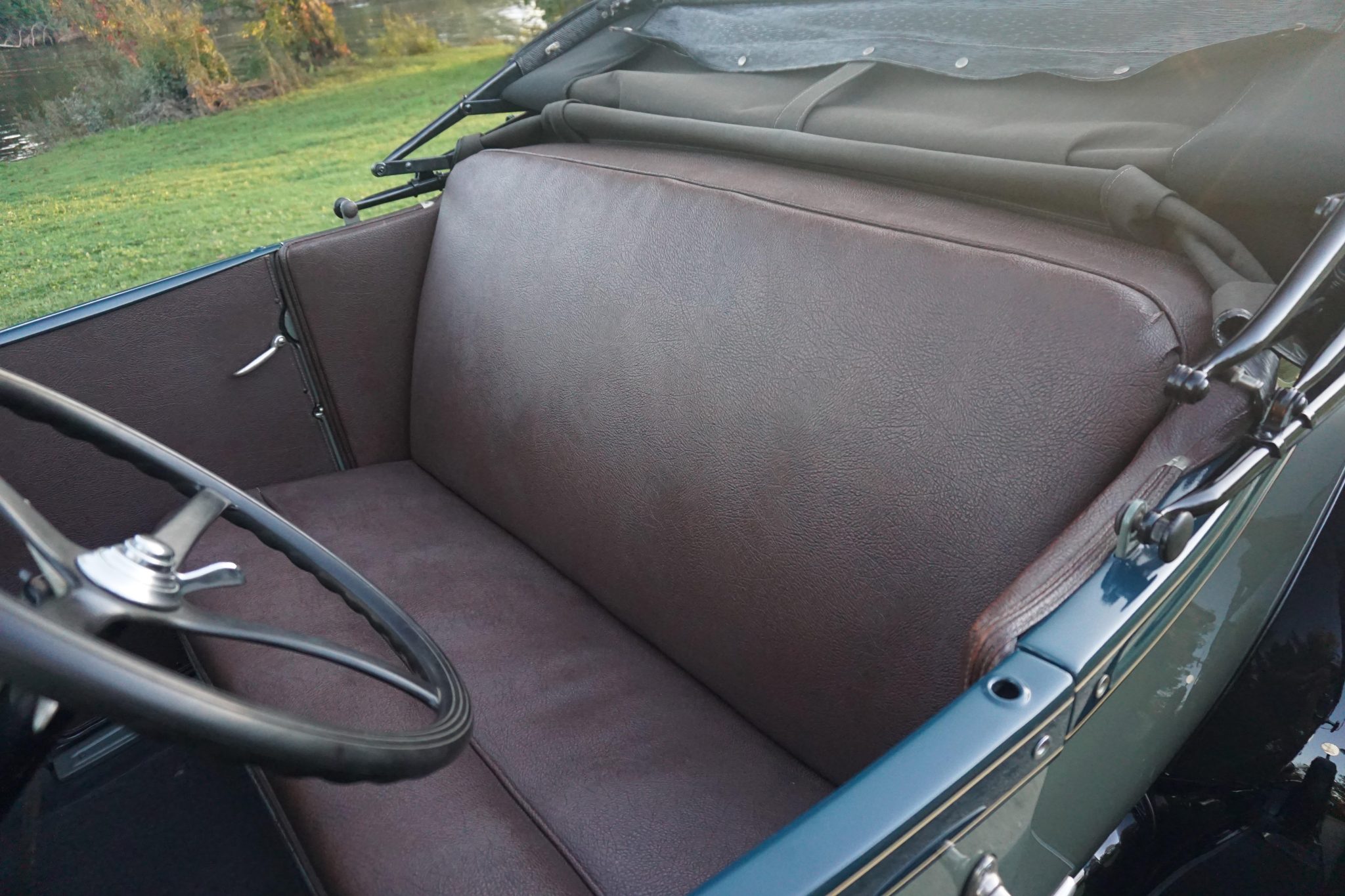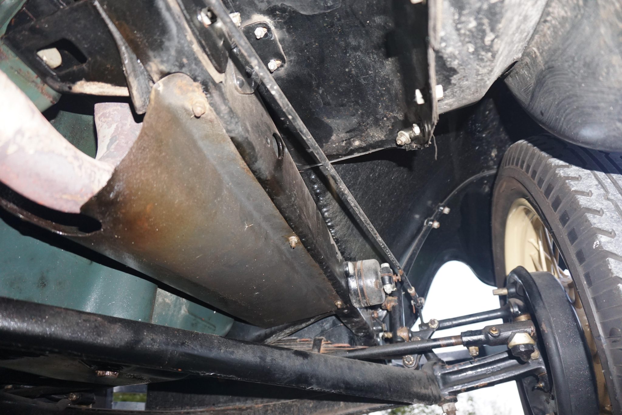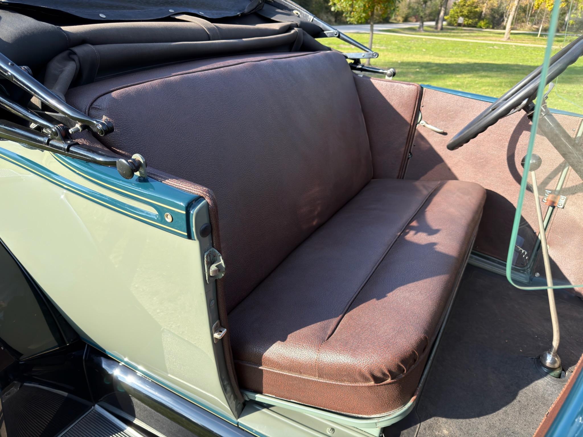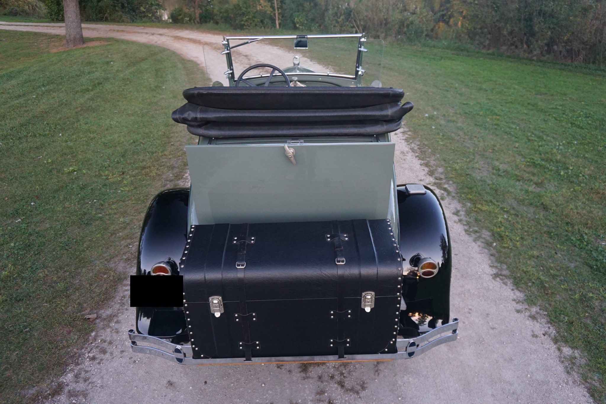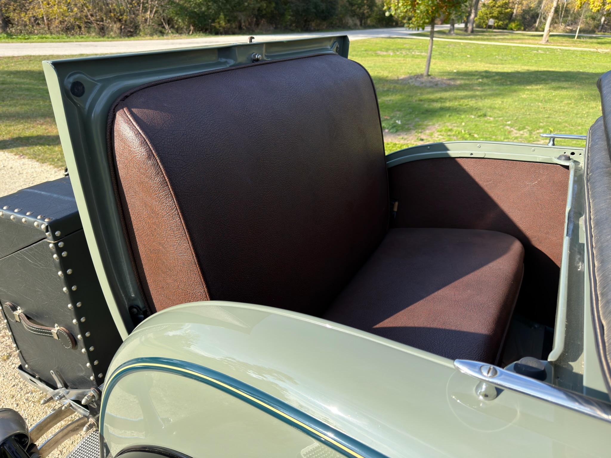 Finished in two-tone green with black fenders and yellow accents, the car is powered by a 201ci L-head inline-four paired with a three-speed manual transmission and is equipped with a black convertible top, brown vinyl upholstery, yellow 21″ wire wheels, a tilt-out windshield, a grille guard, a fold-down luggage rack hosting a trunk, dual side-mounted spares, an alternator, and a rumble seat.