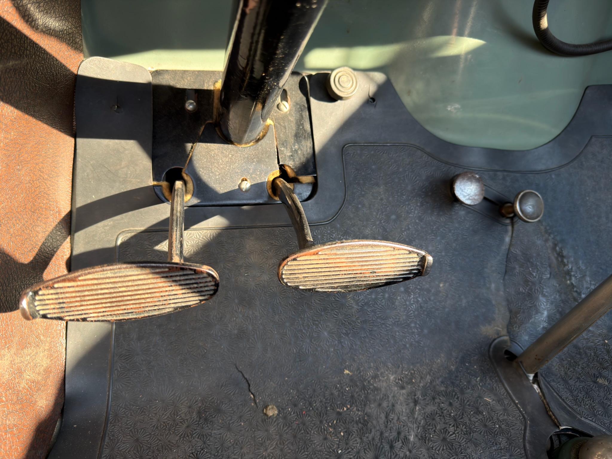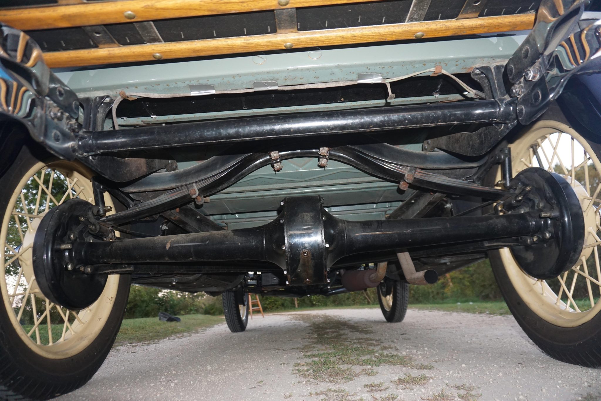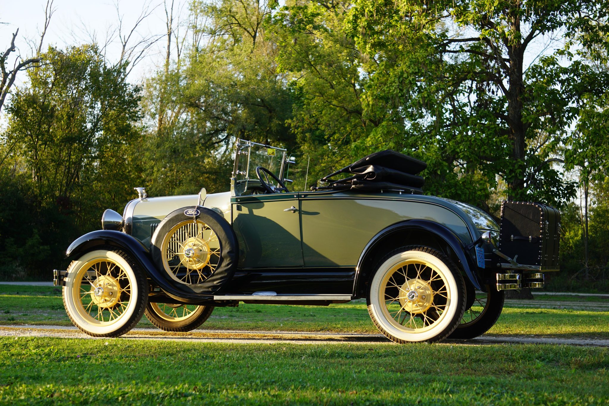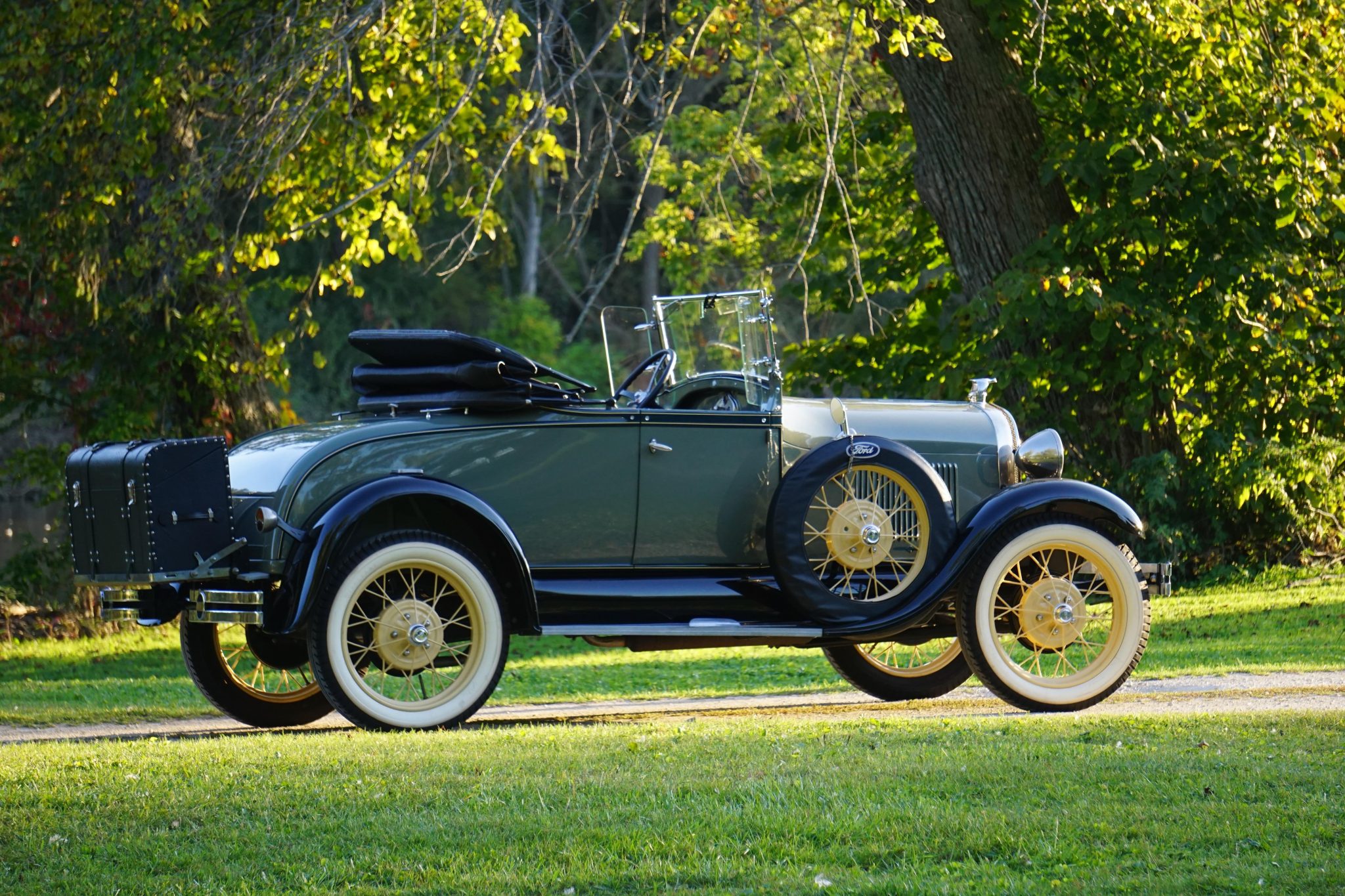 Finished in two-tone green with black fenders and yellow accents, the car is powered by a 201ci L-head inline-four paired with a three-speed manual transmission and is equipped with a black convertible top, brown vinyl upholstery, yellow 21″ wire wheels, a tilt-out windshield, a grille guard, a fold-down luggage rack hosting a trunk, dual side-mounted spares, an alternator, and a rumble seat.