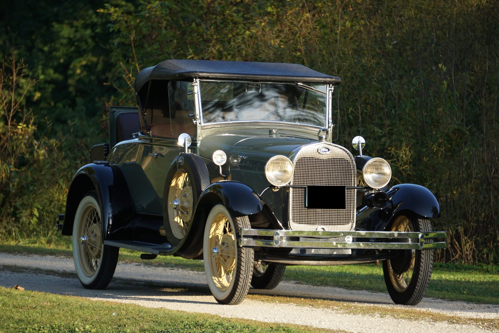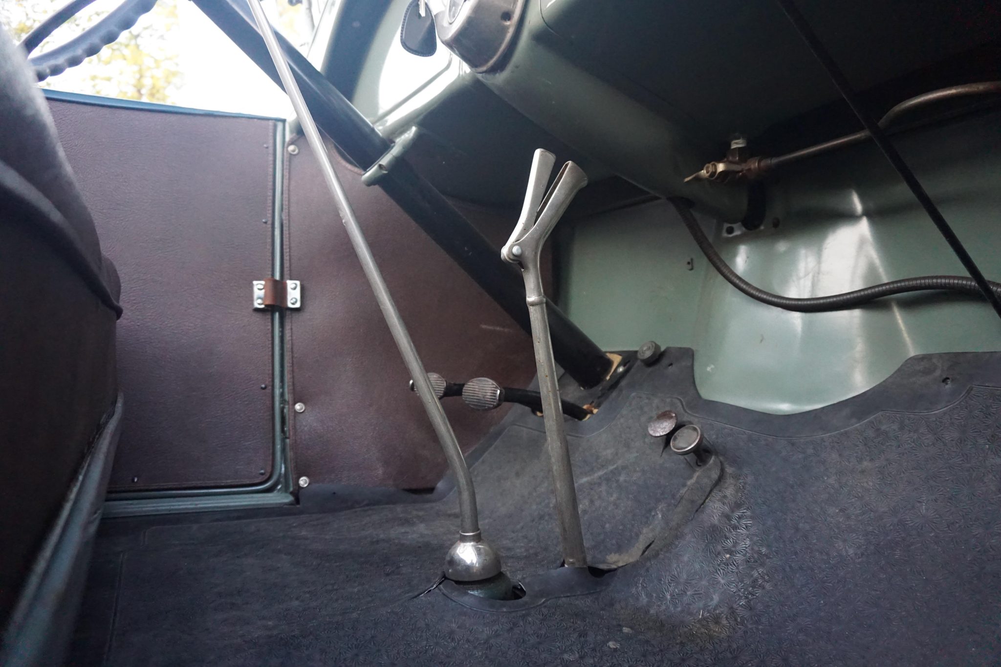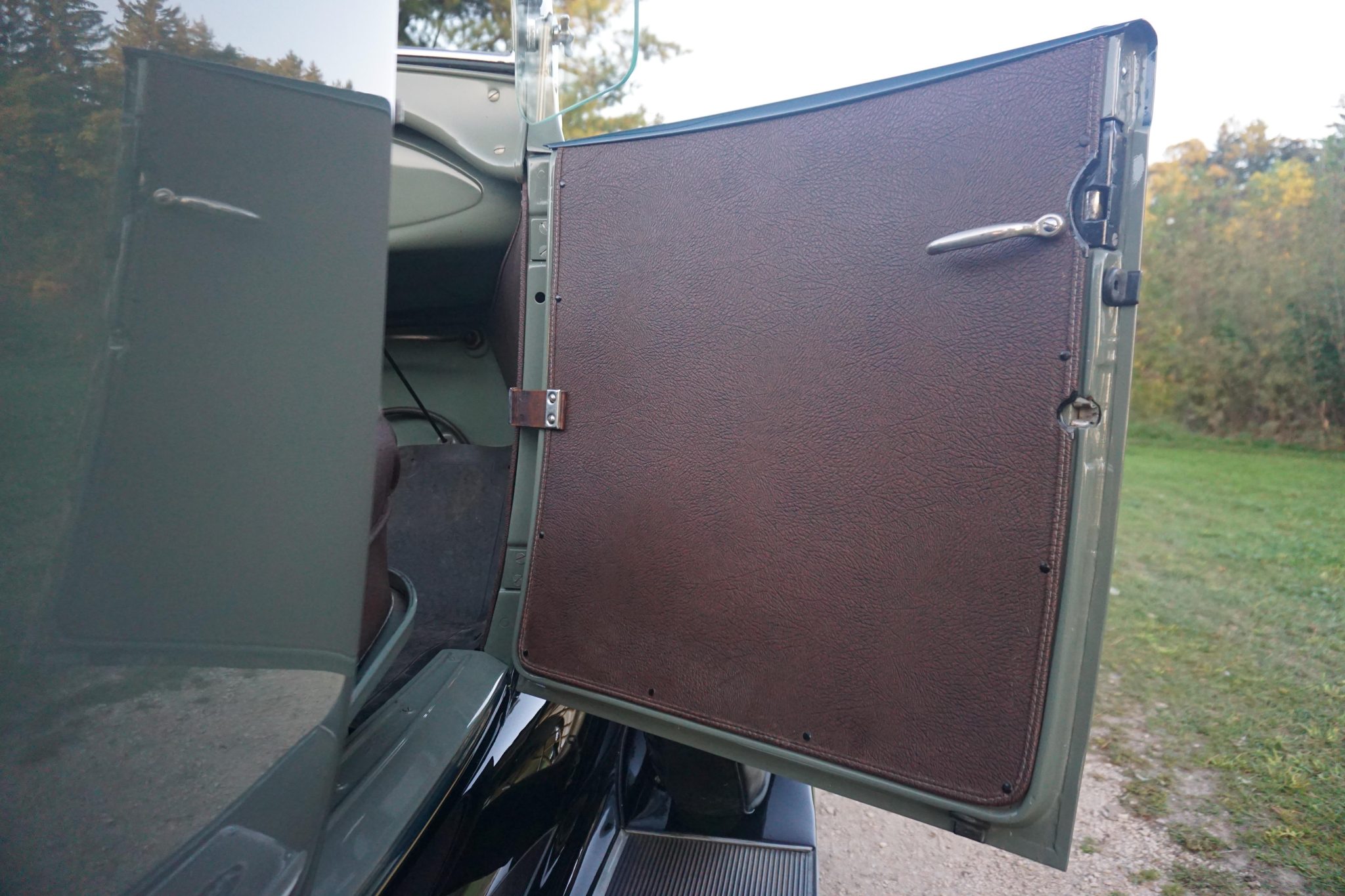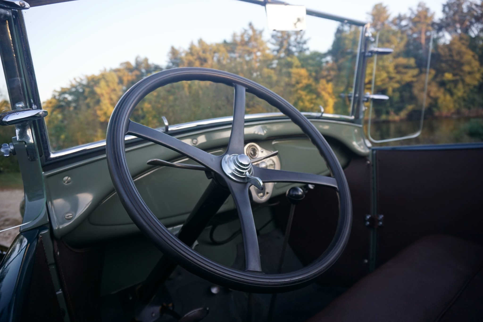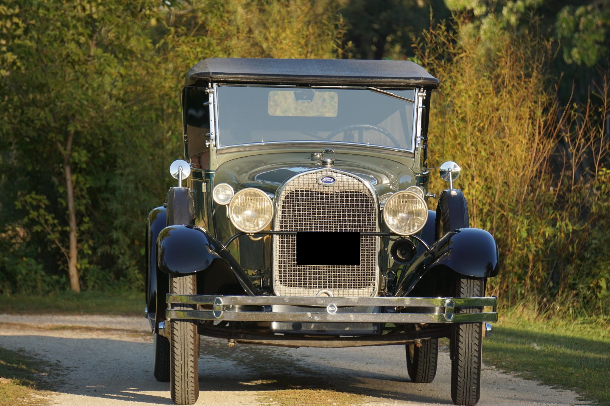 Finished in two-tone green with black fenders and yellow accents, the car is powered by a 201ci L-head inline-four paired with a three-speed manual transmission and is equipped with a black convertible top, brown vinyl upholstery, yellow 21″ wire wheels, a tilt-out windshield, a grille guard, a fold-down luggage rack hosting a trunk, dual side-mounted spares, an alternator, and a rumble seat.