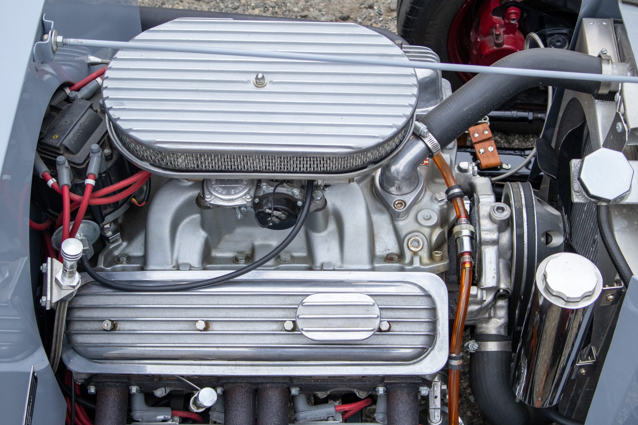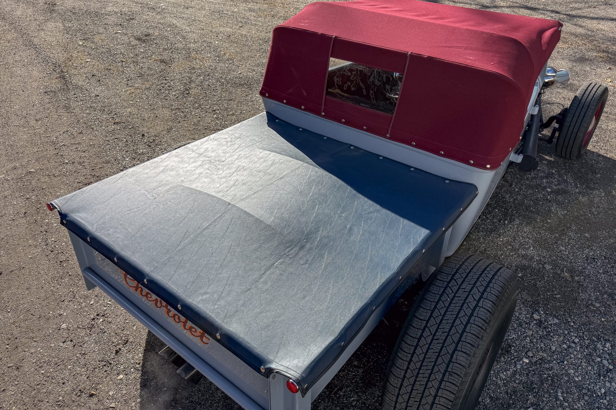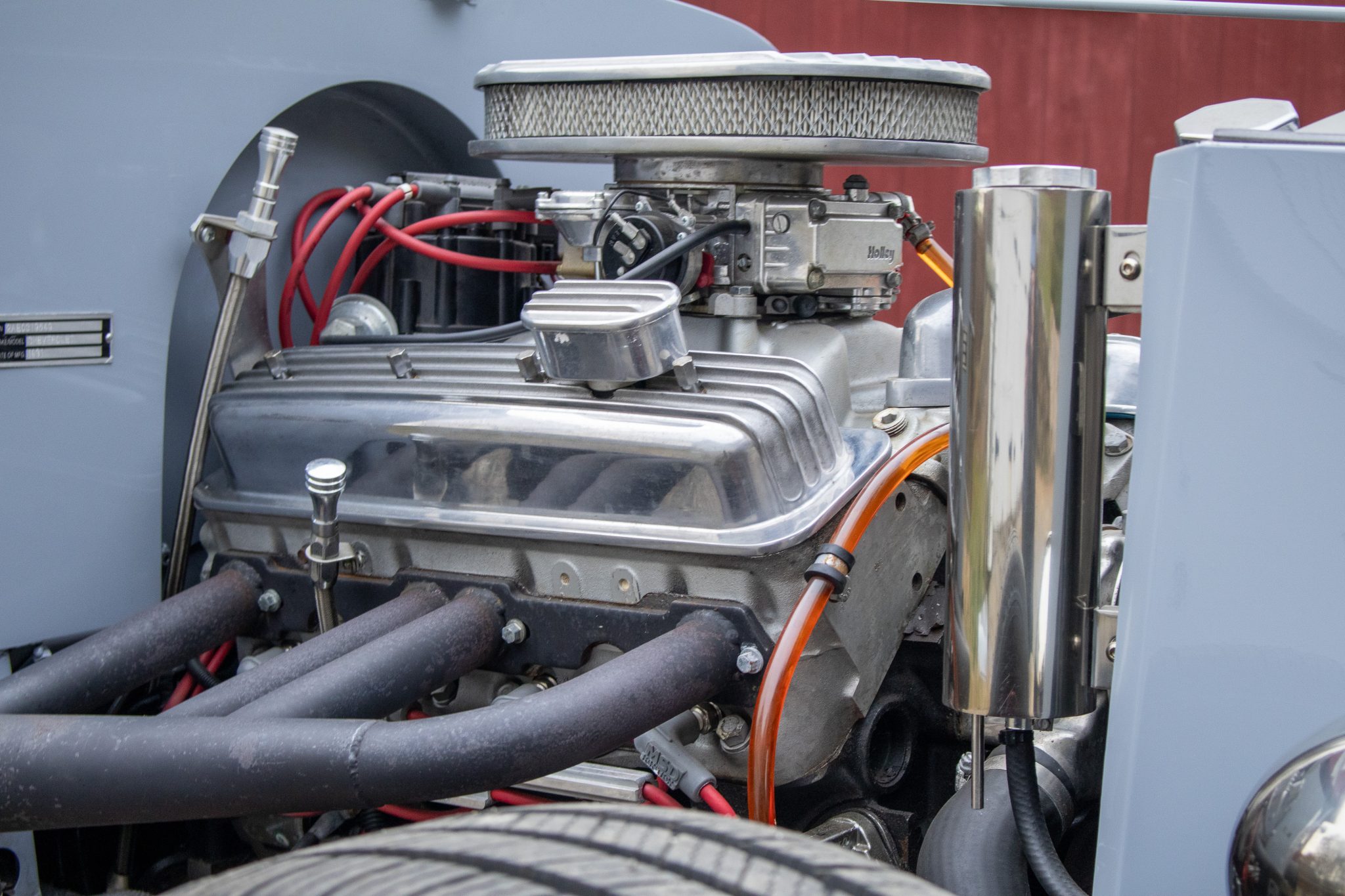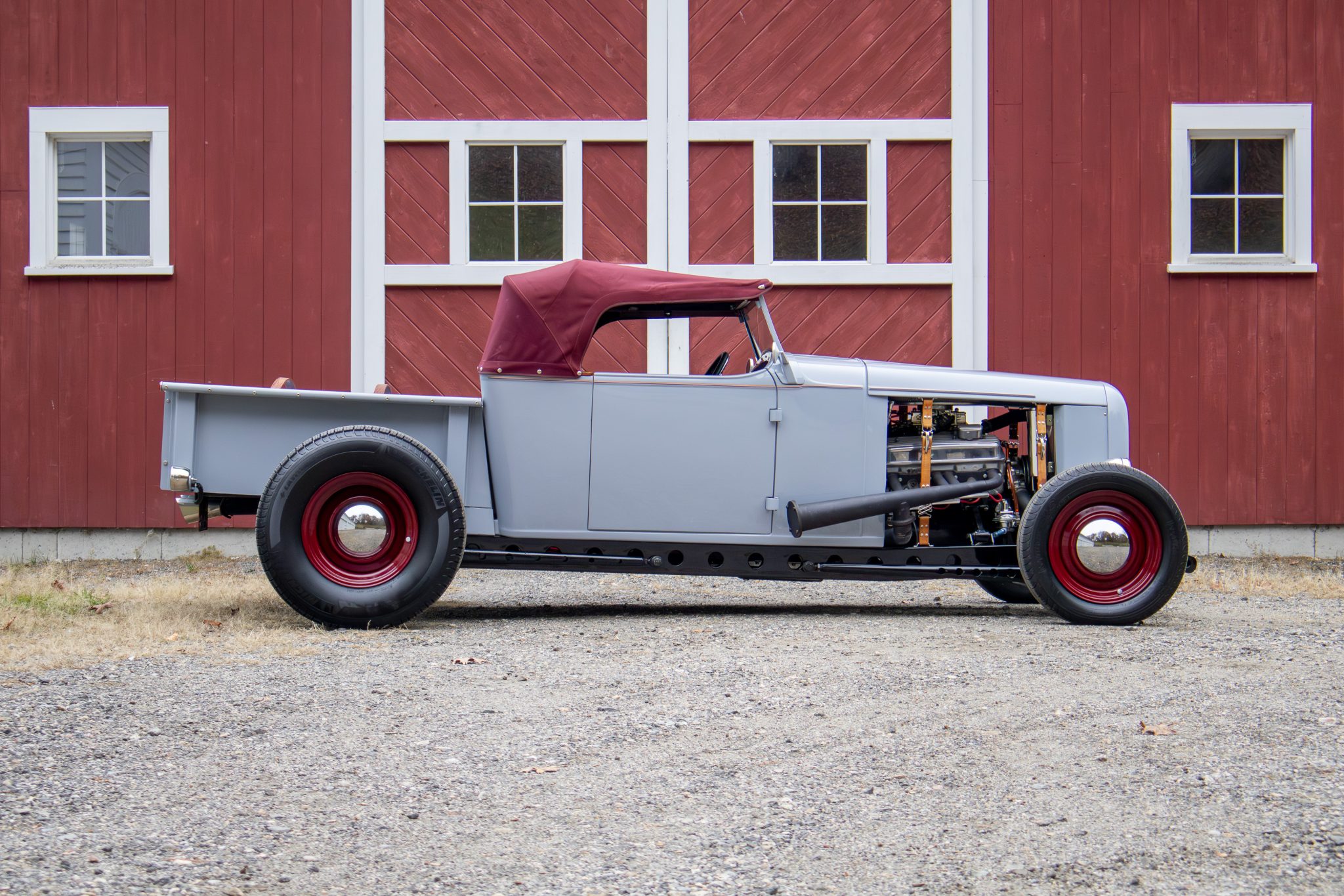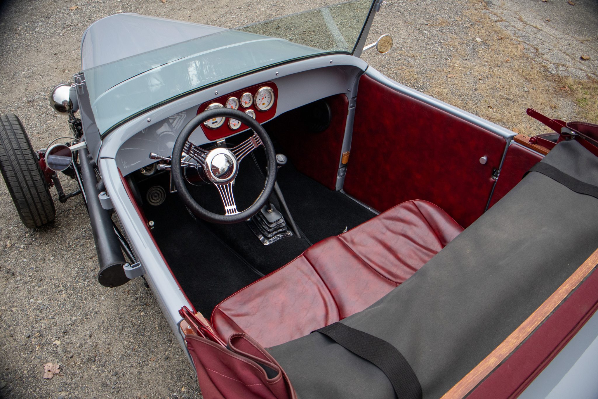 Power comes from a 350ci ZZ4 V8 linked to a four-speed automatic transmission and a limited-slip differential, and the car rides on a fabricated frame with a front drop axle, drilled wishbones, QA1 shocks, power steering, and four-wheel disc brakes. A red soft top, wheels, and upholstery complement the gray paint, and other highlights include a fuel-tank-style storage compartment, a banjo-style steering wheel, a Lokar shifter, a Holley carburetor, an Edelbrock Performer RPM intake manifold, and custom lake-style headers. This hot rod