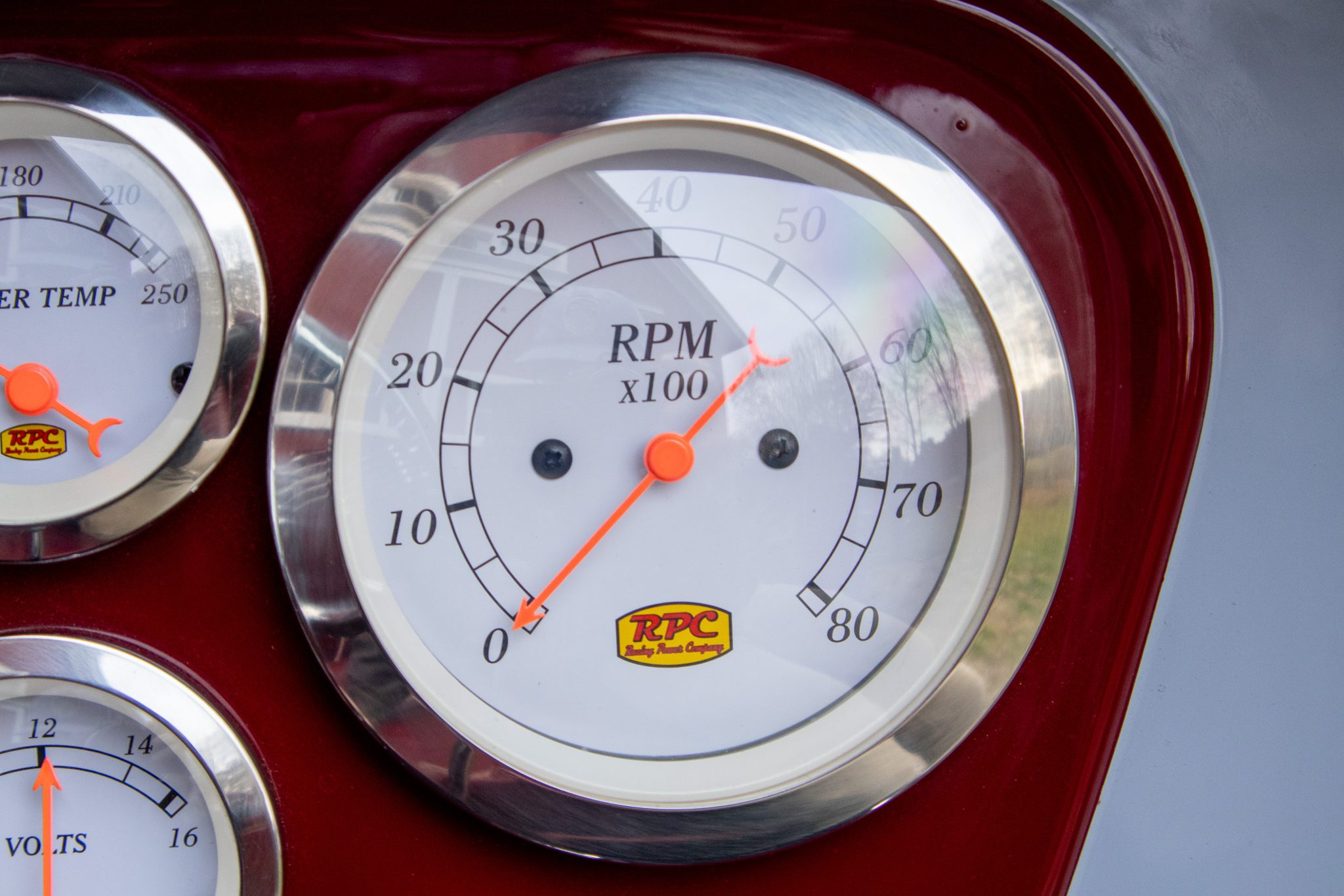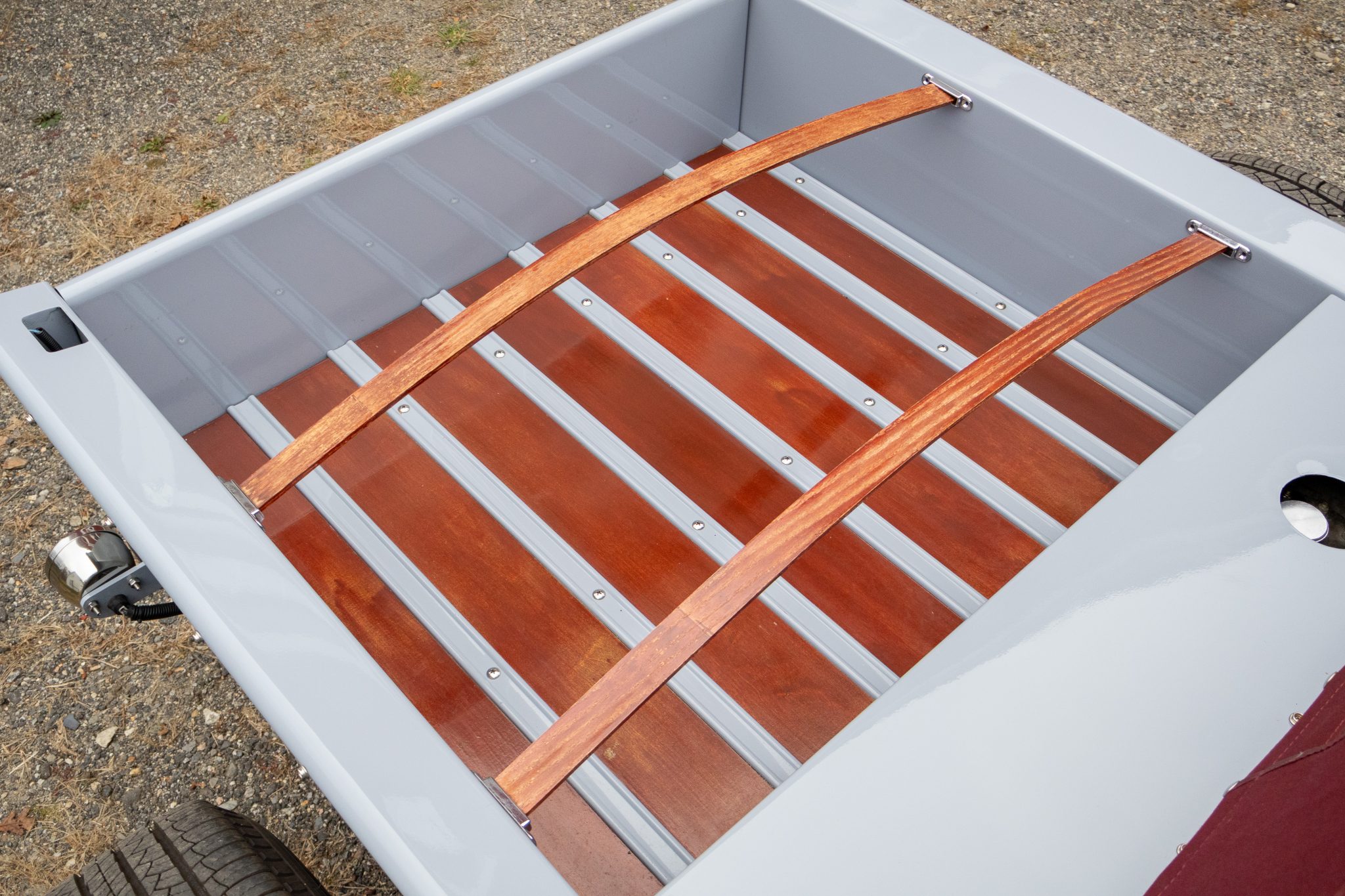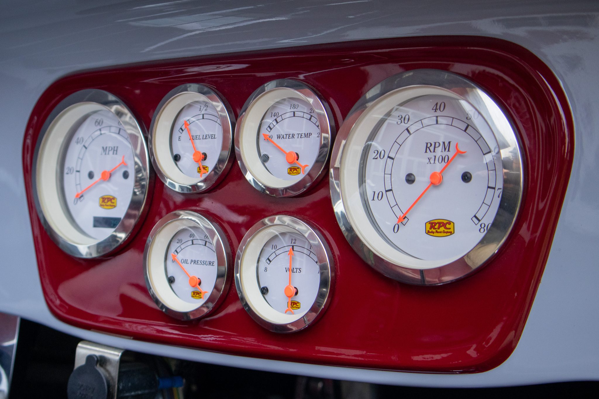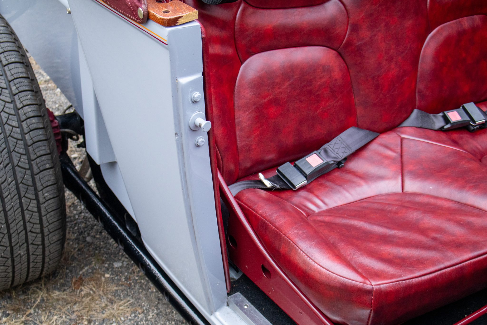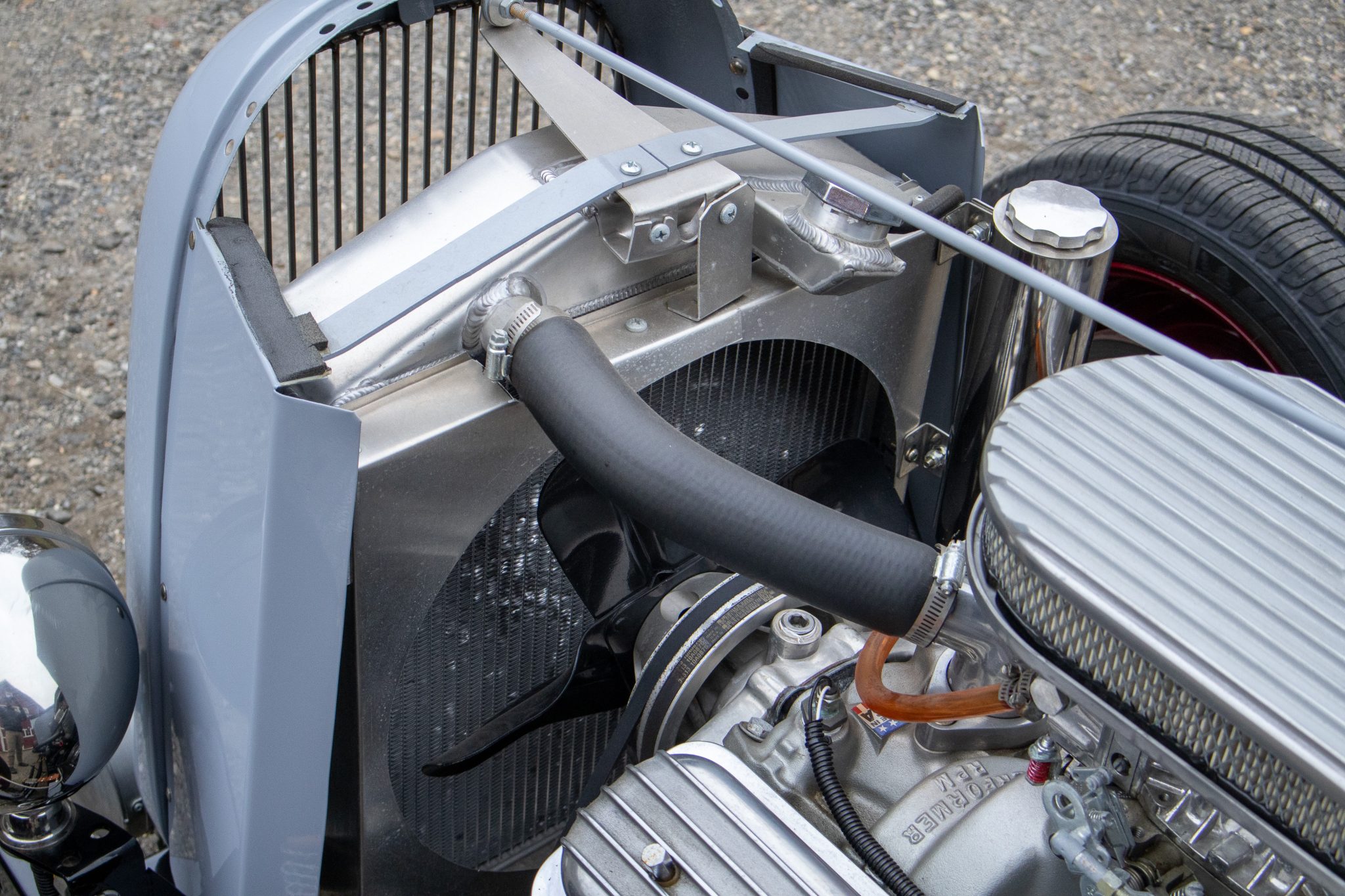 Power comes from a 350ci ZZ4 V8 linked to a four-speed automatic transmission and a limited-slip differential, and the car rides on a fabricated frame with a front drop axle, drilled wishbones, QA1 shocks, power steering, and four-wheel disc brakes. A red soft top, wheels, and upholstery complement the gray paint, and other highlights include a fuel-tank-style storage compartment, a banjo-style steering wheel, a Lokar shifter, a Holley carburetor, an Edelbrock Performer RPM intake manifold, and custom lake-style headers. This hot rod