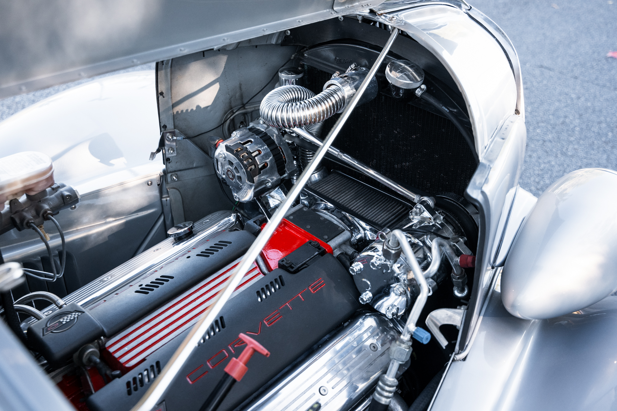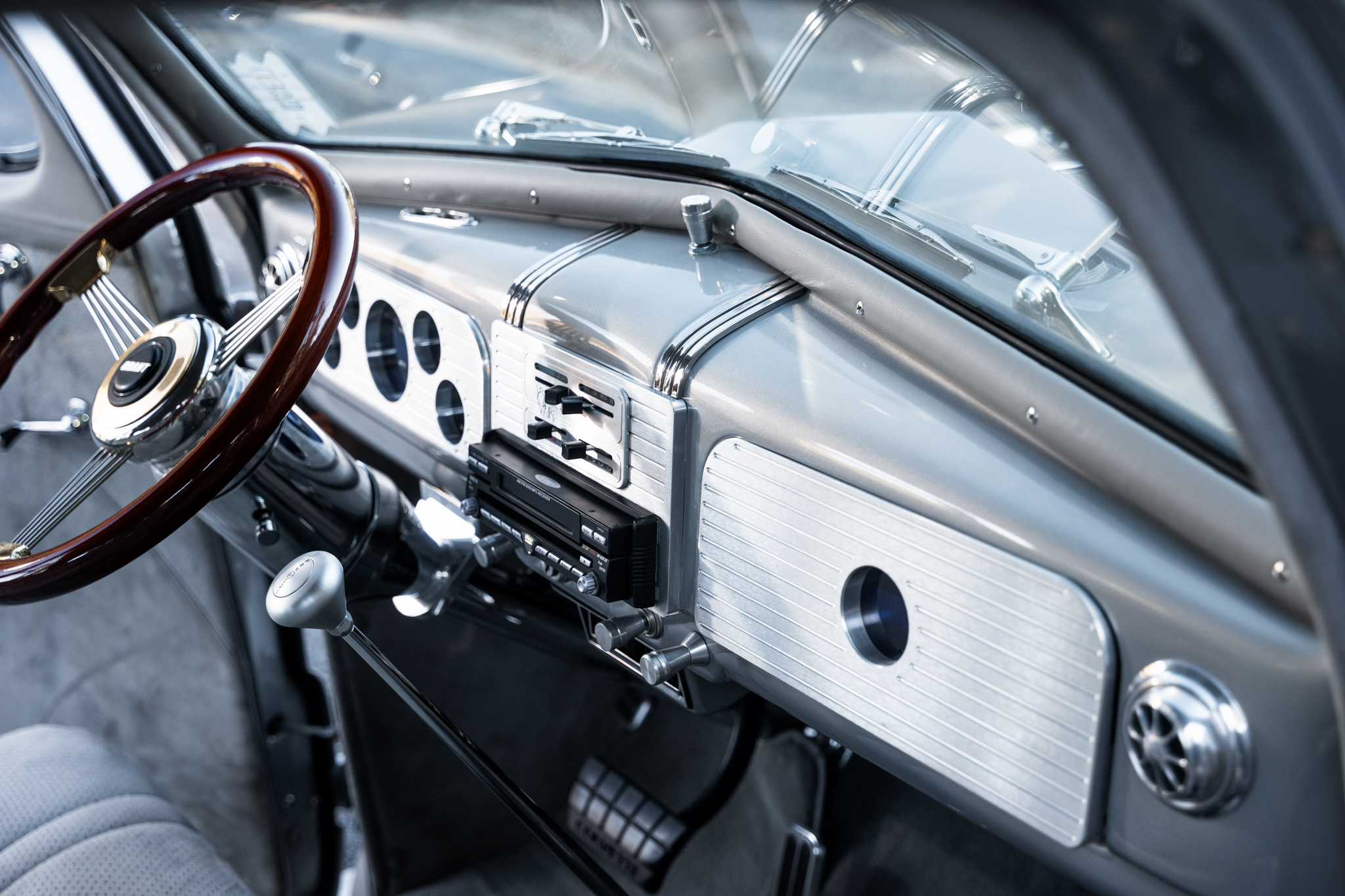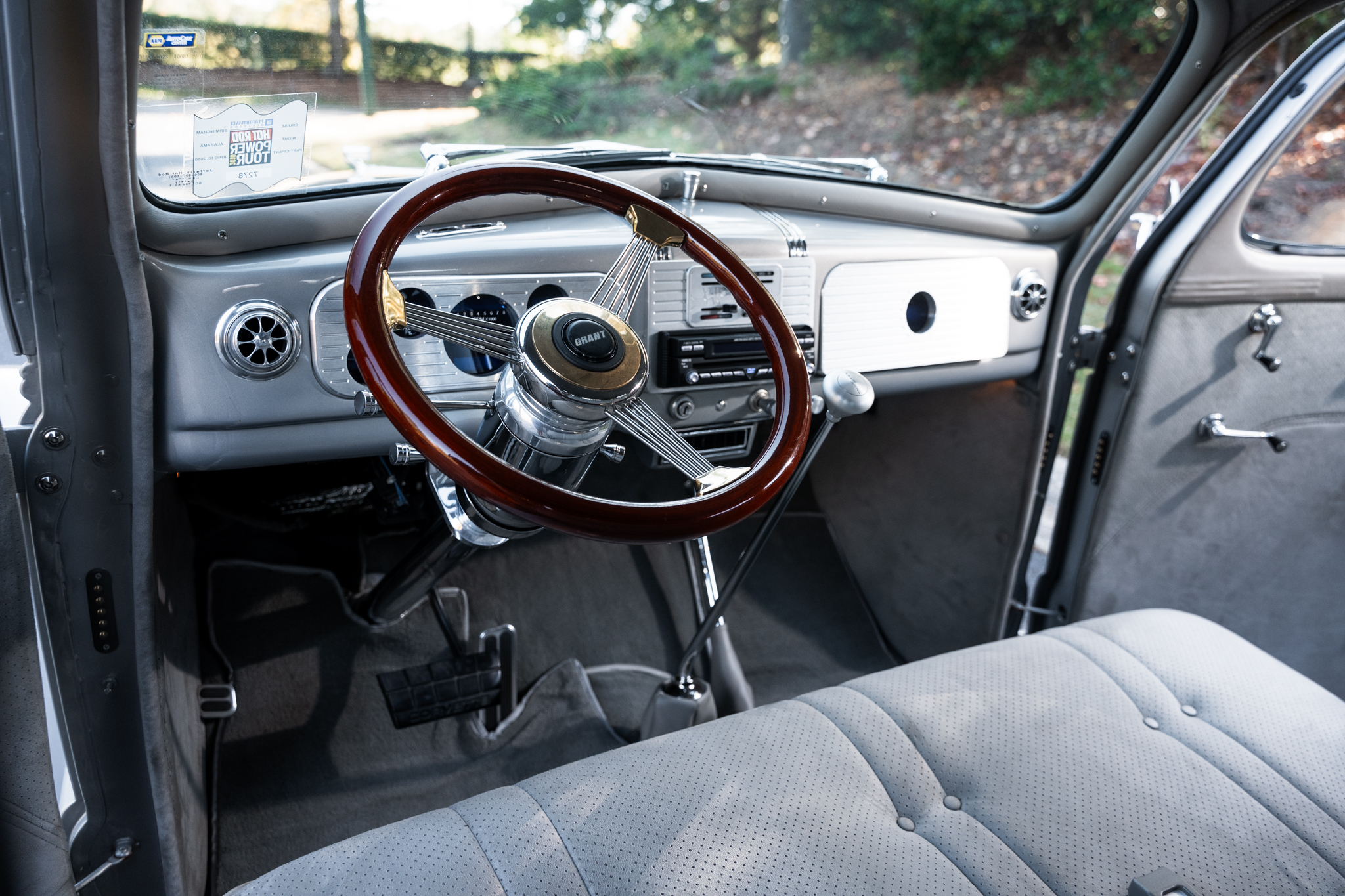 It was built into a street rod in the early 2000s, and it now rides on a Corvette C4-based independent suspension with chrome C5 Z06 wheels, four-wheel disc brakes, and power rack-and-pinion steering. the fuel-injected 5.7-liter LT1 V8 and 4L60E four-speed automatic transmission were rebuilt at the time of installation, and a limited-slip differential and a dual exhaust system were also installed. The body has been refinished in silver over a custom gray microsuede interior equipped with Vintage Air climate control, power front windows, tilt steering, a Lokar floor shifter, Dakota Digital instrumentation, and a Jensen DVD receiver.