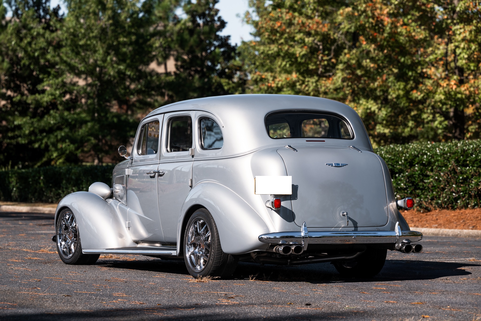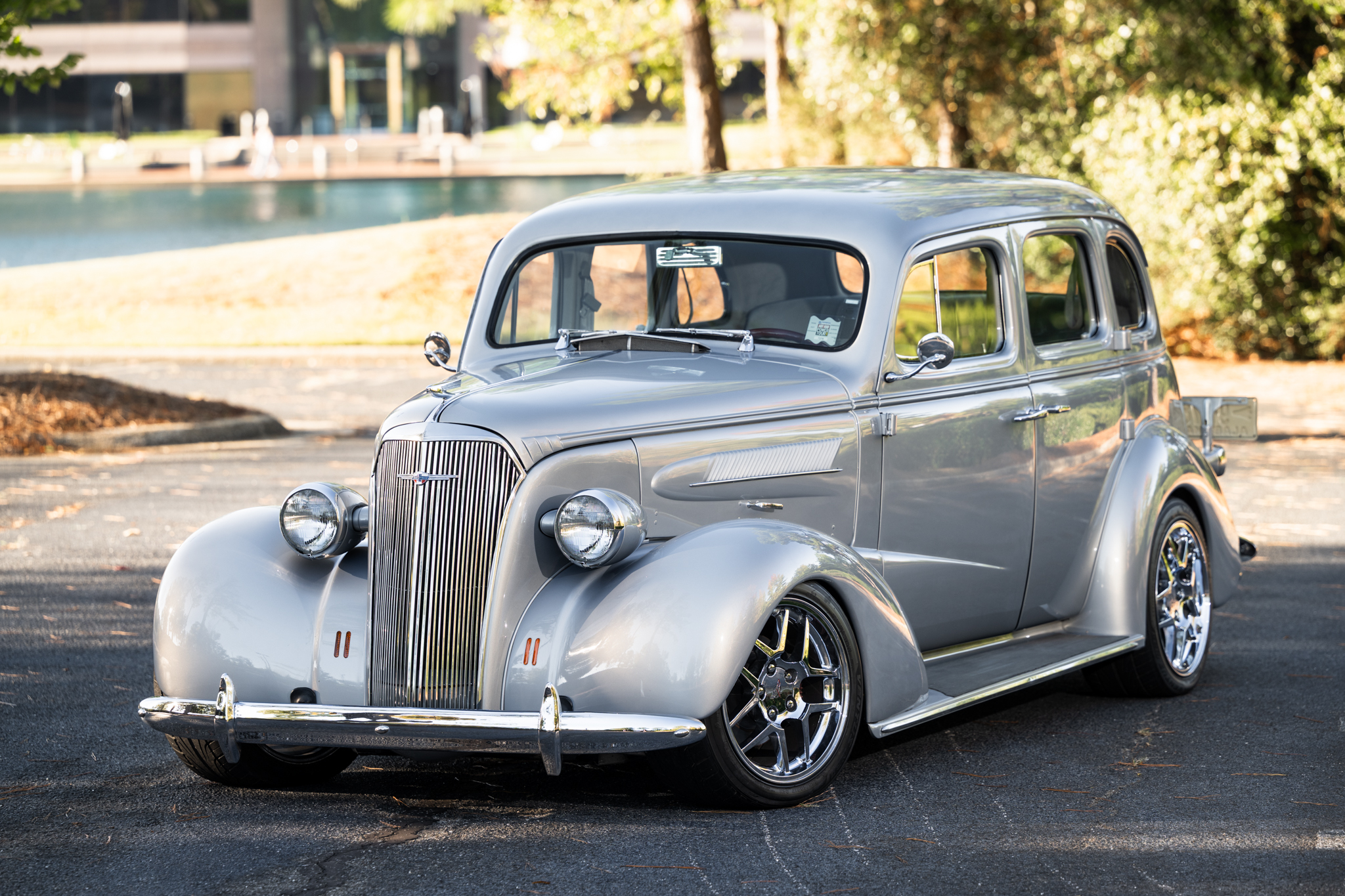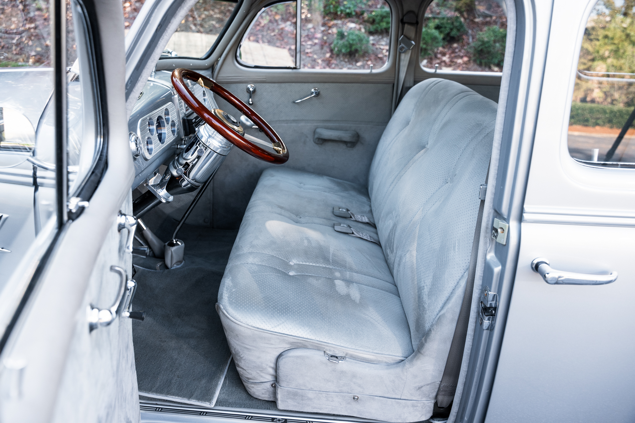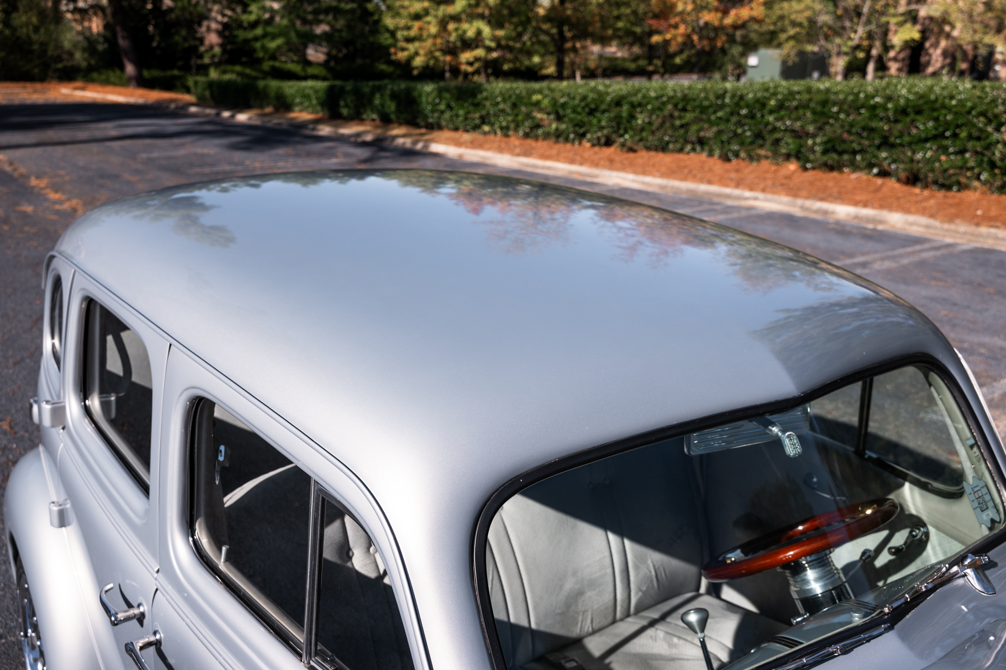 It was built into a street rod in the early 2000s, and it now rides on a Corvette C4-based independent suspension with chrome C5 Z06 wheels, four-wheel disc brakes, and power rack-and-pinion steering. the fuel-injected 5.7-liter LT1 V8 and 4L60E four-speed automatic transmission were rebuilt at the time of installation, and a limited-slip differential and a dual exhaust system were also installed. The body has been refinished in silver over a custom gray microsuede interior equipped with Vintage Air climate control, power front windows, tilt steering, a Lokar floor shifter, Dakota Digital instrumentation, and a Jensen DVD receiver.