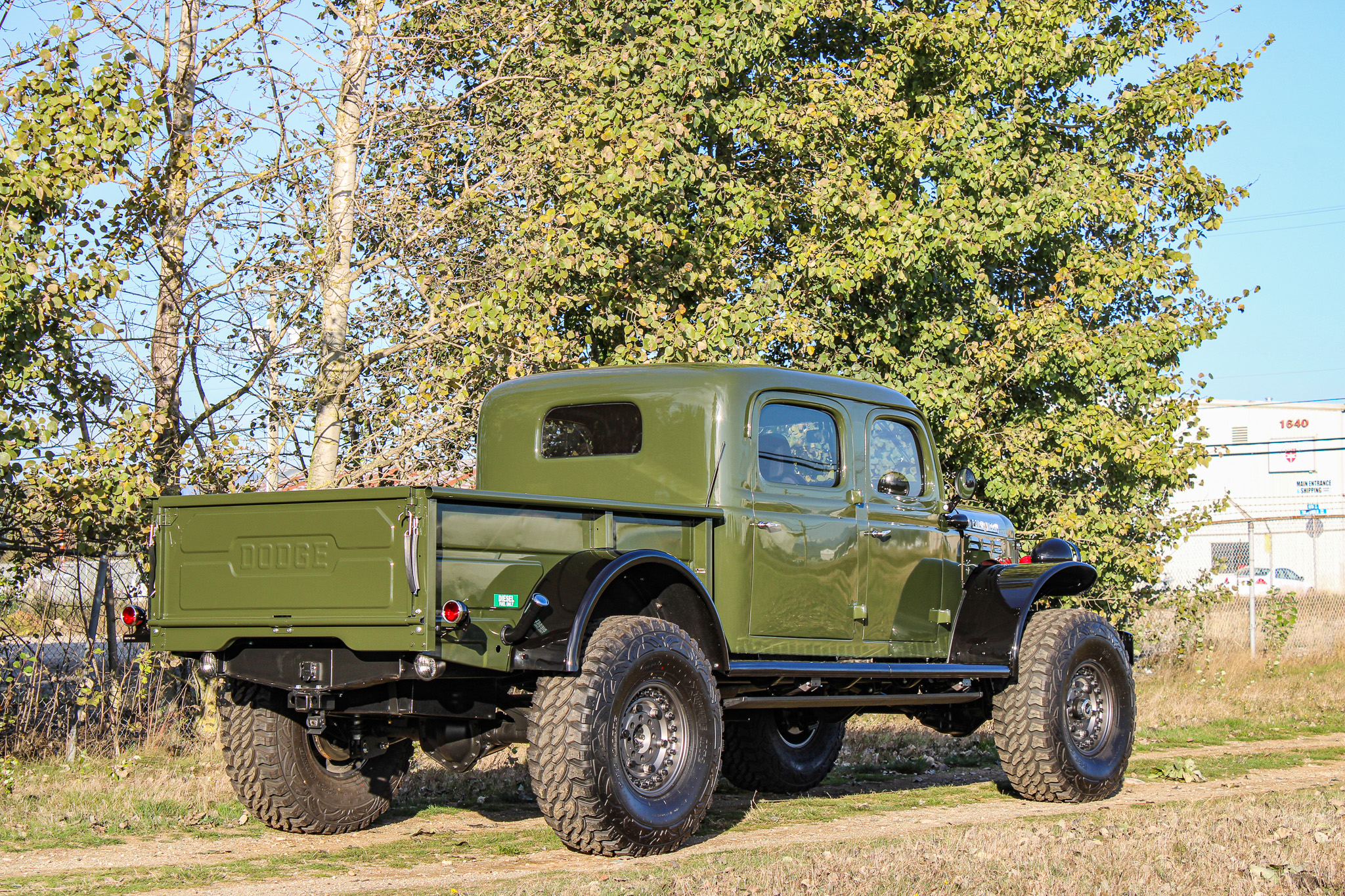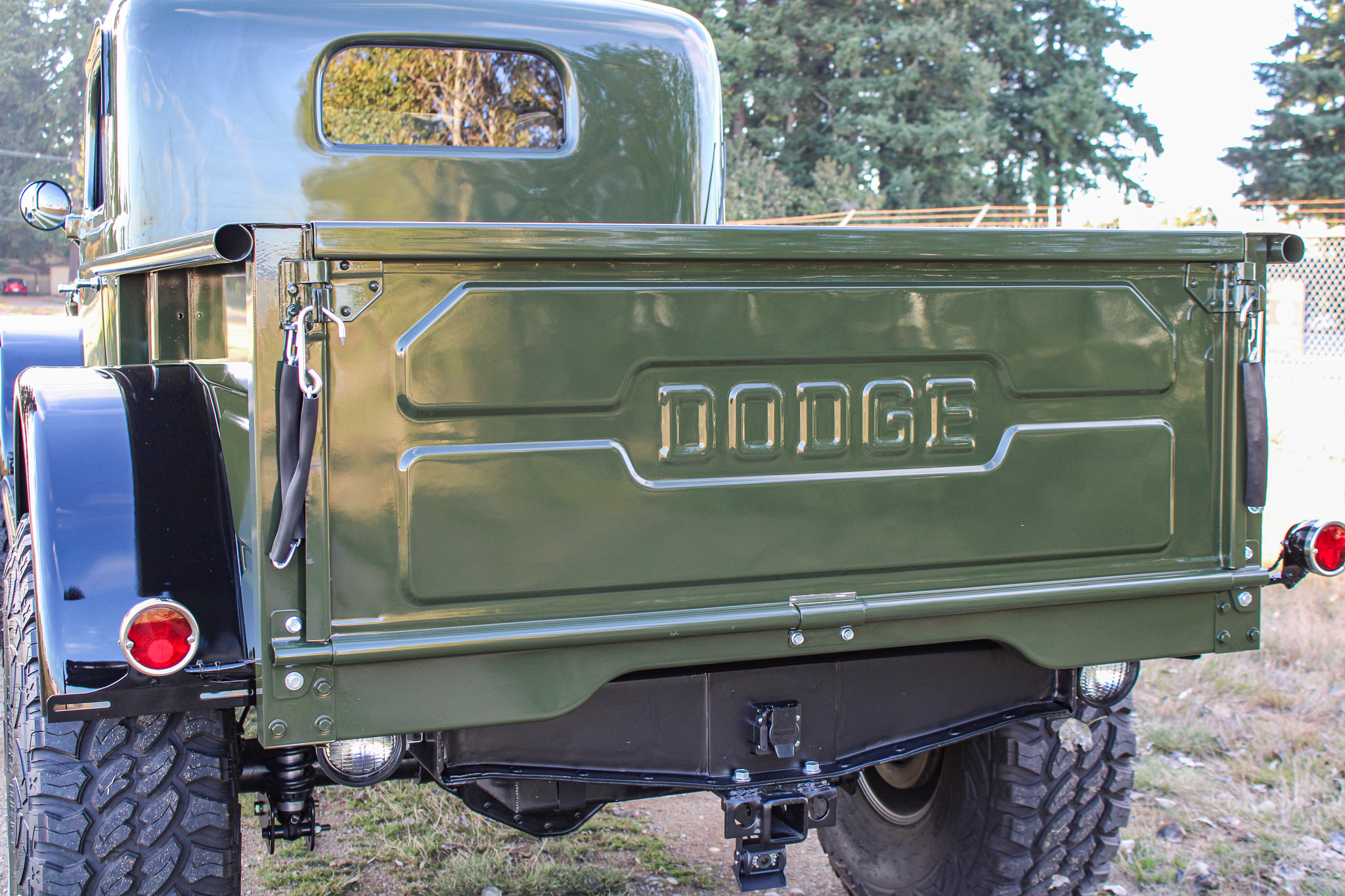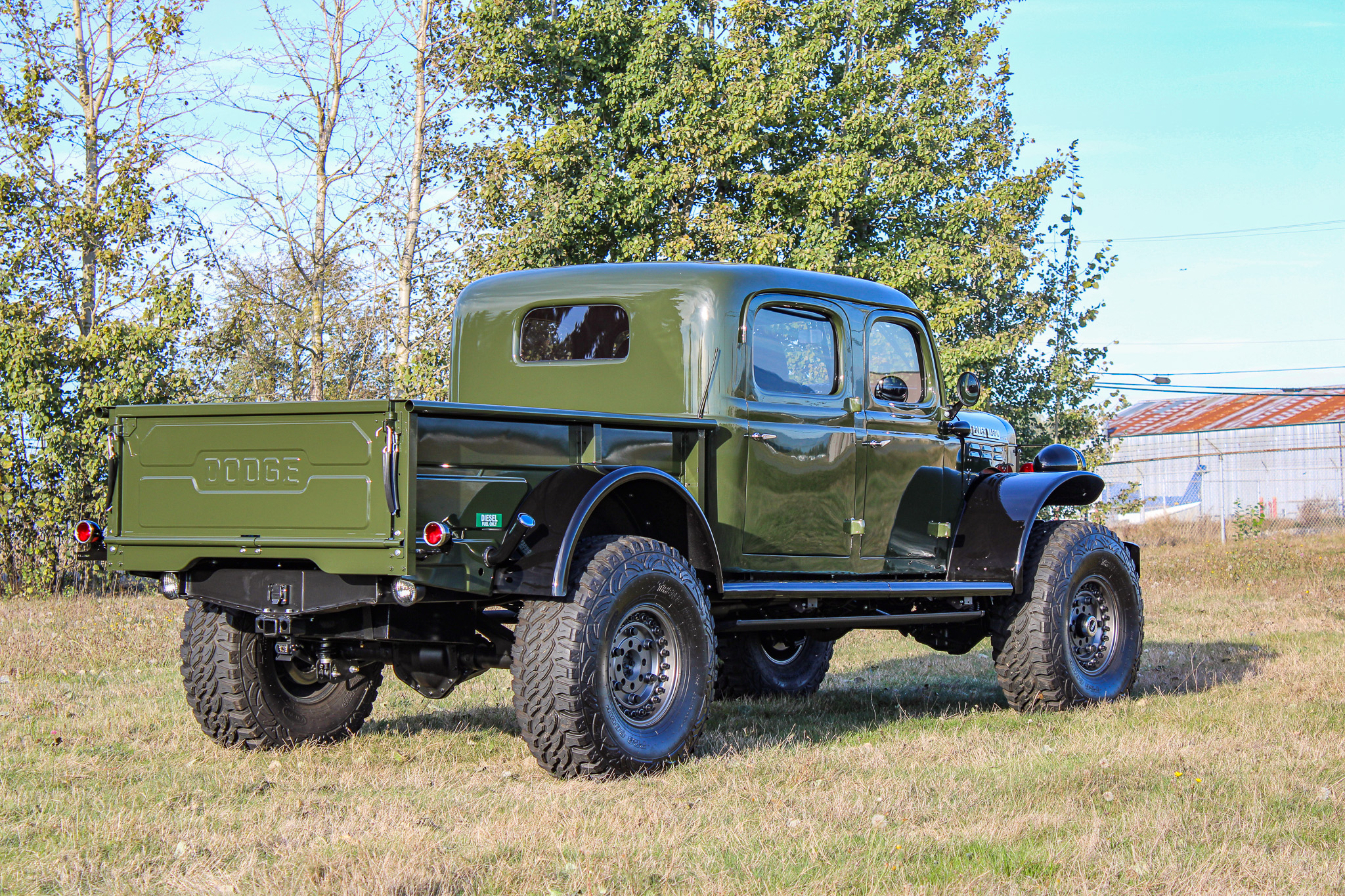 This 1946 Dodge Power Wagon WDX was refurbished in 2024 with work that involved fitting an intercooled Cummins 3.9-liter turbodiesel inline-four and an NV4500 five-speed manual transmission, lengthening the frame by about 15 inches, extending the cab and adding front-hinged rear doors, repainting the body in green and black, and fitting a custom black and brown diamond-stitched leather interior. Other features include differentials with 4.56:1 ratios as well as an NP241 dual-range transfer case, four-wheel disc brakes, front leaf springs, adjustable rear coilovers, Pro Comp 17″ wheels, 40″ tires, power steering, power brakes, an aluminum radiator, a 26-gallon fuel tank, a winch, Amp Research power-operated running boards, a receiver hitch, a backup camera, front bucket seats, Vintage Air climate control, Rockford Fosgate audio equipment, and Speedhut gauges.