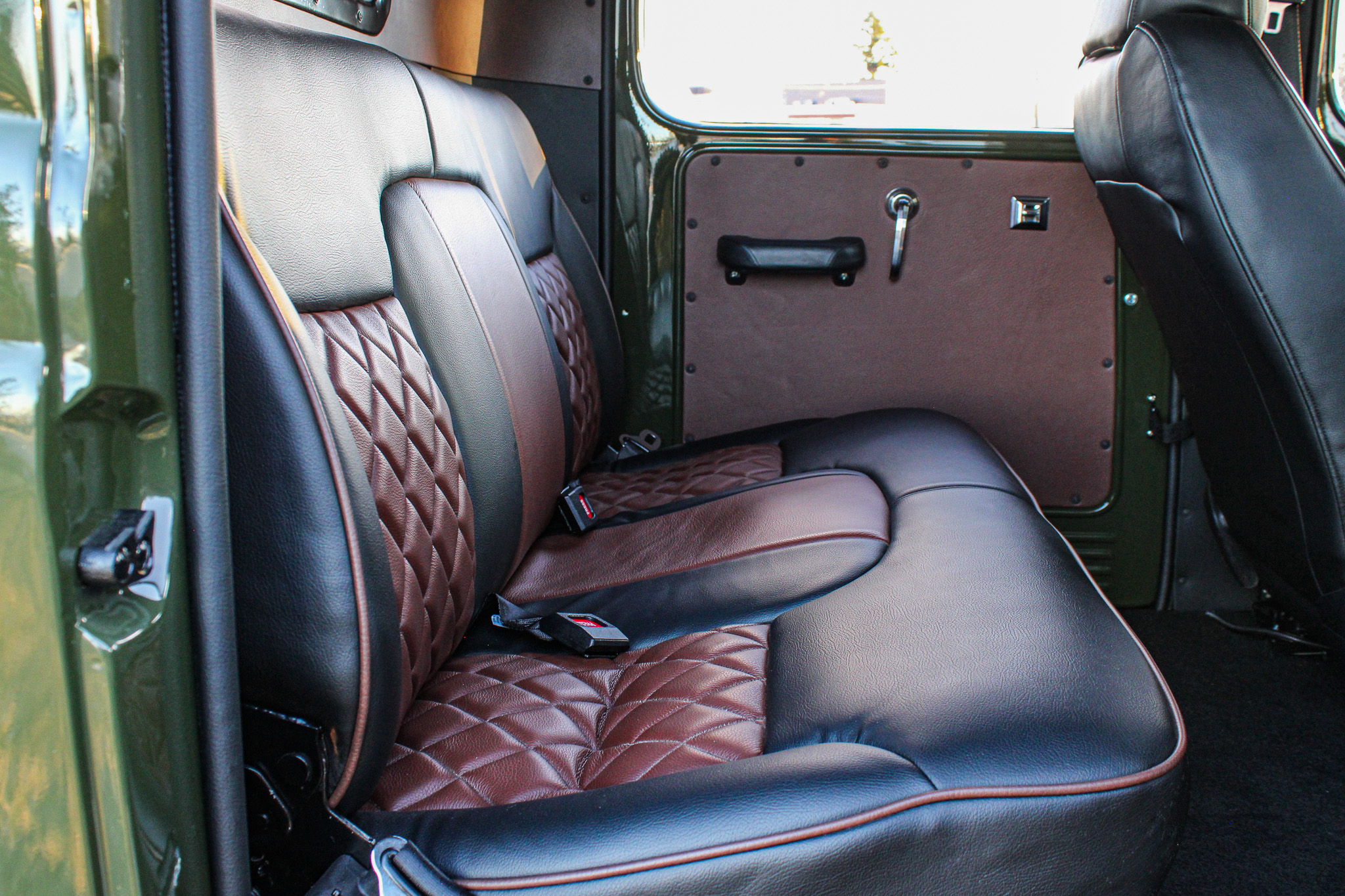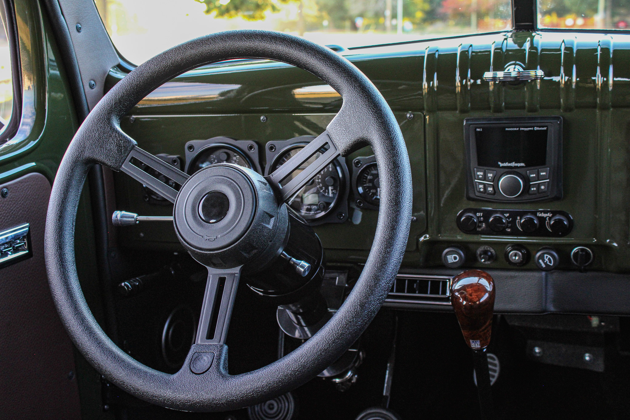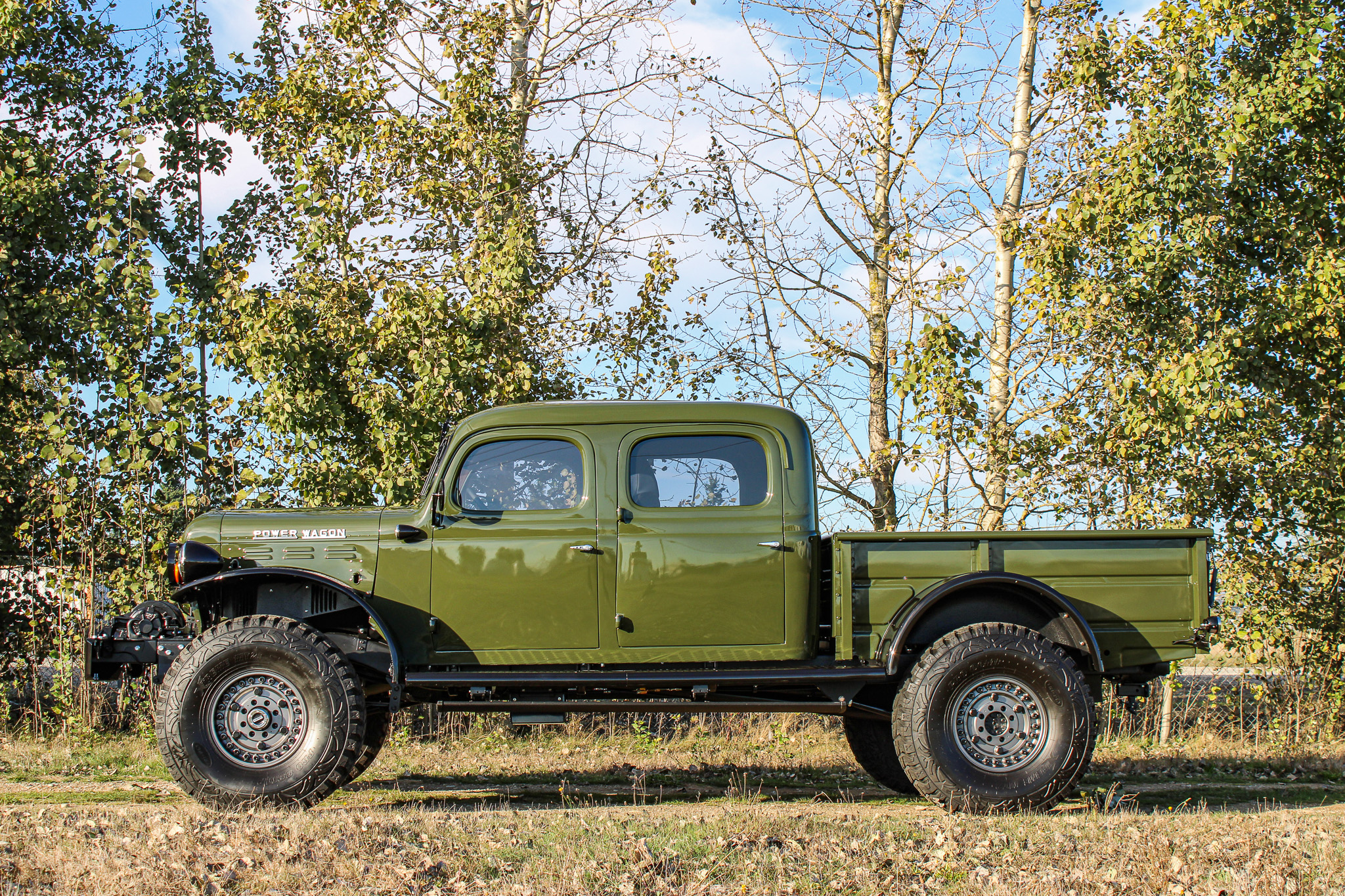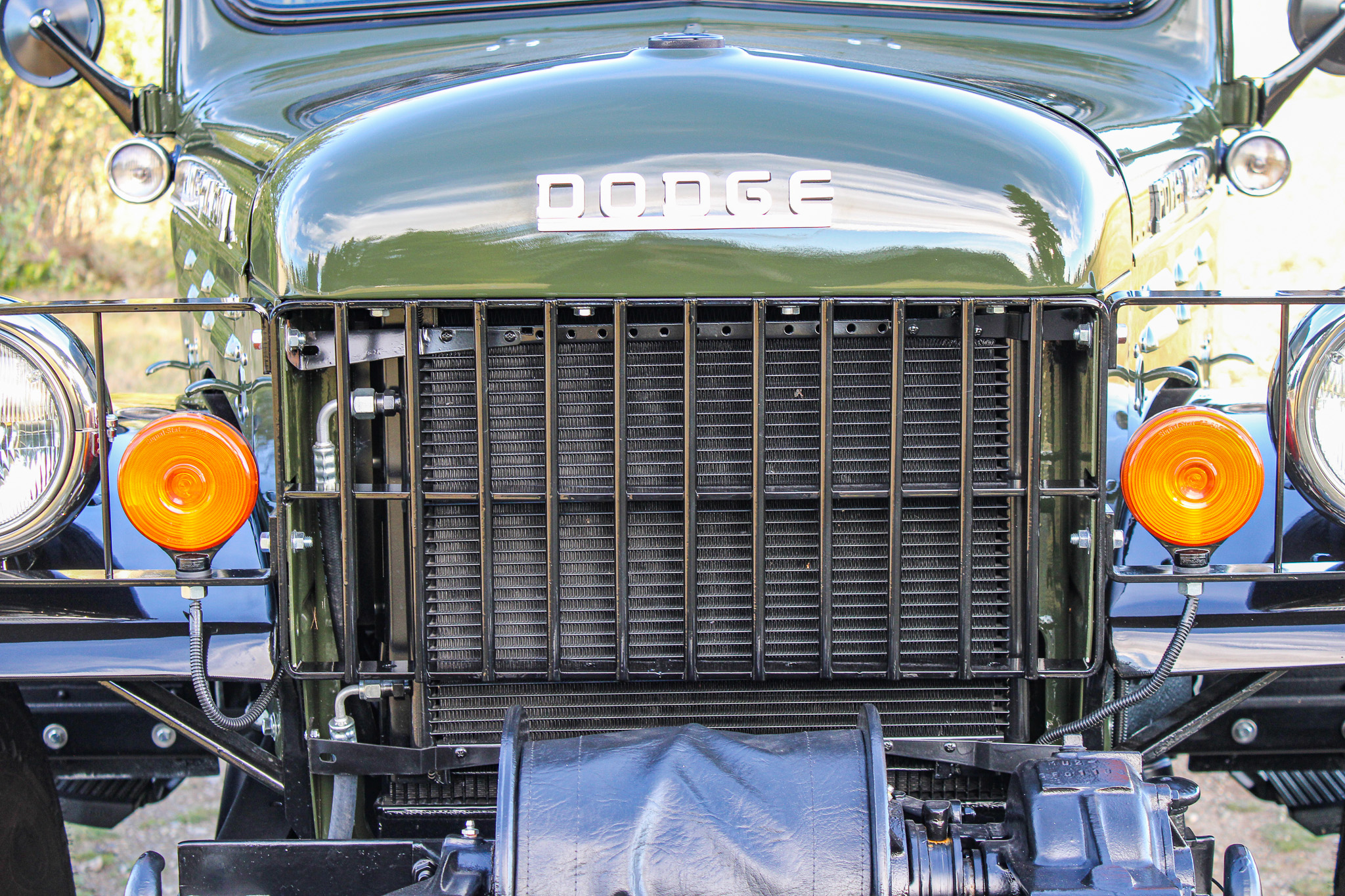 This 1946 Dodge Power Wagon WDX was refurbished in 2024 with work that involved fitting an intercooled Cummins 3.9-liter turbodiesel inline-four and an NV4500 five-speed manual transmission, lengthening the frame by about 15 inches, extending the cab and adding front-hinged rear doors, repainting the body in green and black, and fitting a custom black and brown diamond-stitched leather interior. Other features include differentials with 4.56:1 ratios as well as an NP241 dual-range transfer case, four-wheel disc brakes, front leaf springs, adjustable rear coilovers, Pro Comp 17″ wheels, 40″ tires, power steering, power brakes, an aluminum radiator, a 26-gallon fuel tank, a winch, Amp Research power-operated running boards, a receiver hitch, a backup camera, front bucket seats, Vintage Air climate control, Rockford Fosgate audio equipment, and Speedhut gauges.