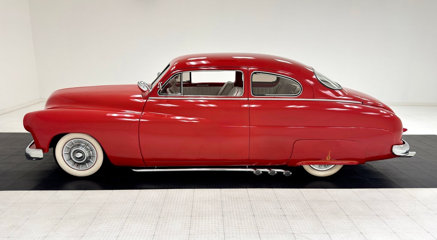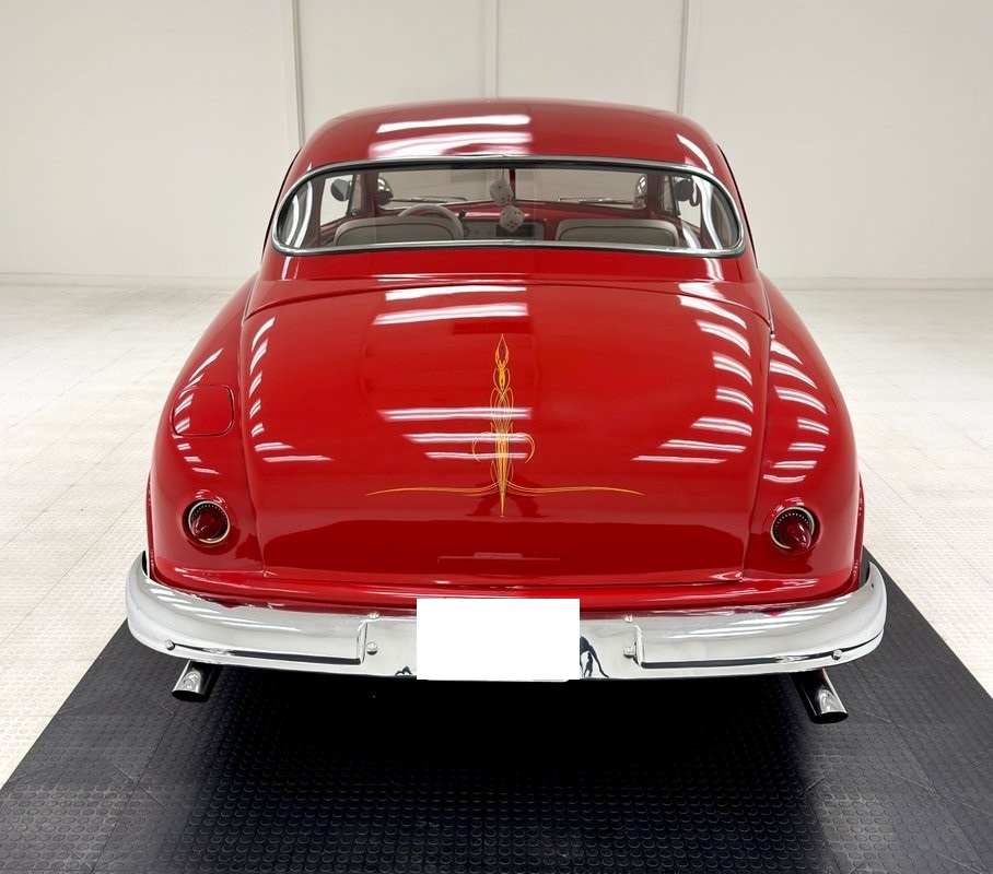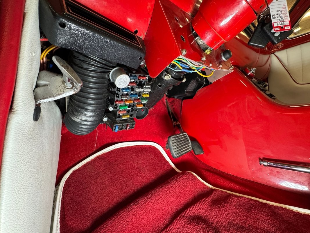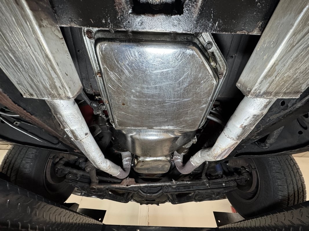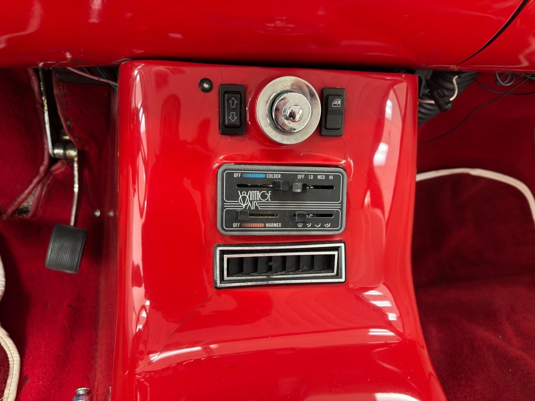 Red valve covers top this showy engine, a 350ci V8 with a 4-barrel carburetor over an Edelbrock intake and headers. It's mated to a TH350 3-speed automatic transmission which routes power to the Dana 44 axle in back. The bay is dressed in glossy red panels and inner fender wells and is ready for all 'hood up' shows! A custom center console cuts through the middle, splitting the rear seats with lipstick red paint and red seatbelts. Up front, this console houses the Vintage Air controller and vent, a stylish tachometer, and a Kenwood controller. We note two hairline cracks near the vent. A white steering wheel on a tilt column fronts glossy red dash with a billet faced instrument cluster and those gauges are gray faced units with red highlights and a Kenwood AM/FM/CD player is centrally located.