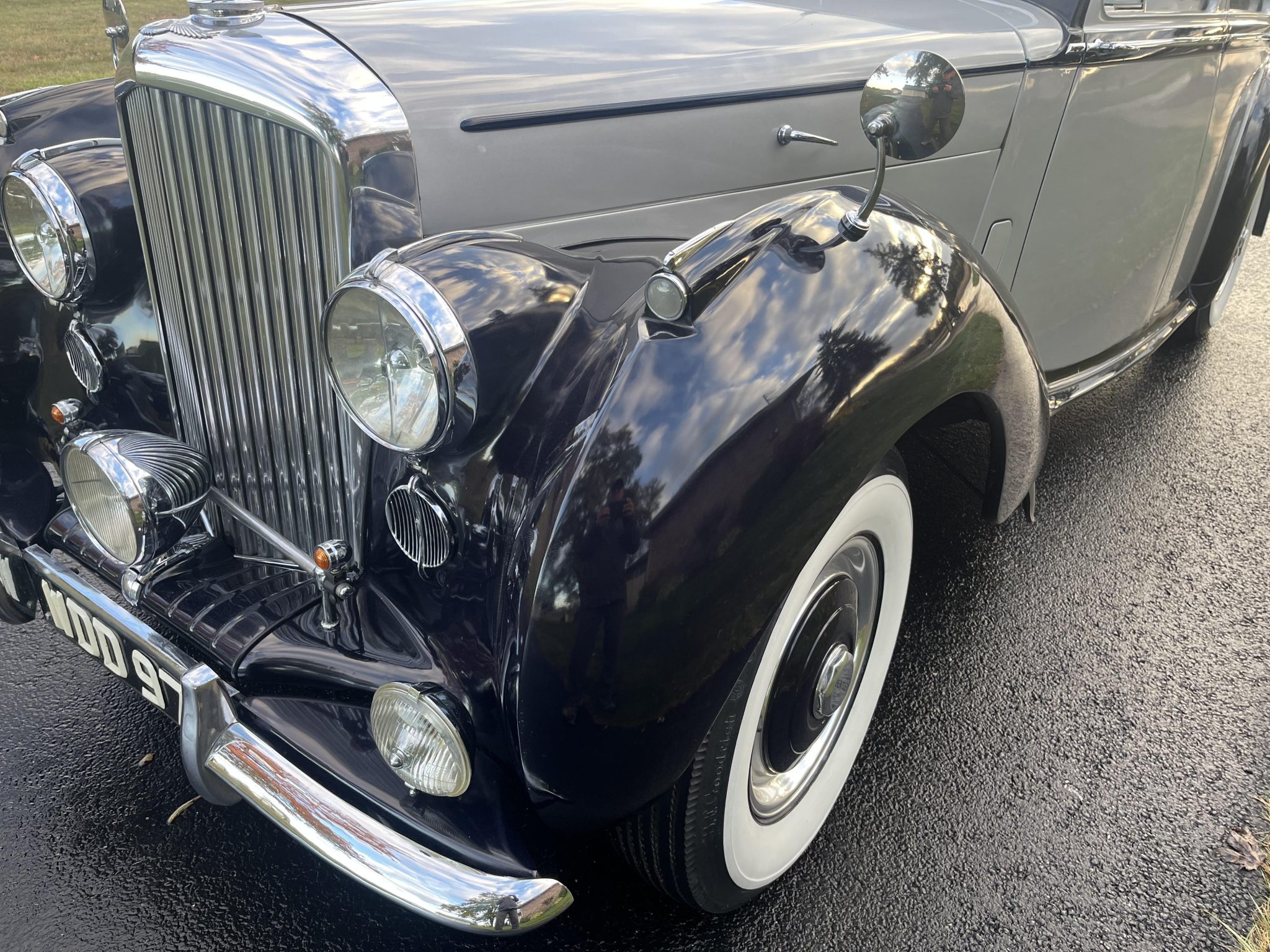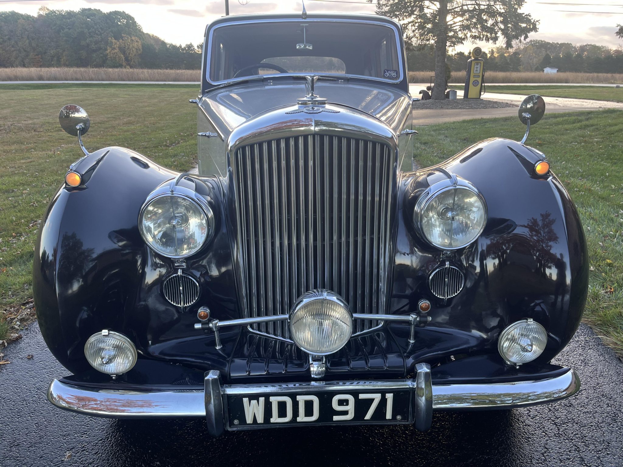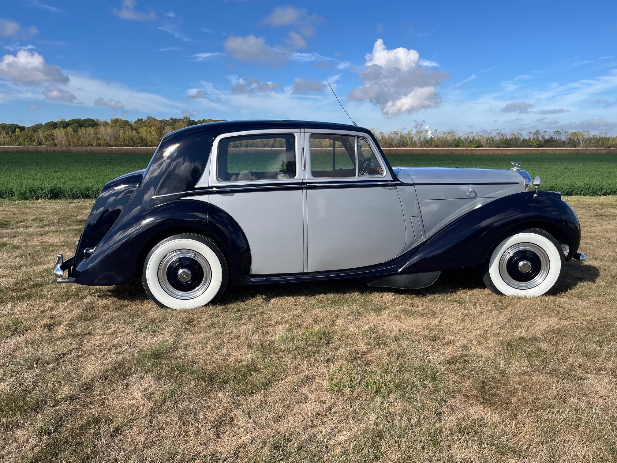 This 1952 Bentley Mark VI is a late-production, right-hand-drive saloon that was imported to the US in the 1970s and underwent a refurbishment in 2006 The car wears Midnight Blue and silver paint over gray and blue upholstery, and power comes from a 4.5-liter inline-six paired with a four-speed manual transmission. Equipment includes dual SU carburetors, servo-assisted drum brakes, a driving lamp, Lucas fog lights, fender-mounted mirrors, rear-hinged front doors, turn signals, trafficators, a sliding sunroof, a right-hand shifter, a CD stereo, and rear picnic trays.
