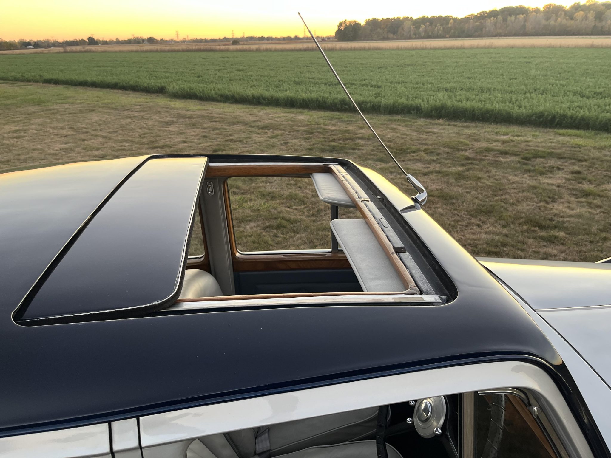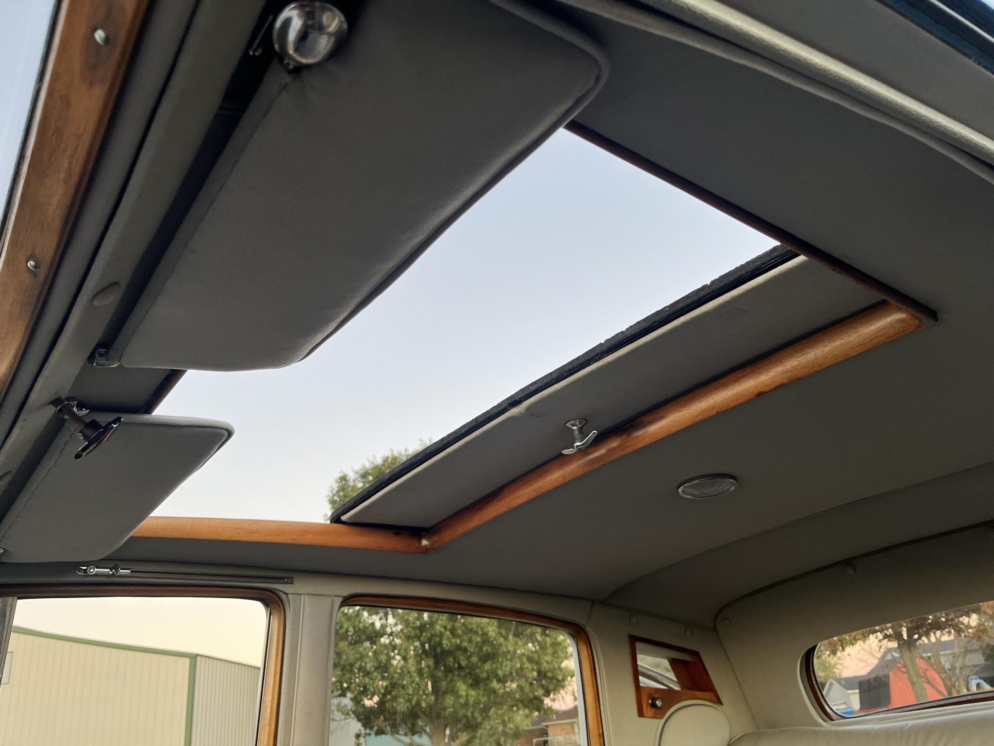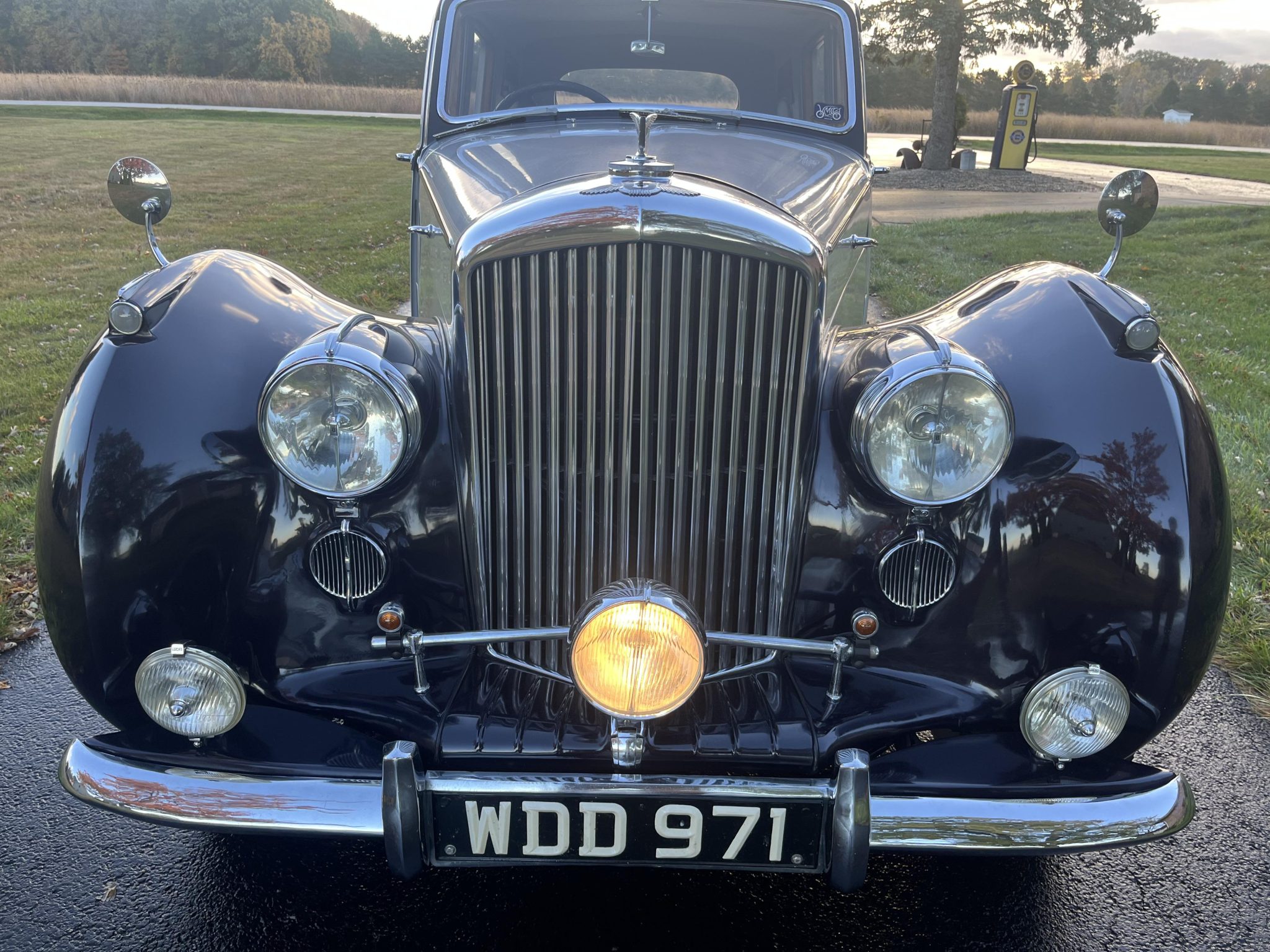 This 1952 Bentley Mark VI is a late-production, right-hand-drive saloon that was imported to the US in the 1970s and underwent a refurbishment in 2006 The car wears Midnight Blue and silver paint over gray and blue upholstery, and power comes from a 4.5-liter inline-six paired with a four-speed manual transmission. Equipment includes dual SU carburetors, servo-assisted drum brakes, a driving lamp, Lucas fog lights, fender-mounted mirrors, rear-hinged front doors, turn signals, trafficators, a sliding sunroof, a right-hand shifter, a CD stereo, and rear picnic trays.