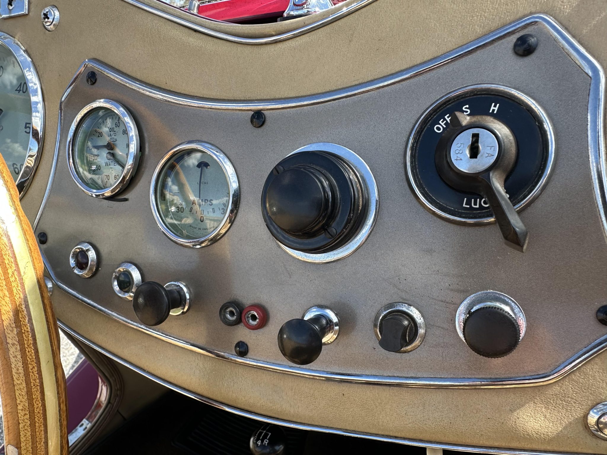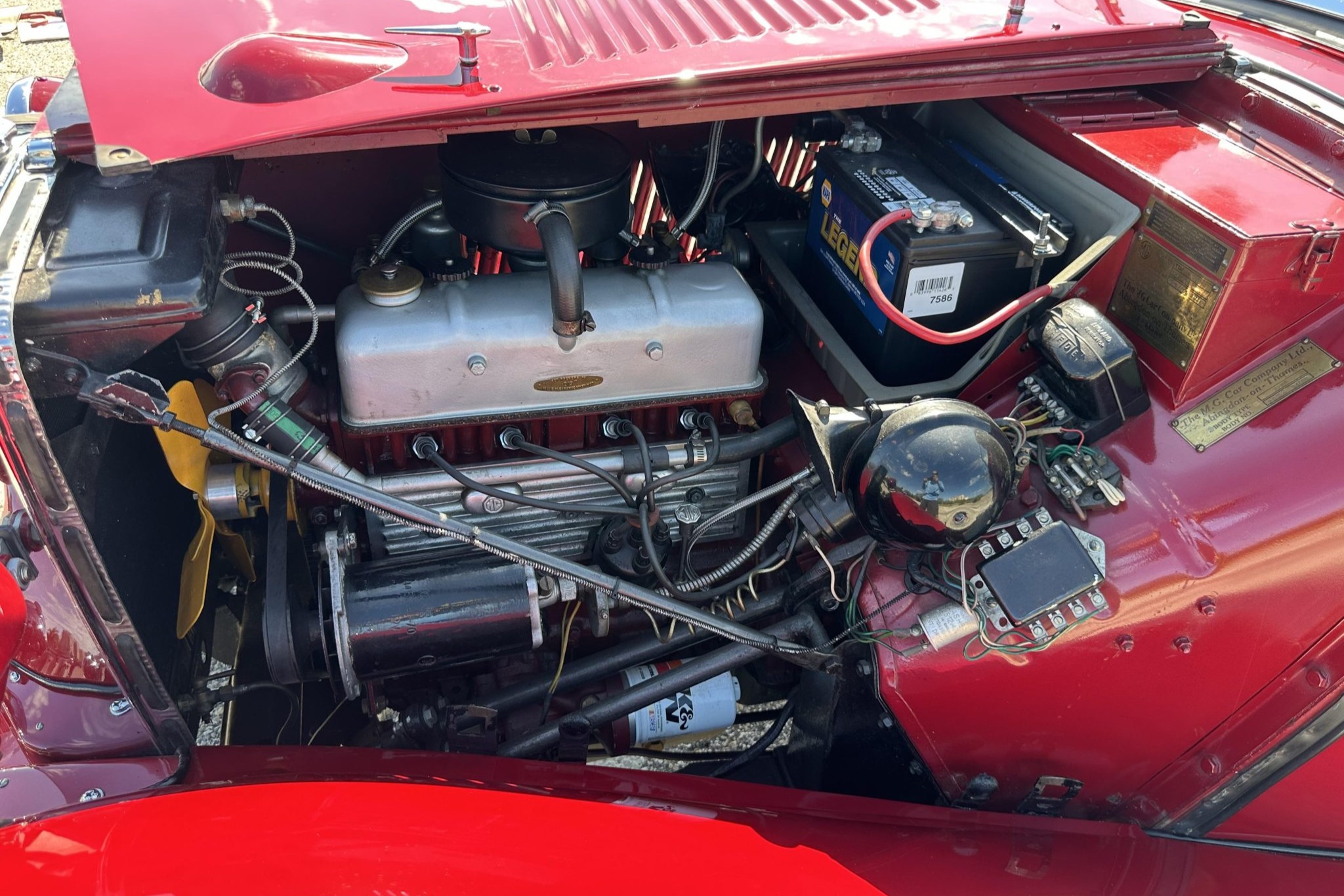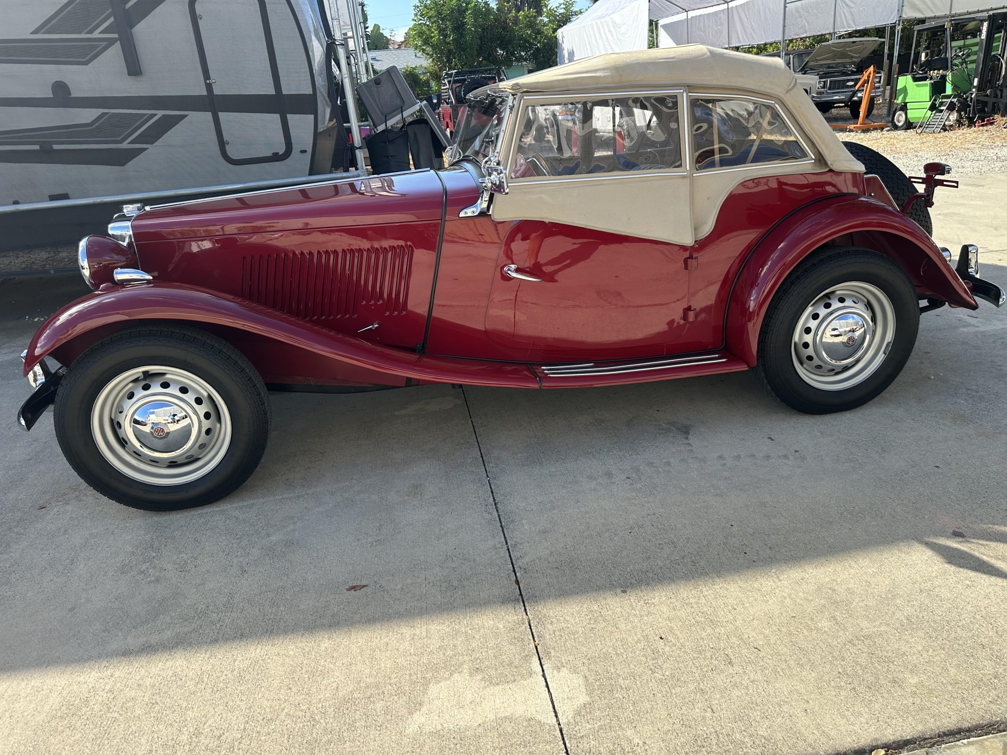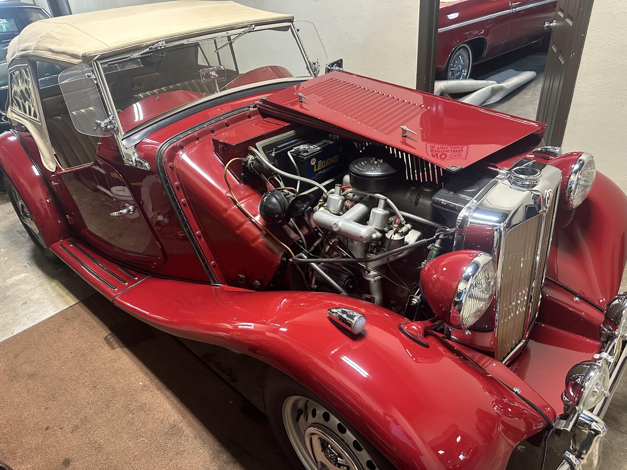 This 1952 MG TD is said to have undergone a repaint, an interior re-trim, and an engine overhaul as part of a refurbishment completed approximately 10 years ago   The car is finished in red with a tan folding soft top over beige leather upholstery and features PL-700 headlights, Lucas driving lights, and an Auster folding windscreen. Inside, a wood-rimmed Moto-Lita steering wheel is accompanied by a heater and Jaeger instrumentation. Power is supplied by a 1,250cc XPAG inline-four that breathes through dual SU carburetors, while shifting is via a four-speed manual transmission.