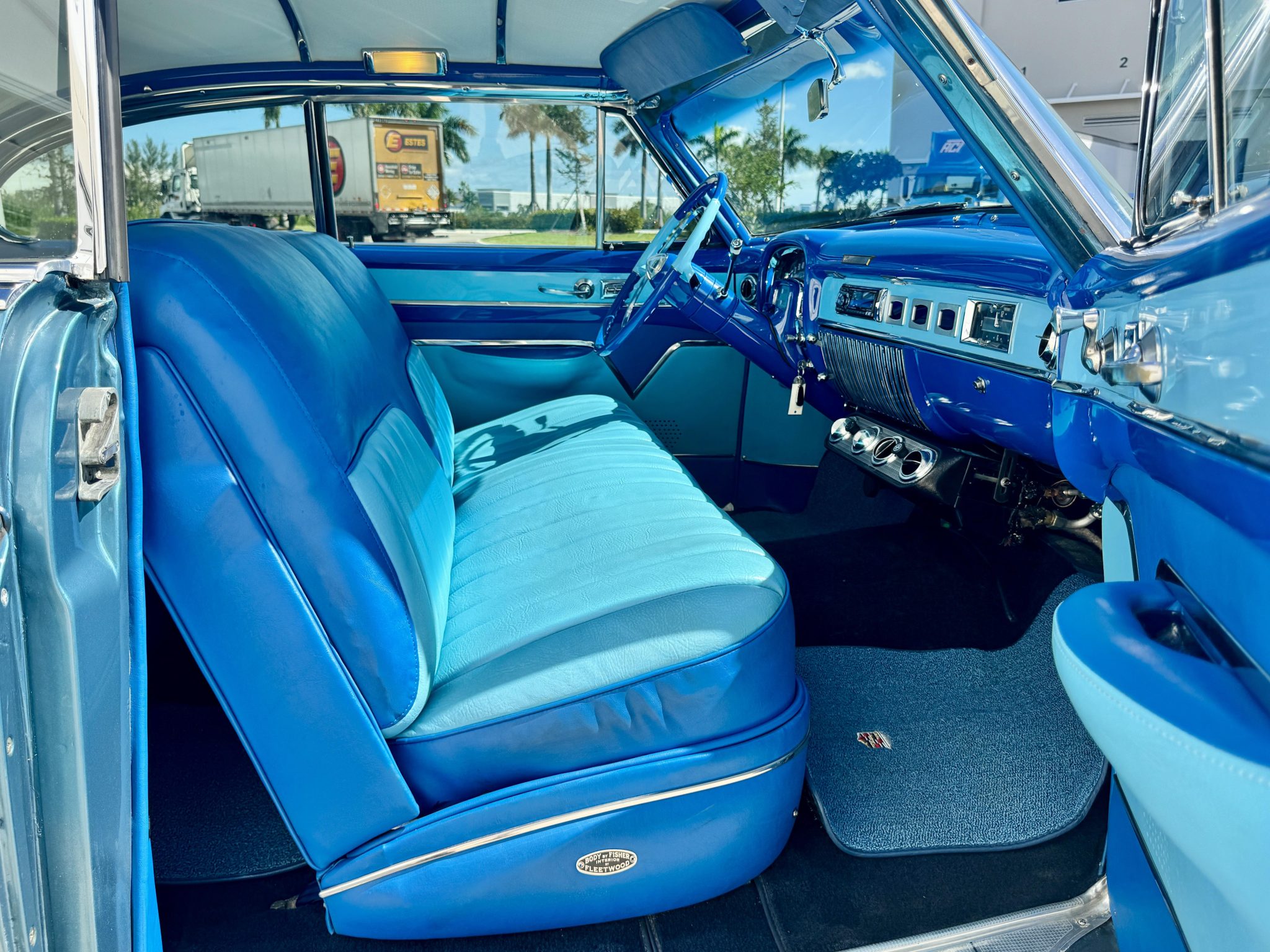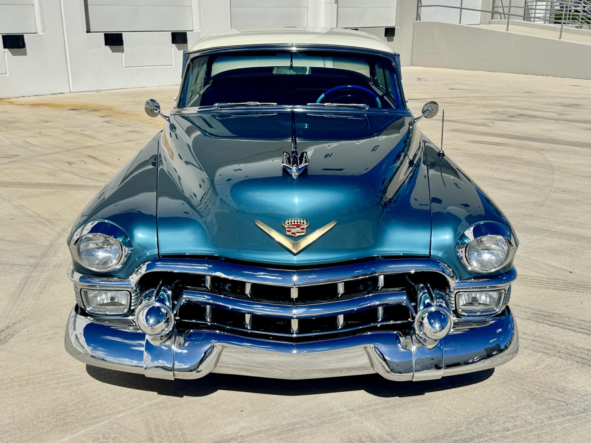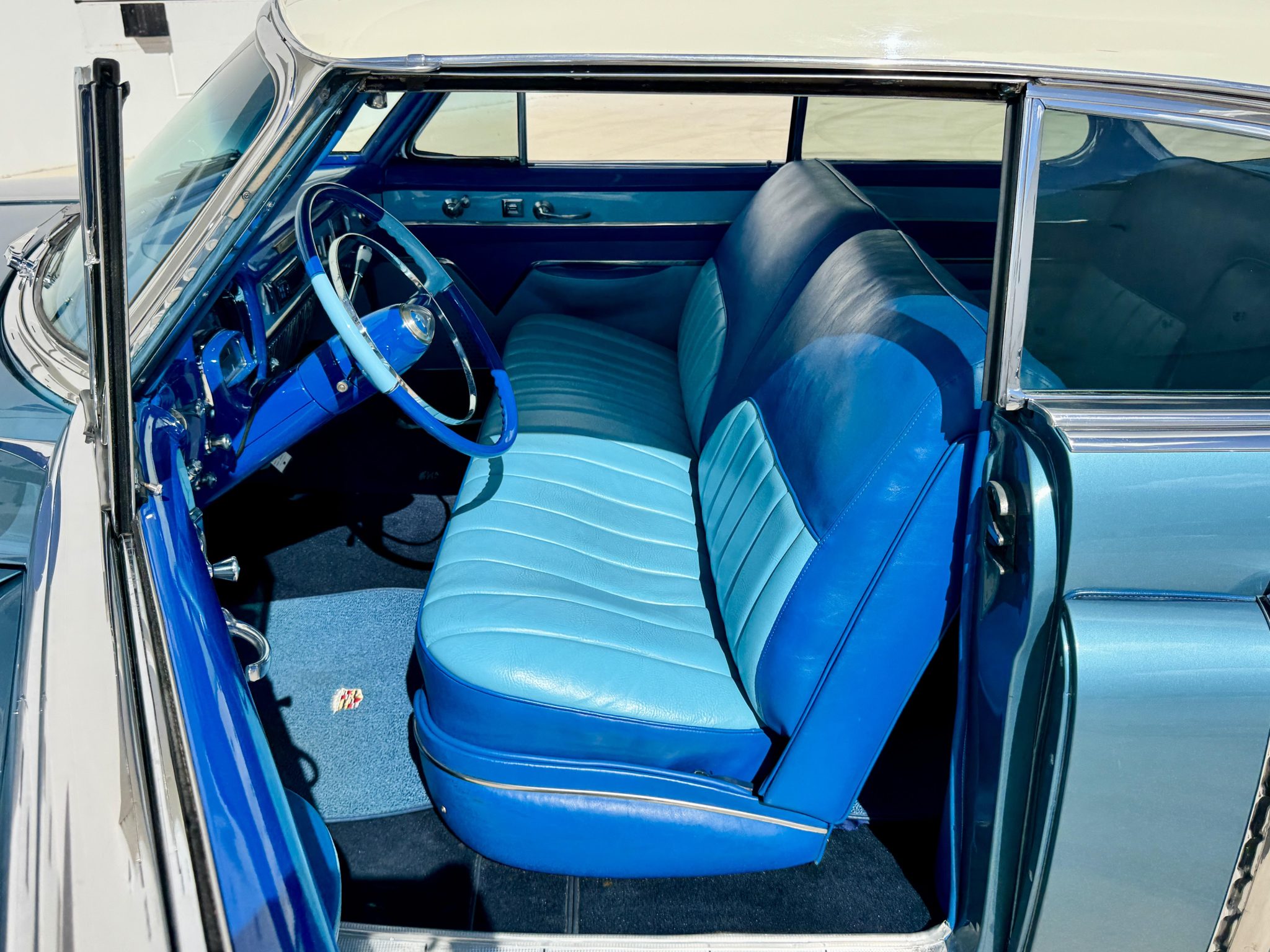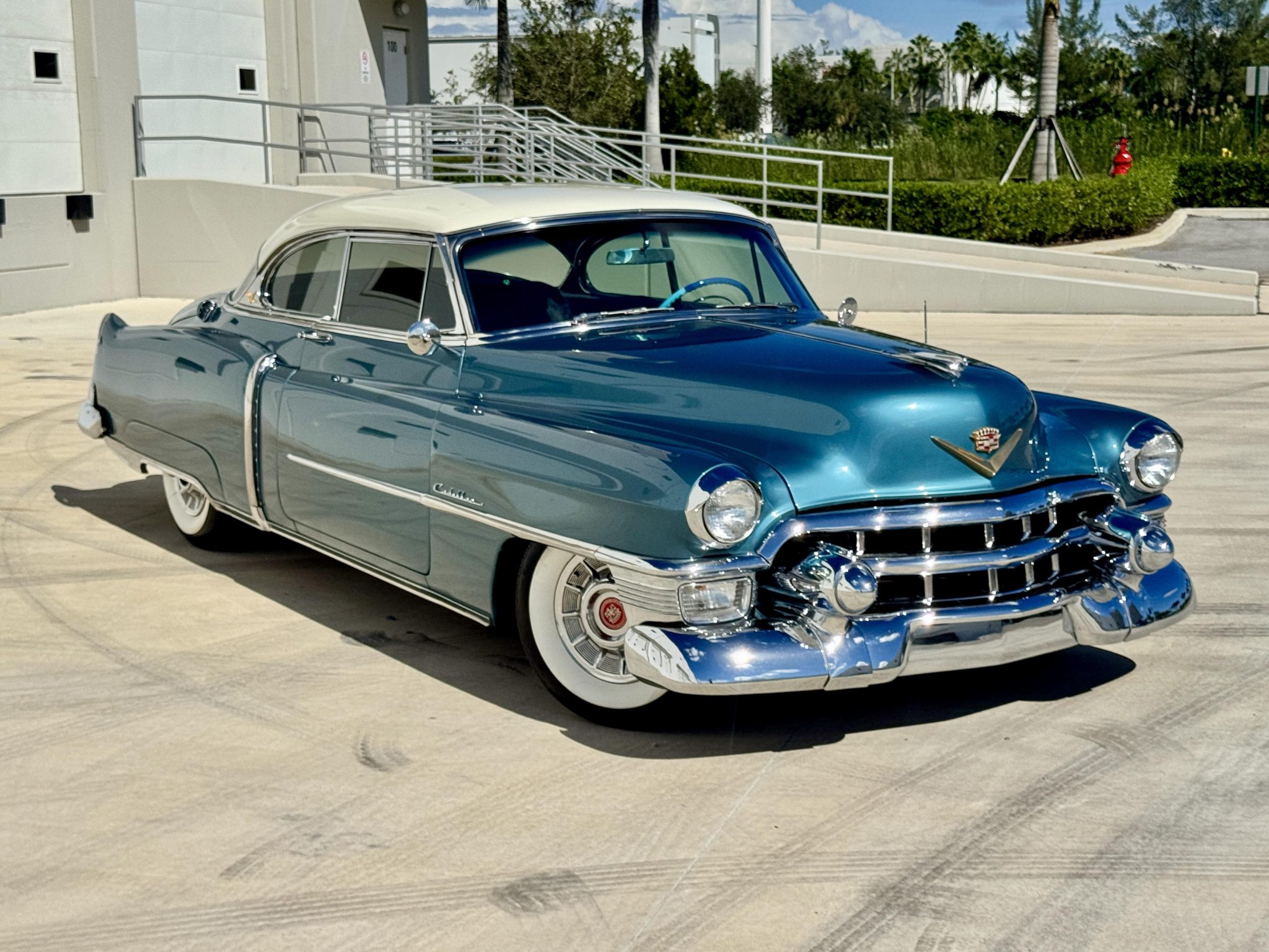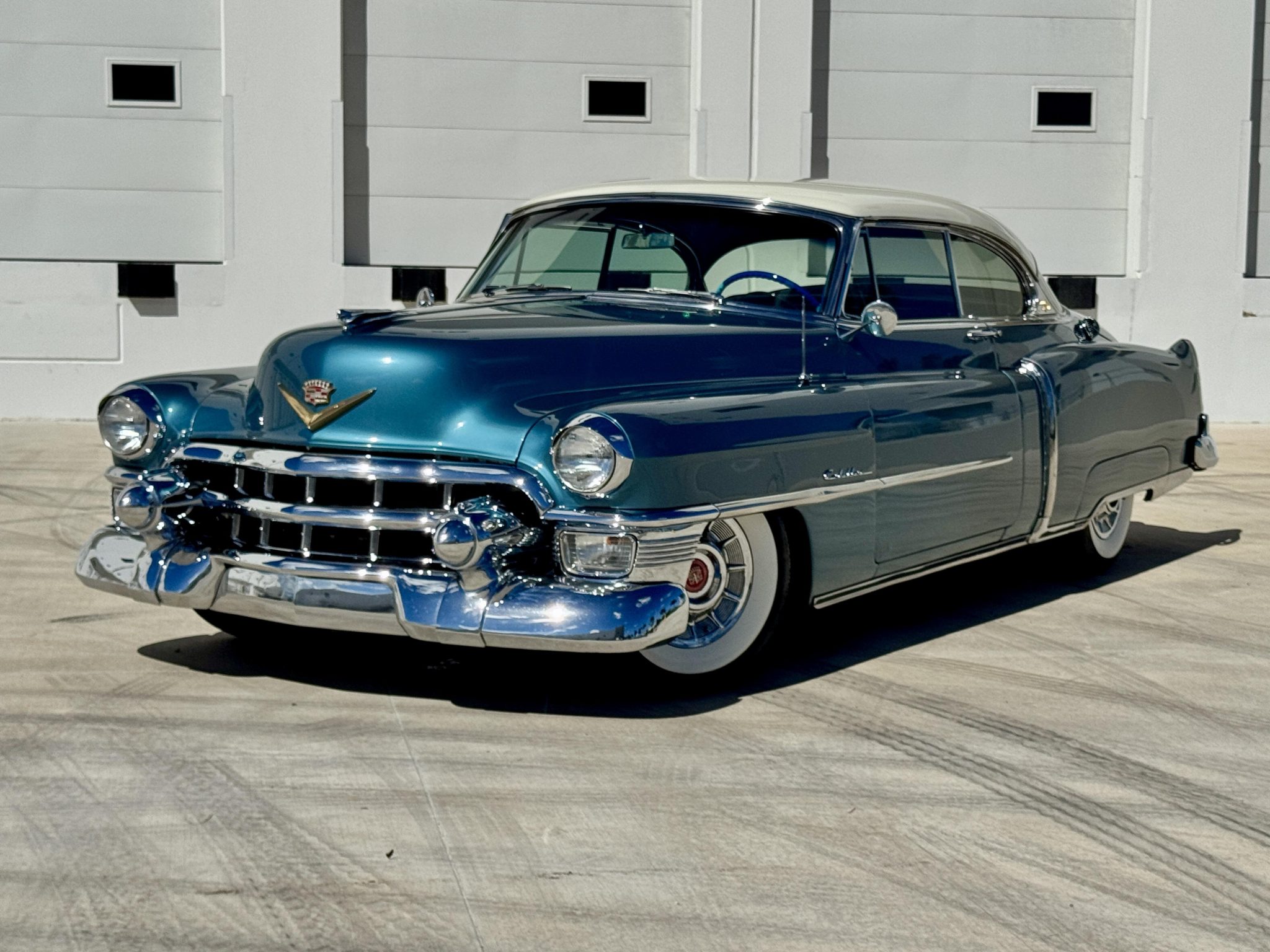 This 1953 Cadillac Series 62 Coupe de Ville was refurbished around 2006 with work that involved installing a Cadillac 500ci V8 and a Turbo-Hydramatic 400 three-speed automatic transmission as well as repainting the car in Tunis Blue with a gray roof over two-tone blue upholstery. Other features include an Edelbrock intake manifold, an Edelbrock carburetor, an aluminum radiator, wheel covers, whitewall tires, independent front suspension, four-wheel disc brakes, power steering, rear fender skirts, air conditioning, an Alpine stereo, and power windows.