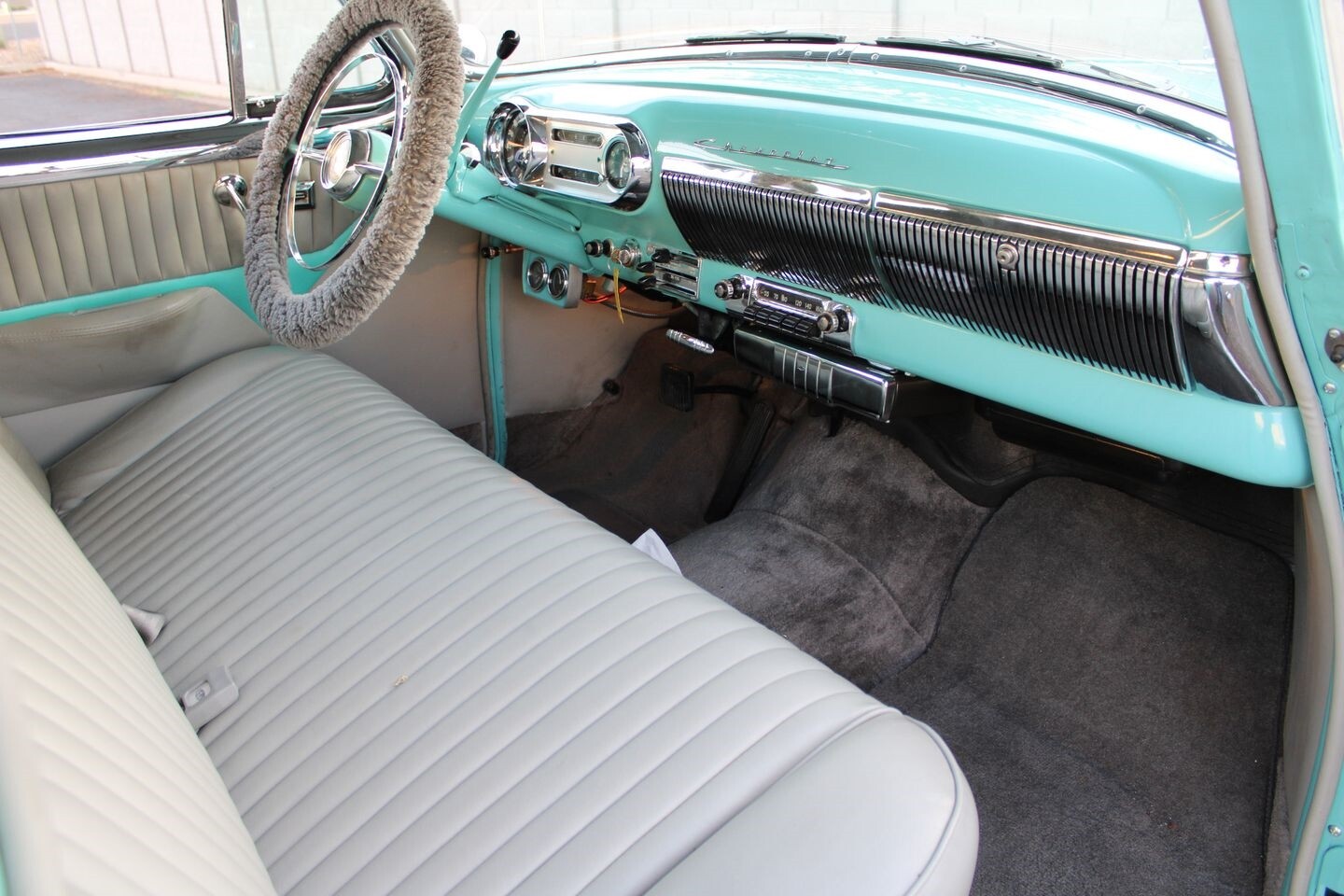 Slide into the cabin, and you're greeted by an interior that combines classic elegance with modern comfort. The gray leatherette upholstery offers a sophisticated contrast to the vibrant exterior, providing a plush, comfortable ride that feels both luxurious and inviting. The interior is meticulously maintained, reflecting the care and attention this vehicle has received over the decades. Whether you're cruising down the highway or parked at a local car show, the interior of this Bel Air offers a cozy and stylish retreat.