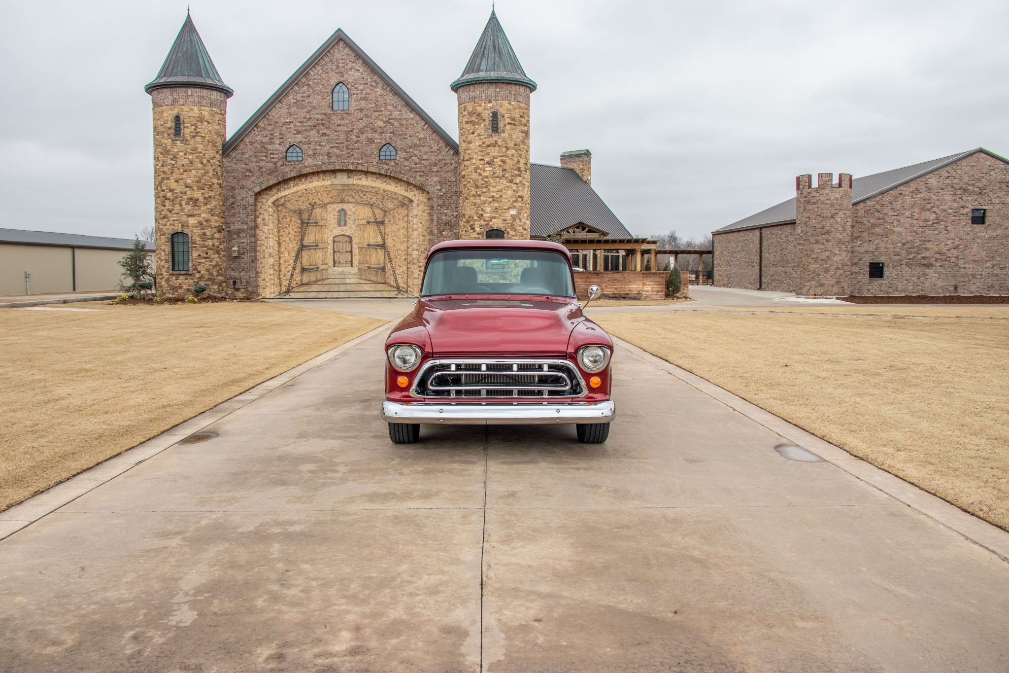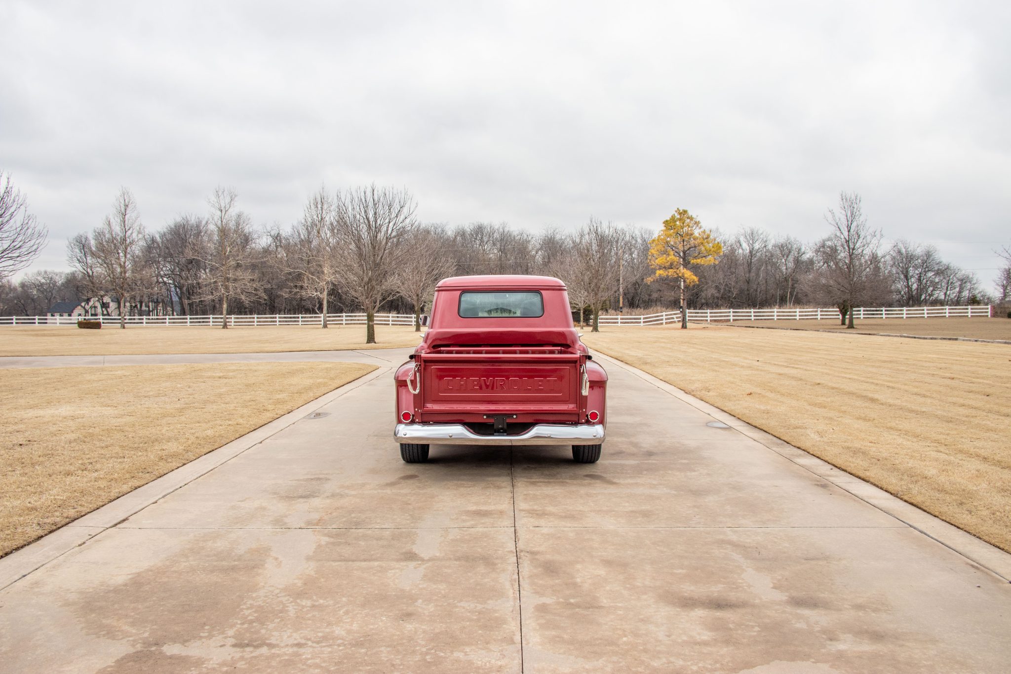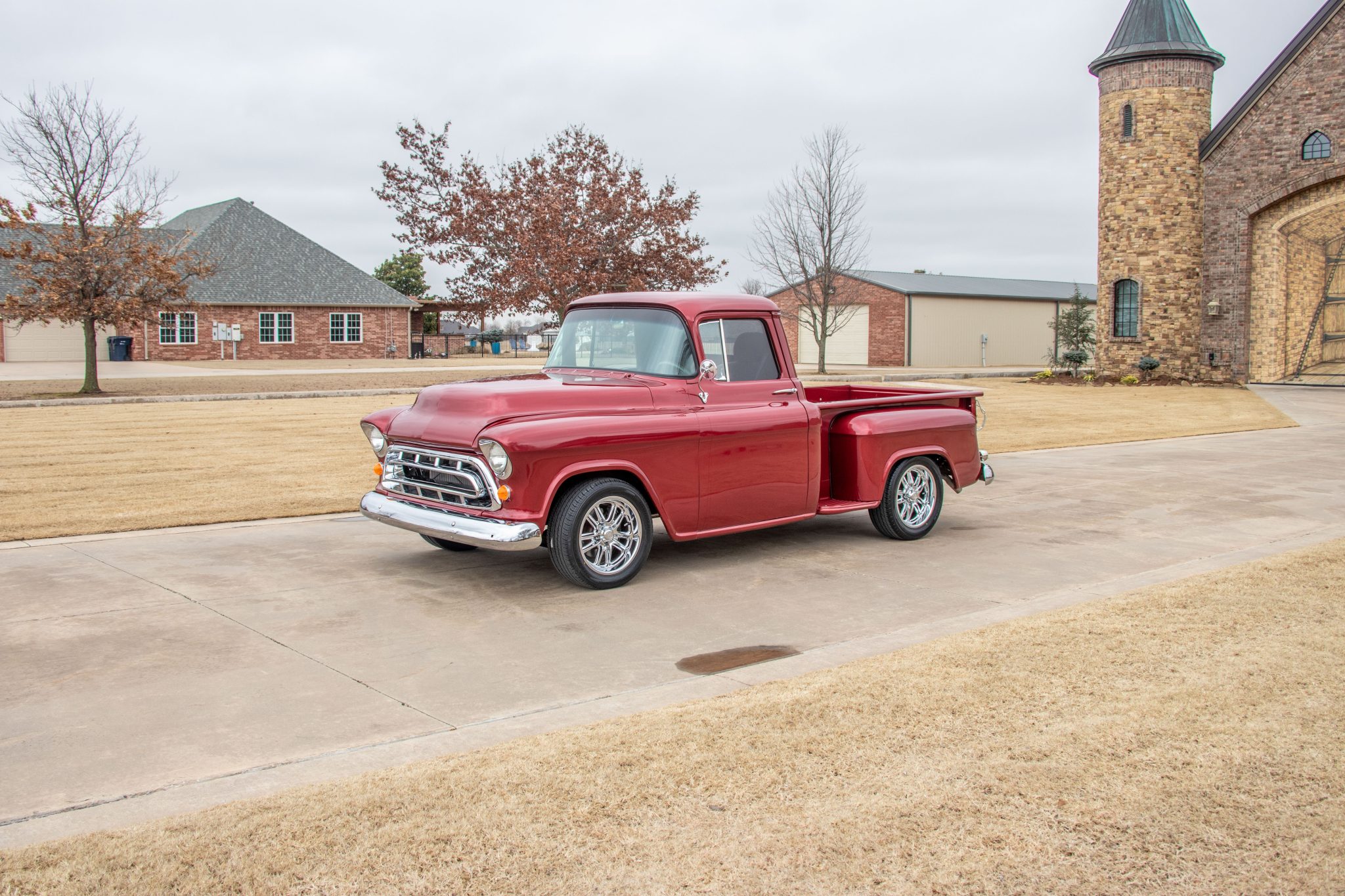 This 1955 Chevrolet 3100 stepside pickup was repainted in red and the pickup bed was refurbished with wood slats and polished runners during a refurbishment commissioned under prior ownership. It is powered by a 350ci V8 linked with a four-speed automatic transmission, and the truck rides on chrome 17″ US Mags wheels that were mounted in preparation for the sale. The cab features a tilt steering wheel and later-model bucket seats, and the truck is further equipped with chrome bumpers, side vent windows, front helper air springs, MagnaFlow mufflers, an aluminum radiator, and power-assisted steering and front disc brakes.