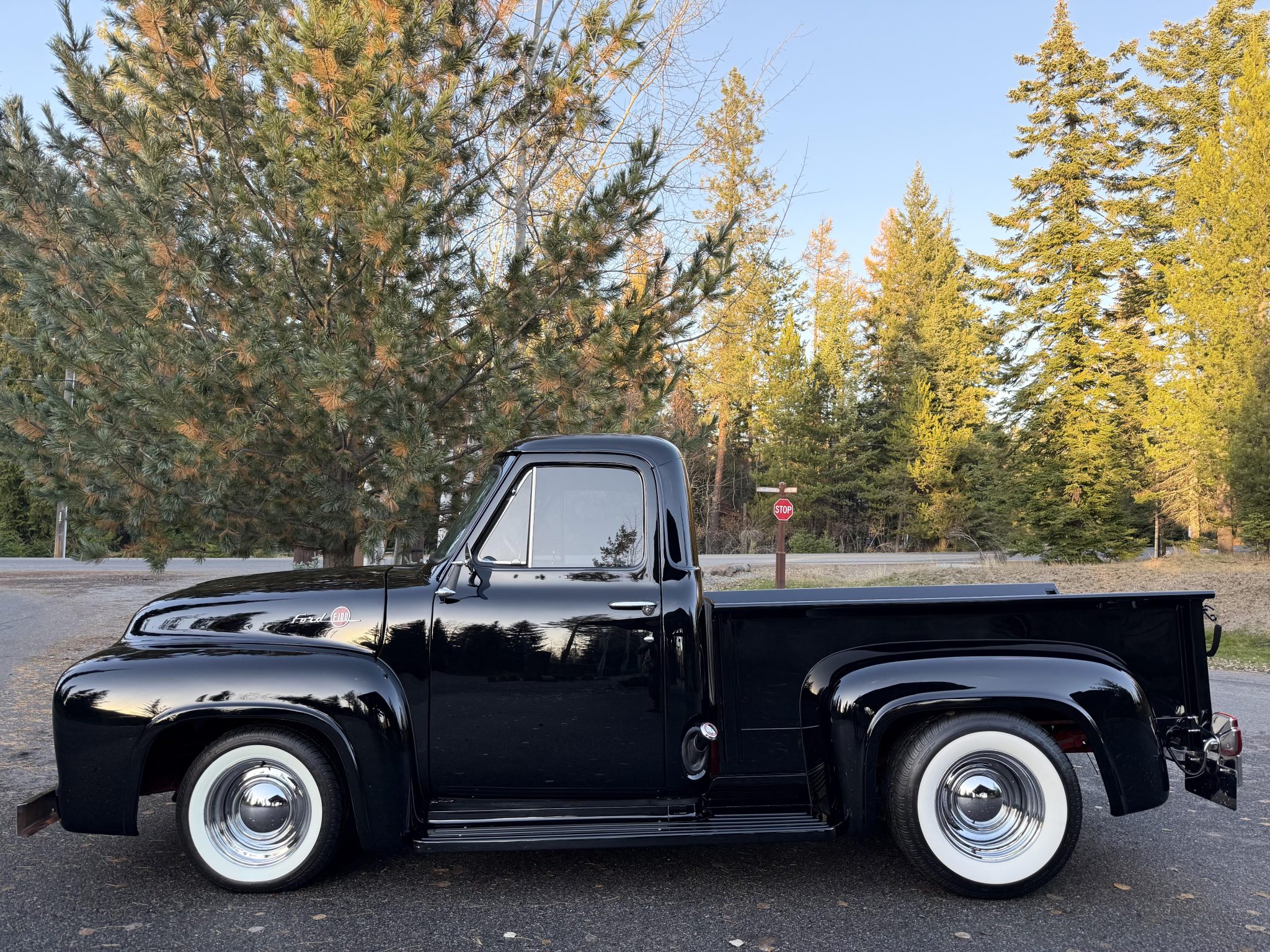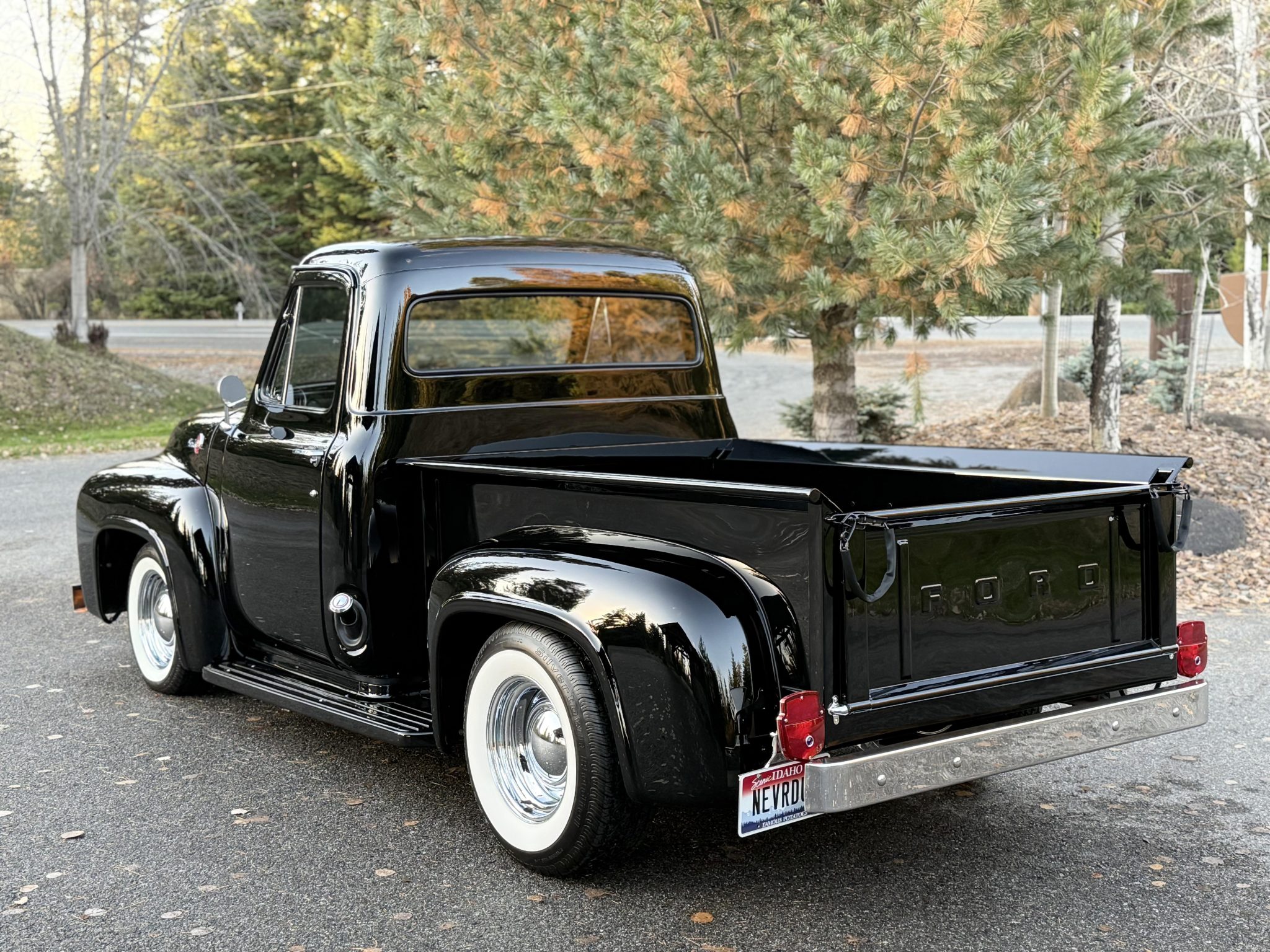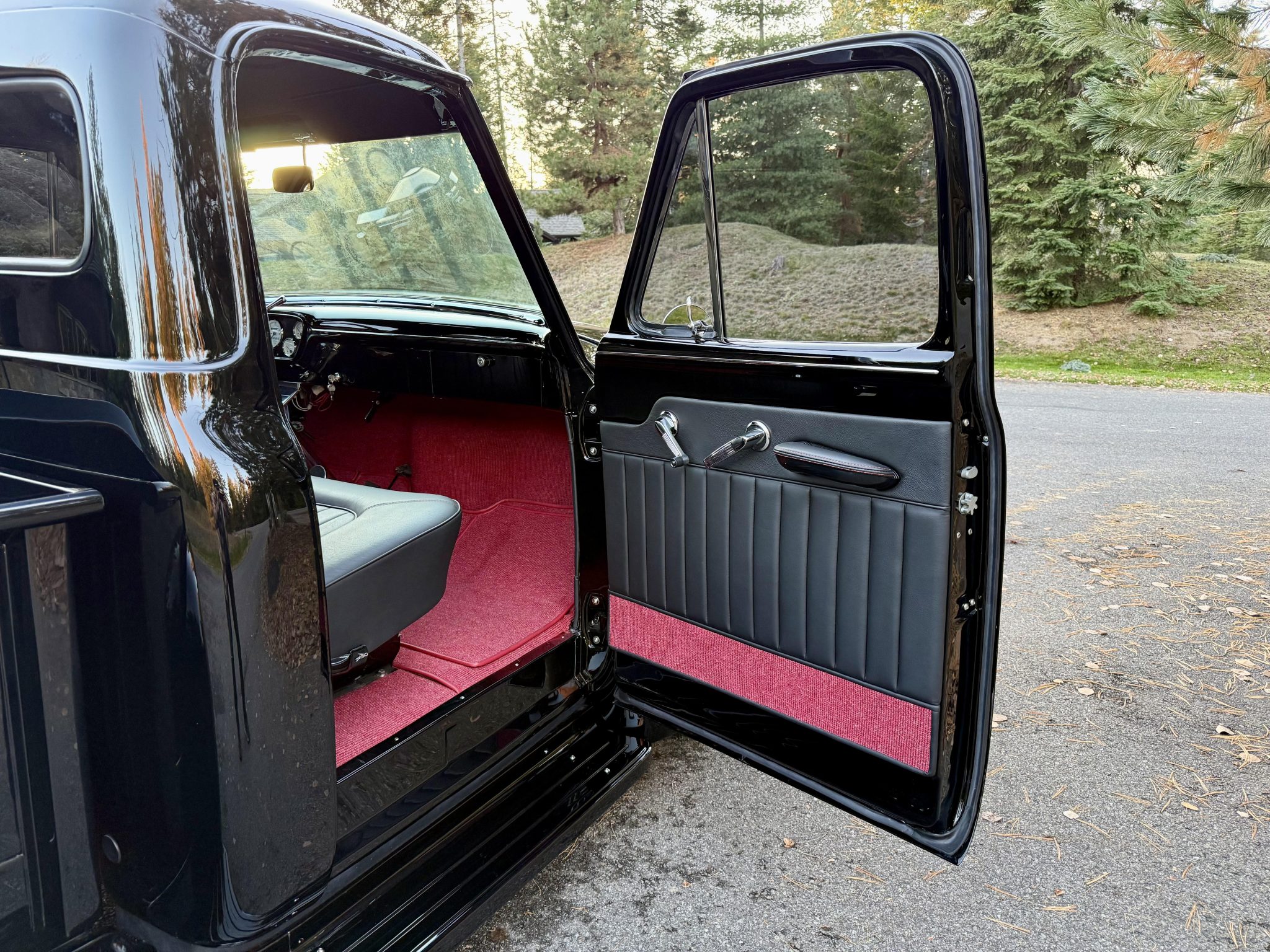 In addition to refreshing its body and interior, the body-off project involved retrofitting a 455ci Oldsmobile V8 and a TH400 three-speed automatic transmission. The truck also features power steering, replacement wiring, lowered suspension, 15″ chrome wheels, Dynomax mufflers, red carpets, black leather upholstery, and a wood steering wheel. Some additional work remains for its climate control and speedometer.