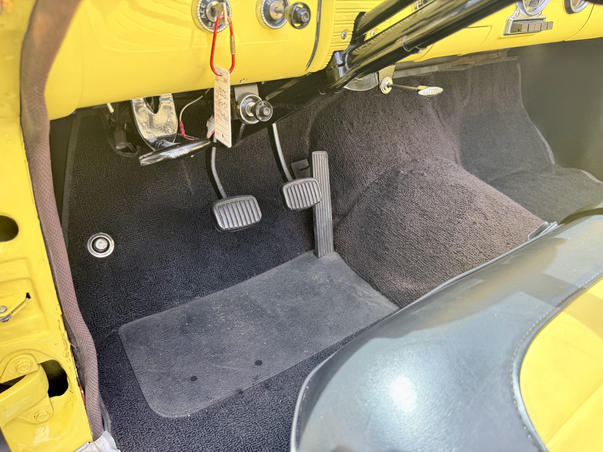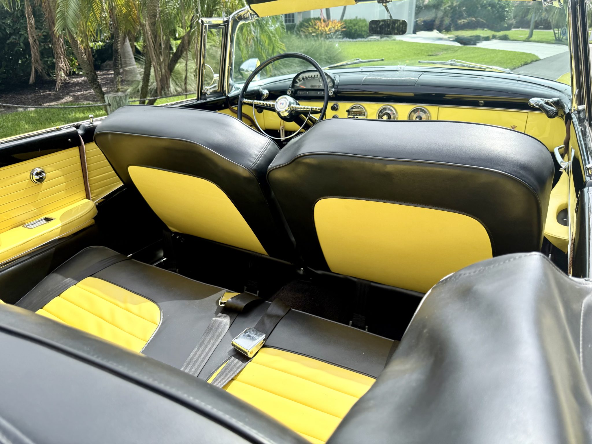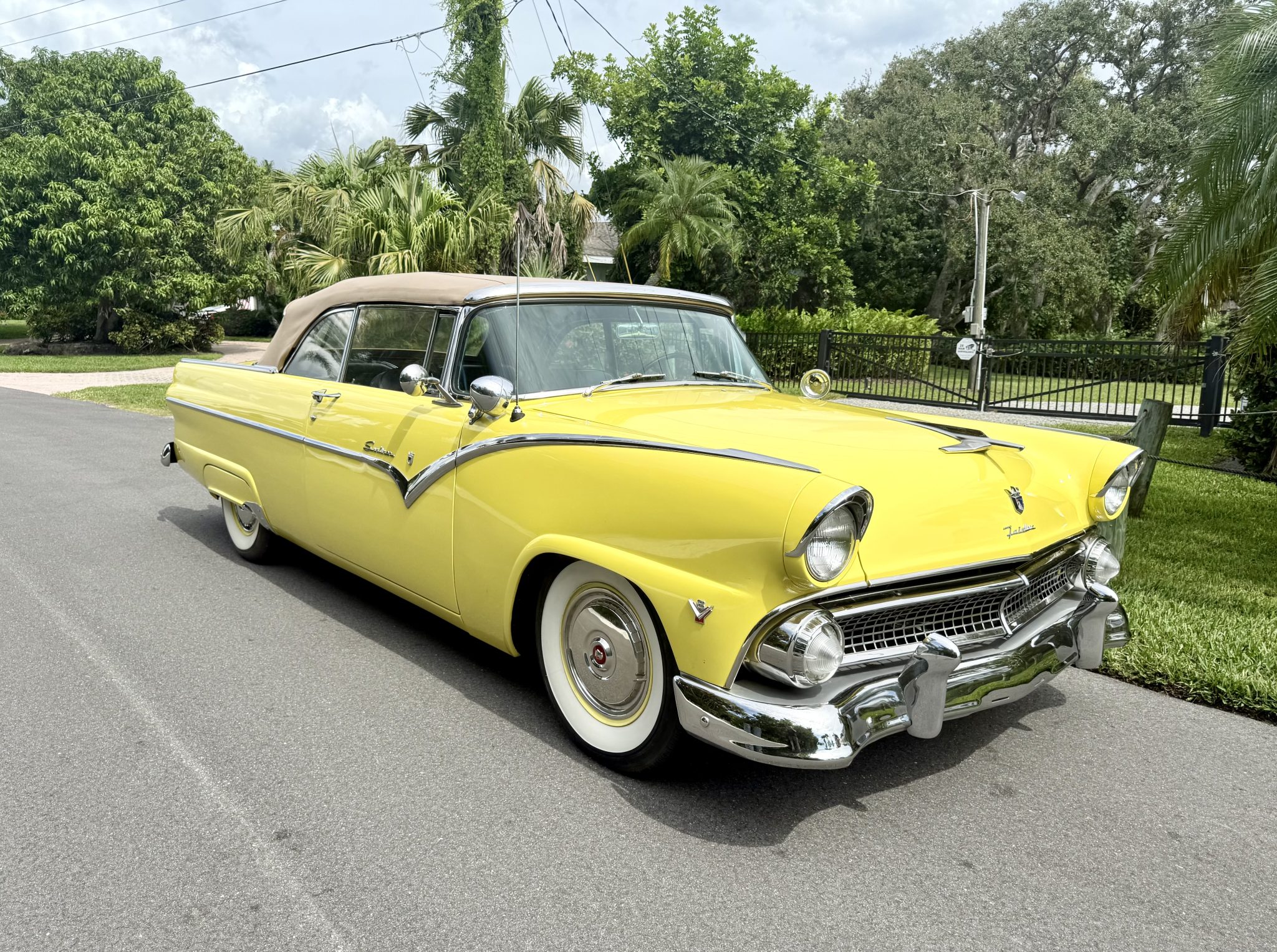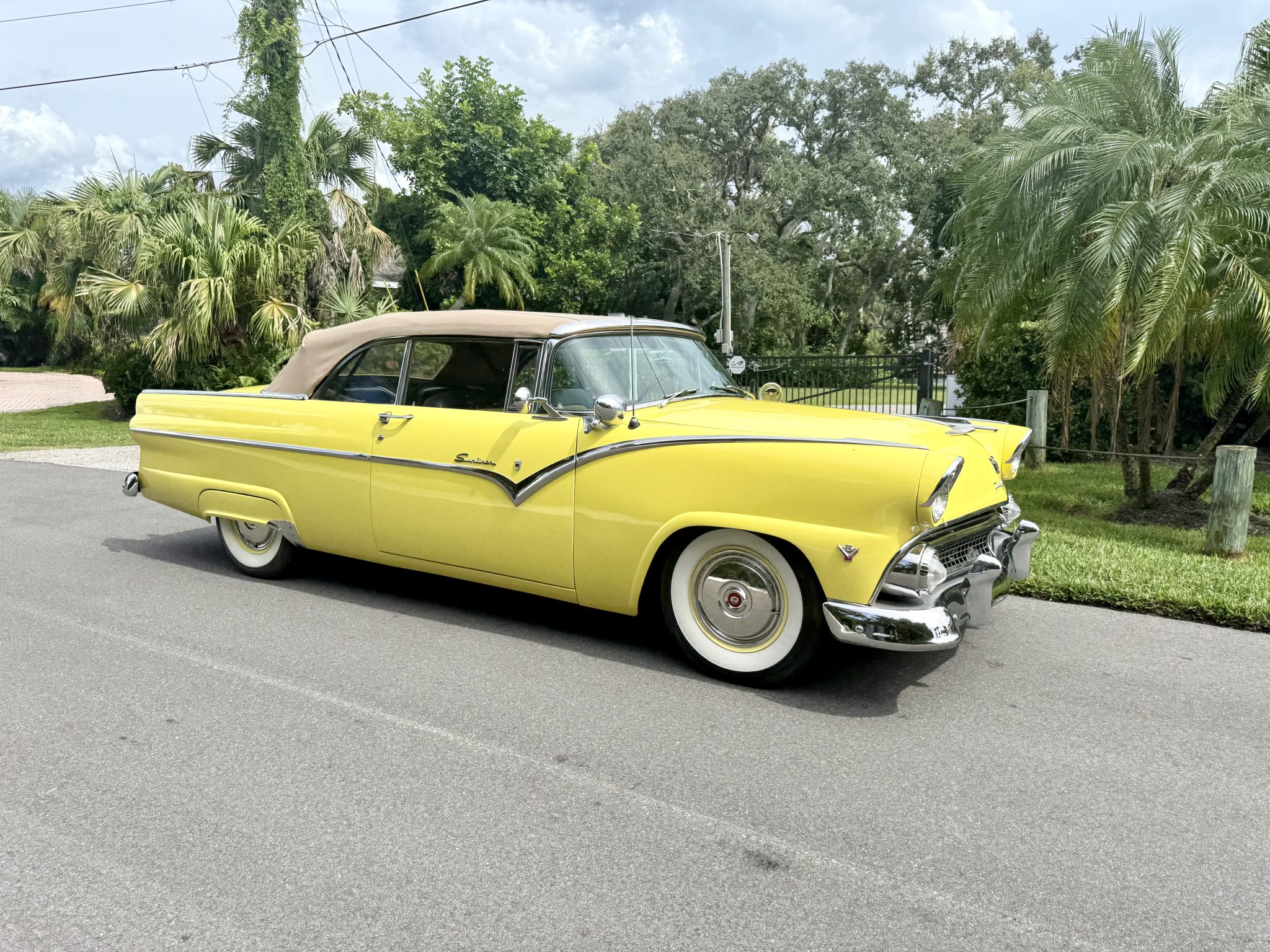 This 1955 Ford Fairlane Sunliner was refurbished circa 2013 and is finished in yellow with a tan soft top over a black and yellow interior. Power is provided by a Y-block V8 that is backed by a column-shifted three-speed manual transmission. Equipment includes 15″ painted steel wheels, power steering, front disc brakes, chrome bumpers, and spotlights along with power windows, an AM radio, and a cabin heater.