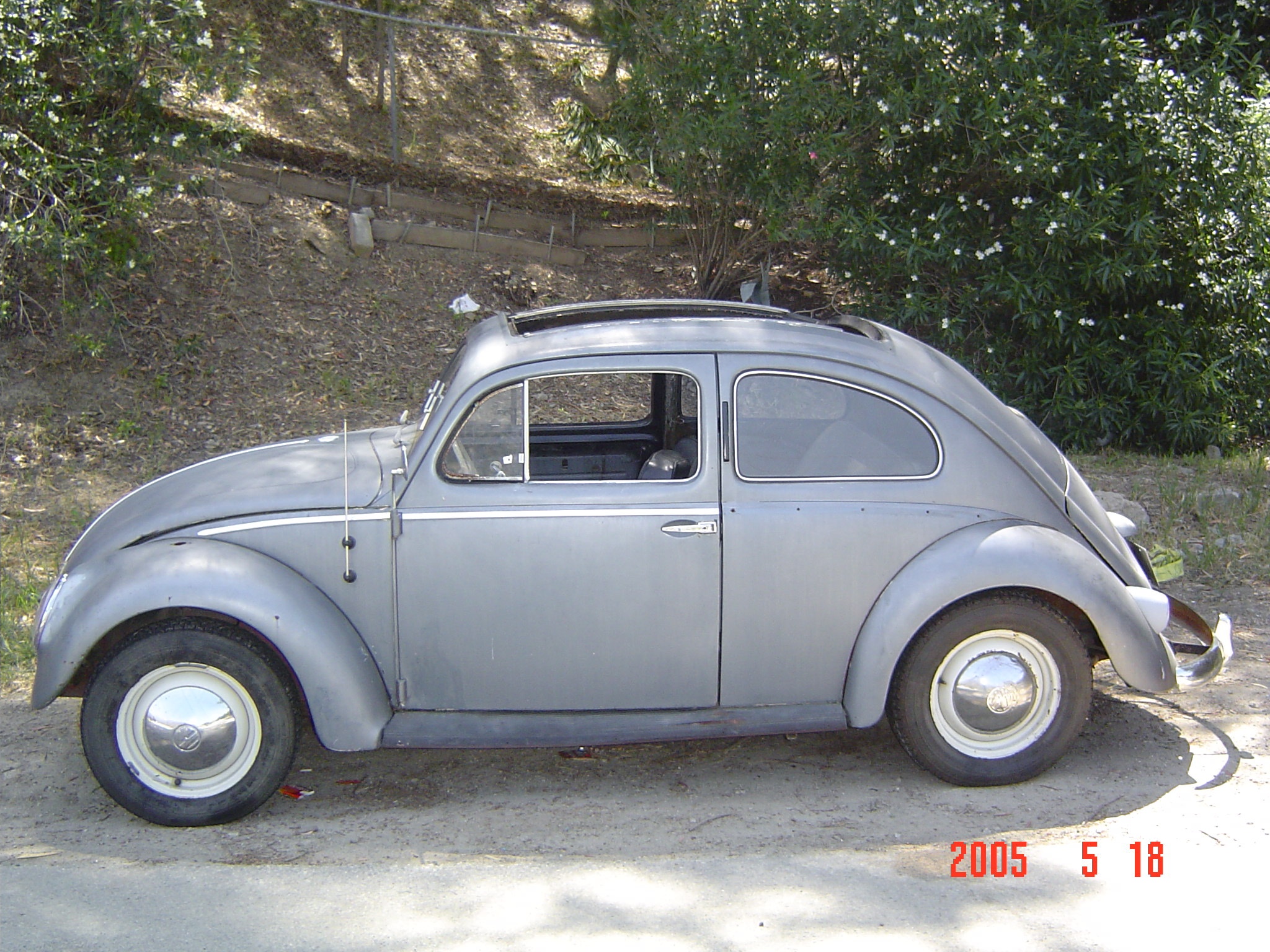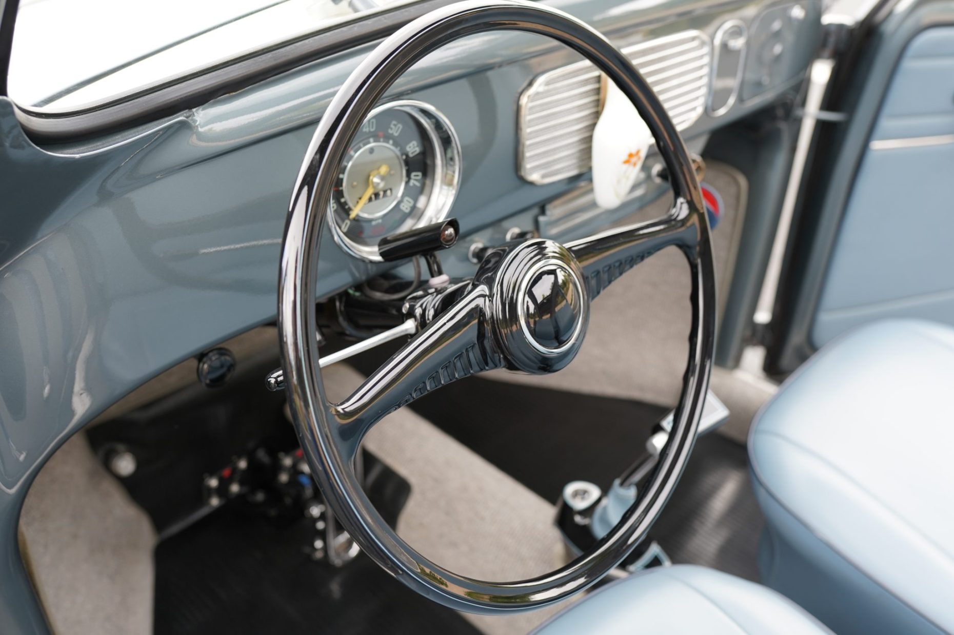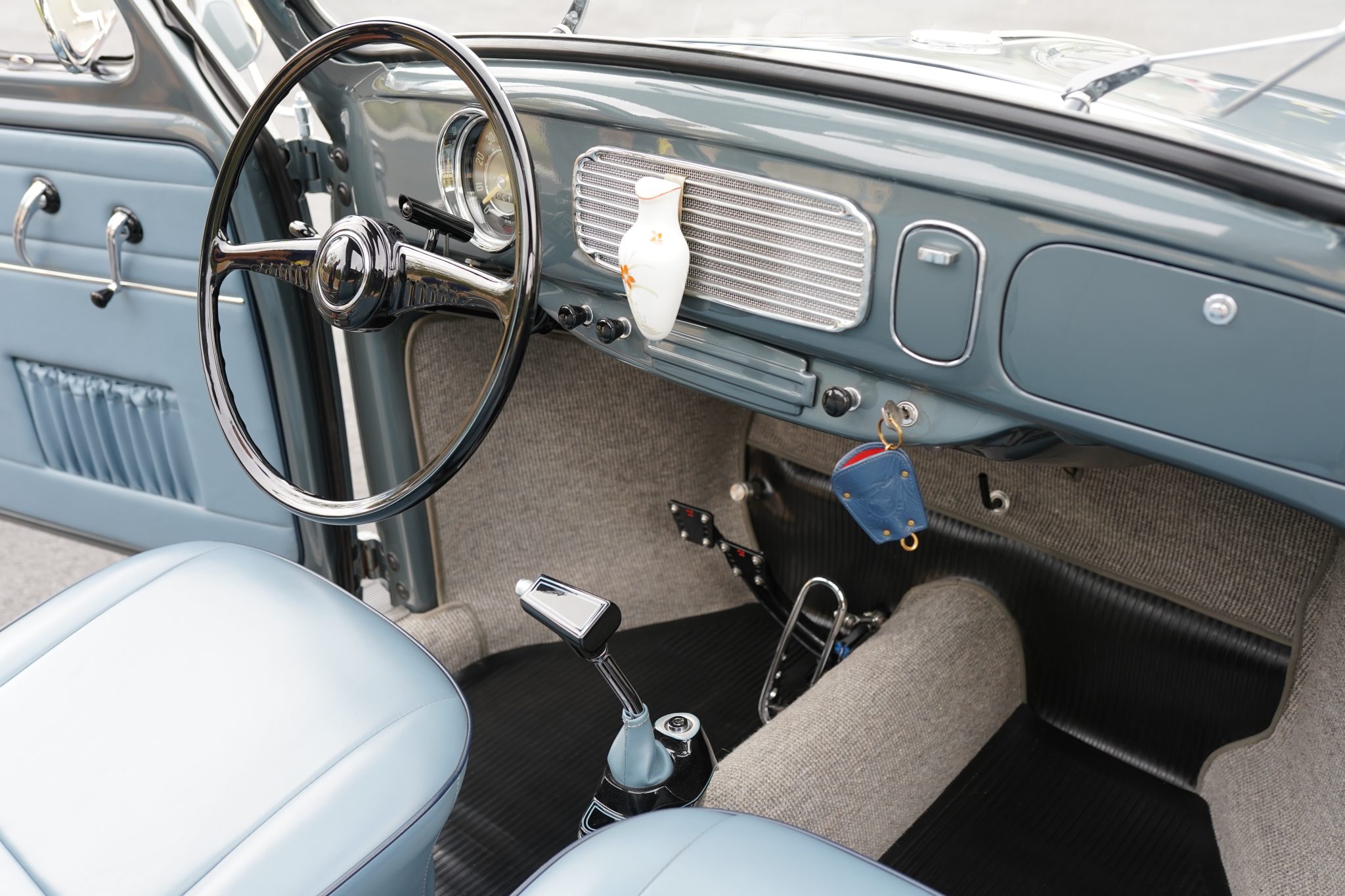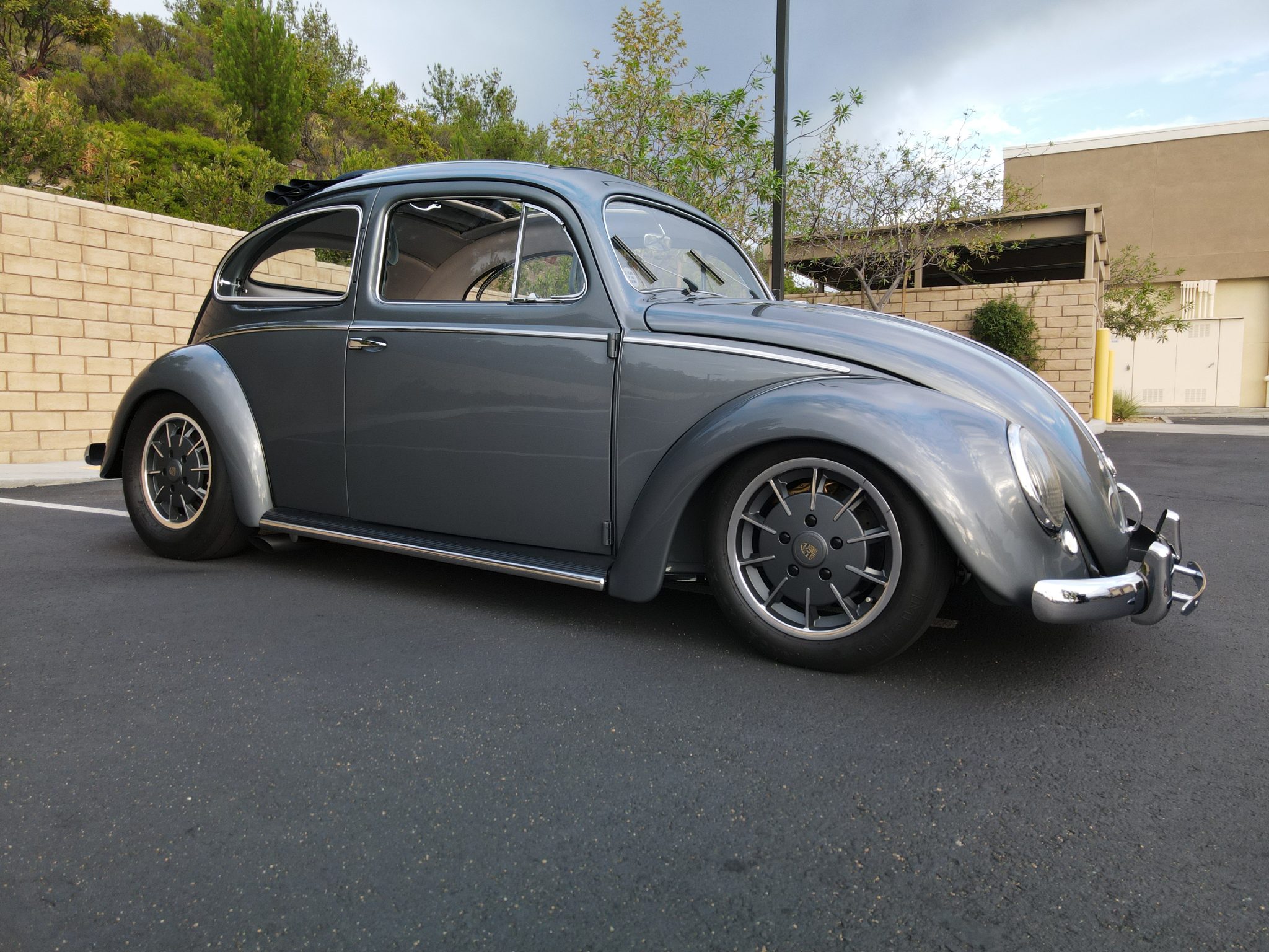 Finished in Strato Silver over blue vinyl, it is powered by an air-cooled 2,332cc flat-four paired with a four-speed manual transaxle. Equipment includes a Hunt magneto, dual Weber carburetors, an A1 Sidewinder exhaust system, a lowered suspension with a narrowed front beam, Wilwood disc brakes, 15″ Mahle “gas burner” magnesium wheels, M&H cheater-slick tires, chrome bumpers, a blue cloth sunroof, “egg” taillights, a “batwing” steering wheel, a custom shifter and pedal assembly, and crank windows.