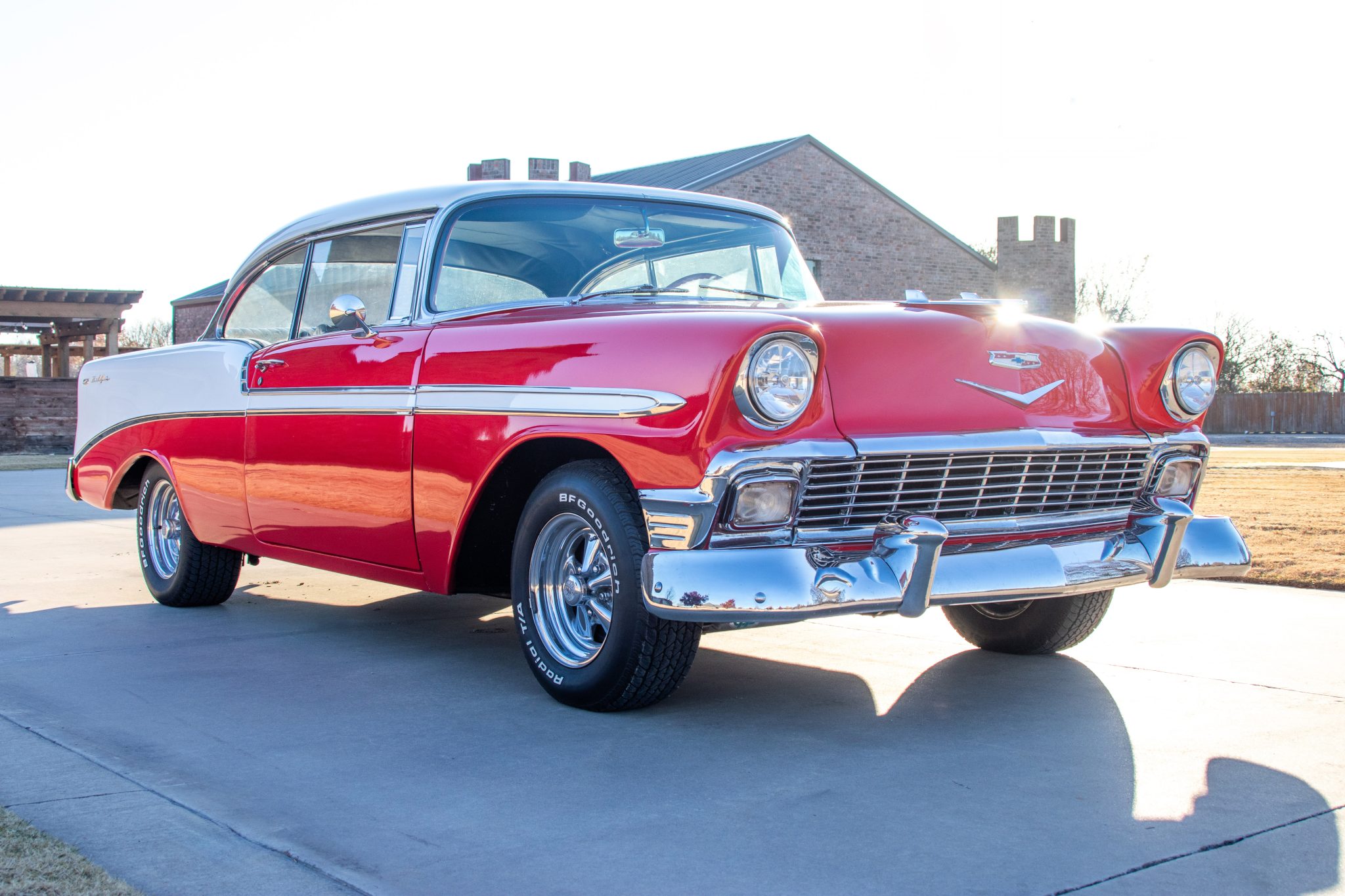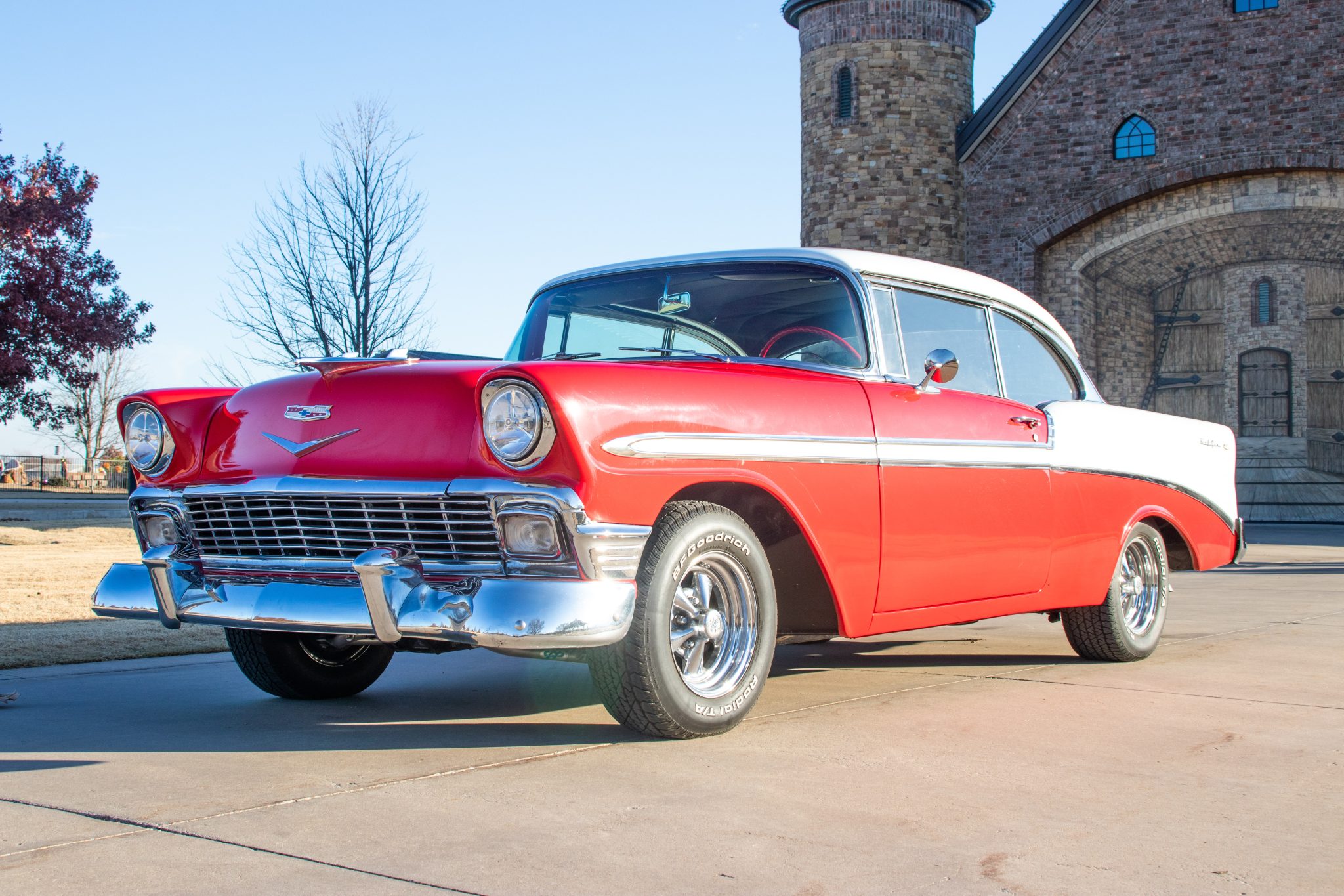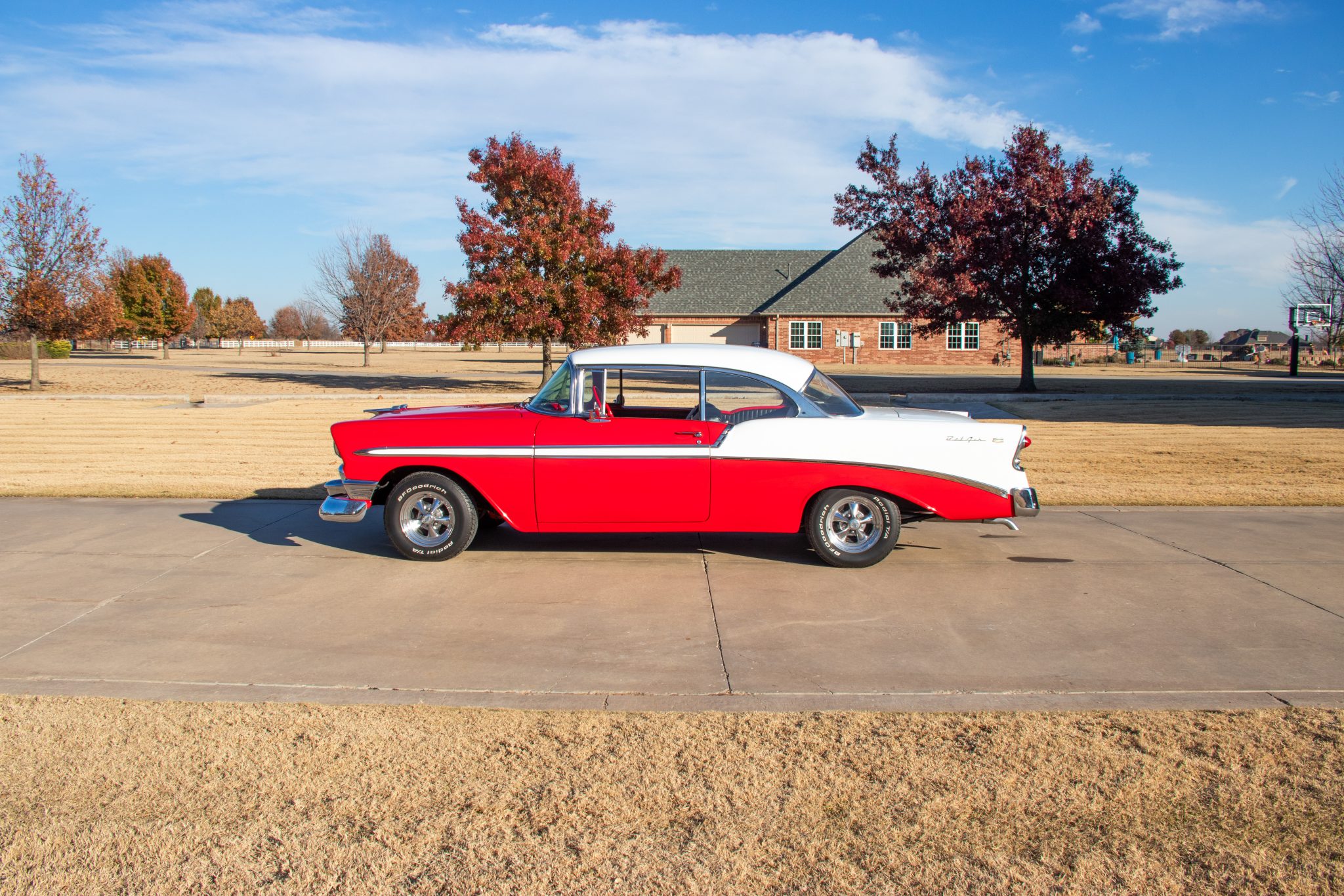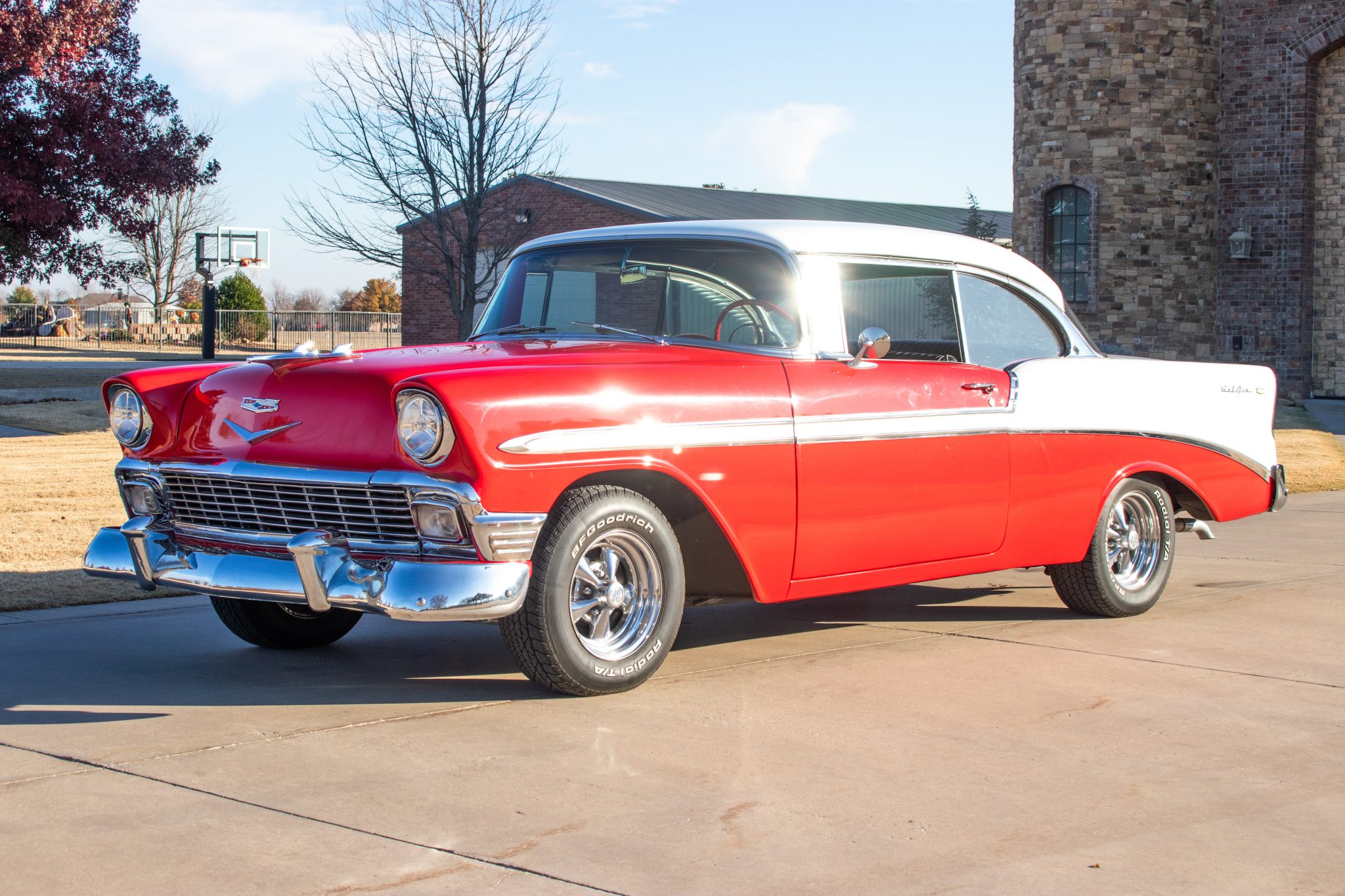 This 1956 Chevrolet Bel Air two-door hardtop is powered by a 327ci V8 paired with a Turbo Hydra-Matic 400 with a B&M floor shifter. It has been repainted in Viper Red and white and the interior has been reupholstered in black vinyl. Additional equipment includes Cragar S/S wheels, a dual exhaust system, and an electric radiator fan.