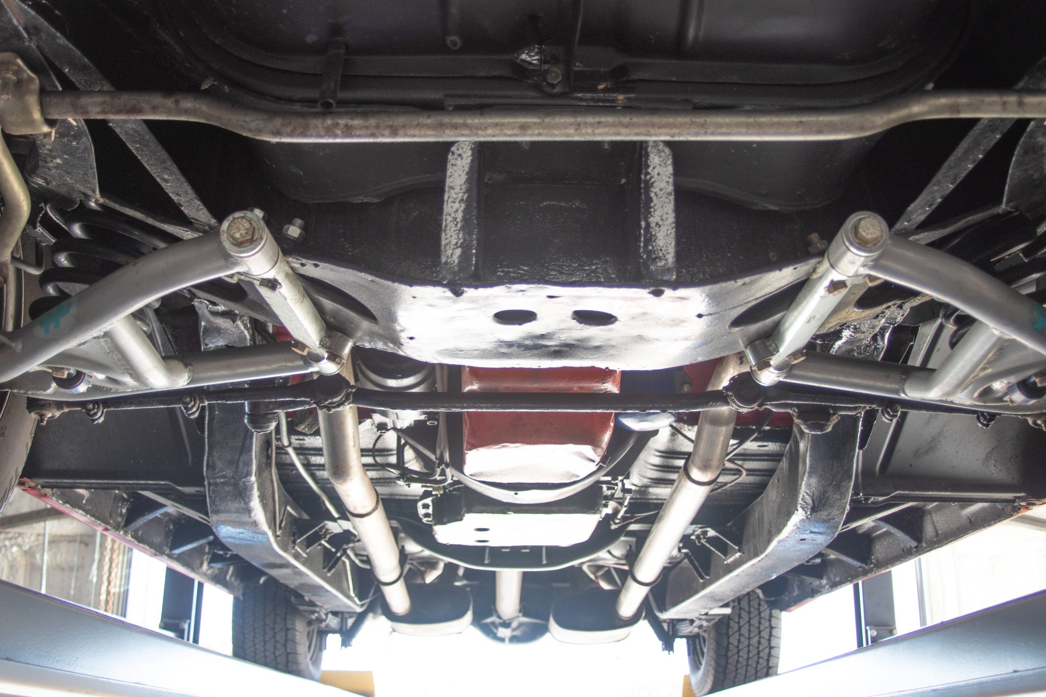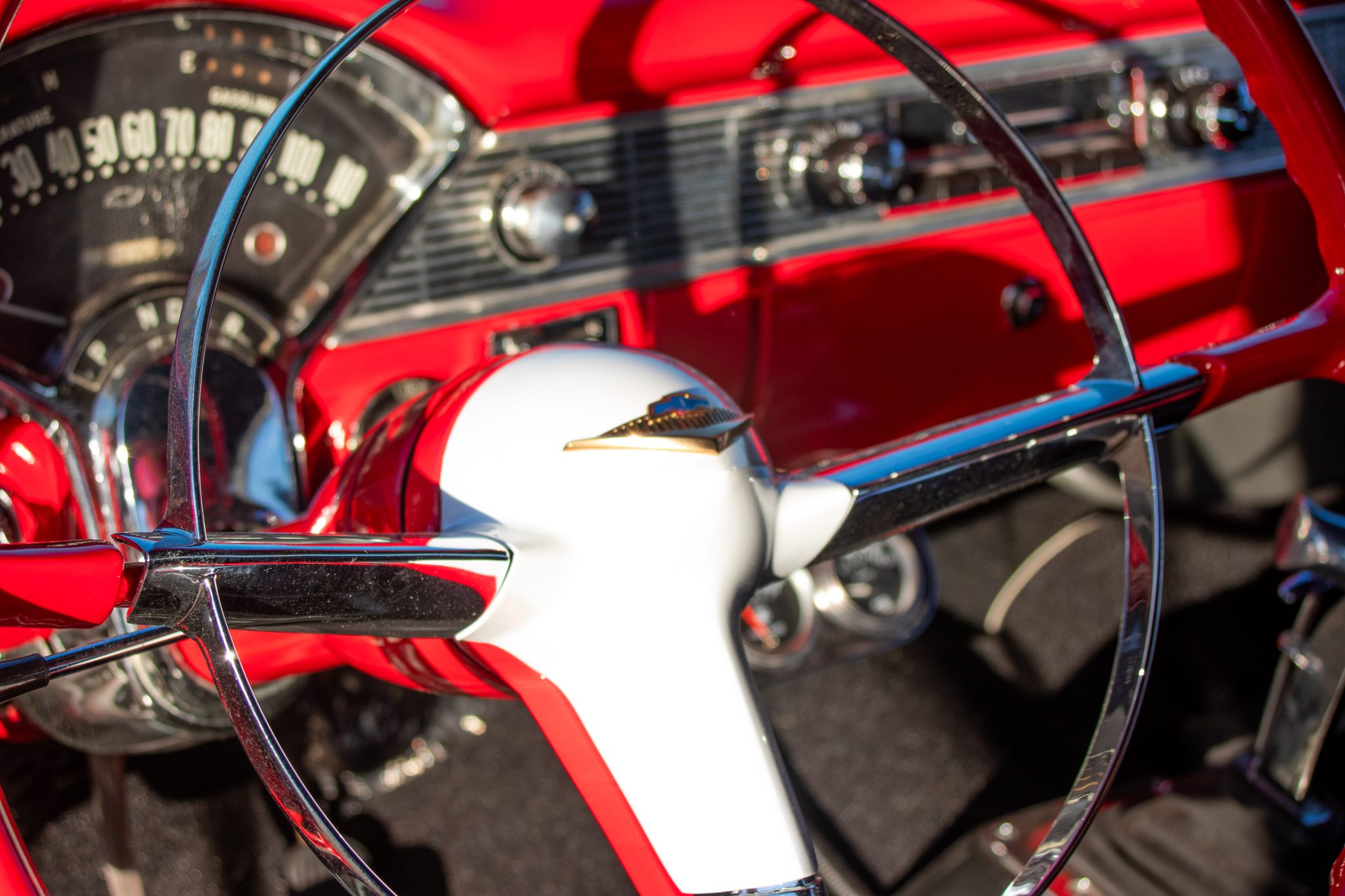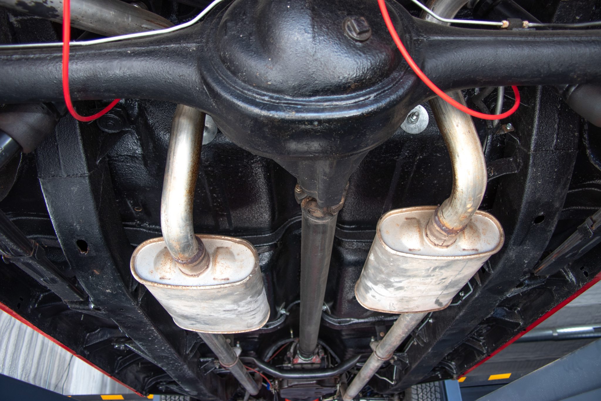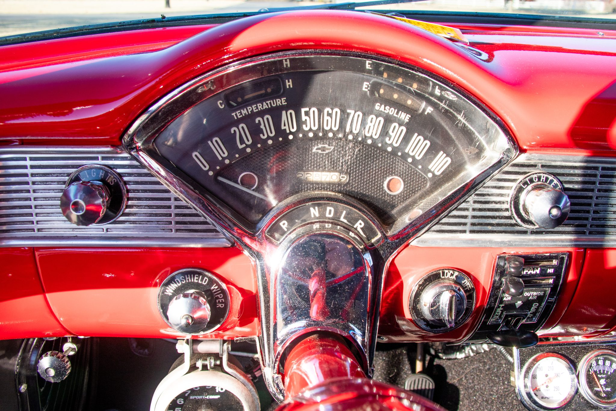This 1956 Chevrolet Bel Air two-door hardtop is powered by a 327ci V8 paired with a Turbo Hydra-Matic 400 with a B&M floor shifter. It has been repainted in Viper Red and white and the interior has been reupholstered in black vinyl. Additional equipment includes Cragar S/S wheels, a dual exhaust system, and an electric radiator fan.
