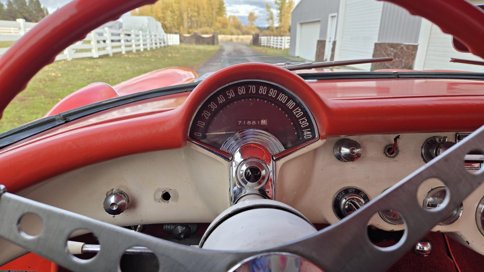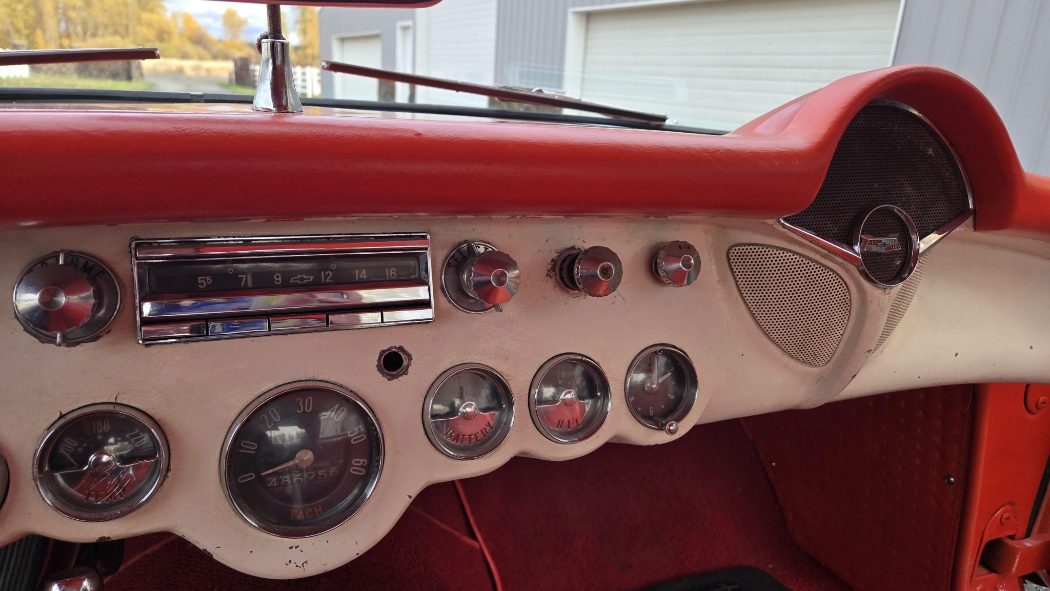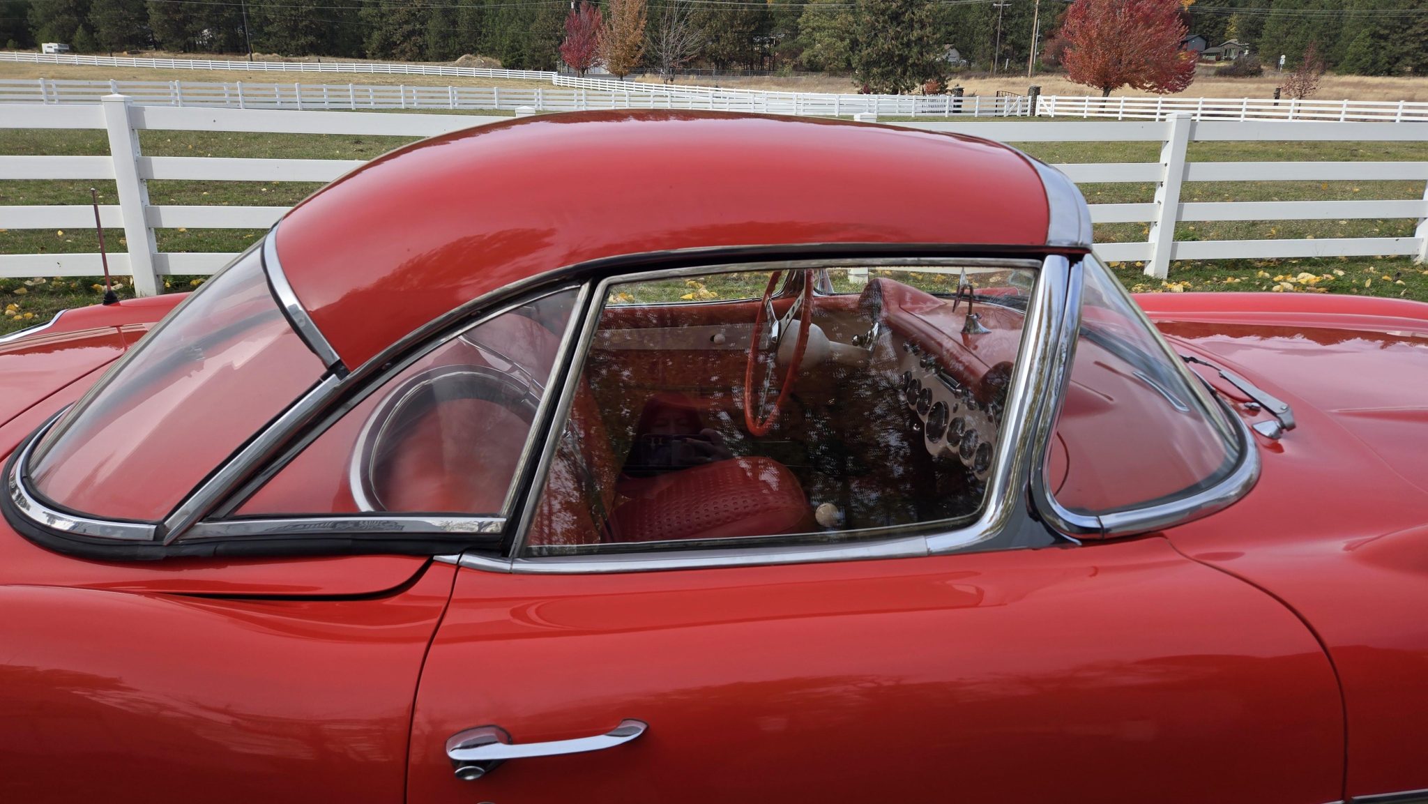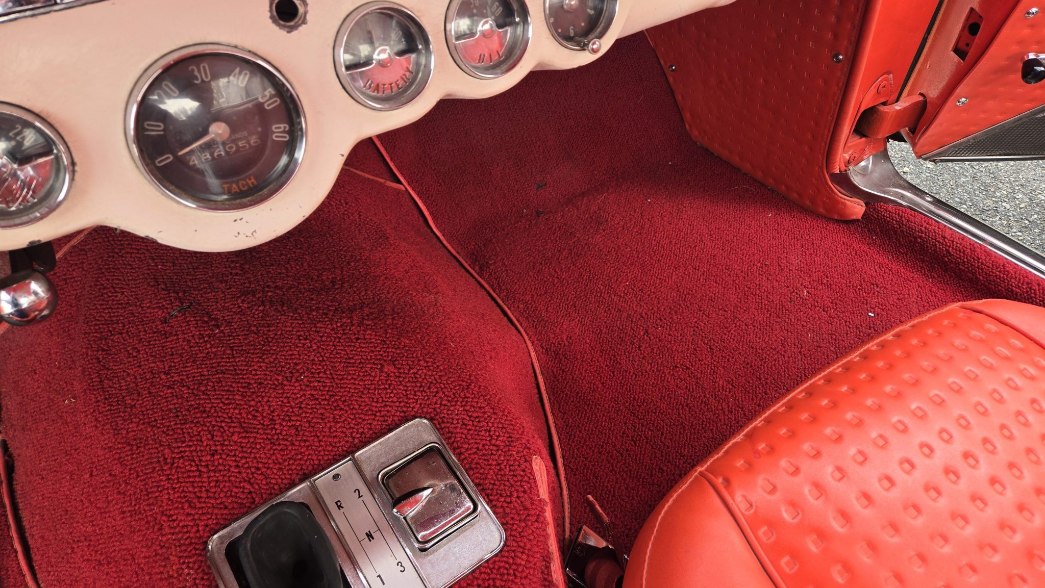 A 283ci V8 was installed under previous ownership, and it is paired with a three-speed manual transmission. Equipment includes a removable body-color hardtop, windshield washers, seat belts, a heater, an AM radio, bucket seats, and a twin-cowl dash with a dash-mounted rearview mirror.