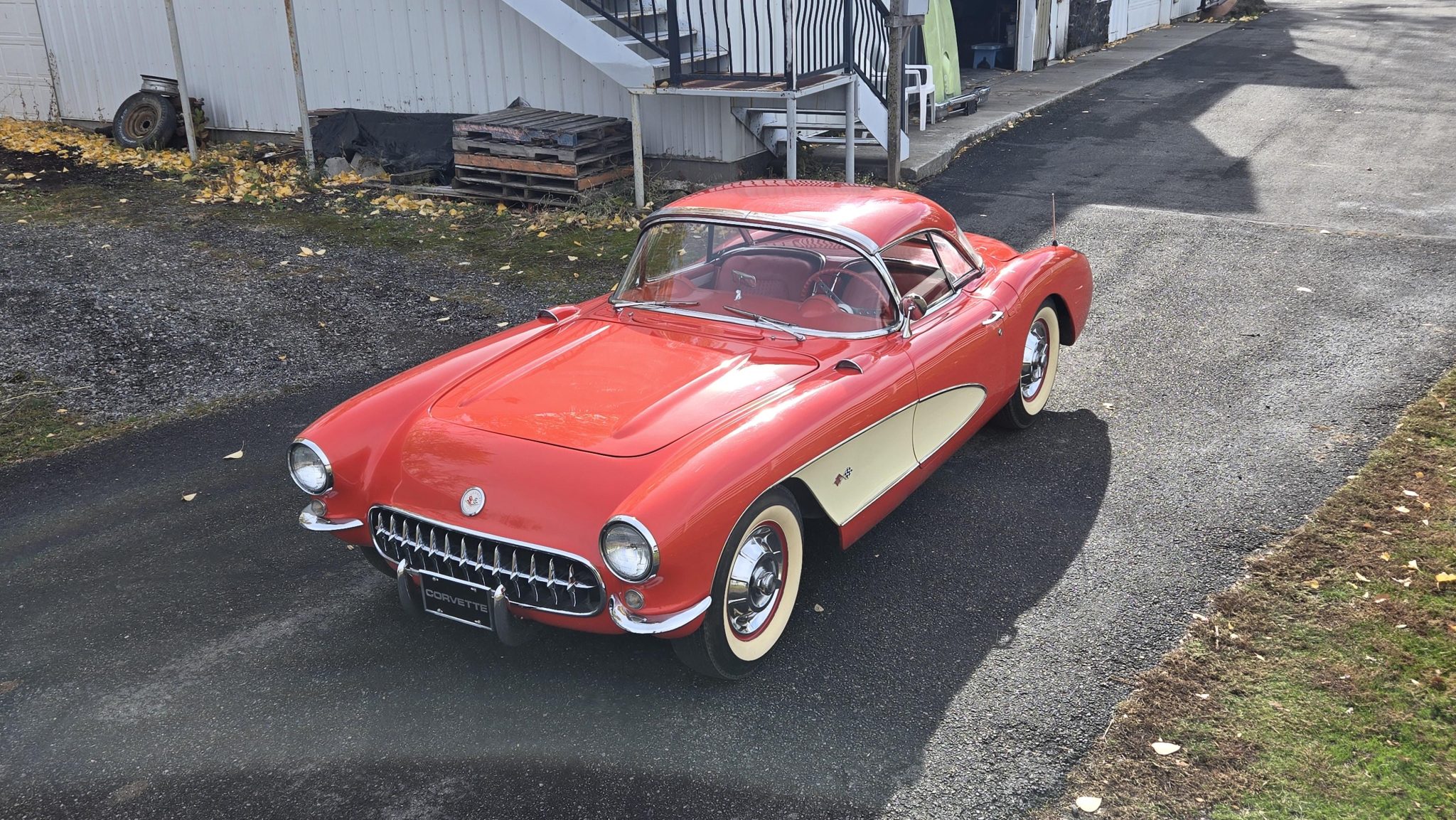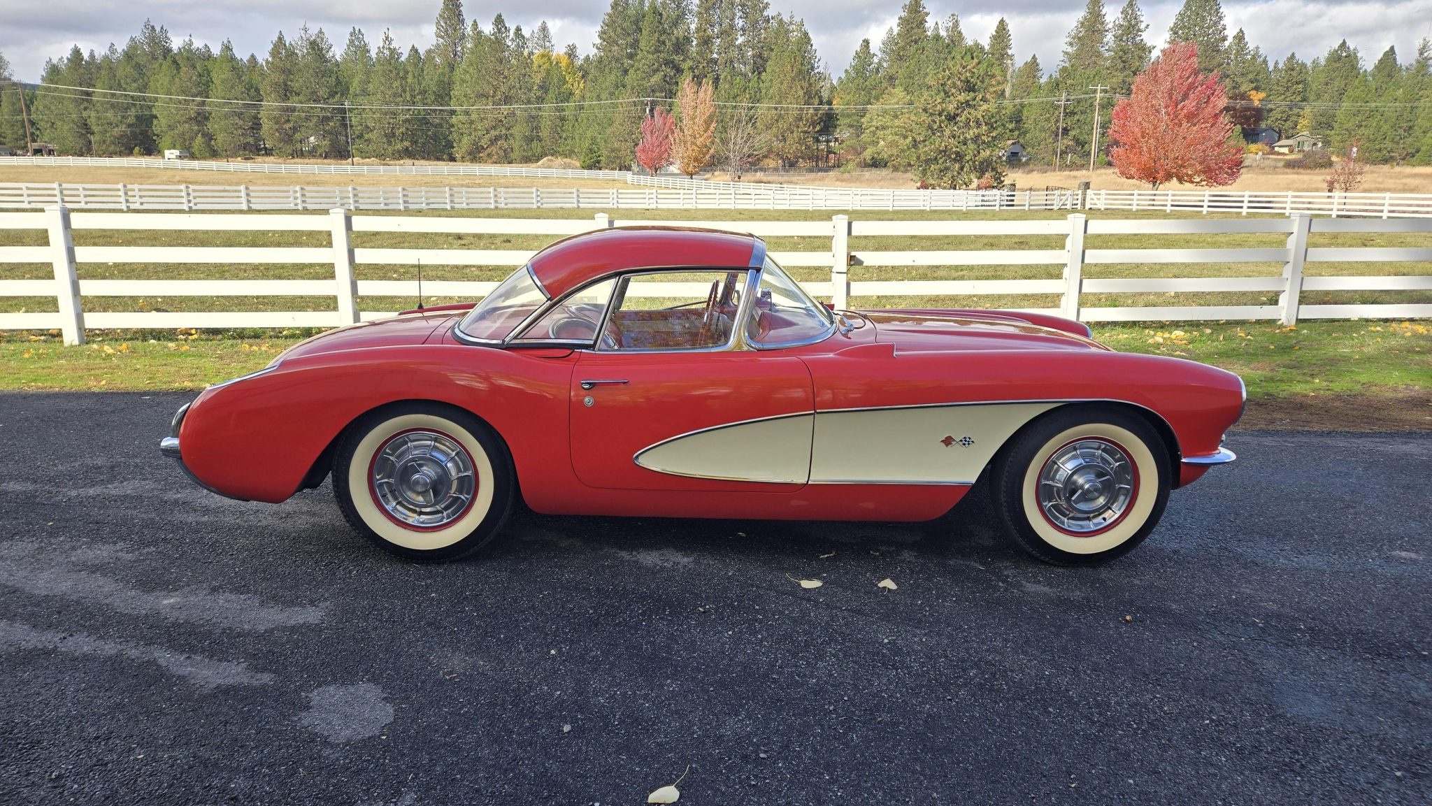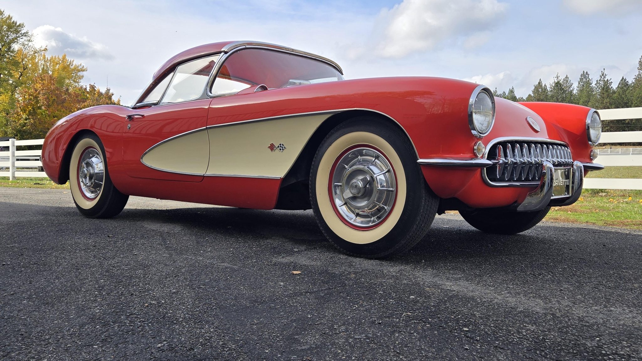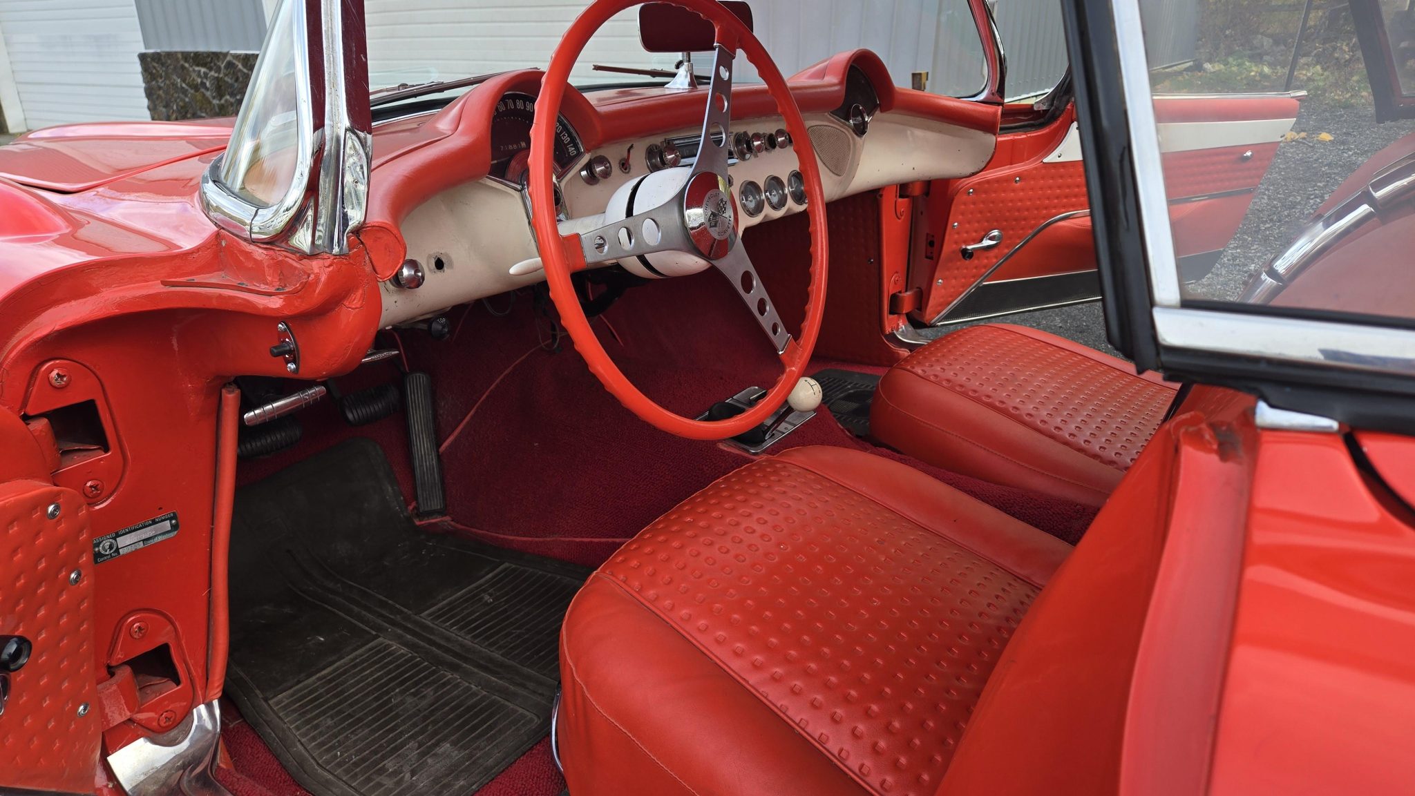 A 283ci V8 was installed under previous ownership, and it is paired with a three-speed manual transmission. Equipment includes a removable body-color hardtop, windshield washers, seat belts, a heater, an AM radio, bucket seats, and a twin-cowl dash with a dash-mounted rearview mirror.
