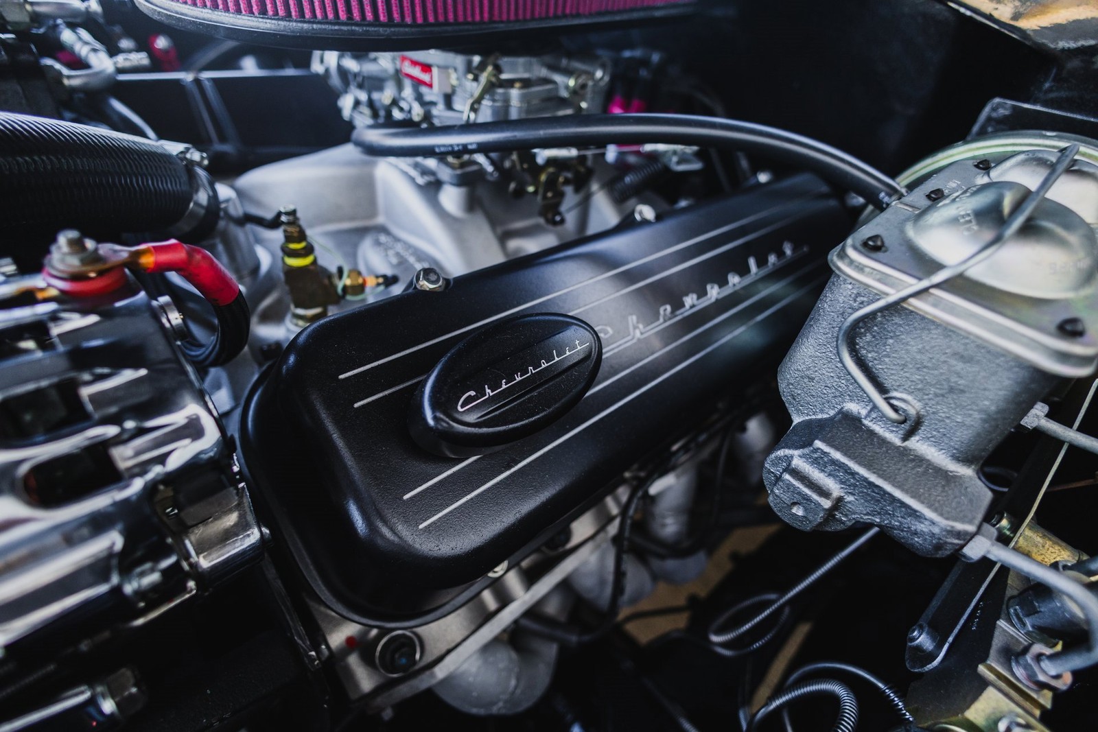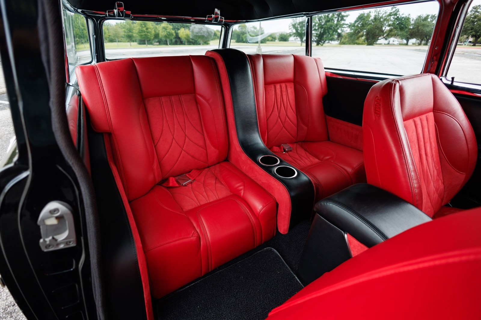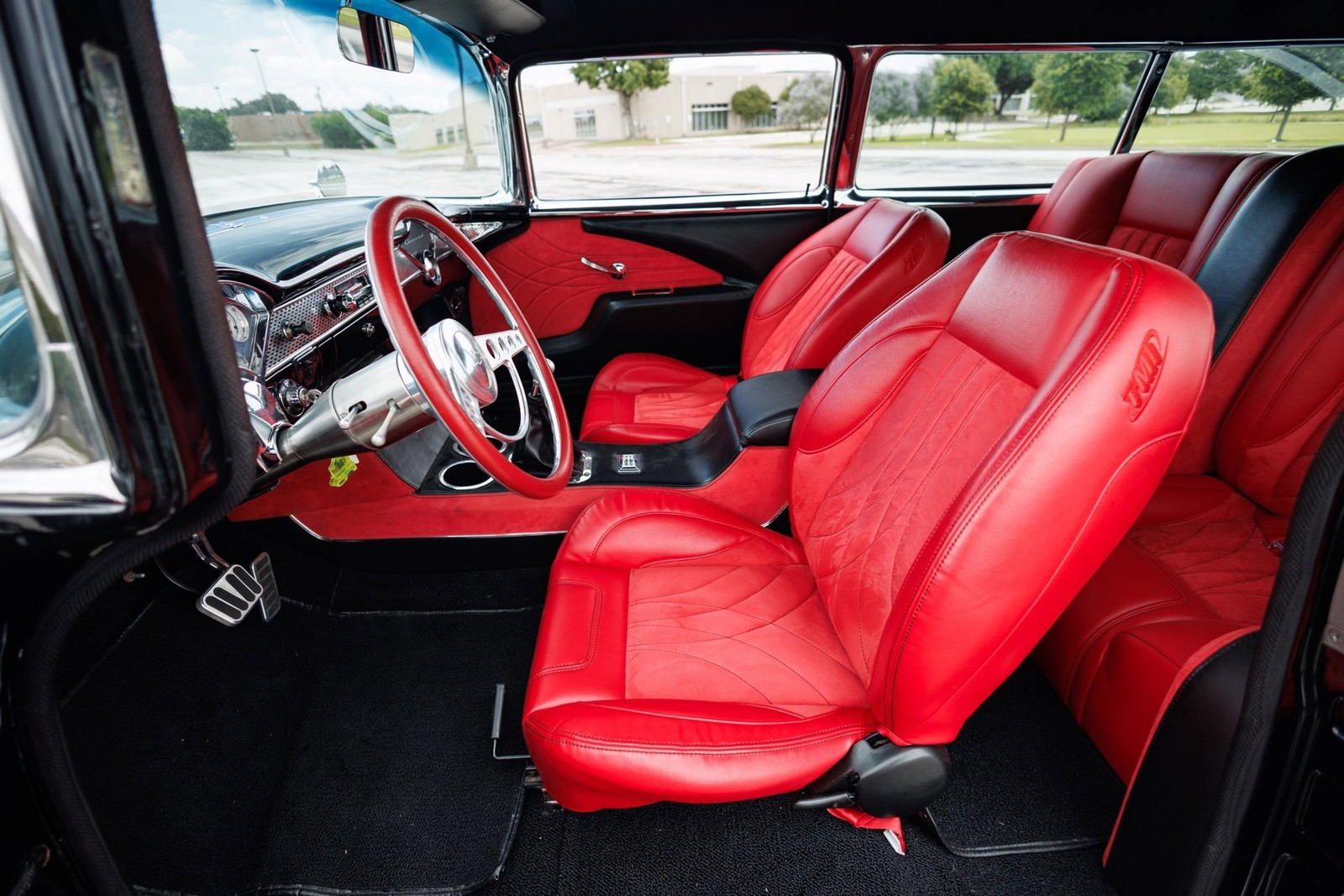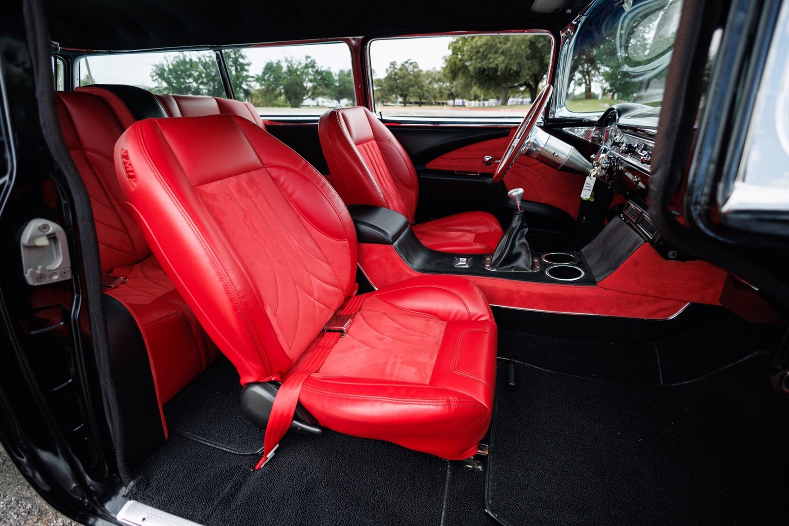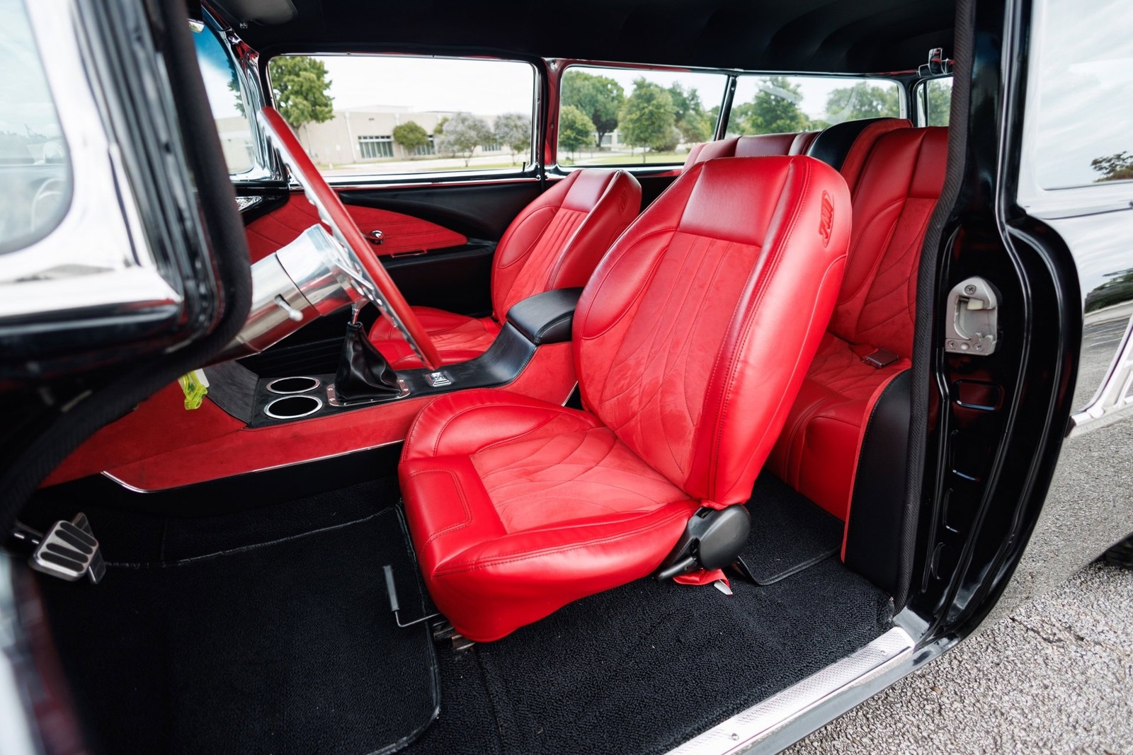 1956 Chevrolet 150 Custom Wagon Restomod. This is a complete rotisserie restored wagon, ready to show and drive anywhere! Complete Build book included.This custom 1956 Chevrolet 150 wagon underwent a professional frame-off restoration and has been driven 80 test miles. It is powered by a 7.4-liter V8 engine with Keith Black pistons, Merlin World heads, a Voodoo camshaft and roller rockers. The engine is mated to an automatic transmission and a Currie posi-traction rear end with 3.70 gearing. The frame-off restoration included new brake lines, a new fuel system and a complete wiring harness. The suspension features rack & pinion steering, QA1 adjustable coilovers, four-wheel power disc brakes, 2-inch drop spindles, and front and rear anti-sway bars. The body received multiple coats of Deep Black paint, new exterior glass, and restored or replaced trim and emblems. The interior includes modern 2+2 bucket seats, a full-length center console, custom door panels, power windows, air conditioning, a Flaming River tilt-steering column, modern gauges, a billet leather steering wheel and a professionally installed Bluetooth stereo system by Pioneer.Highlights:Full Photo Book of Body Off RestorationDetailed Engine Upgrades List in Build Book454 BBC V8 EngineVoodoo Cam, Keith Black Pistons4L80E Automatic TransmissionLong Tube HeadersEdelbrock 4-Barrel CarburetorHolley Sniper EFI HyperSpark Ign CoilHolley Air CleanerMoroso Aluminum Radiator
