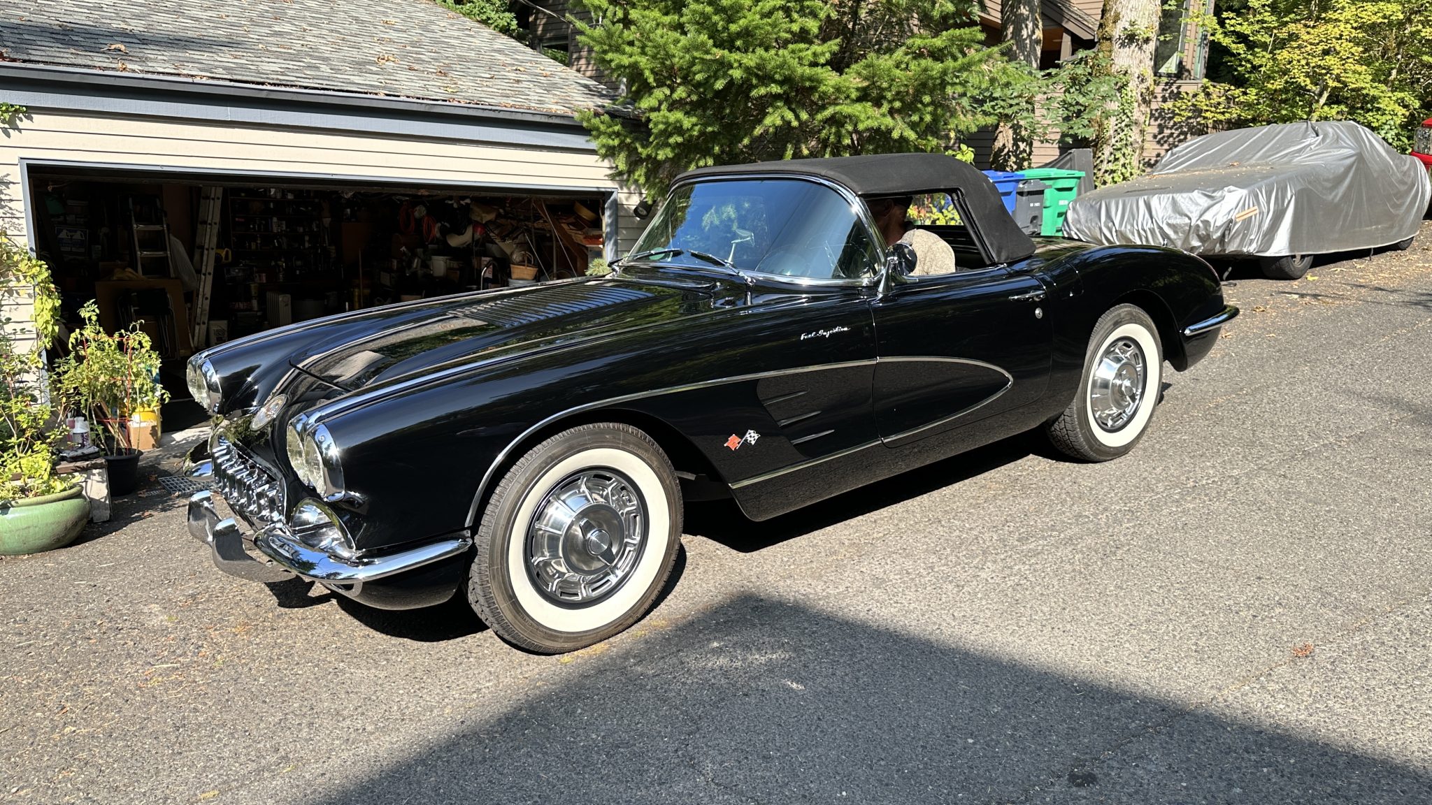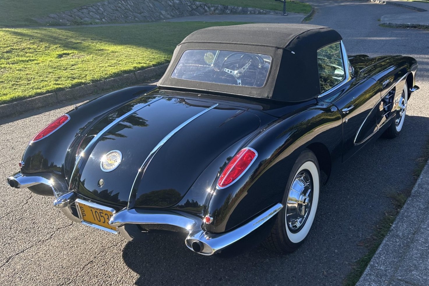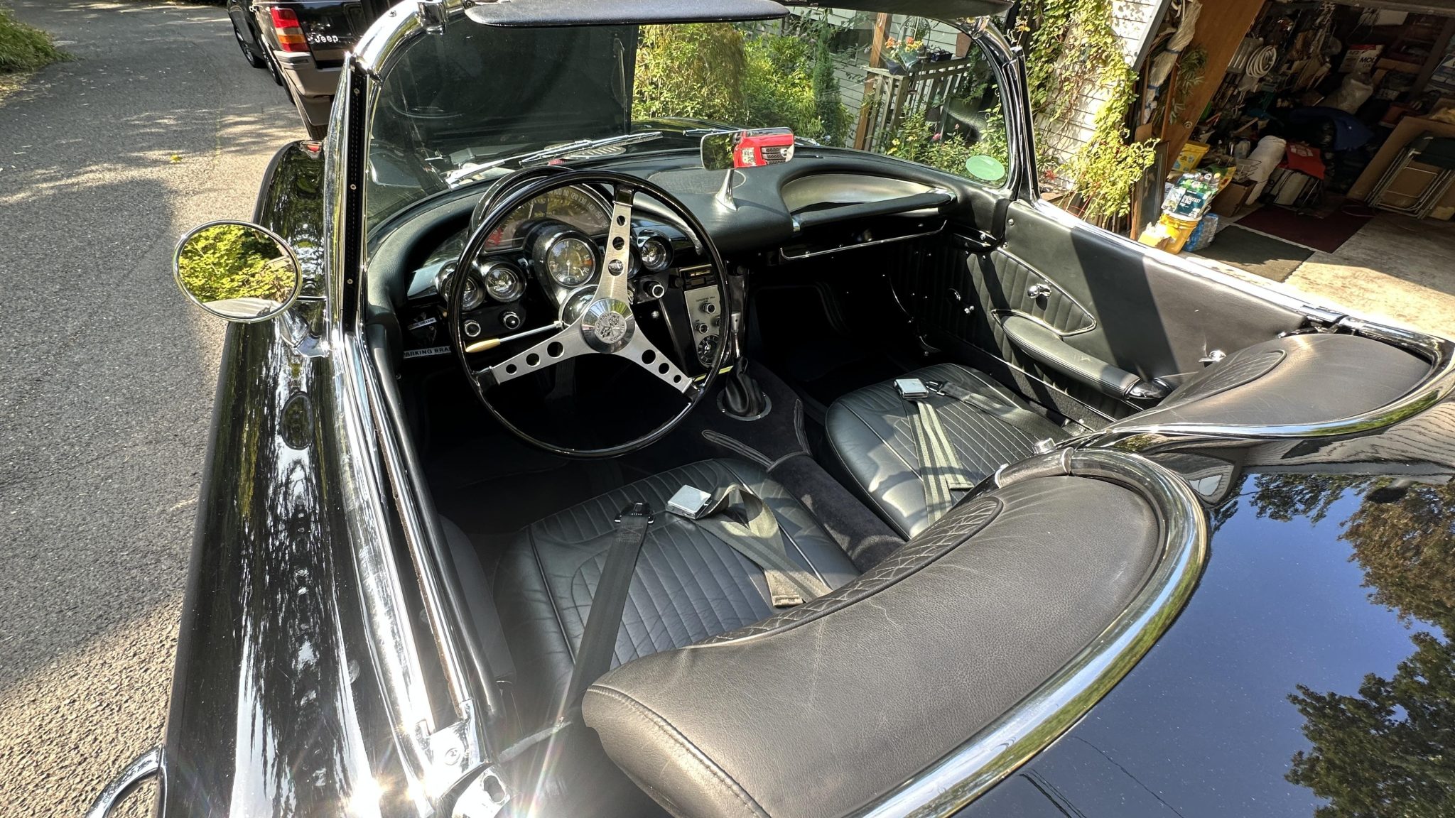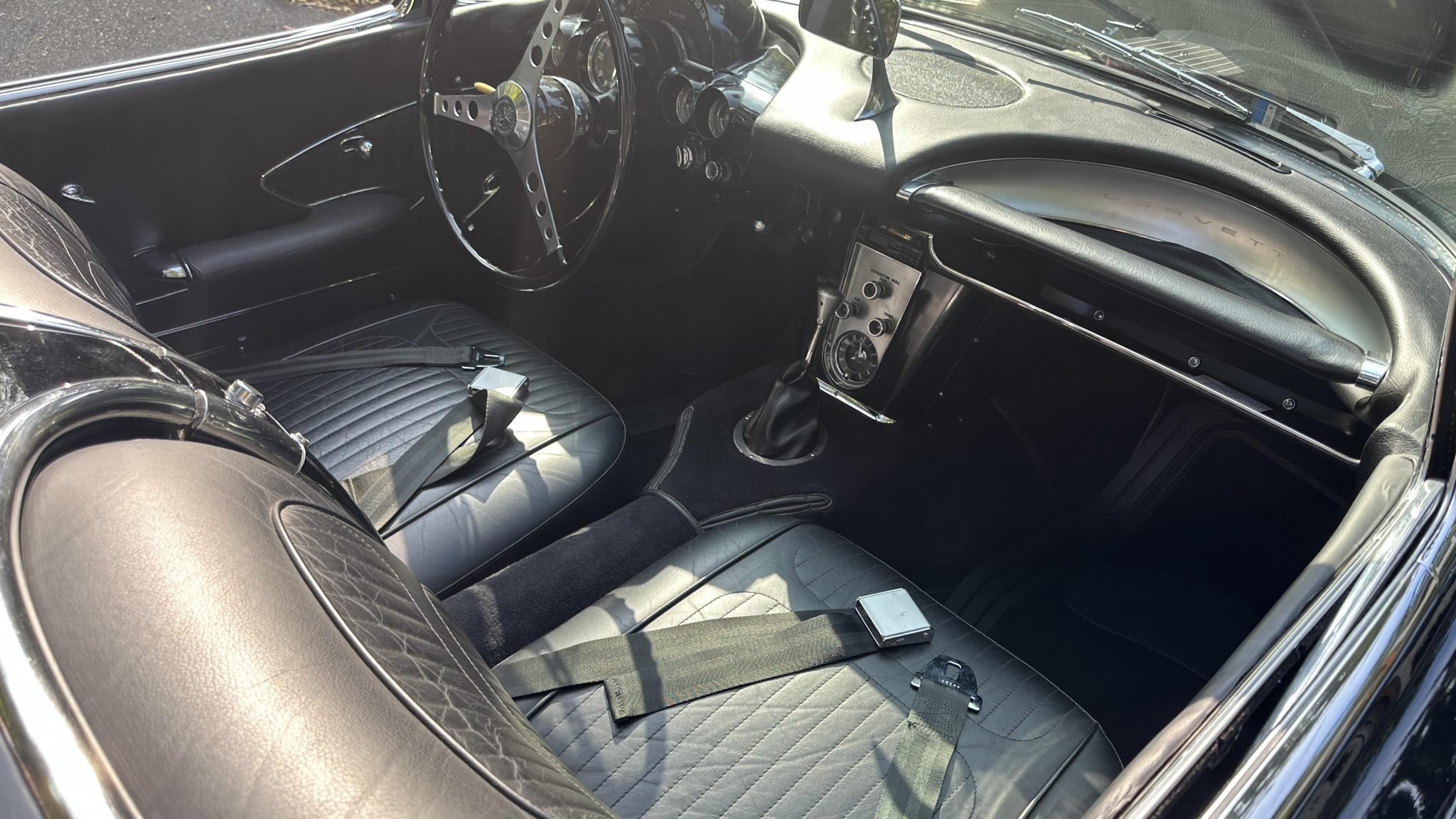 This 1958 Chevrolet Corvette was refurbished in the late 1990s with work that involved installing a ZZ4 350ci V8 and a TH350 three-speed automatic transmission. The black paintwork is complemented by a color-coordinated soft top and leather upholstery. Equipment includes 15″ steel wheels with spinner-style covers as well as front disc brakes, a dual exhaust system, and a Holley carburetor along with a JVC cassette player, lap belts, and an aftermarket shifter.