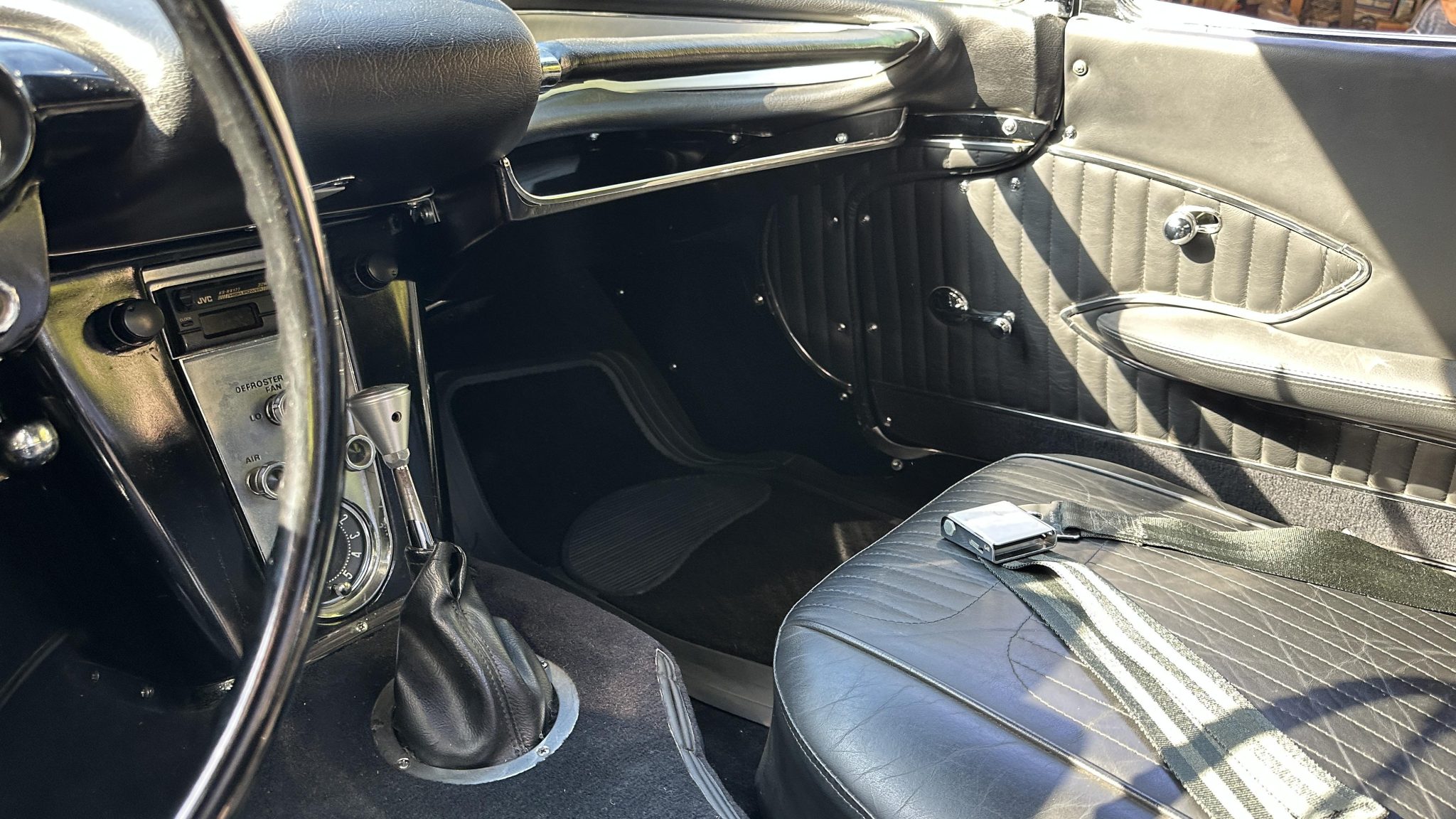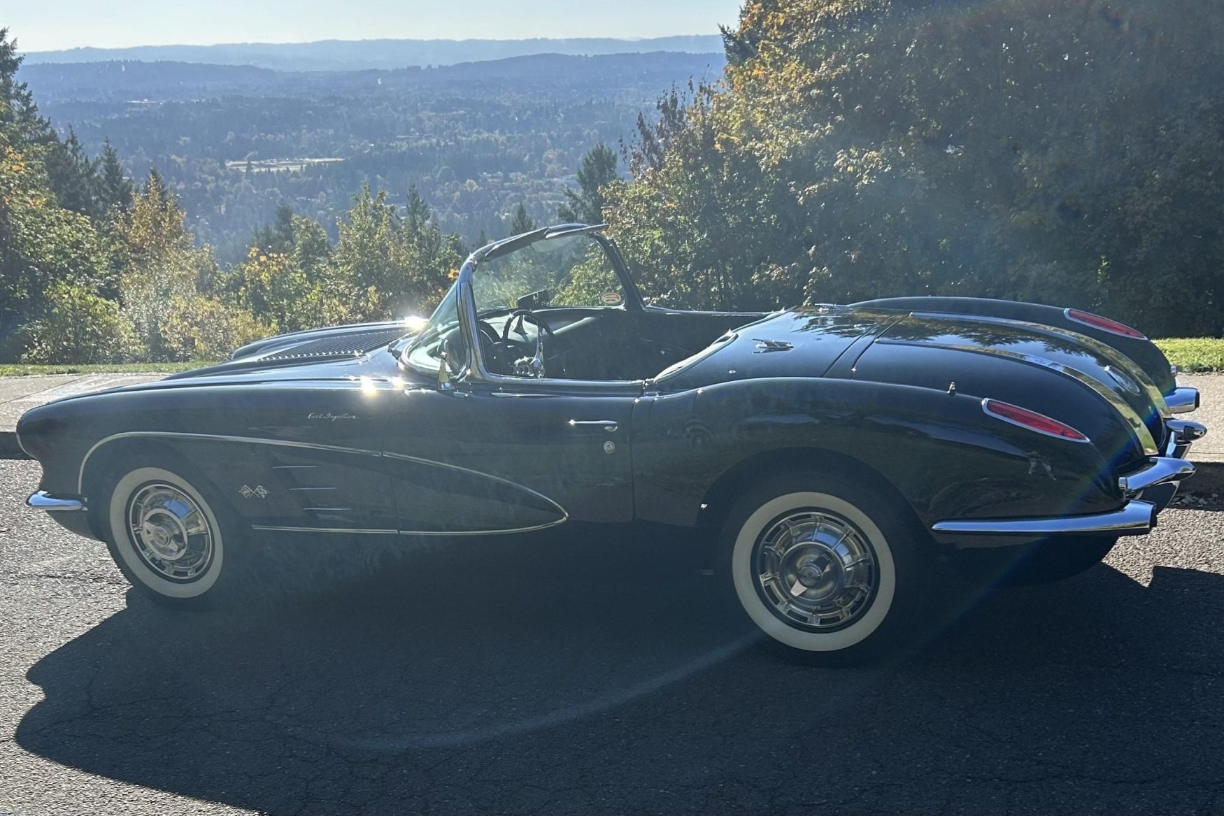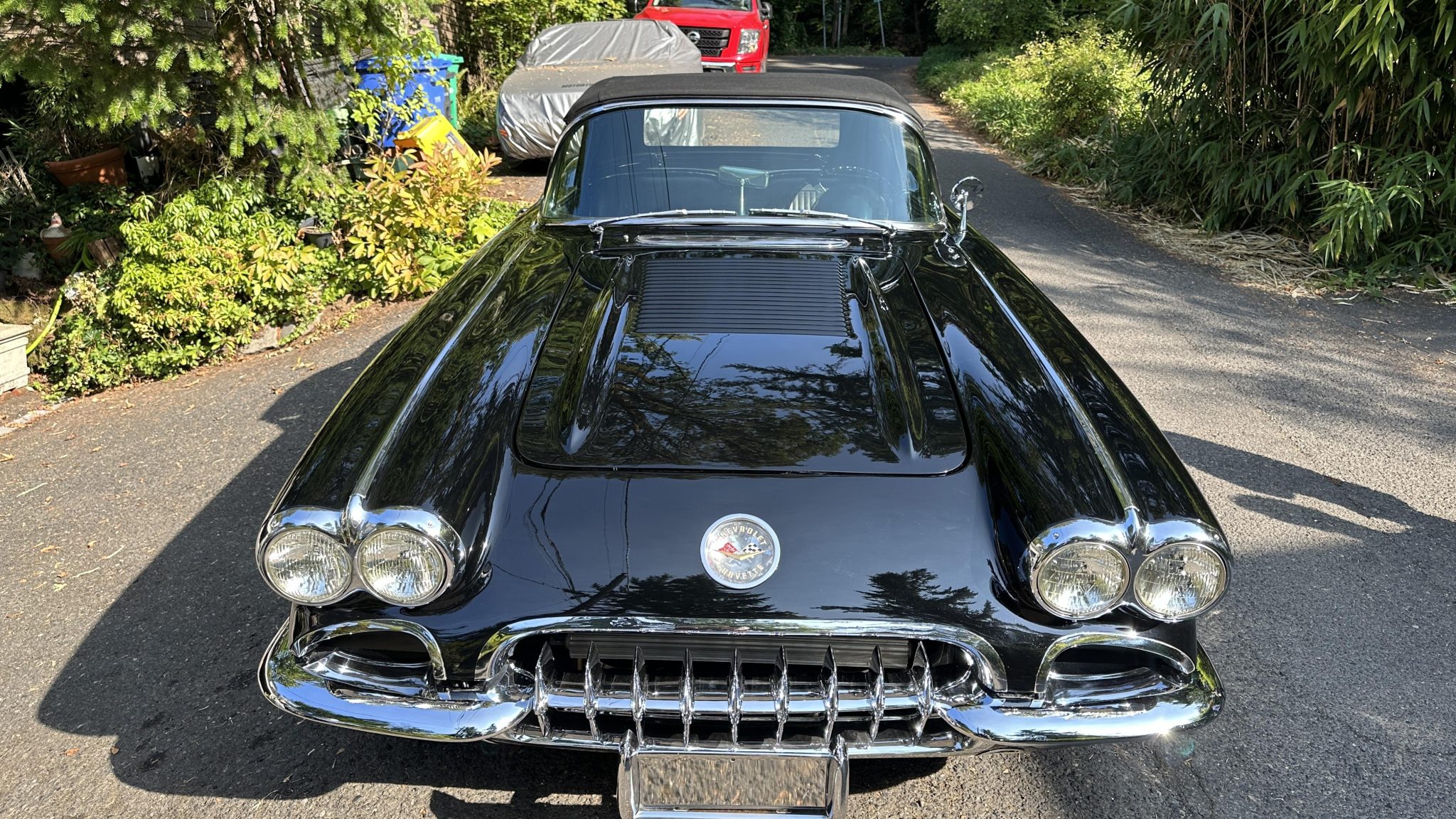 This 1958 Chevrolet Corvette was refurbished in the late 1990s with work that involved installing a ZZ4 350ci V8 and a TH350 three-speed automatic transmission. The black paintwork is complemented by a color-coordinated soft top and leather upholstery. Equipment includes 15″ steel wheels with spinner-style covers as well as front disc brakes, a dual exhaust system, and a Holley carburetor along with a JVC cassette player, lap belts, and an aftermarket shifter.