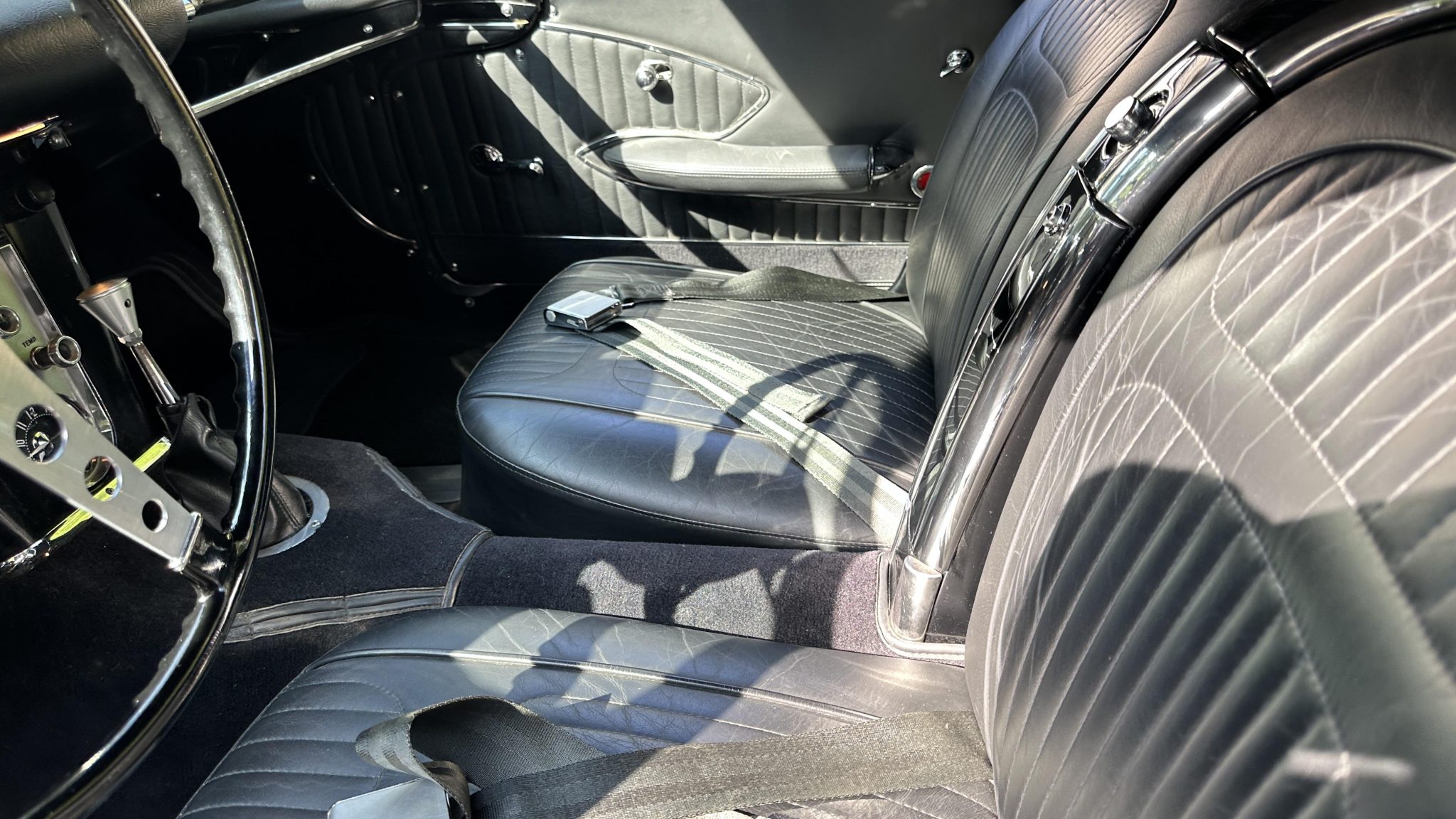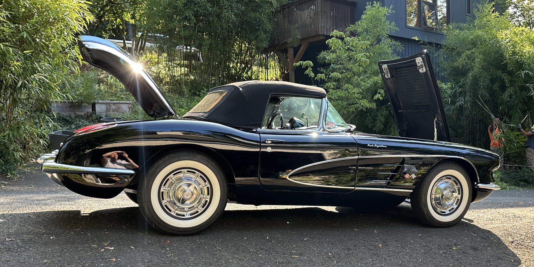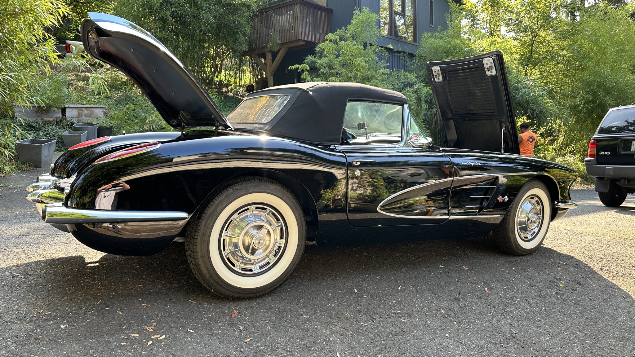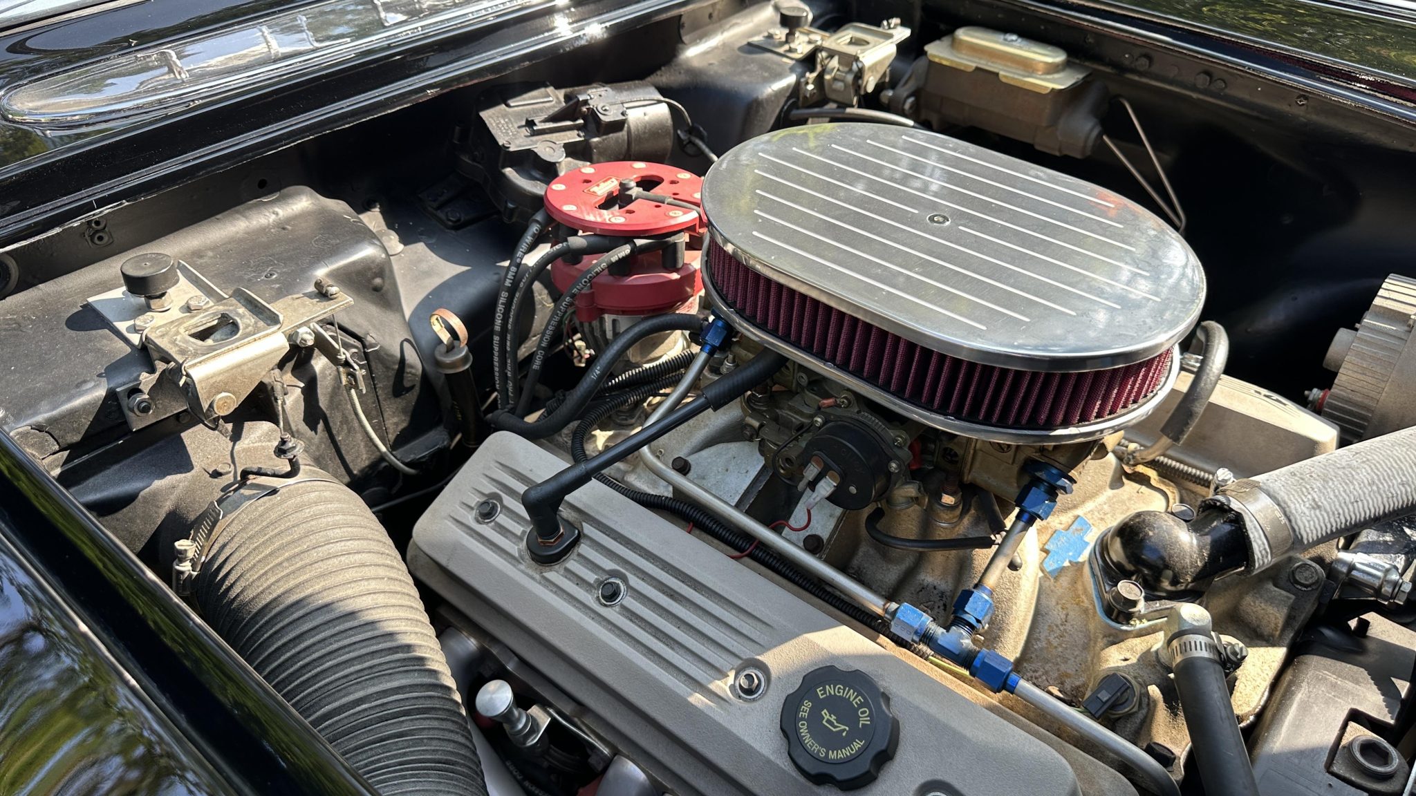 This 1958 Chevrolet Corvette was refurbished in the late 1990s with work that involved installing a ZZ4 350ci V8 and a TH350 three-speed automatic transmission. The black paintwork is complemented by a color-coordinated soft top and leather upholstery. Equipment includes 15″ steel wheels with spinner-style covers as well as front disc brakes, a dual exhaust system, and a Holley carburetor along with a JVC cassette player, lap belts, and an aftermarket shifter.