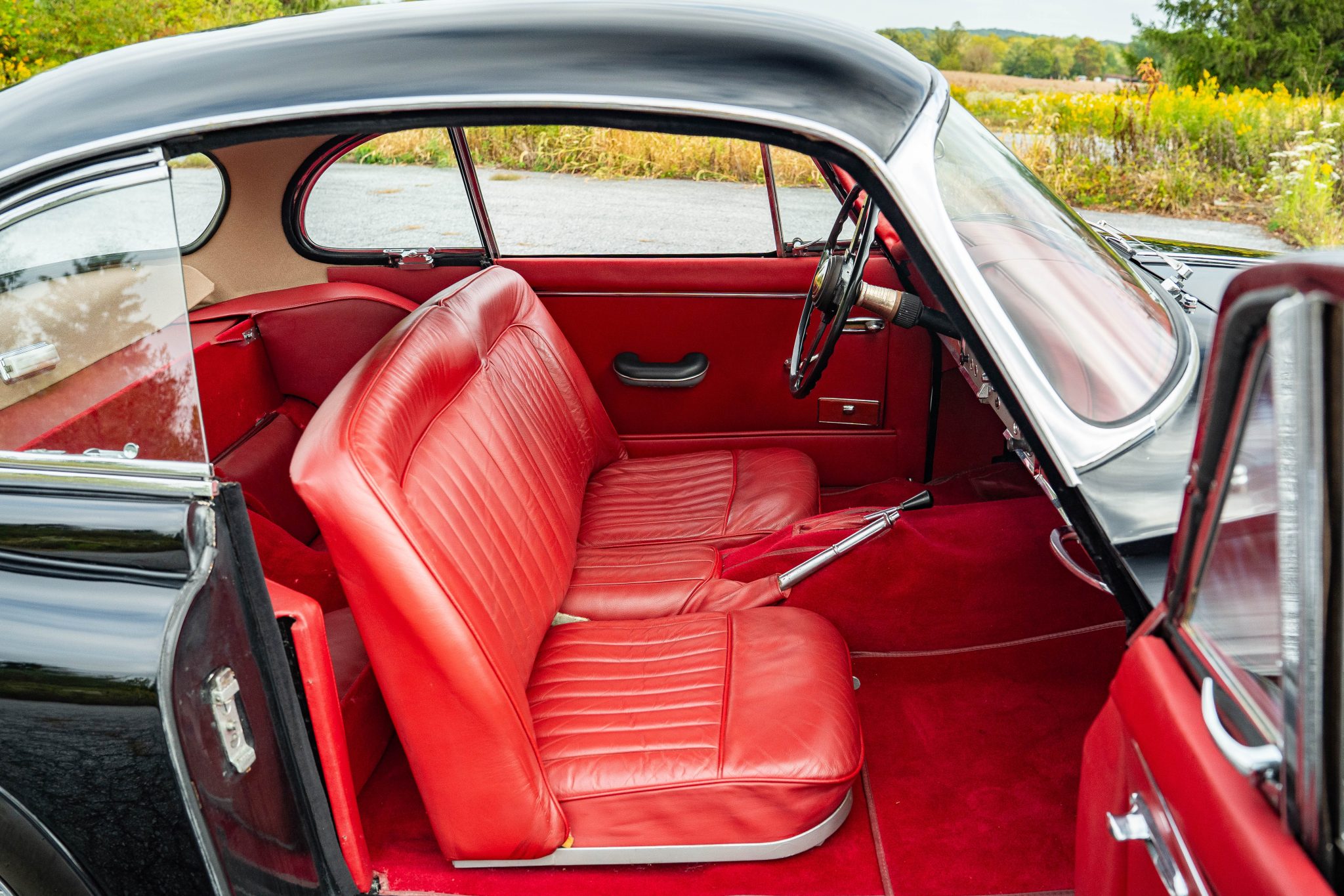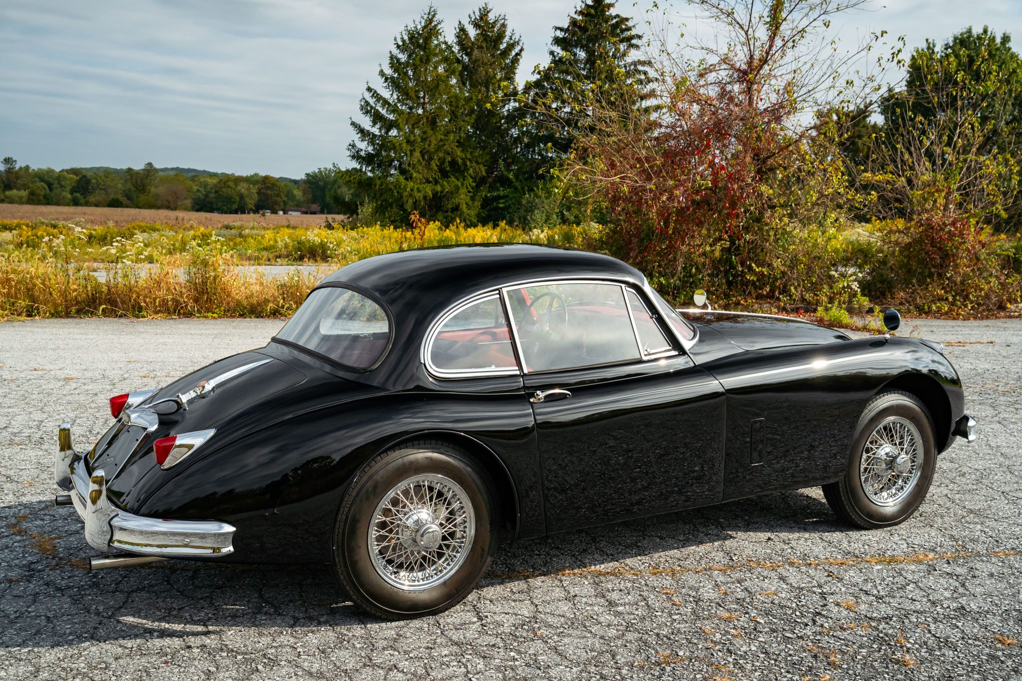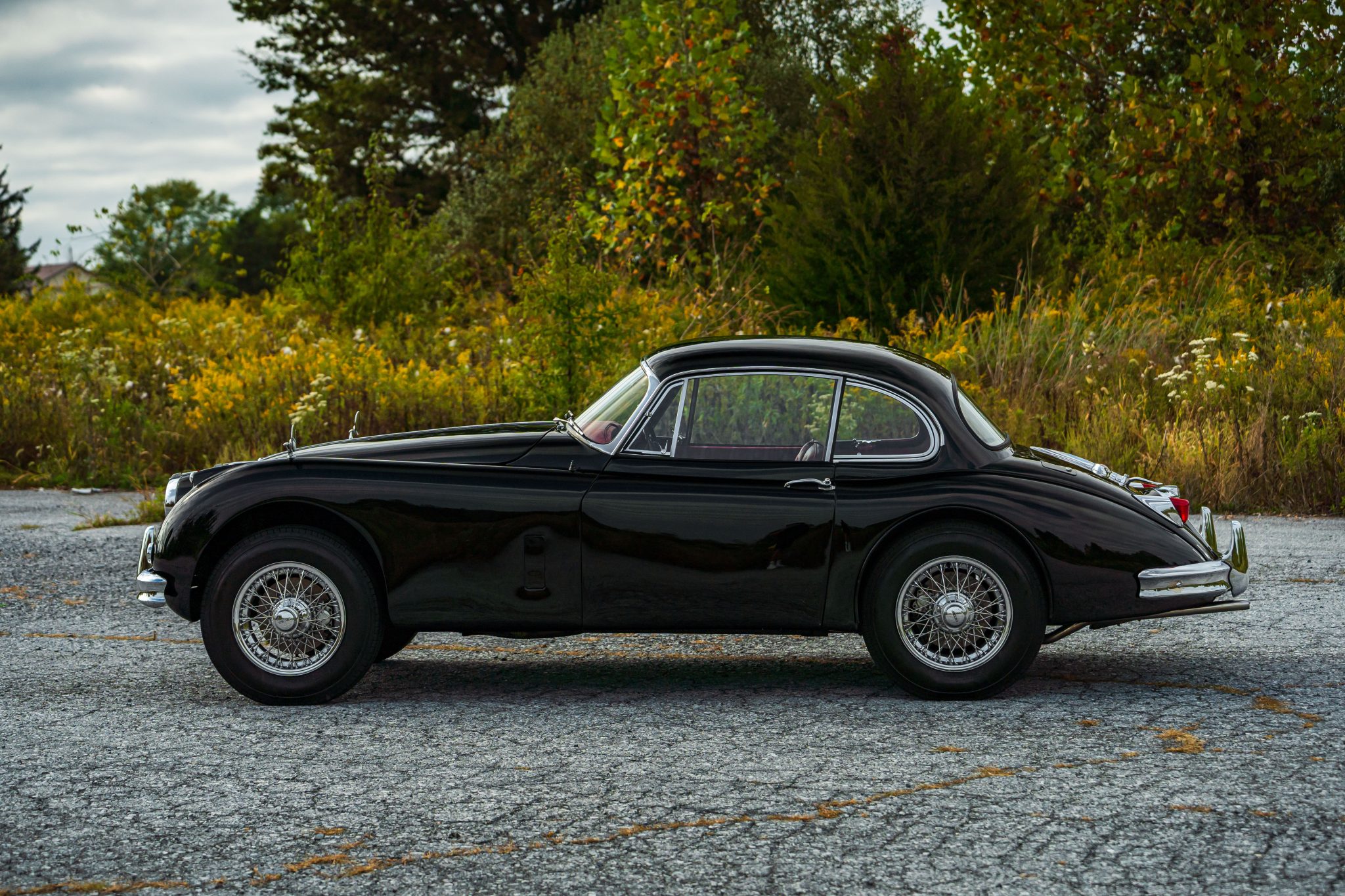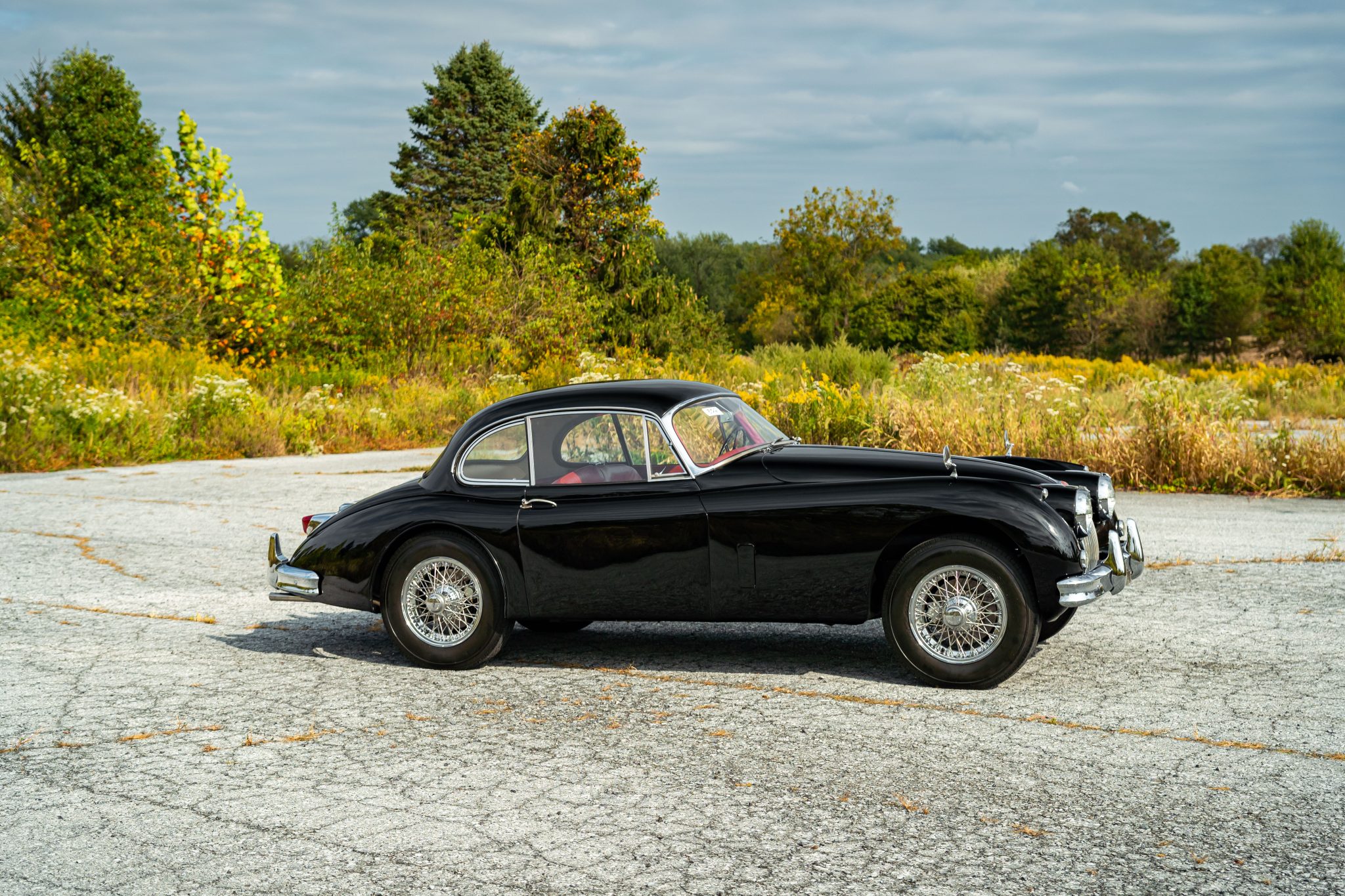 This 1958 Jaguar XK150 fixed-head coupe was refurbished which involved installing a rebuilt 3.8-liter inline-six and replacing the four-speed manual transmission in addition to repainting the black exterior, refreshing the red leather interior, installing a twin-exit exhaust system, and overhauling the brakes and suspension. Equipment includes 16″ knock-off wire wheels, disc brakes, dual SU carburetors, an aluminum radiator, and dual exhaust outlets.