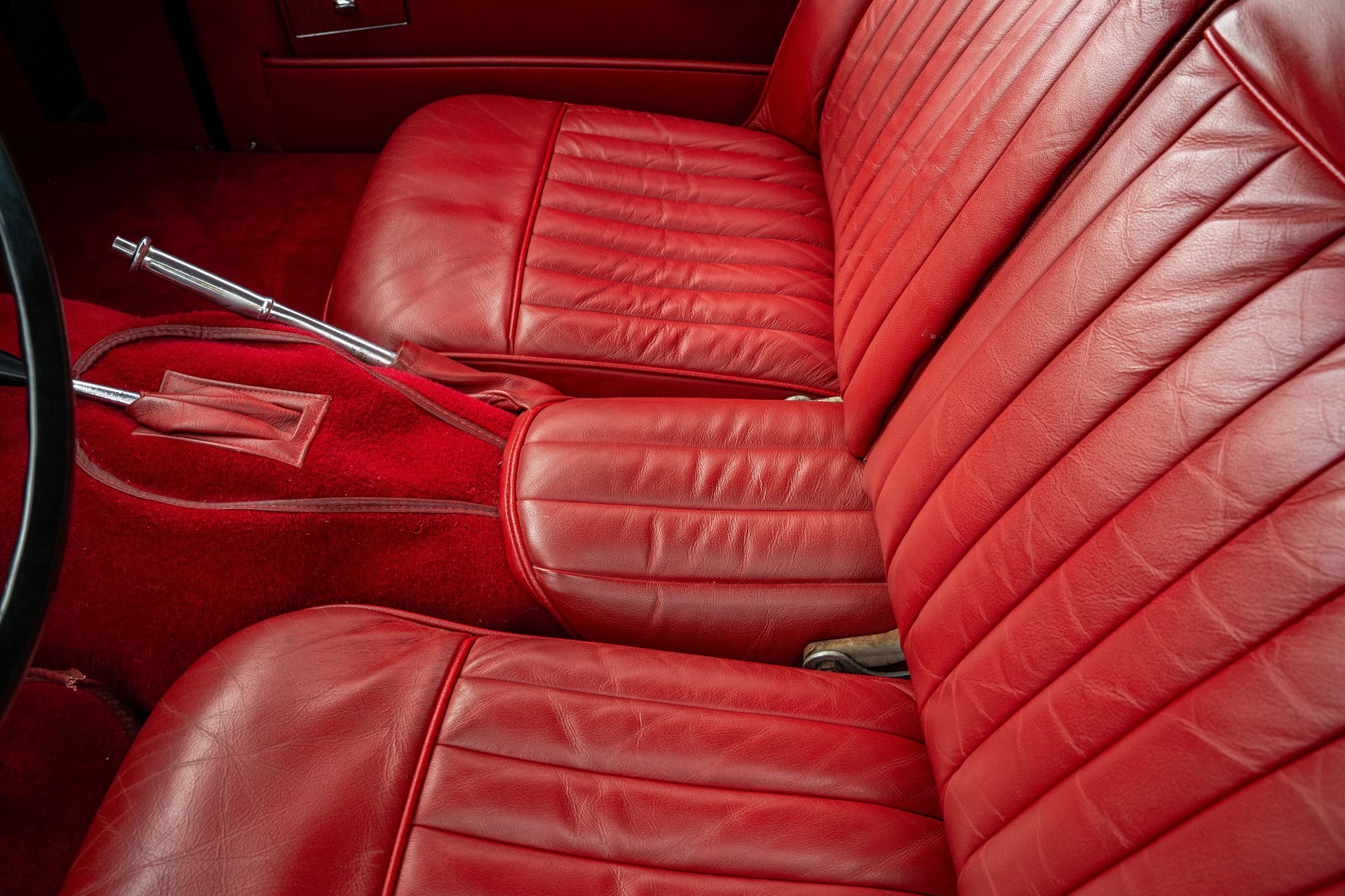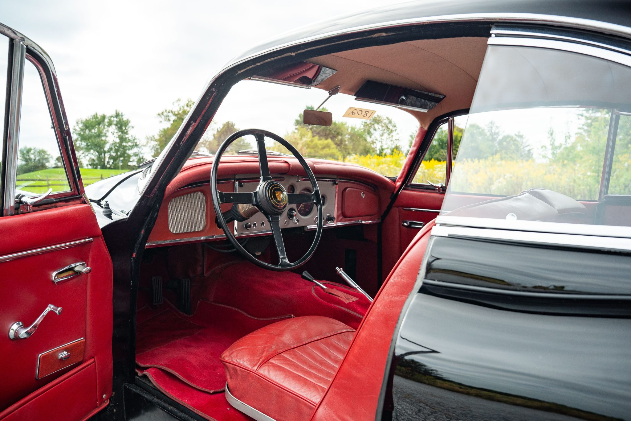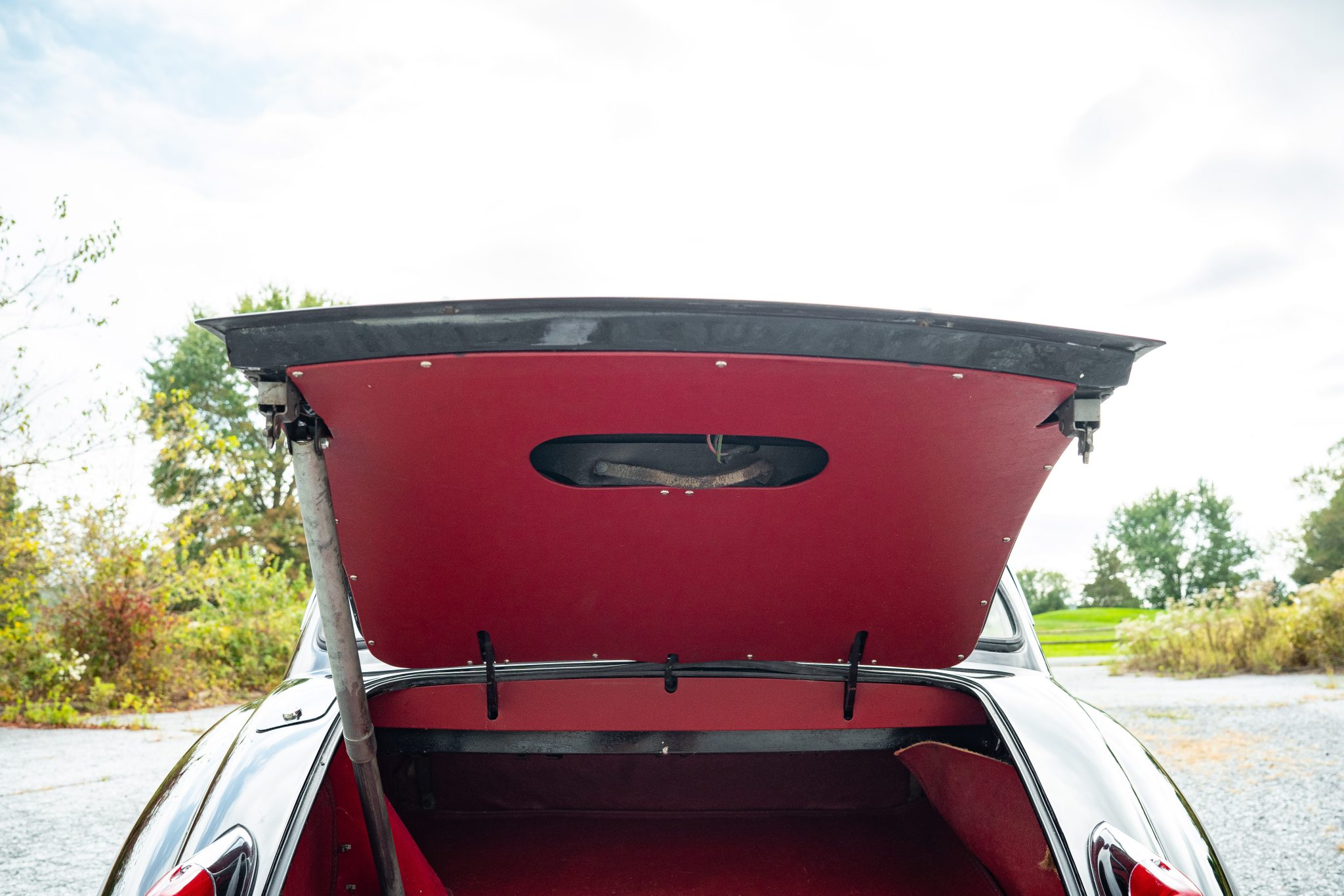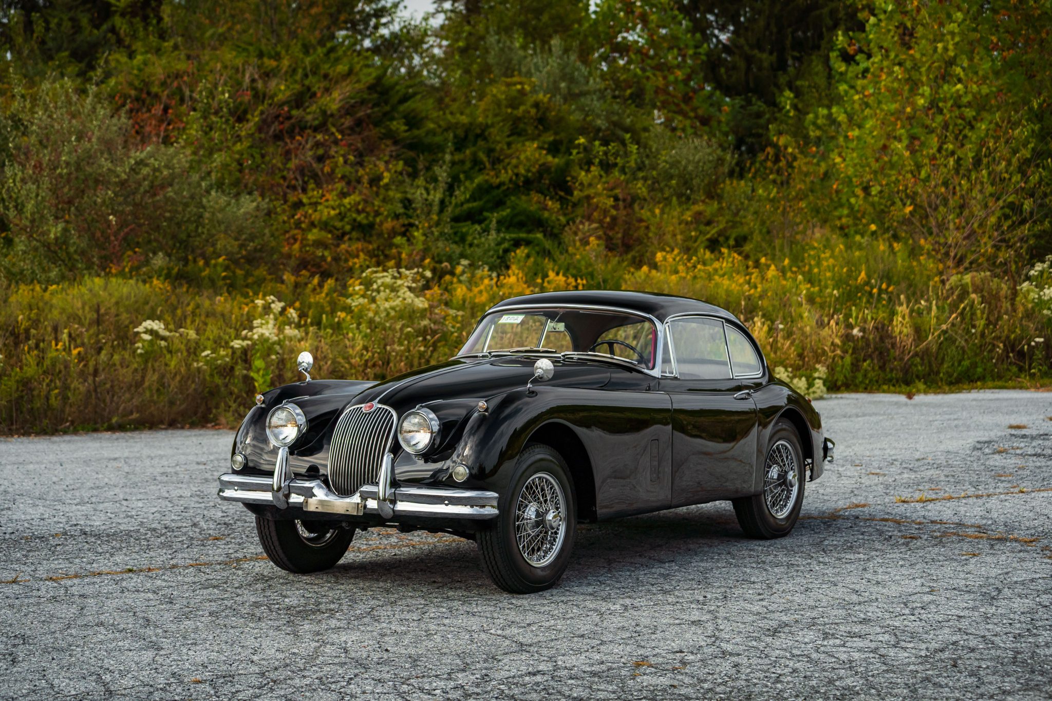 This 1958 Jaguar XK150 fixed-head coupe was refurbished which involved installing a rebuilt 3.8-liter inline-six and replacing the four-speed manual transmission in addition to repainting the black exterior, refreshing the red leather interior, installing a twin-exit exhaust system, and overhauling the brakes and suspension. Equipment includes 16″ knock-off wire wheels, disc brakes, dual SU carburetors, an aluminum radiator, and dual exhaust outlets.