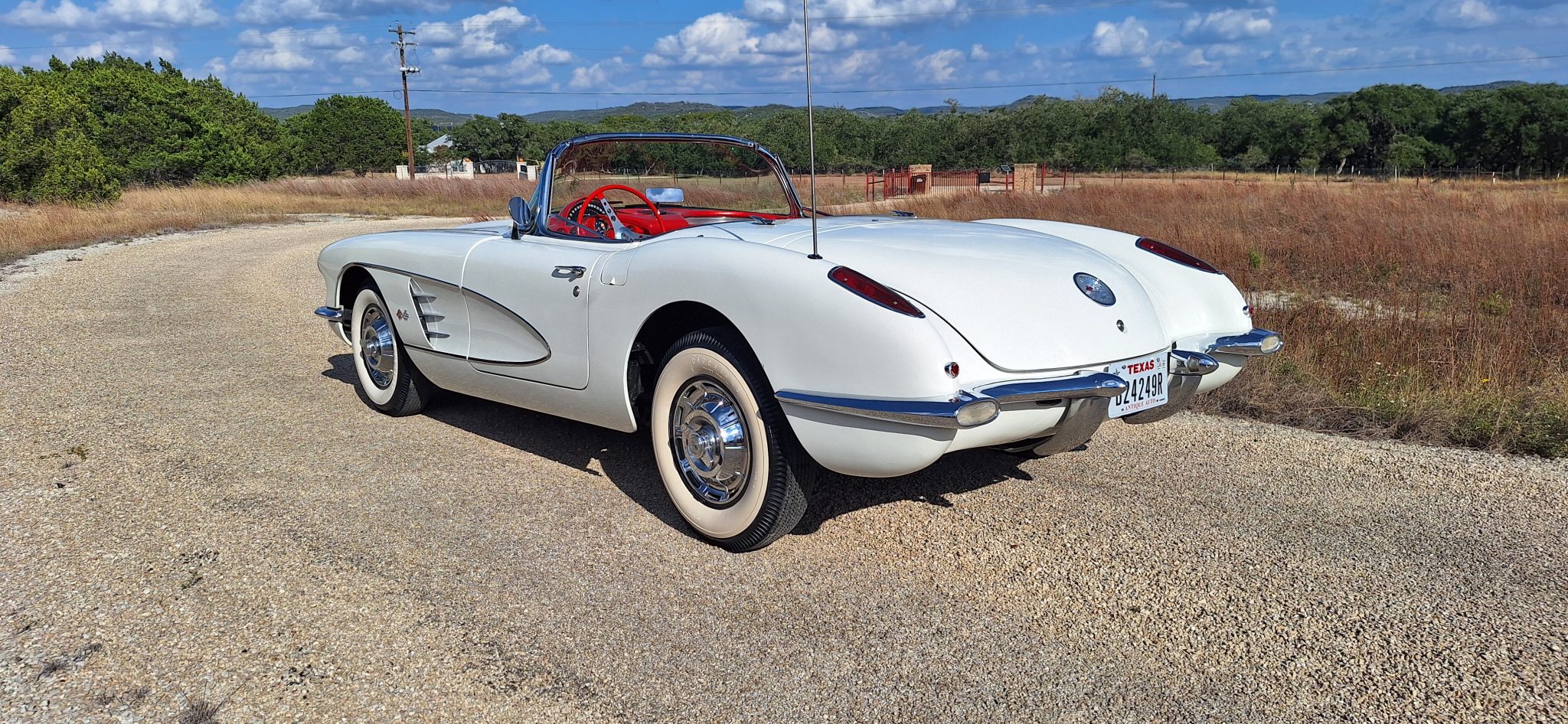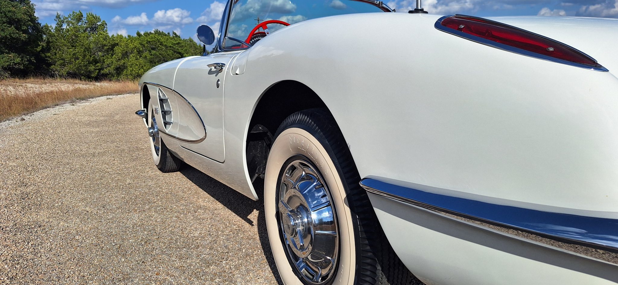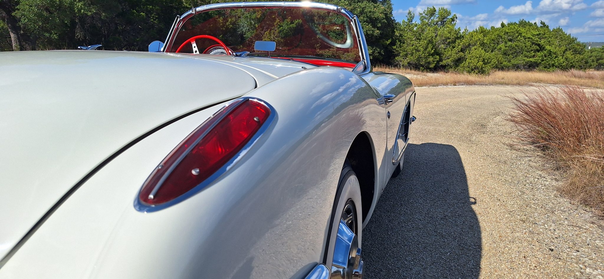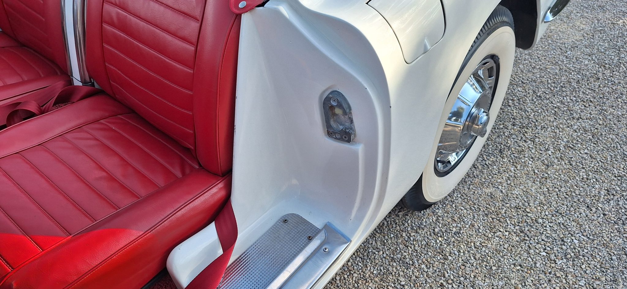 Power is provided by a replacement 283ci V8 linked with a four-speed manual transmission and a Dana 60 rear end. The was refinished white with silver coves in the 1980s. The interior is trimmed in red, and additional features include a removable body-color hardtop, 15″ steel wheels, lap belts, an aftermarket radio, and a dash-mounted rearview mirror.