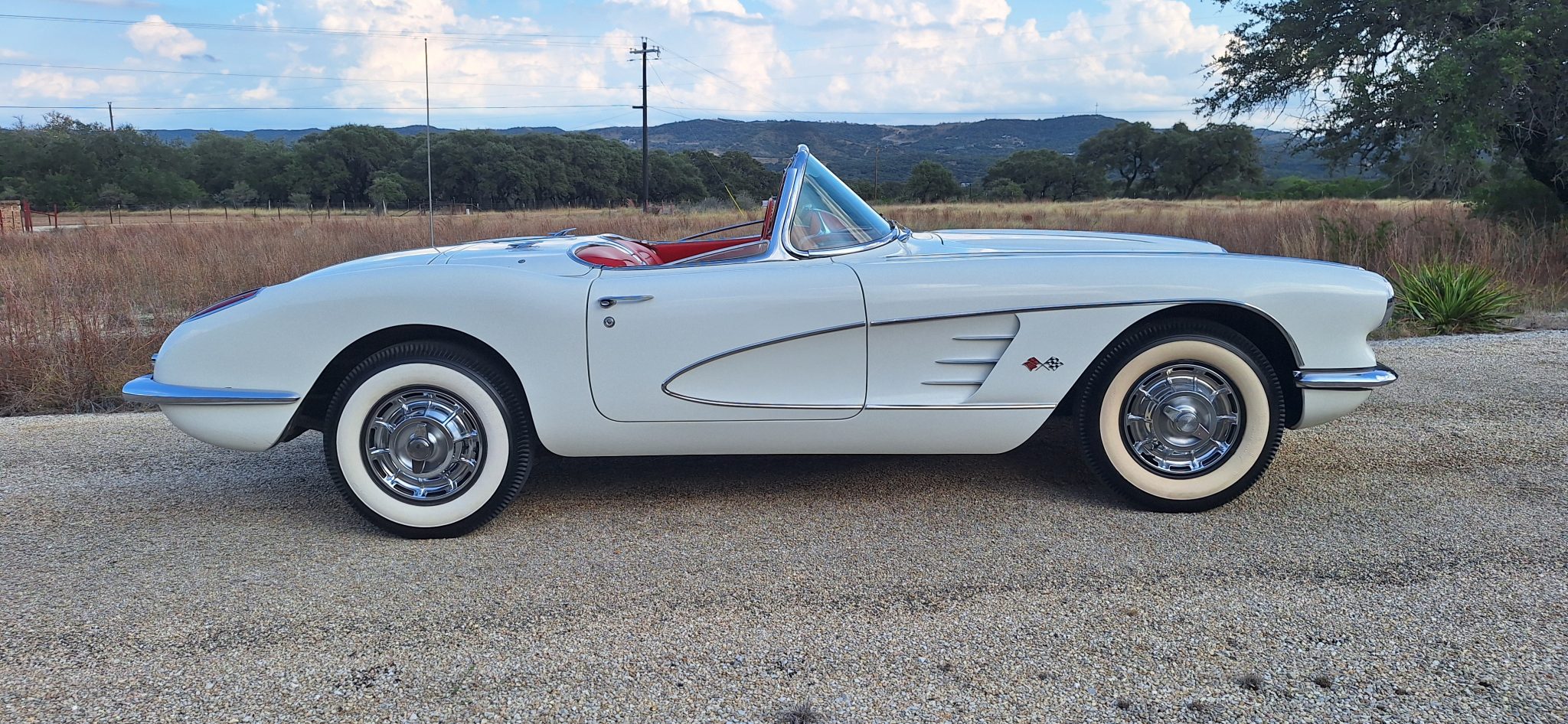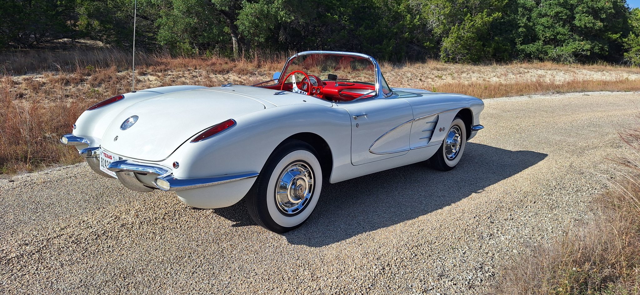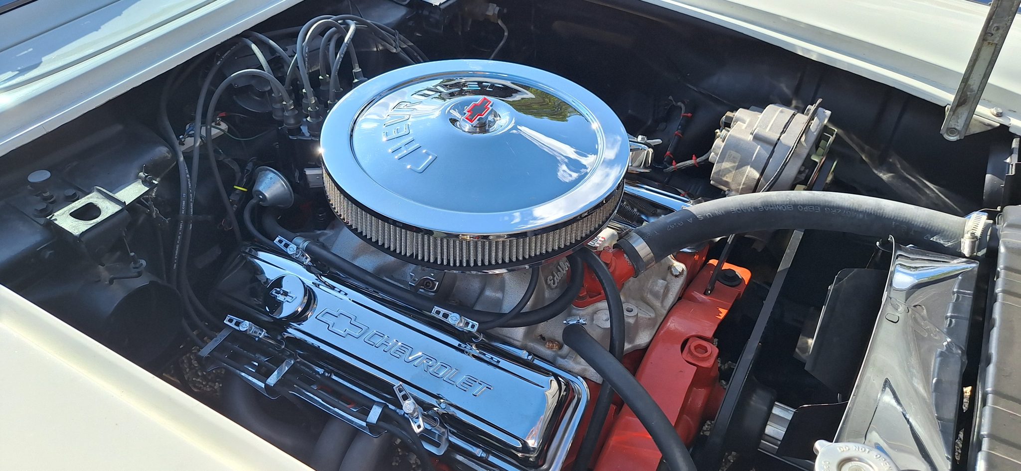 Power is provided by a replacement 283ci V8 linked with a four-speed manual transmission and a Dana 60 rear end. The was refinished white with silver coves in the 1980s. The interior is trimmed in red, and additional features include a removable body-color hardtop, 15″ steel wheels, lap belts, an aftermarket radio, and a dash-mounted rearview mirror.