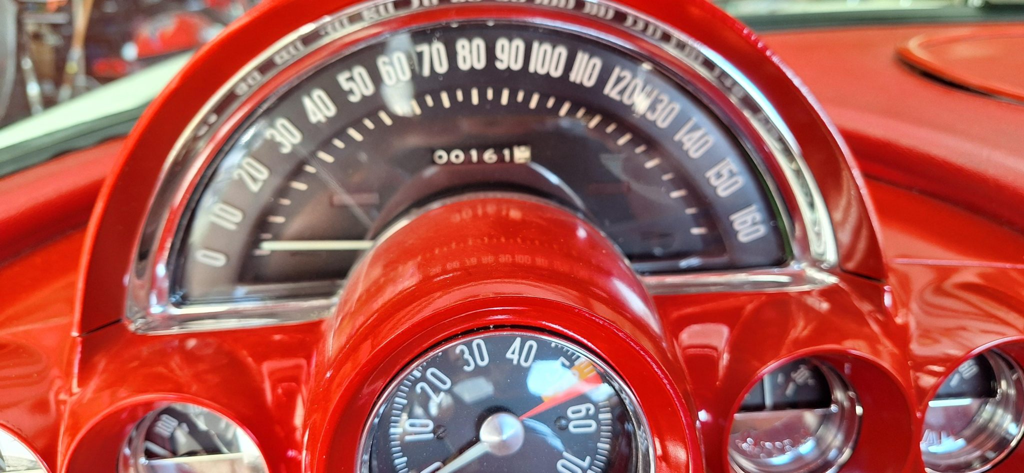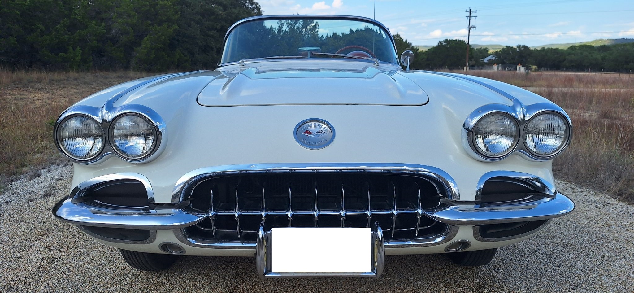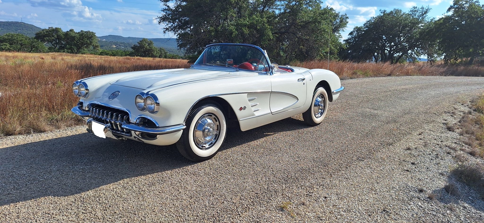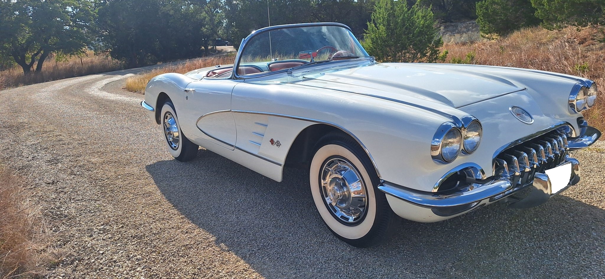 Power is provided by a replacement 283ci V8 linked with a four-speed manual transmission and a Dana 60 rear end. The was refinished white with silver coves in the 1980s. The interior is trimmed in red, and additional features include a removable body-color hardtop, 15″ steel wheels, lap belts, an aftermarket radio, and a dash-mounted rearview mirror.