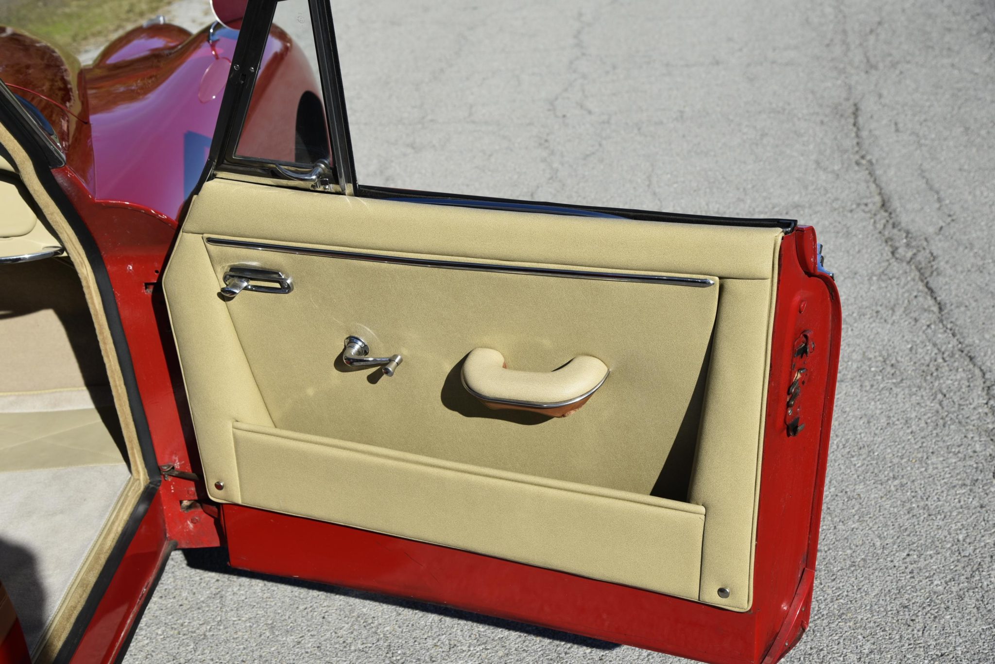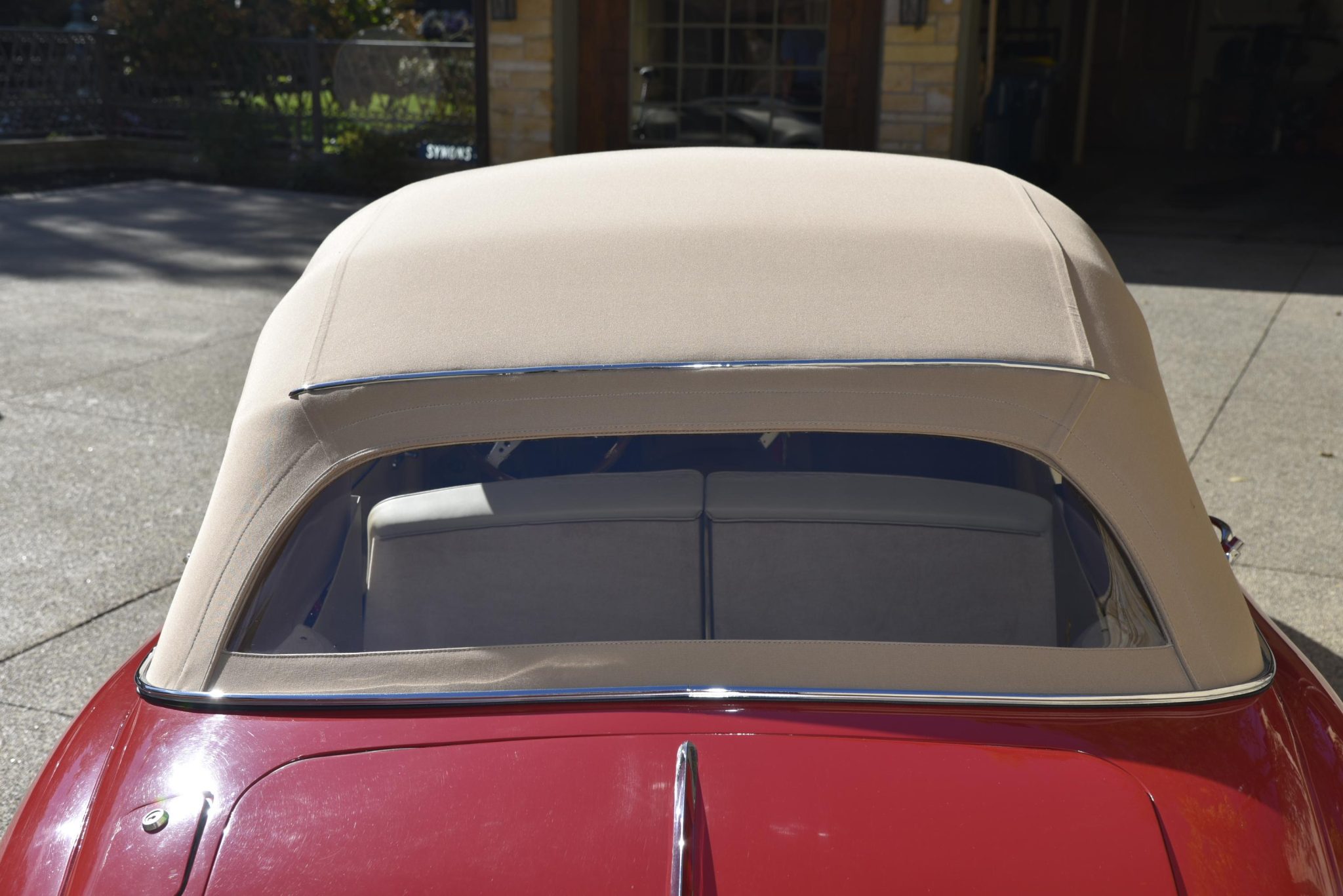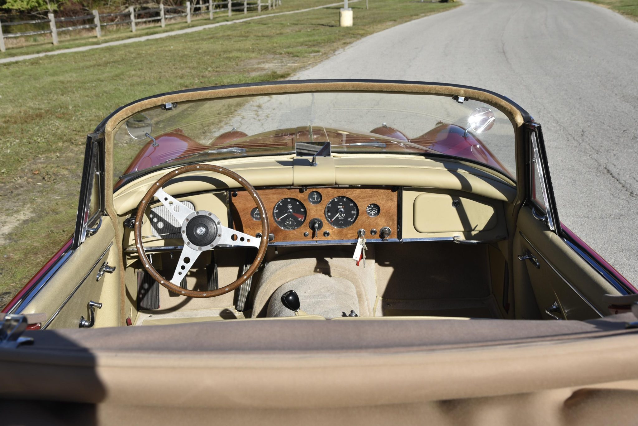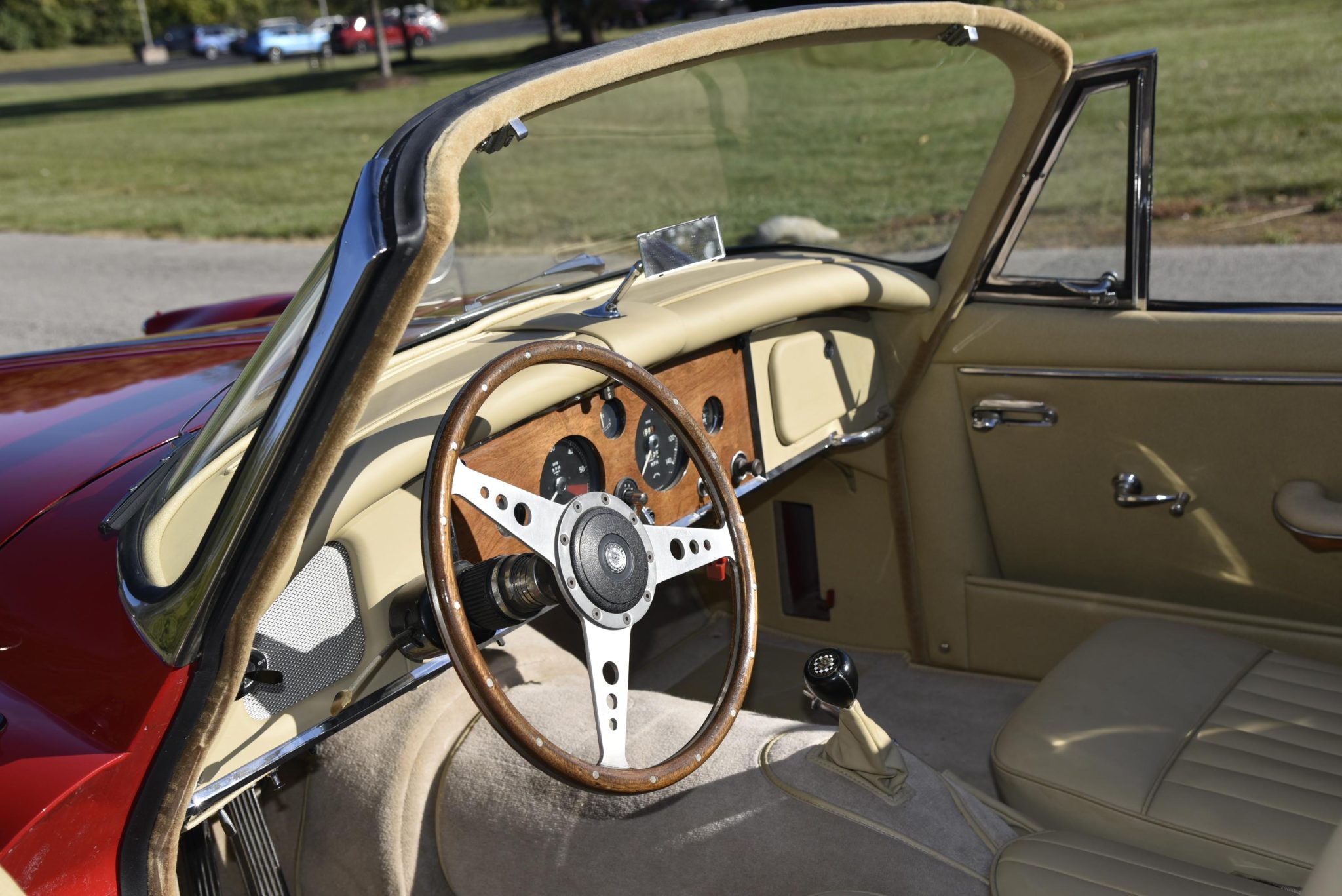 Powered by a 3.4-liter inline-six paired with a four-speed manual transmission with overdrive, the car features a Sand soft top, 16″ knock-off wire wheels, four-wheel disc brakes, dual SU carburetors, driving lights, a Moto-Lita steering wheel, and lap belts.