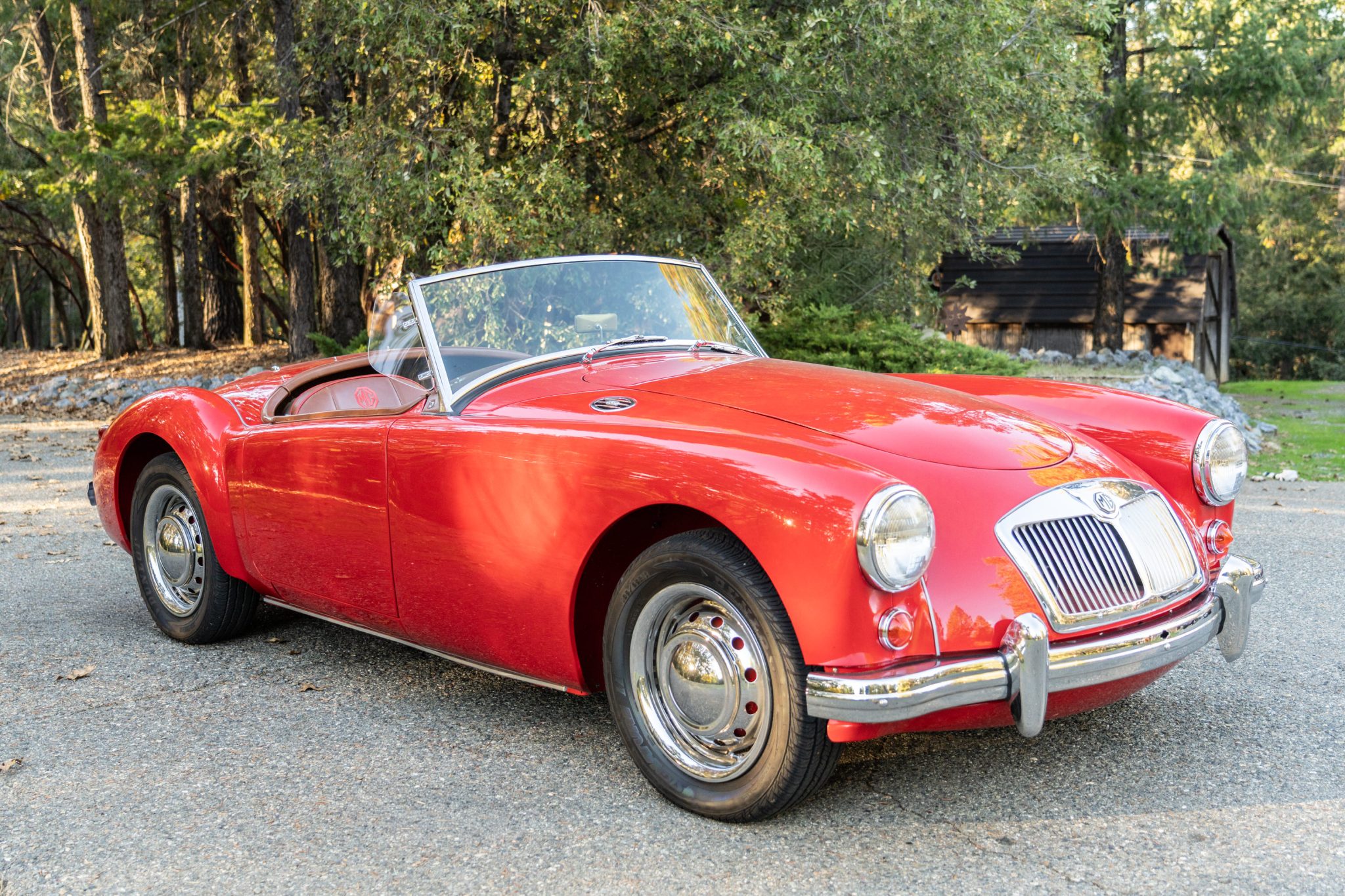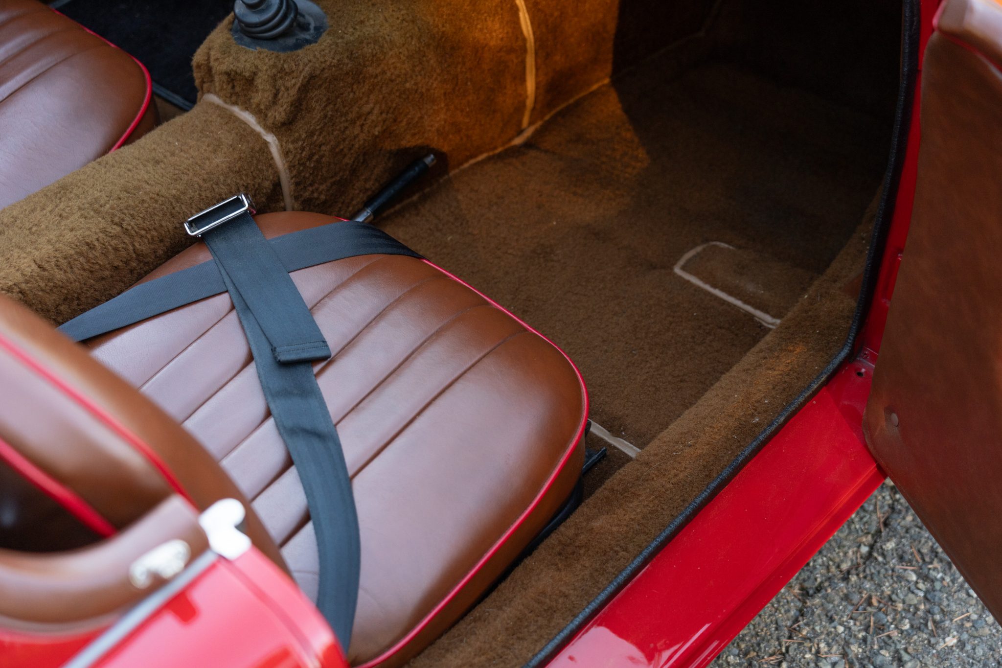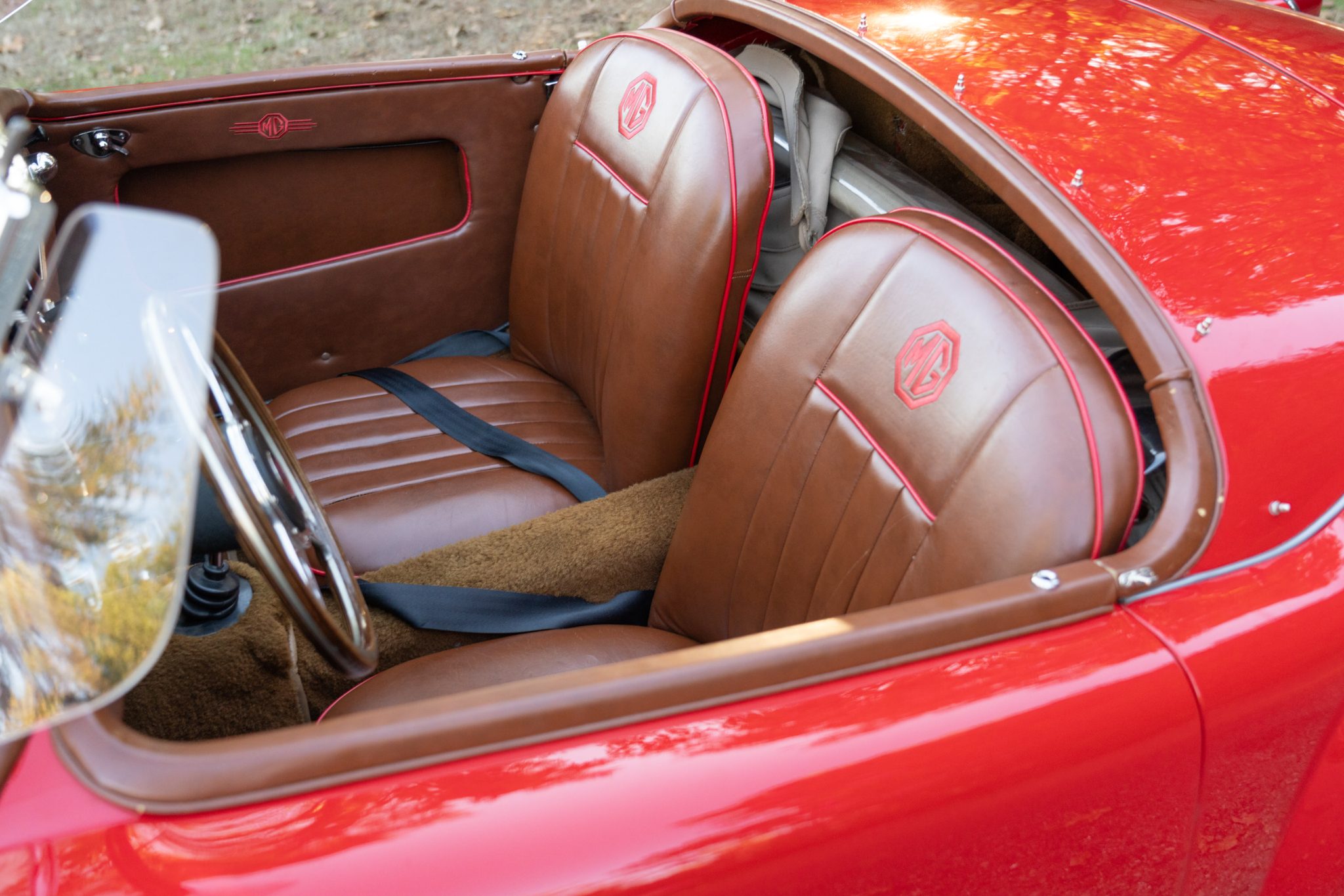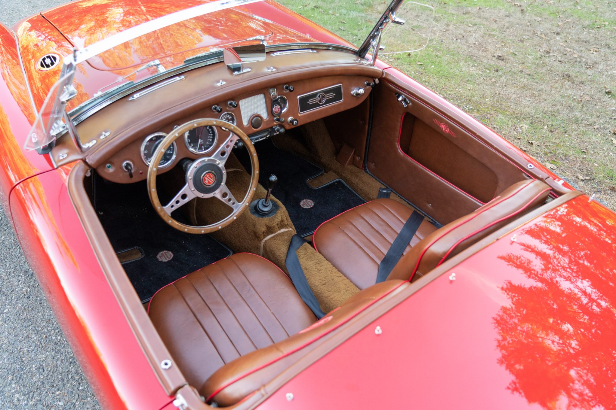 The car has been repainted in red, and the interior was retrimmed in brown vinyl with red piping. The 1.5-liter inline-four has been bored .060″ over and is linked to a four-speed manual transmission. Equipment includes a tan Stayfast soft top, a cockpit tonneau cover, wind wings, 15″ steel wheels, hubcaps, drum brakes, dual SU carburetors, PerTronix electronic ignition, a Moto-Lita wood-rimmed steering wheel, lap belts, and Speedhut gauges.