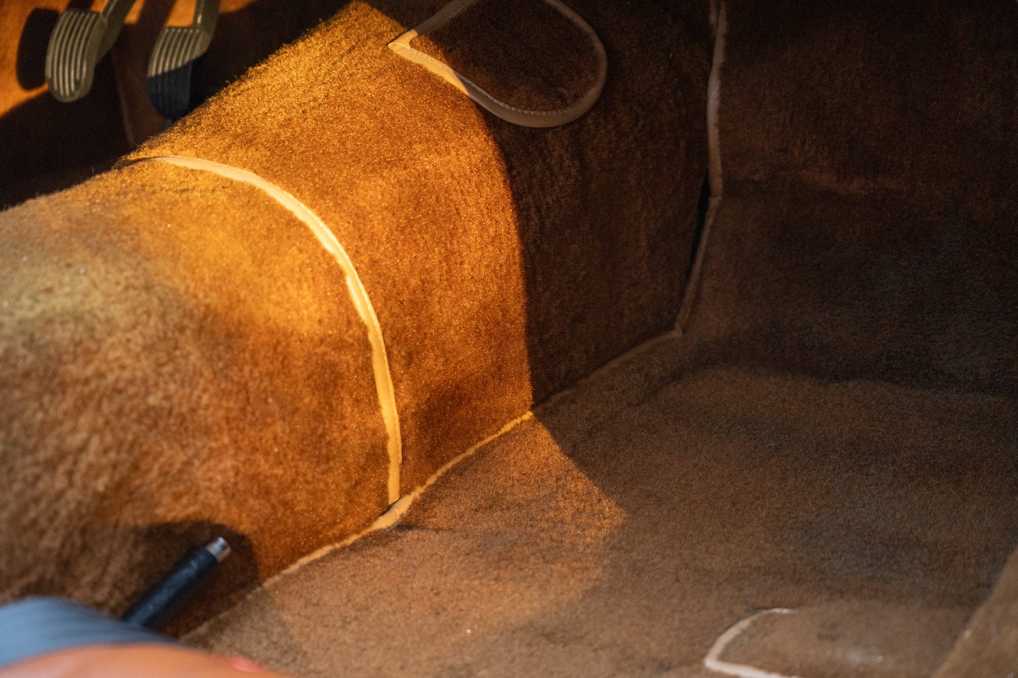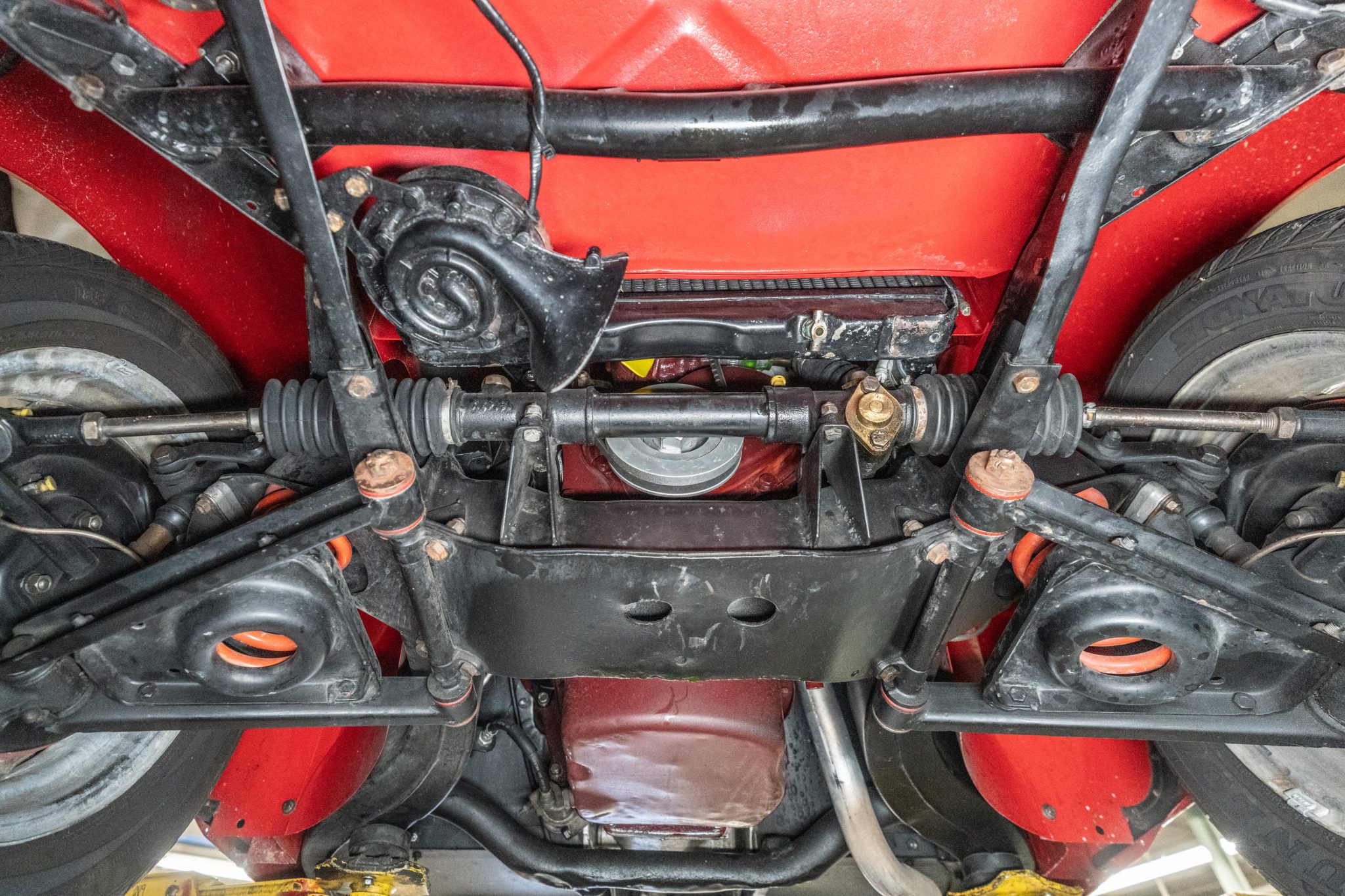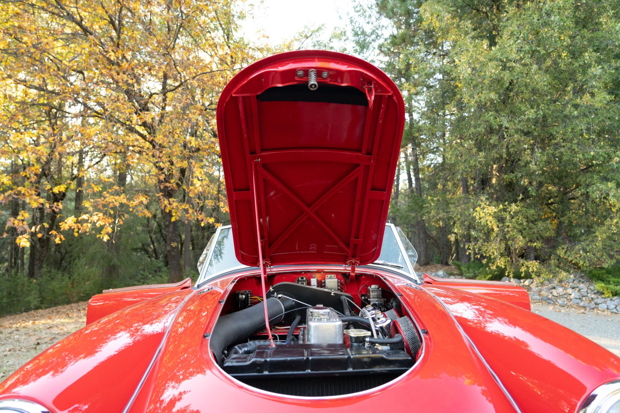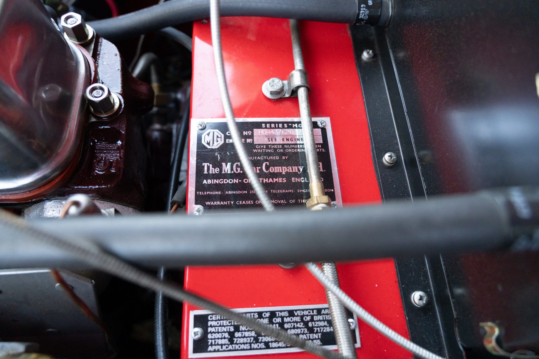 The car has been repainted in red, and the interior was retrimmed in brown vinyl with red piping. The 1.5-liter inline-four has been bored .060″ over and is linked to a four-speed manual transmission. Equipment includes a tan Stayfast soft top, a cockpit tonneau cover, wind wings, 15″ steel wheels, hubcaps, drum brakes, dual SU carburetors, PerTronix electronic ignition, a Moto-Lita wood-rimmed steering wheel, lap belts, and Speedhut gauges.