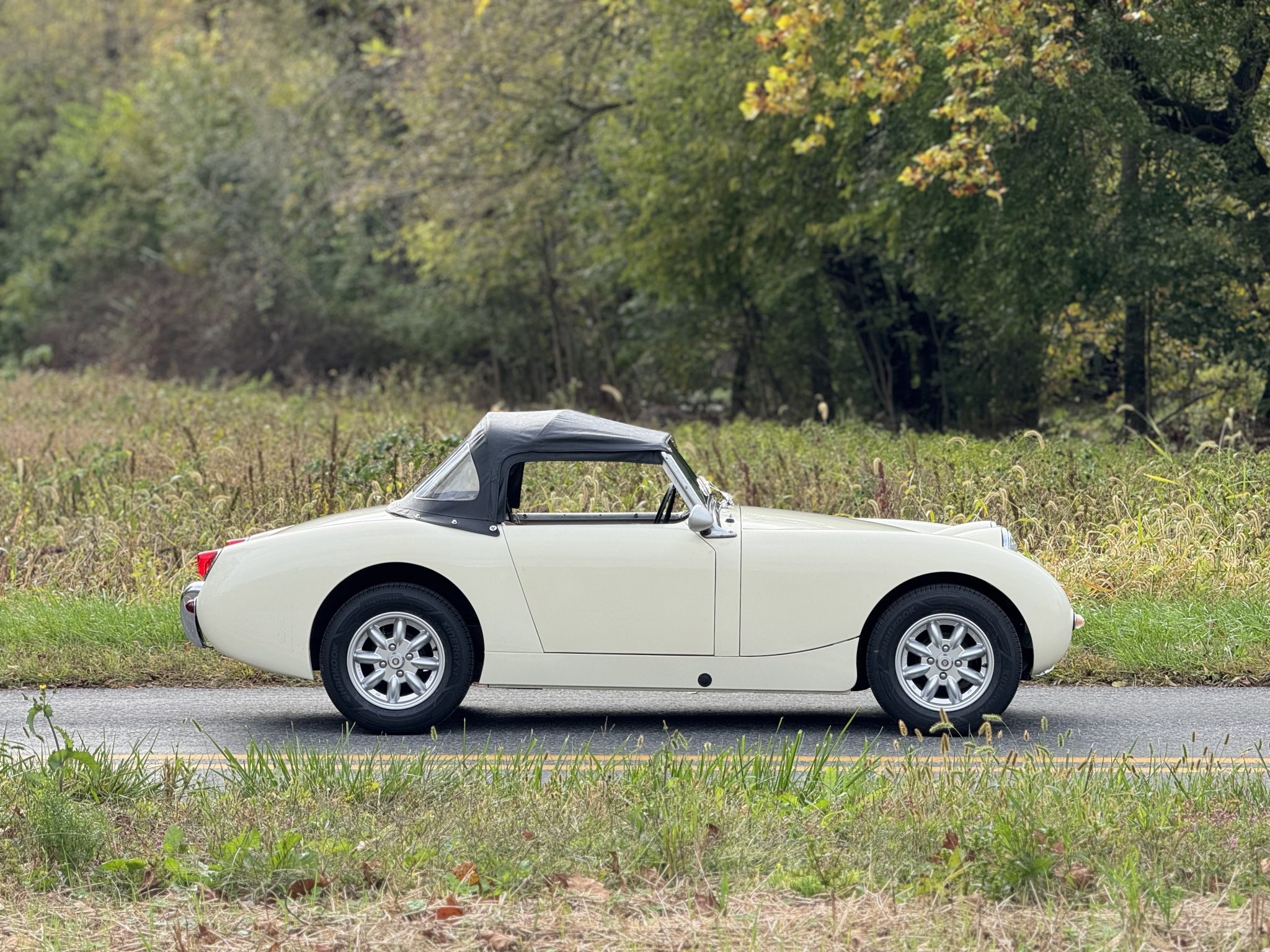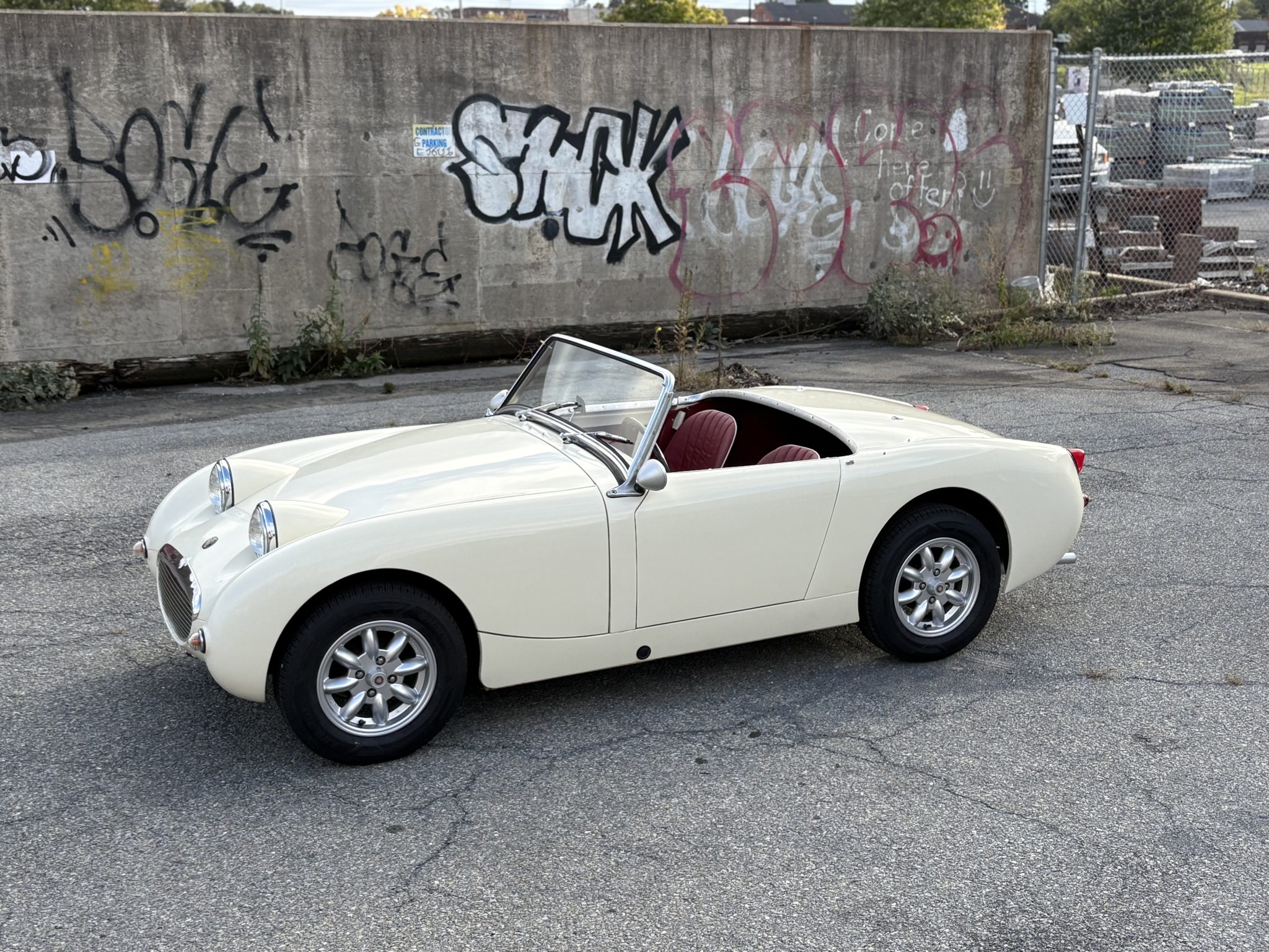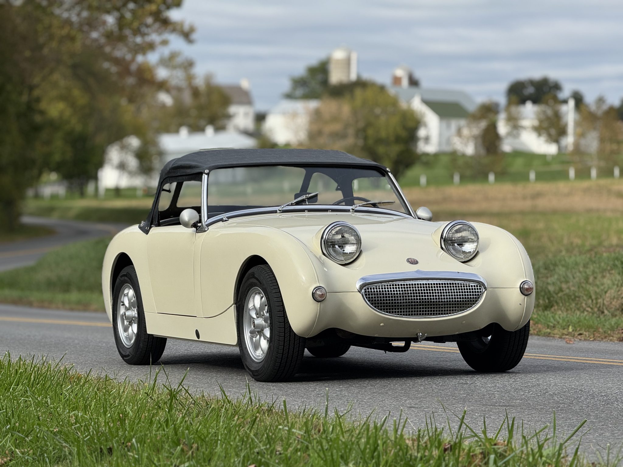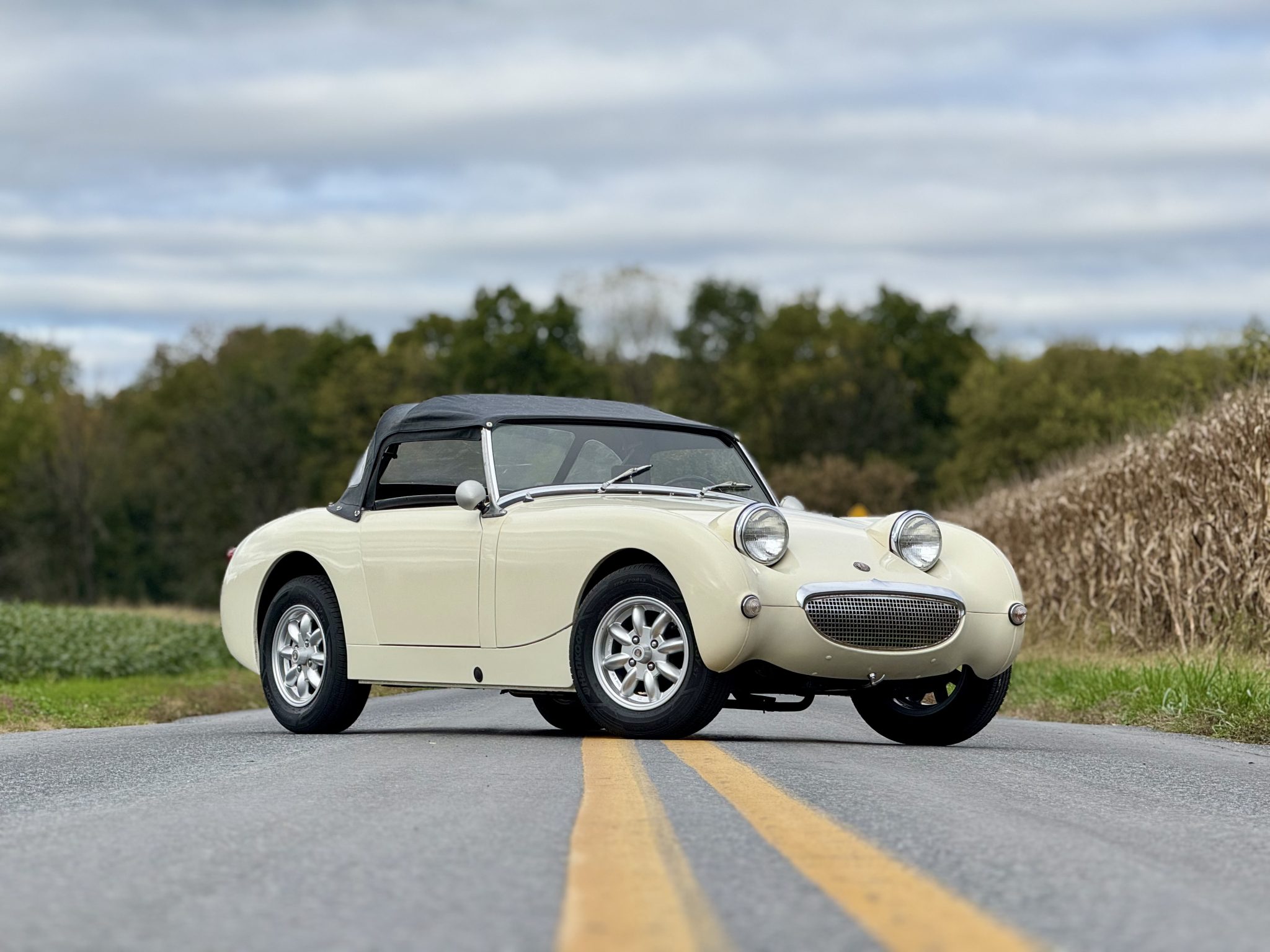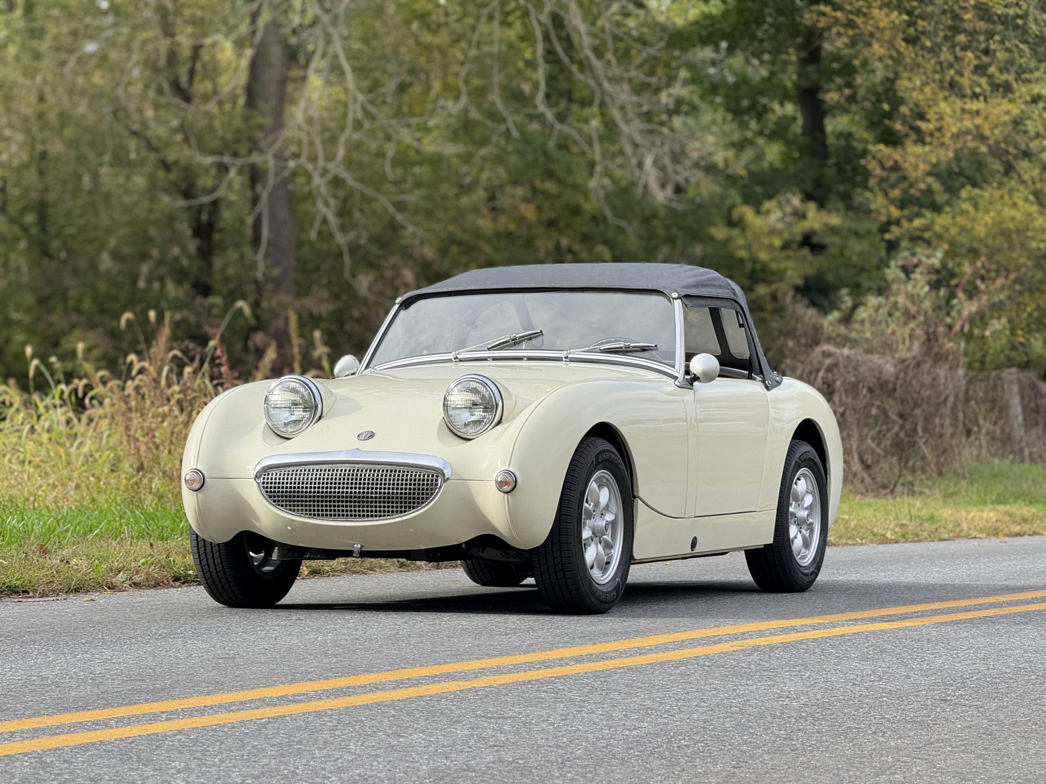 This 1960 Austin-Healey Bugeye Sprite is powered by a Judson-supercharged 948cc inline-four, and it was refinished in Old English White during a circa-2005 refurbishment. The cabin was reupholstered in red vinyl with white accents at that time, and the car also features a four-speed manual transmission, a black soft top, side curtains, 13″ Minator wheels, drum brakes, three-point seatbelts, and Smiths instrumentation.