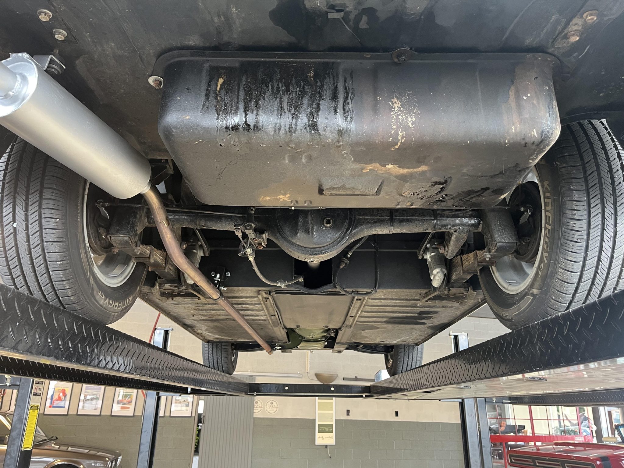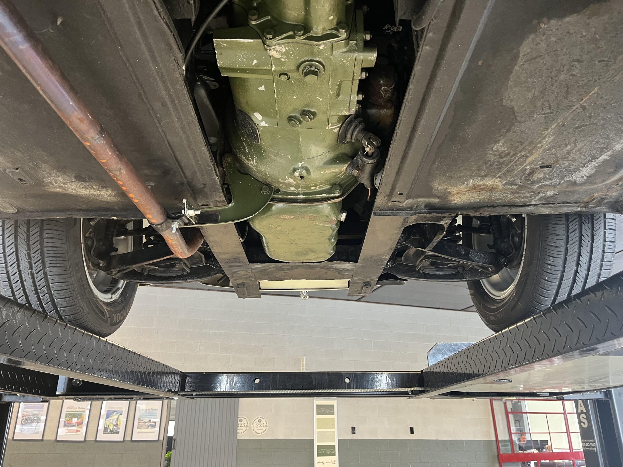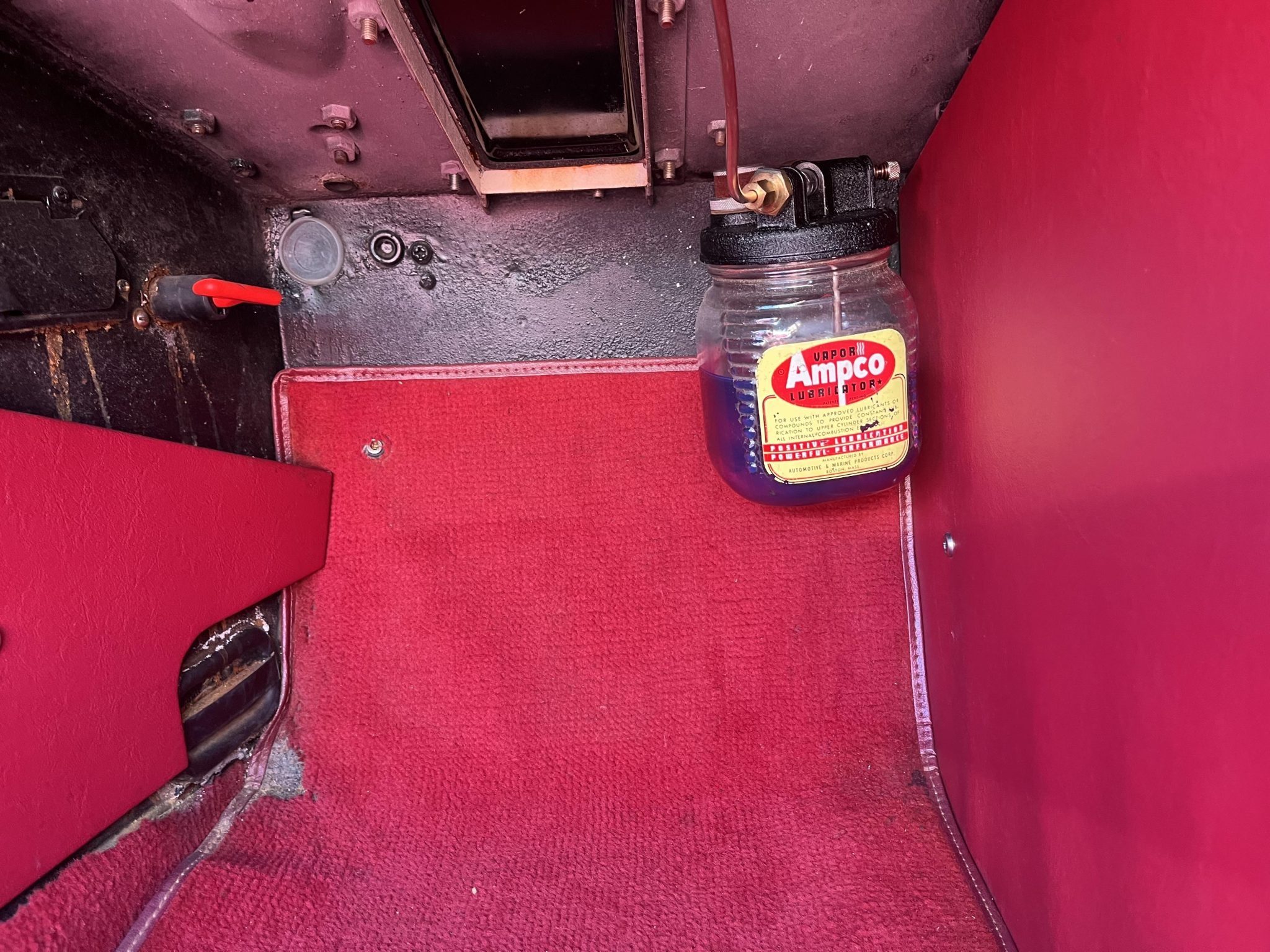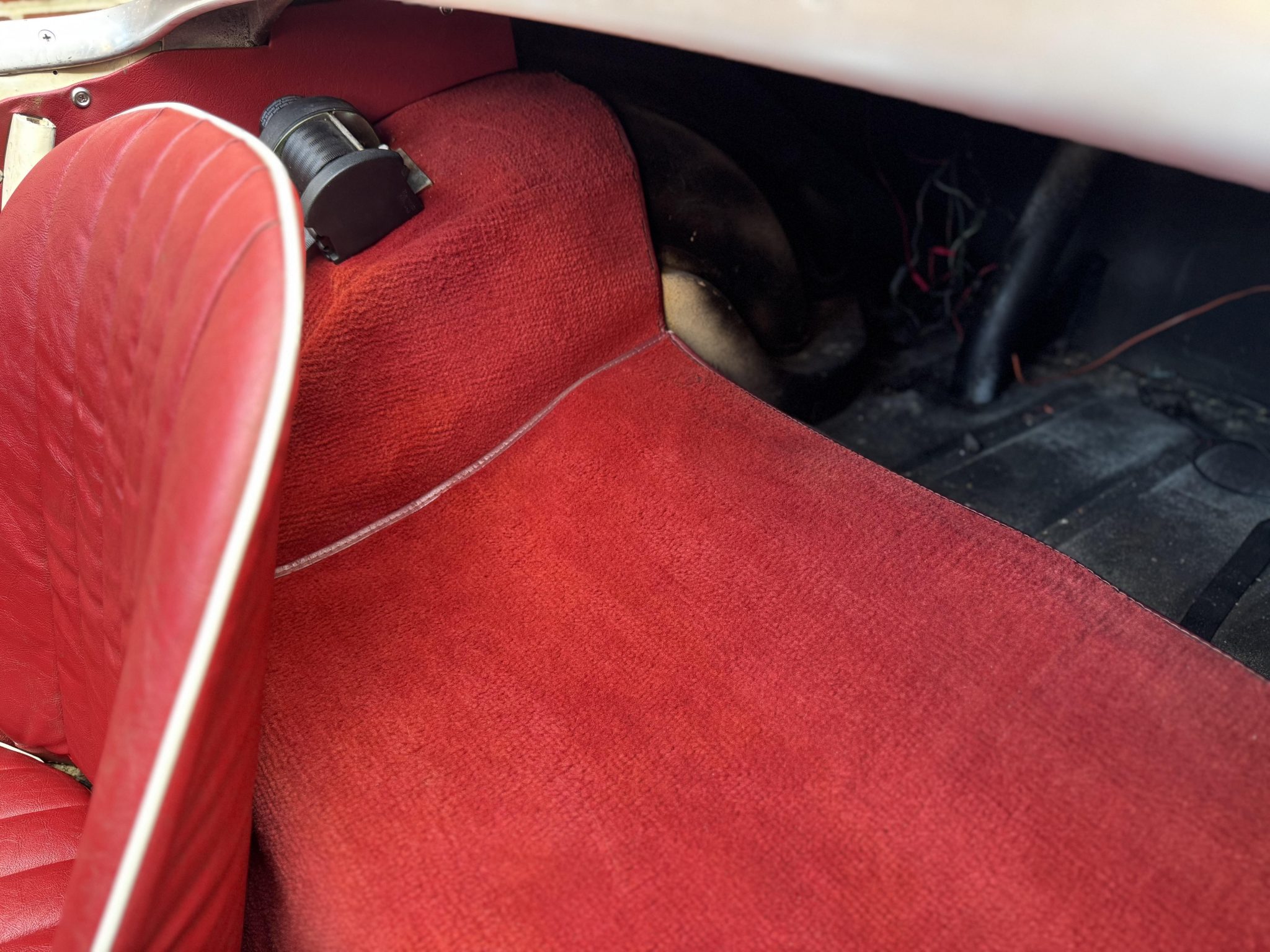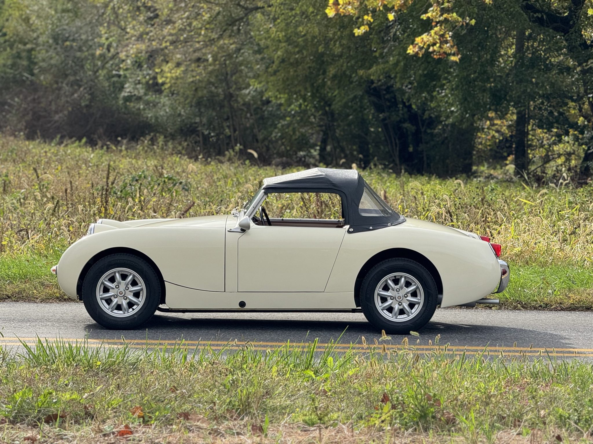 This 1960 Austin-Healey Bugeye Sprite is powered by a Judson-supercharged 948cc inline-four, and it was refinished in Old English White during a circa-2005 refurbishment. The cabin was reupholstered in red vinyl with white accents at that time, and the car also features a four-speed manual transmission, a black soft top, side curtains, 13″ Minator wheels, drum brakes, three-point seatbelts, and Smiths instrumentation.