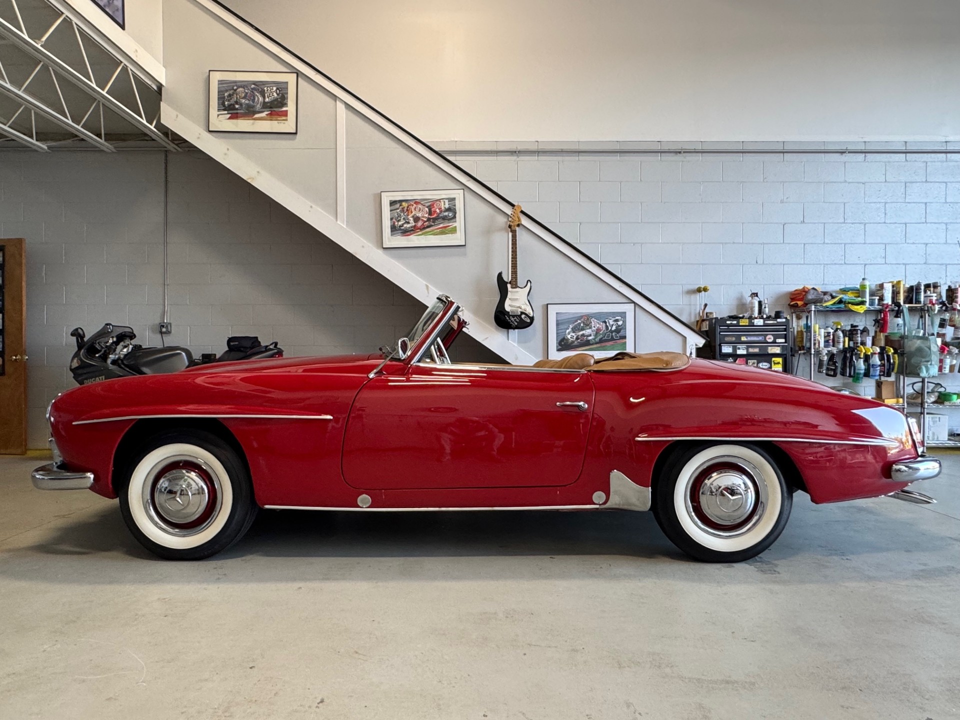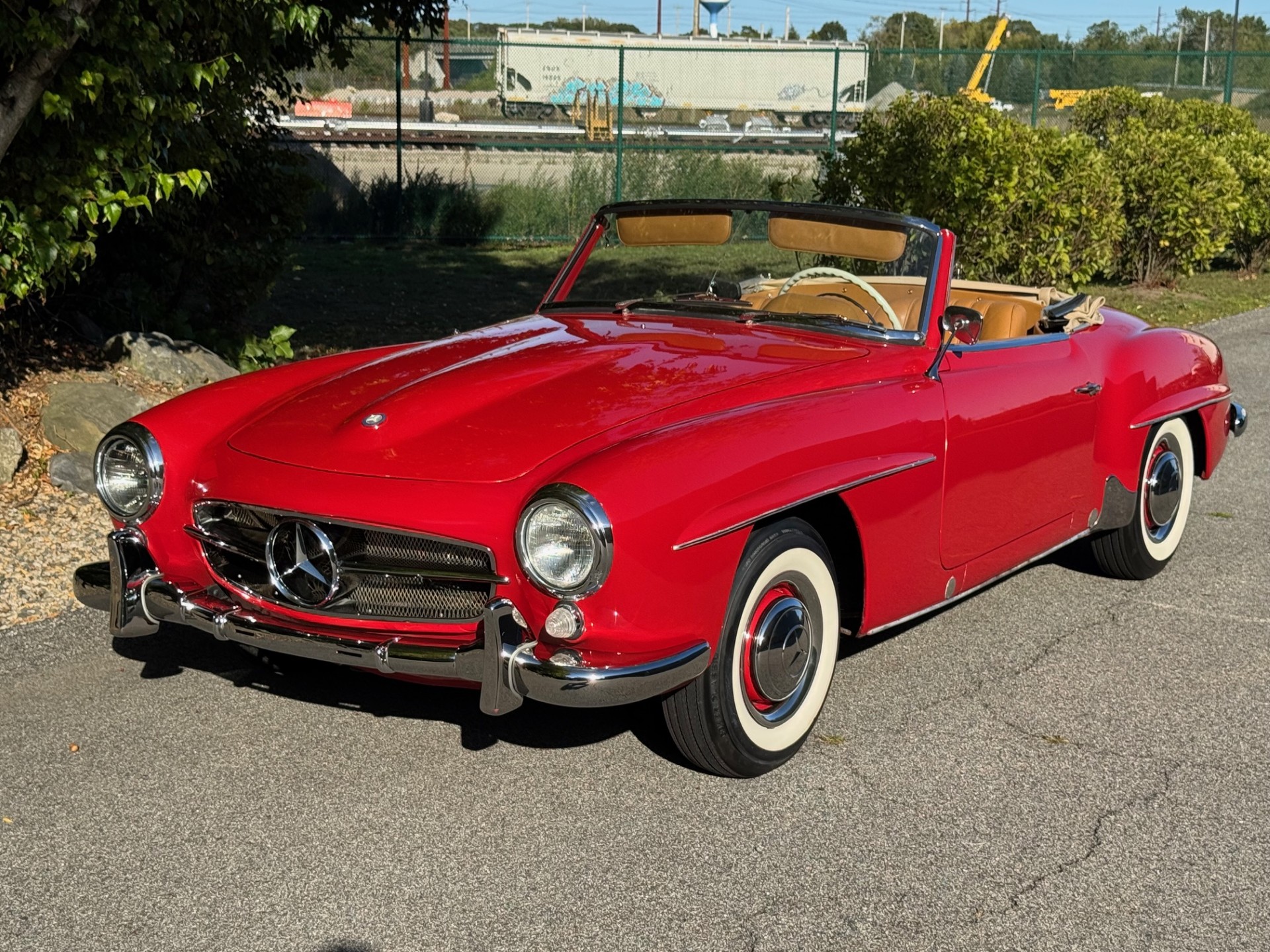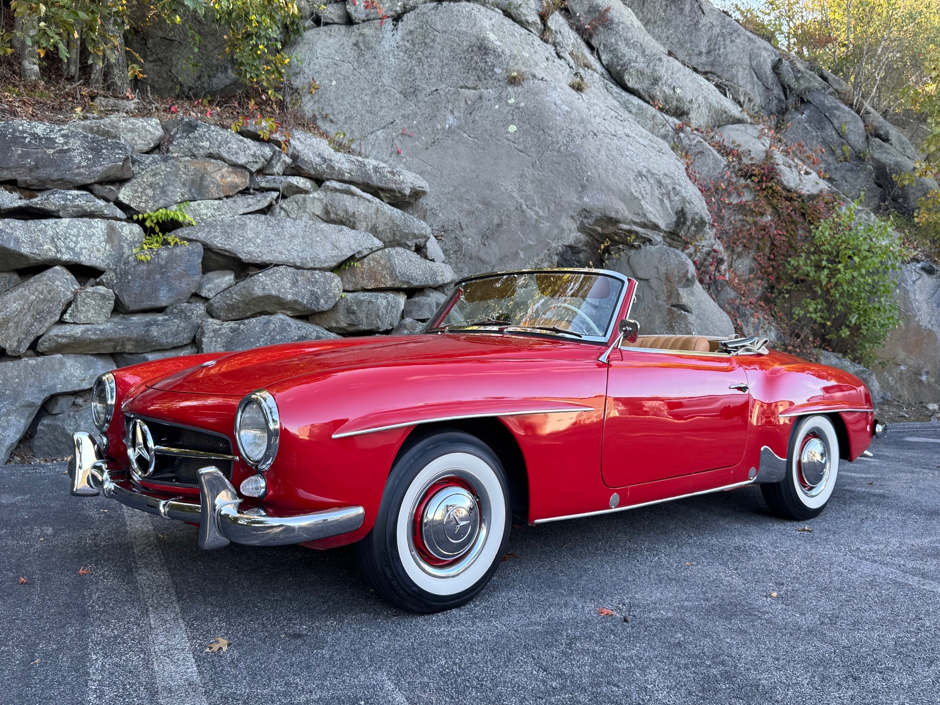 This 1960 Mercedes-Benz 190SL is finished in red over Natural leather and is powered by a 1.9-liter inline-four paired with a four-speed manual transmission. Equipment includes a body-color removable hardtop, a beige convertible soft top, 13″ steel wheels with body-color hubcaps, and power-assisted drum brakes.