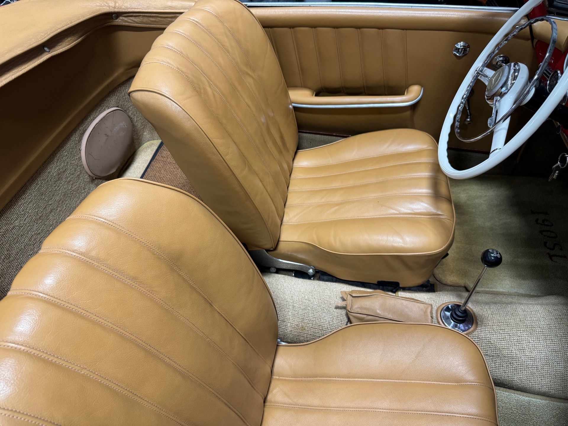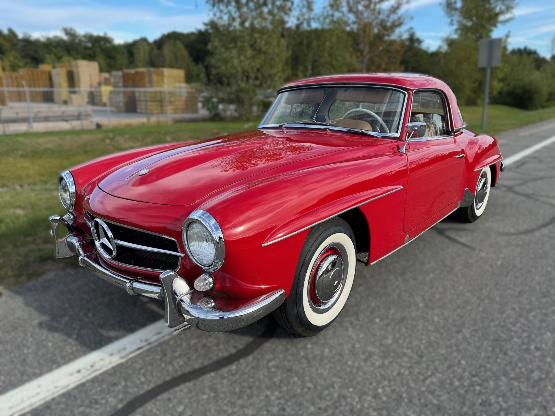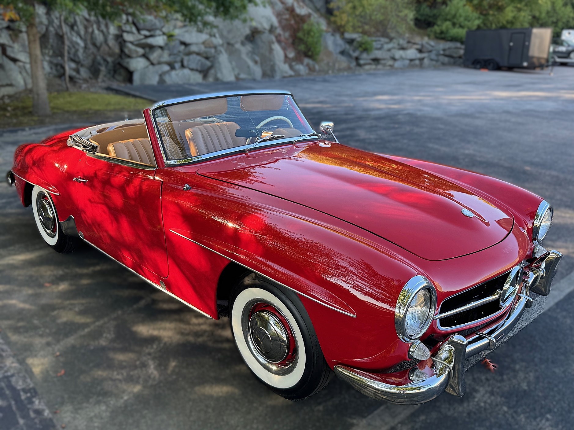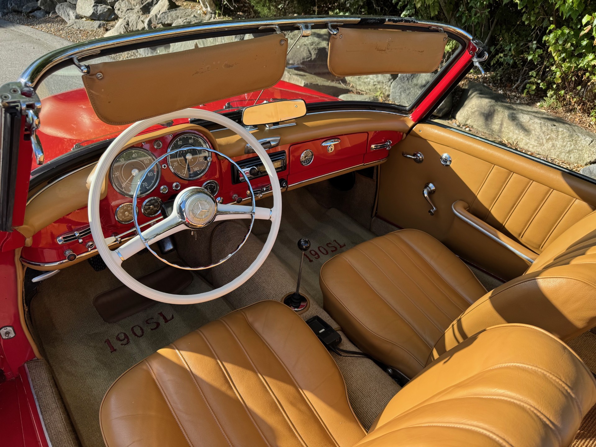 This 1960 Mercedes-Benz 190SL is finished in red over Natural leather and is powered by a 1.9-liter inline-four paired with a four-speed manual transmission. Equipment includes a body-color removable hardtop, a beige convertible soft top, 13″ steel wheels with body-color hubcaps, and power-assisted drum brakes.