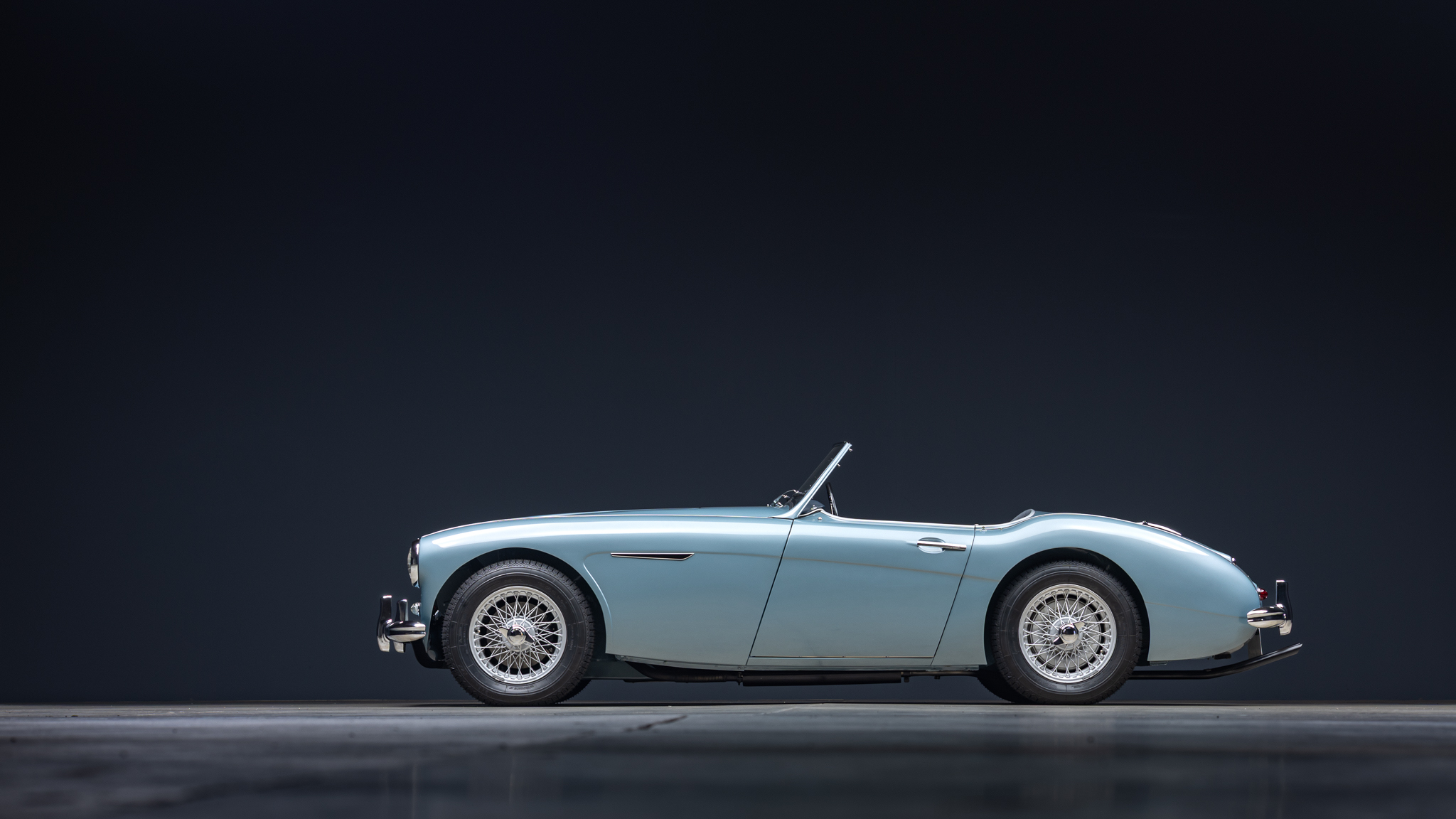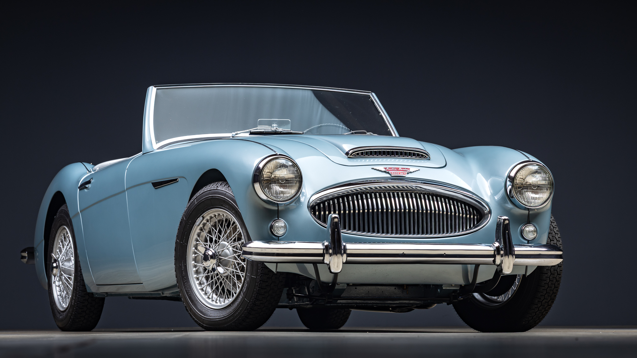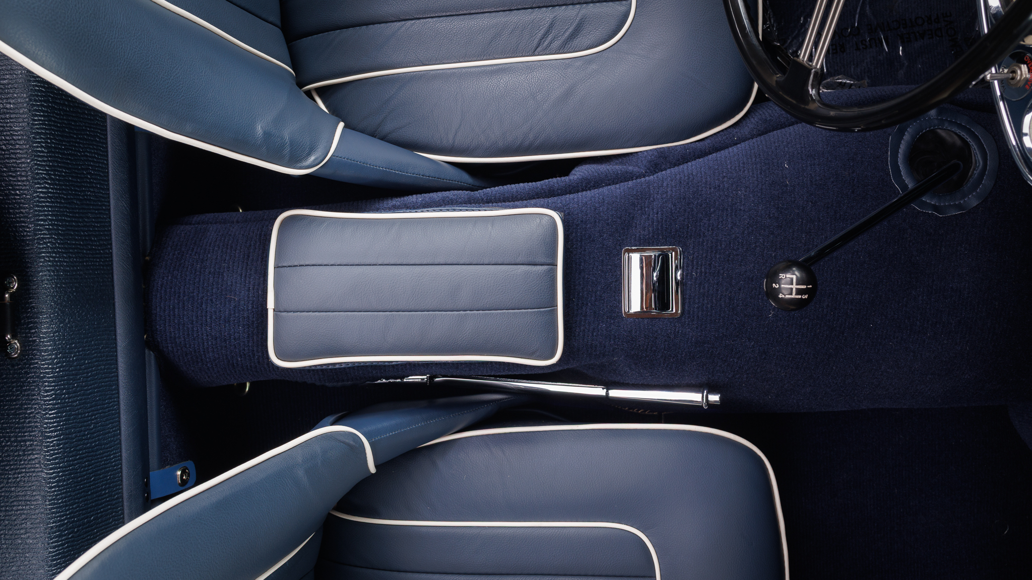 This 1962 Austin-Healey 3000 is one of a claimed 355 triple-carbureted BN7 Mk II cars built before the two-seat roadster model was discontinued in March 1962. Chassis HBN7L14047 left the factory in June 1961 finished in Healey Blue over blue leather and equipped with a 2.9-liter inline-six mated to a four-speed manual side-change gearbox with overdrive. The car features 15″ knock-off wire wheels and front disc brakes along with bucket seats and a Smiths cabin heater.