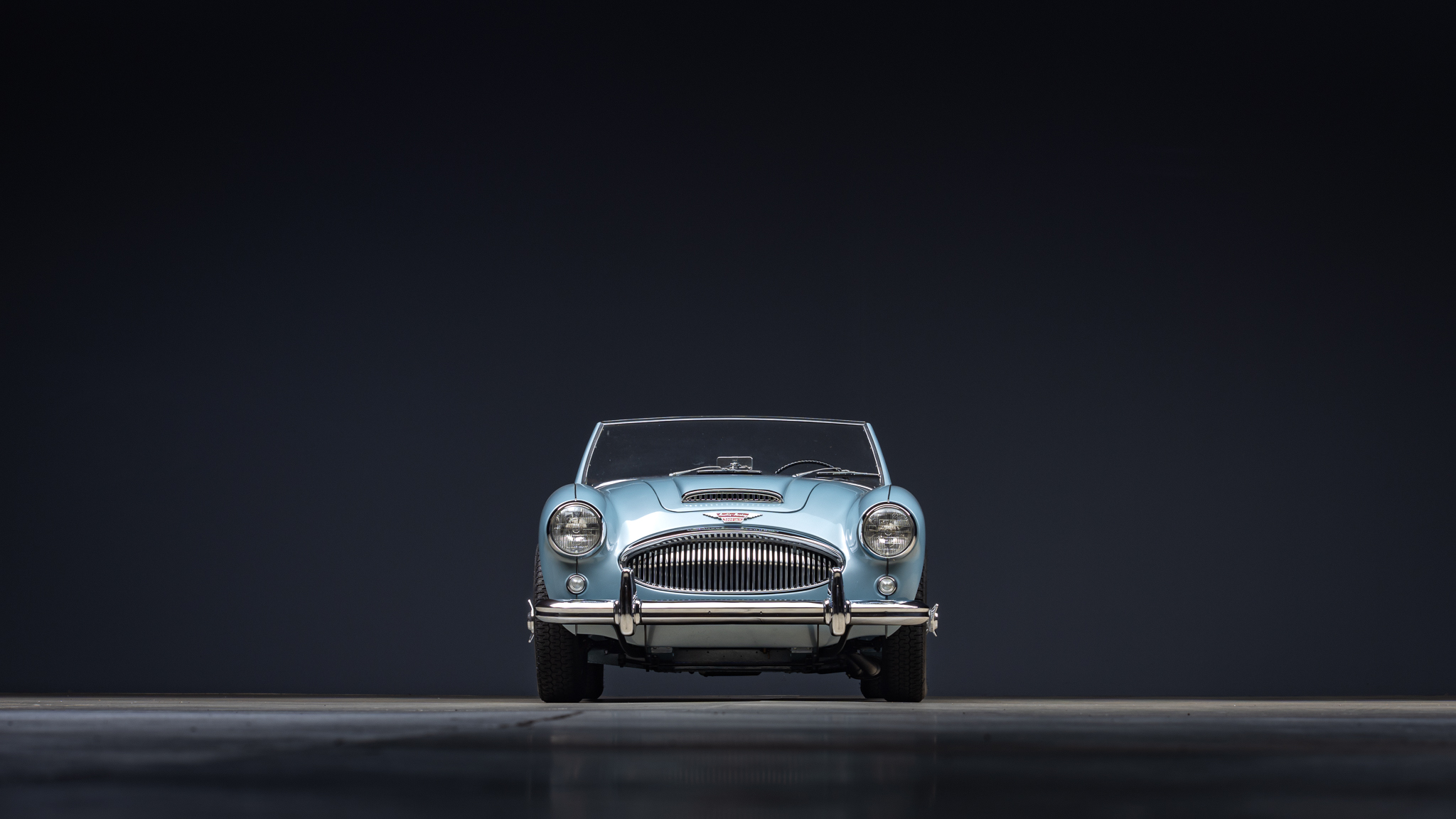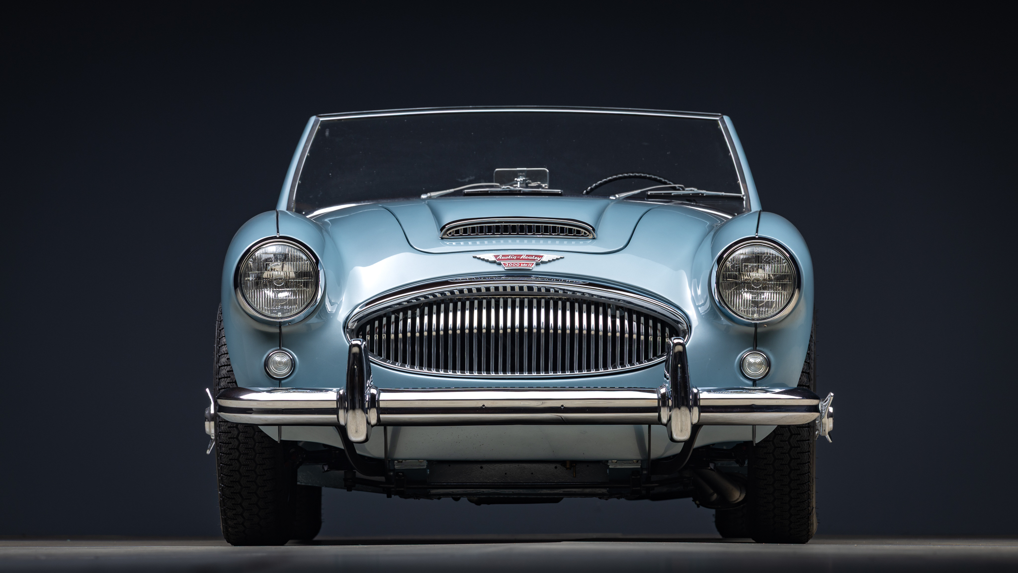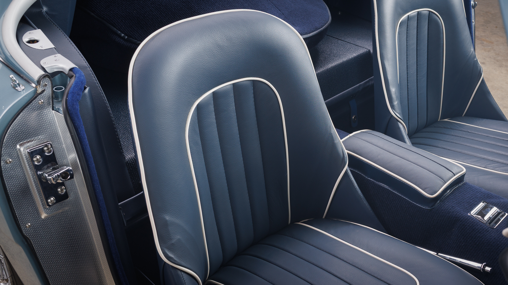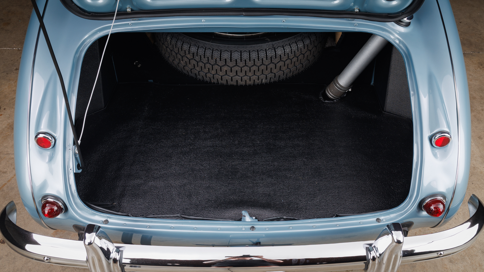 This 1962 Austin-Healey 3000 is one of a claimed 355 triple-carbureted BN7 Mk II cars built before the two-seat roadster model was discontinued in March 1962. Chassis HBN7L14047 left the factory in June 1961 finished in Healey Blue over blue leather and equipped with a 2.9-liter inline-six mated to a four-speed manual side-change gearbox with overdrive. The car features 15″ knock-off wire wheels and front disc brakes along with bucket seats and a Smiths cabin heater.