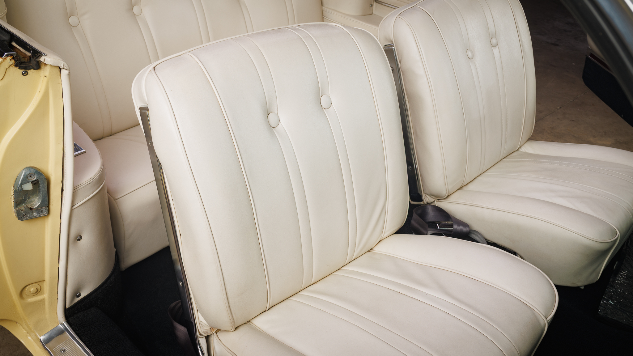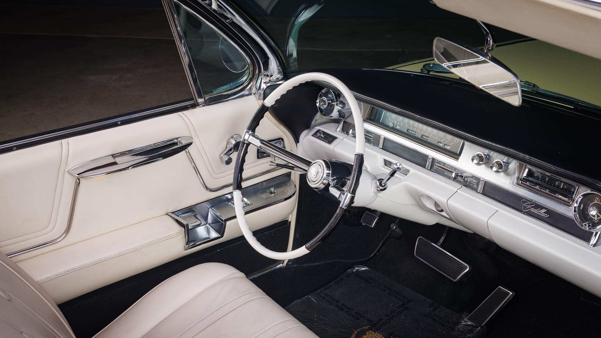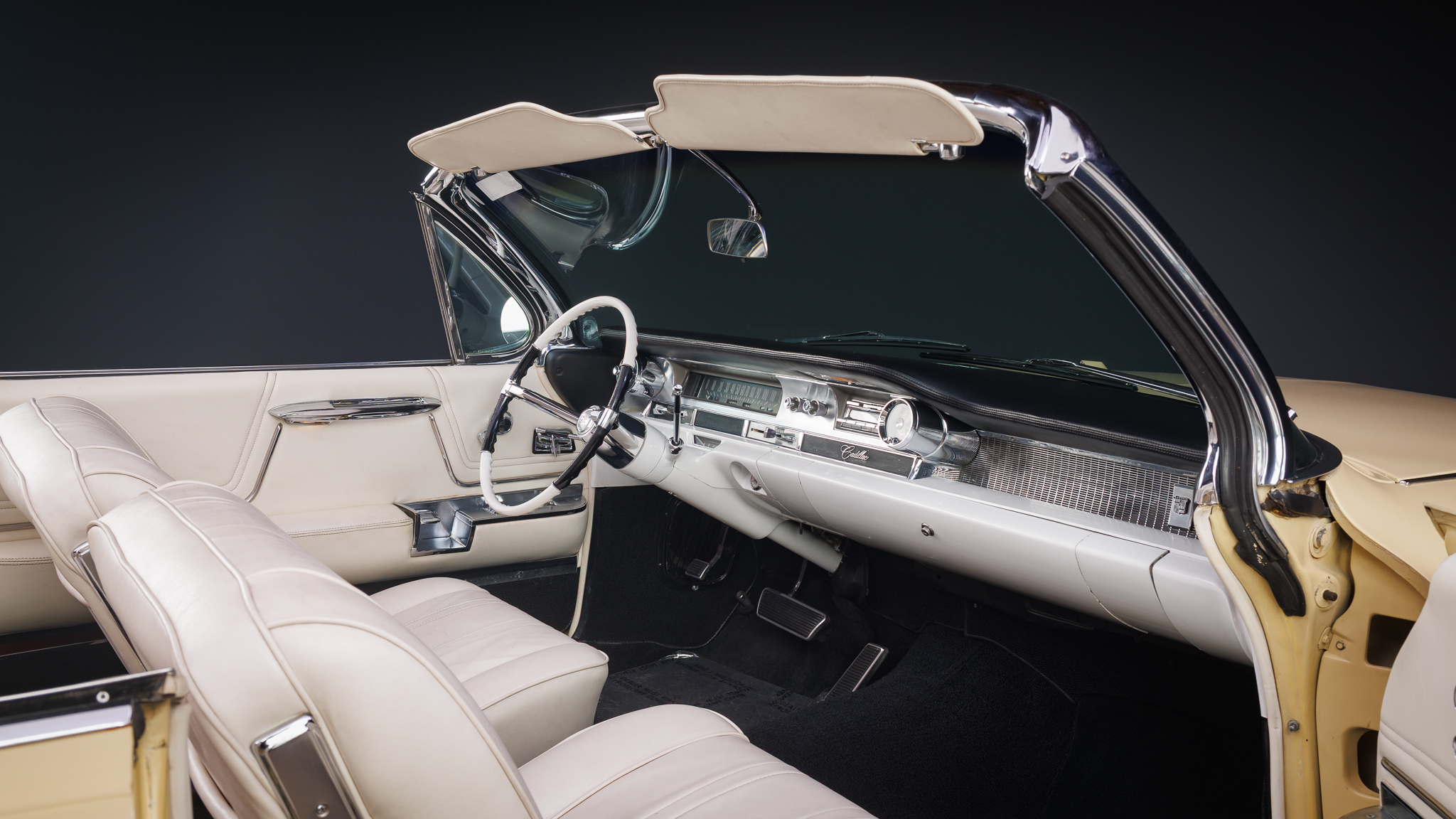 This 1962 Cadillac Series 62 convertible is finished in yellow over beige leather and is powered by a 390ci V8 linked with a four-speed Hydra-Matic automatic transmission. Equipment includes a white power-operated convertible soft top, power steering, power-assisted brakes, 15″ steel wheels with ribbed covers, power-adjustable front seats, seat belts, power windows, an AM radio, and a heater.