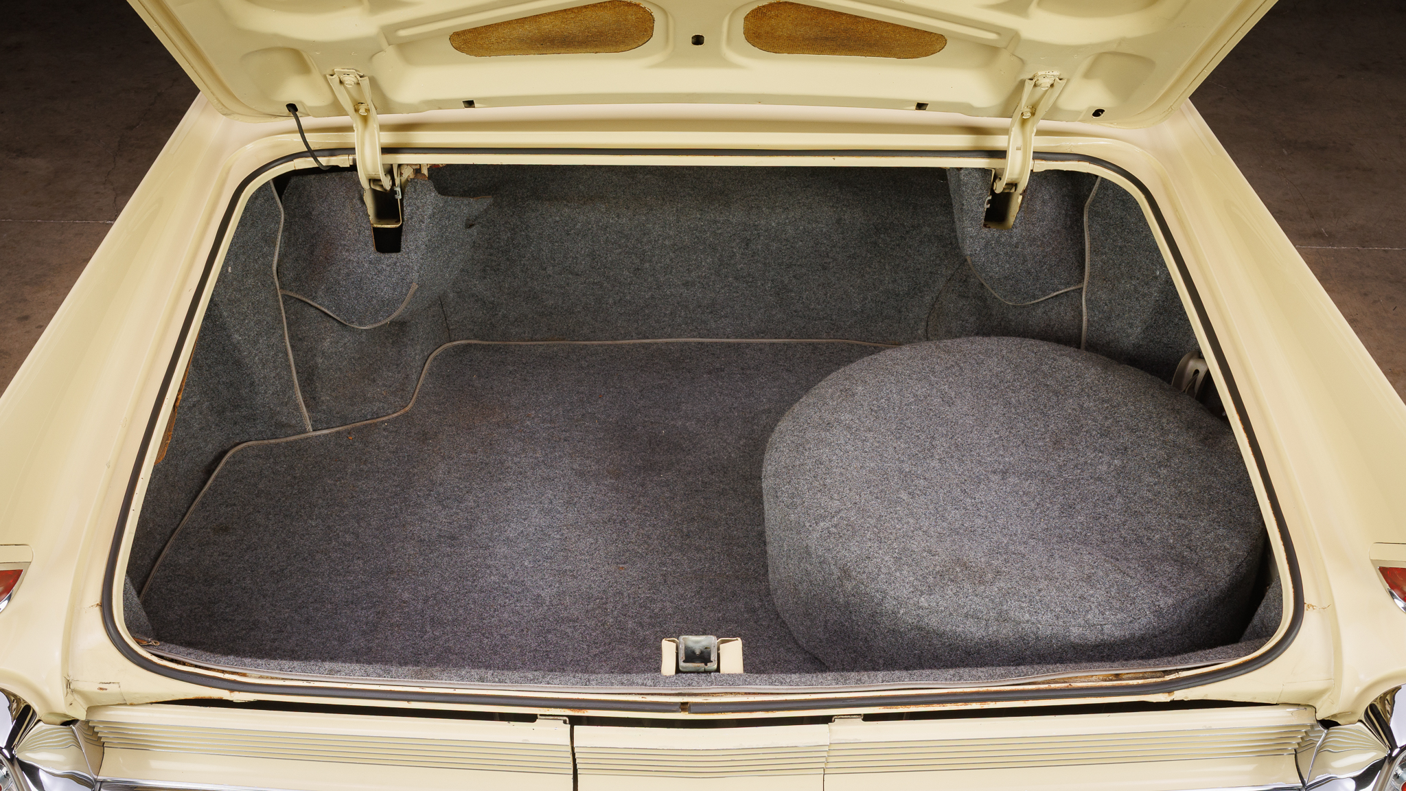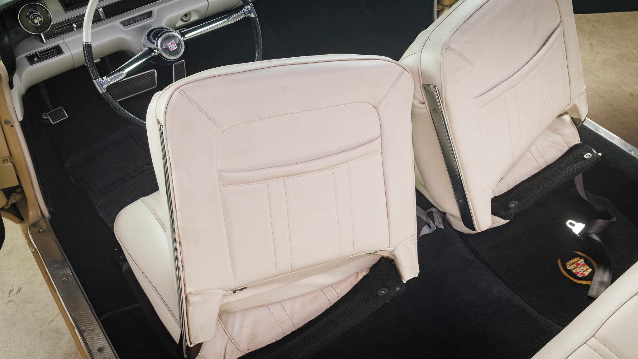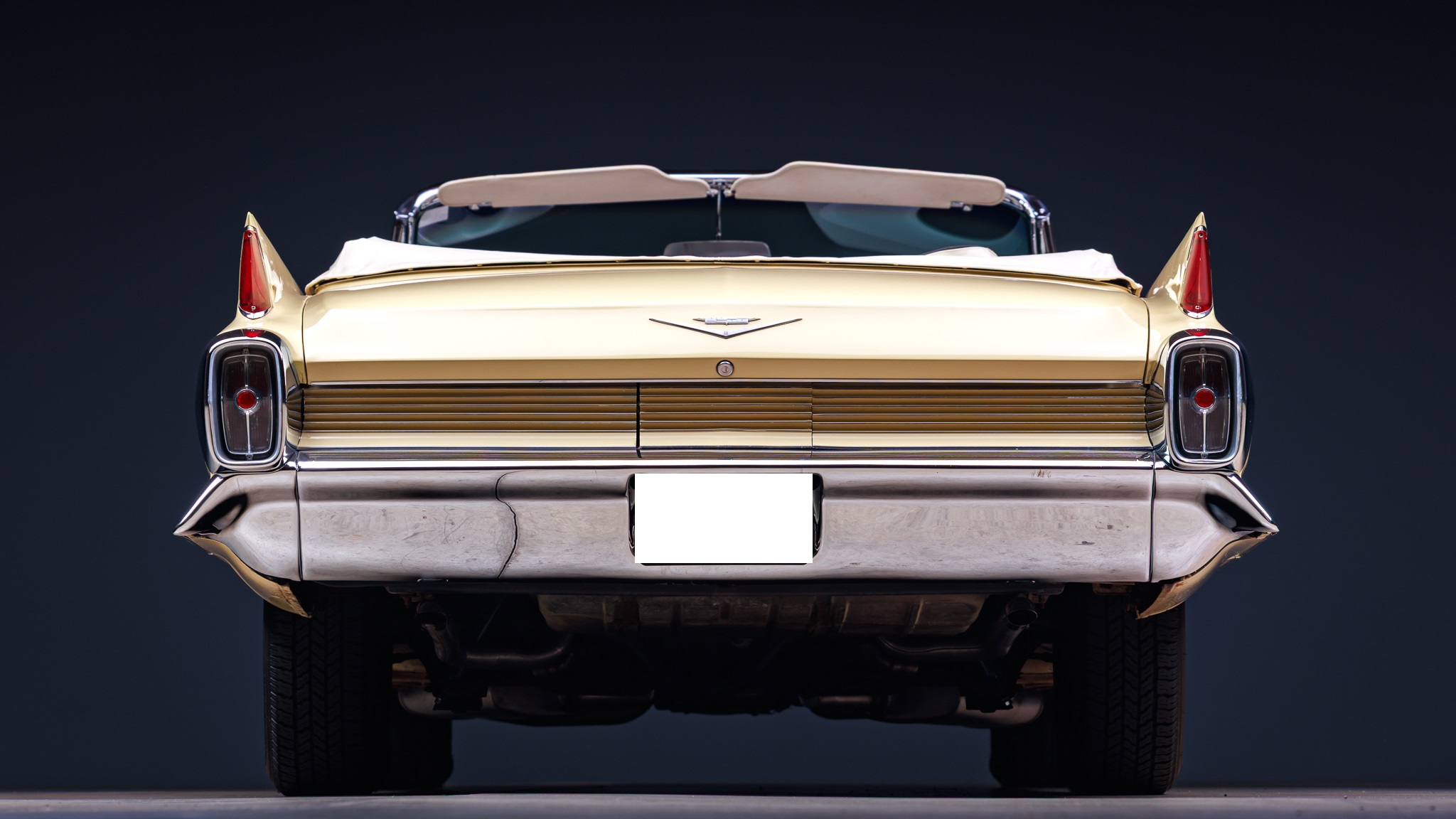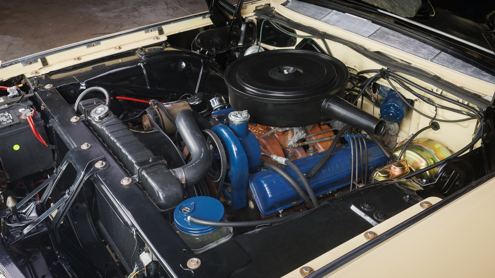 This 1962 Cadillac Series 62 convertible is finished in yellow over beige leather and is powered by a 390ci V8 linked with a four-speed Hydra-Matic automatic transmission. Equipment includes a white power-operated convertible soft top, power steering, power-assisted brakes, 15″ steel wheels with ribbed covers, power-adjustable front seats, seat belts, power windows, an AM radio, and a heater.